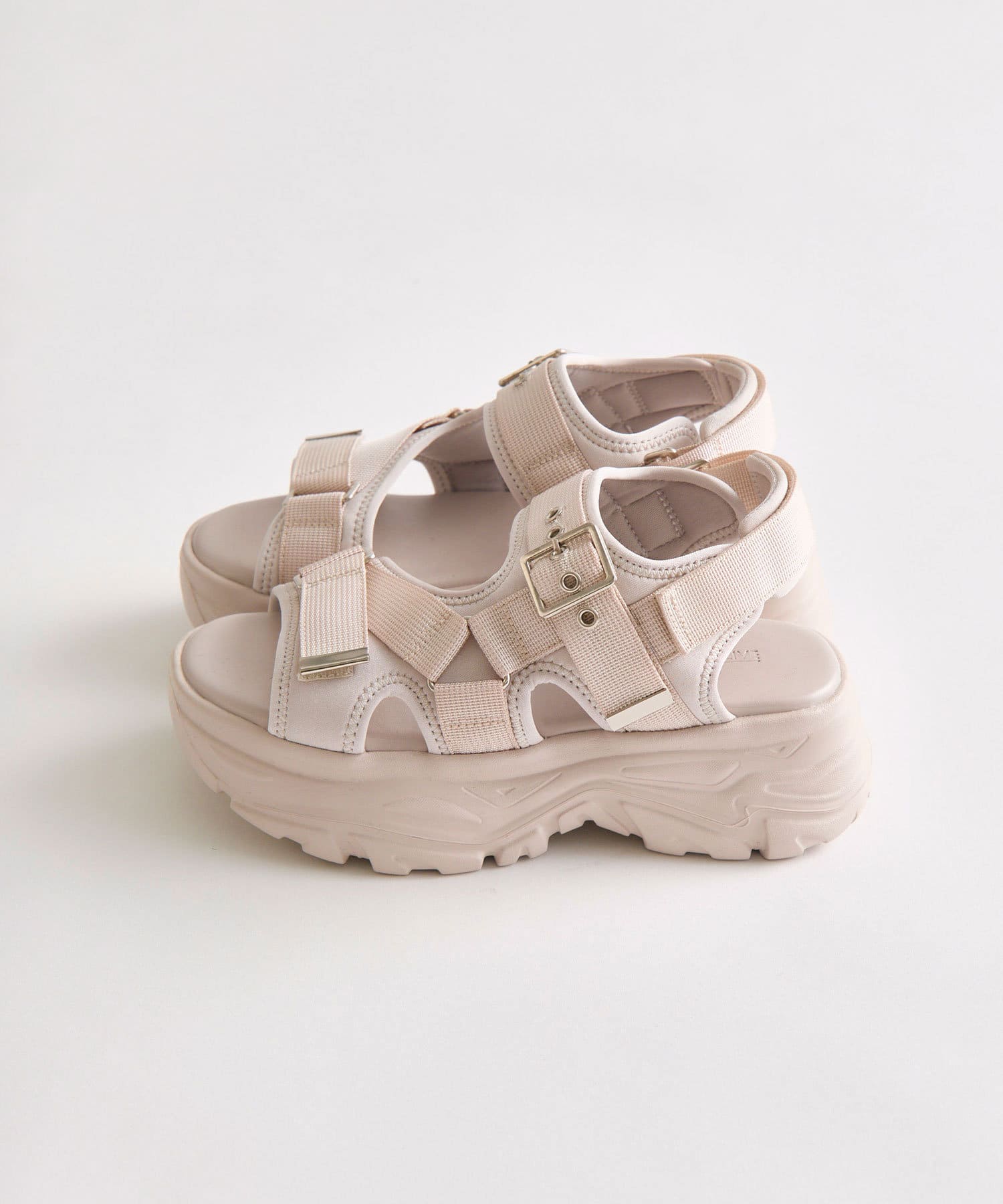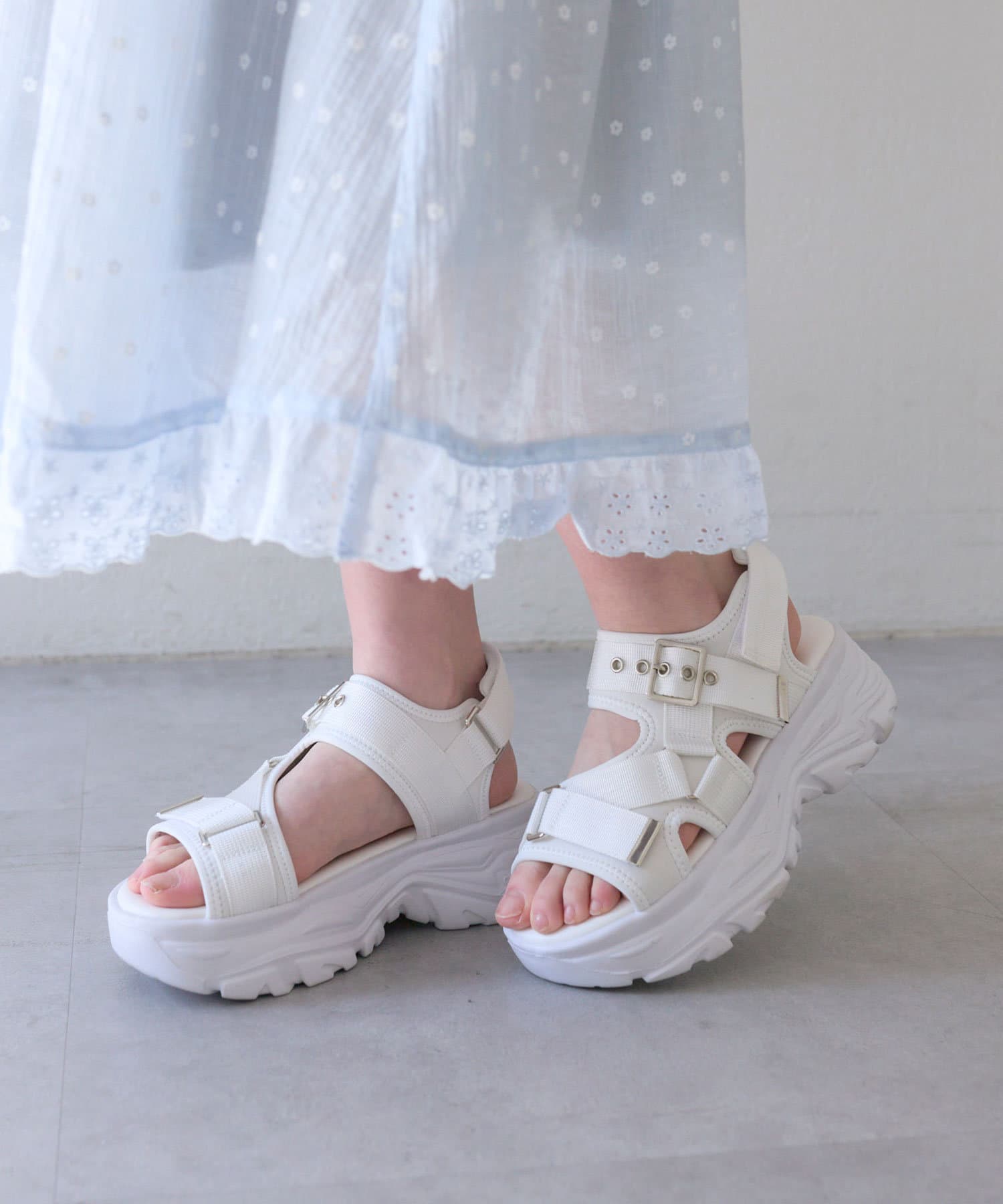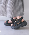 目を惹くバックルがポイントの厚底サンダル