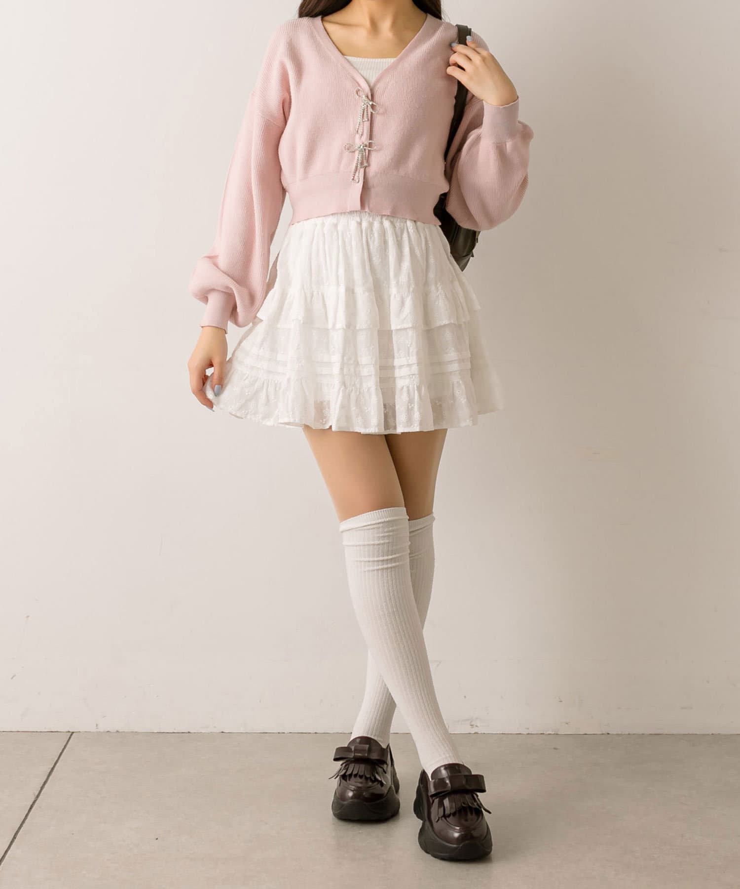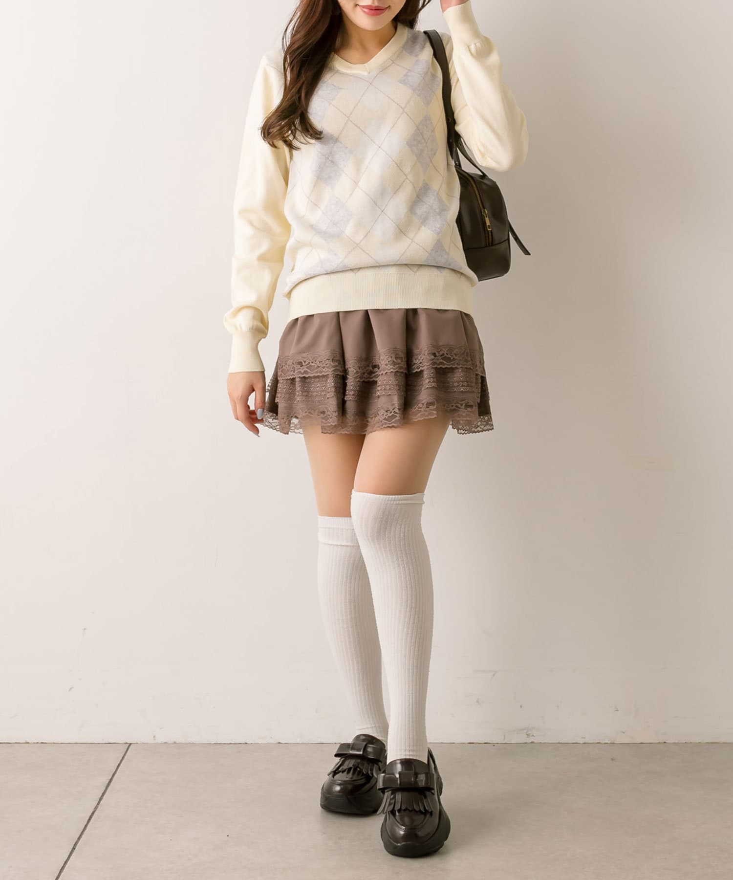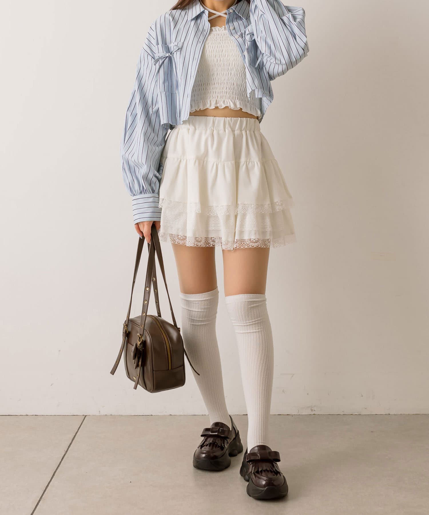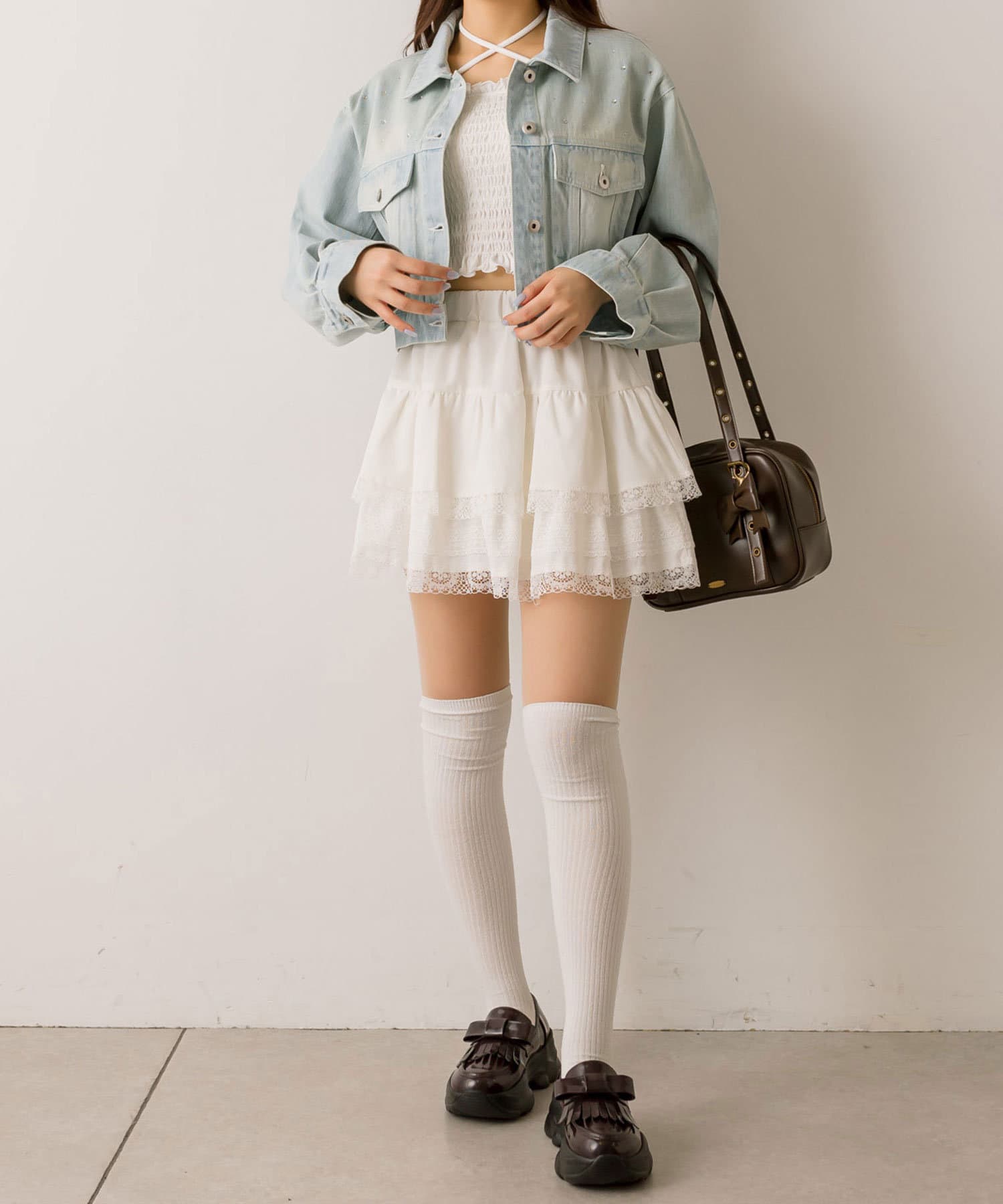 ・ミニスカートに靴下を合わせた韓国っぽトレンドコーデがおすすめです。