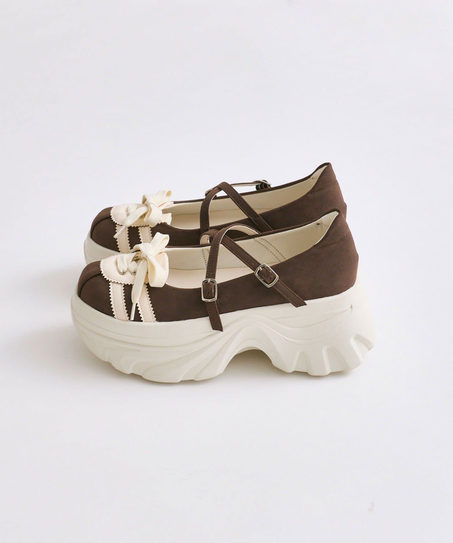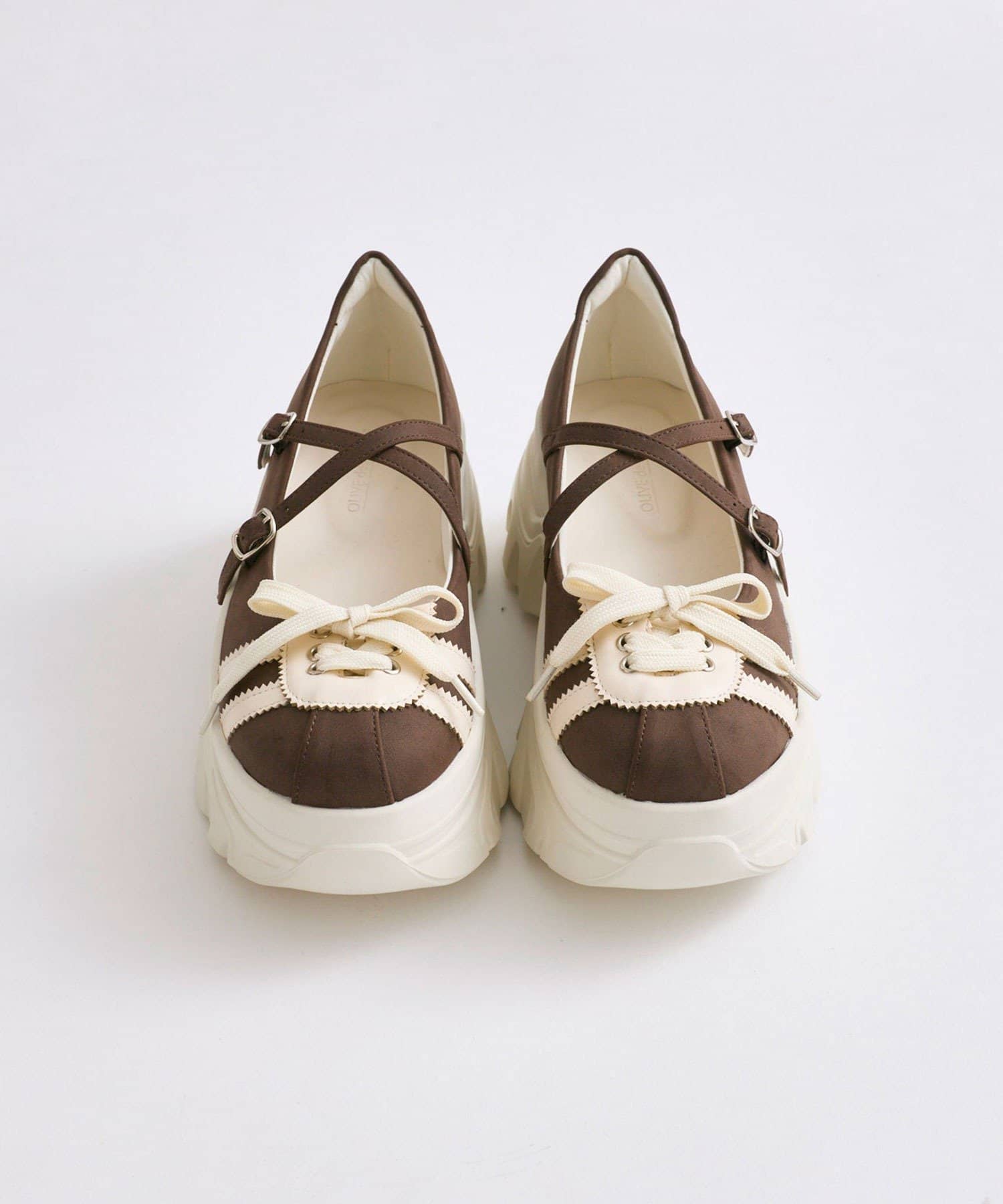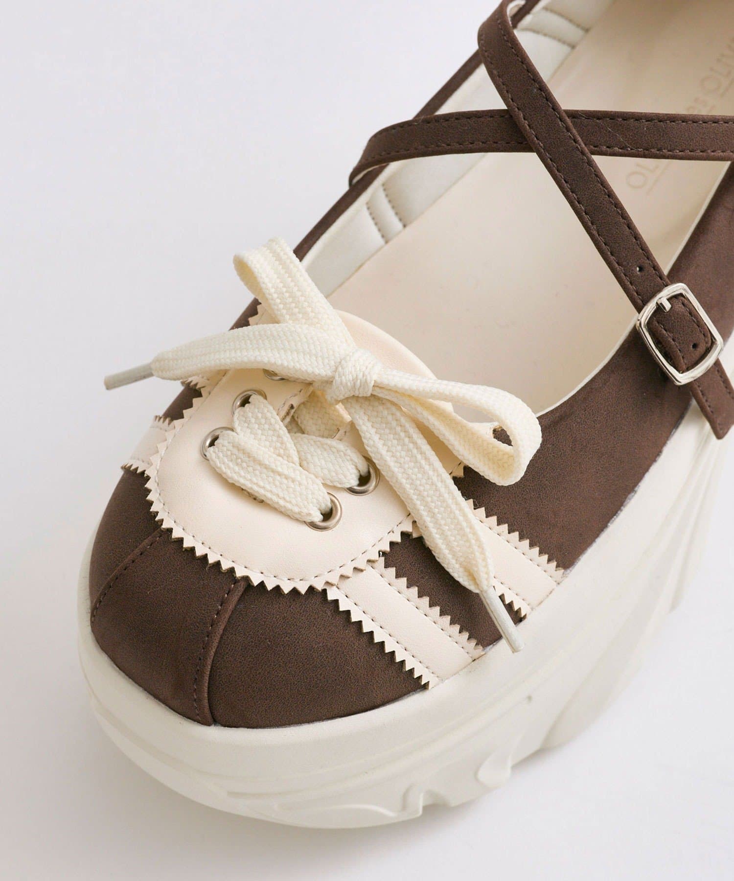・レースアップ風デザインと切り替え配色が、甘さを引き締めてくれます。