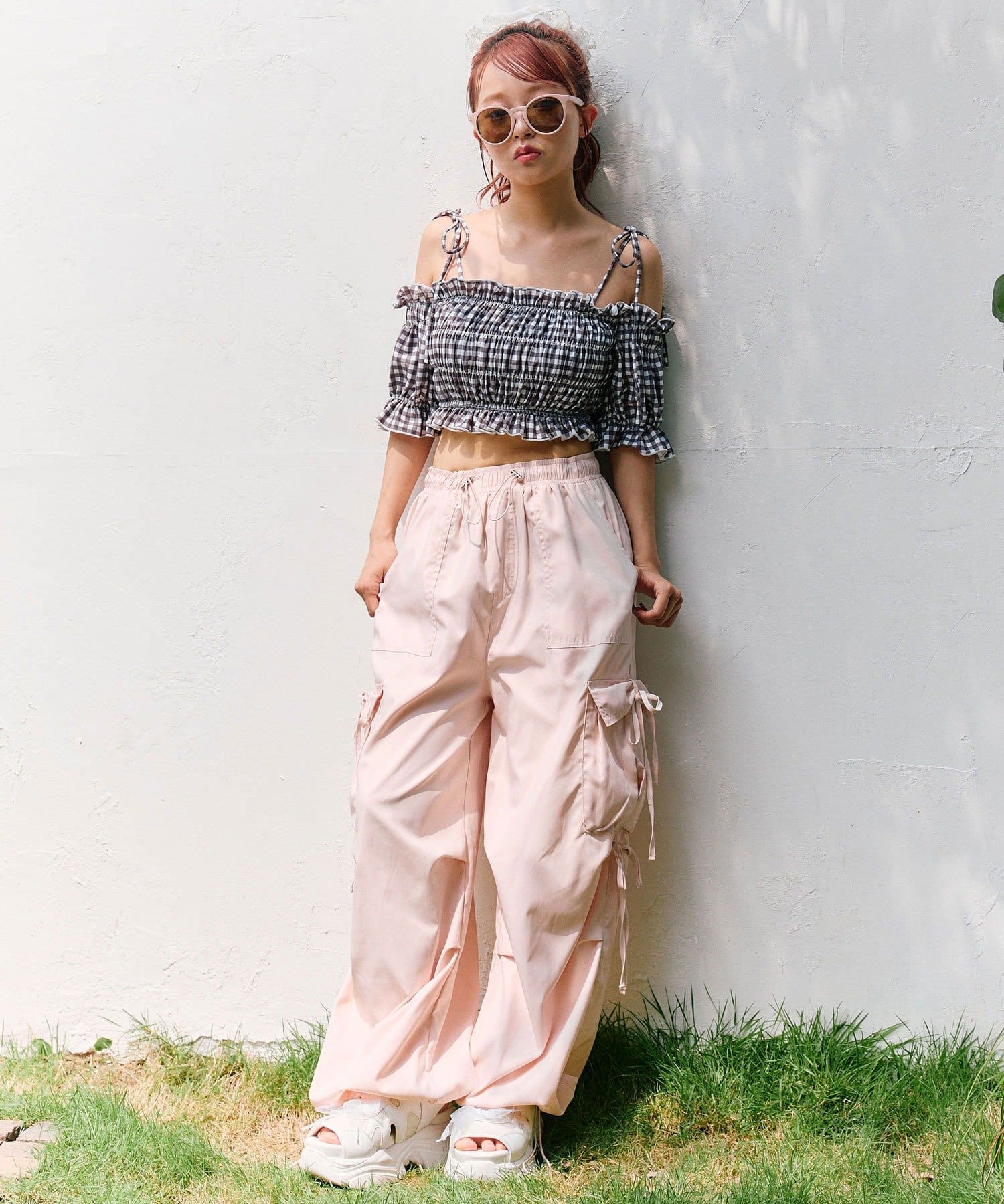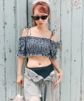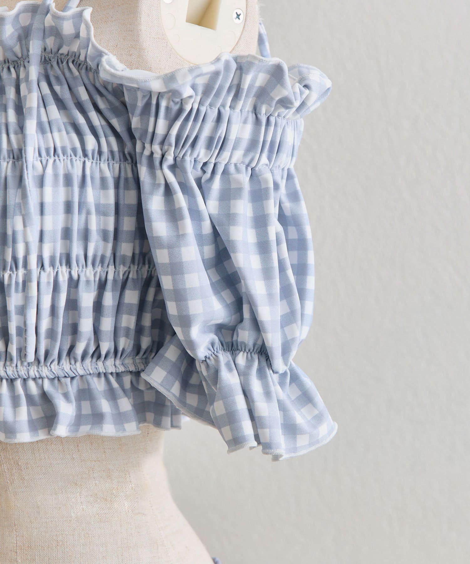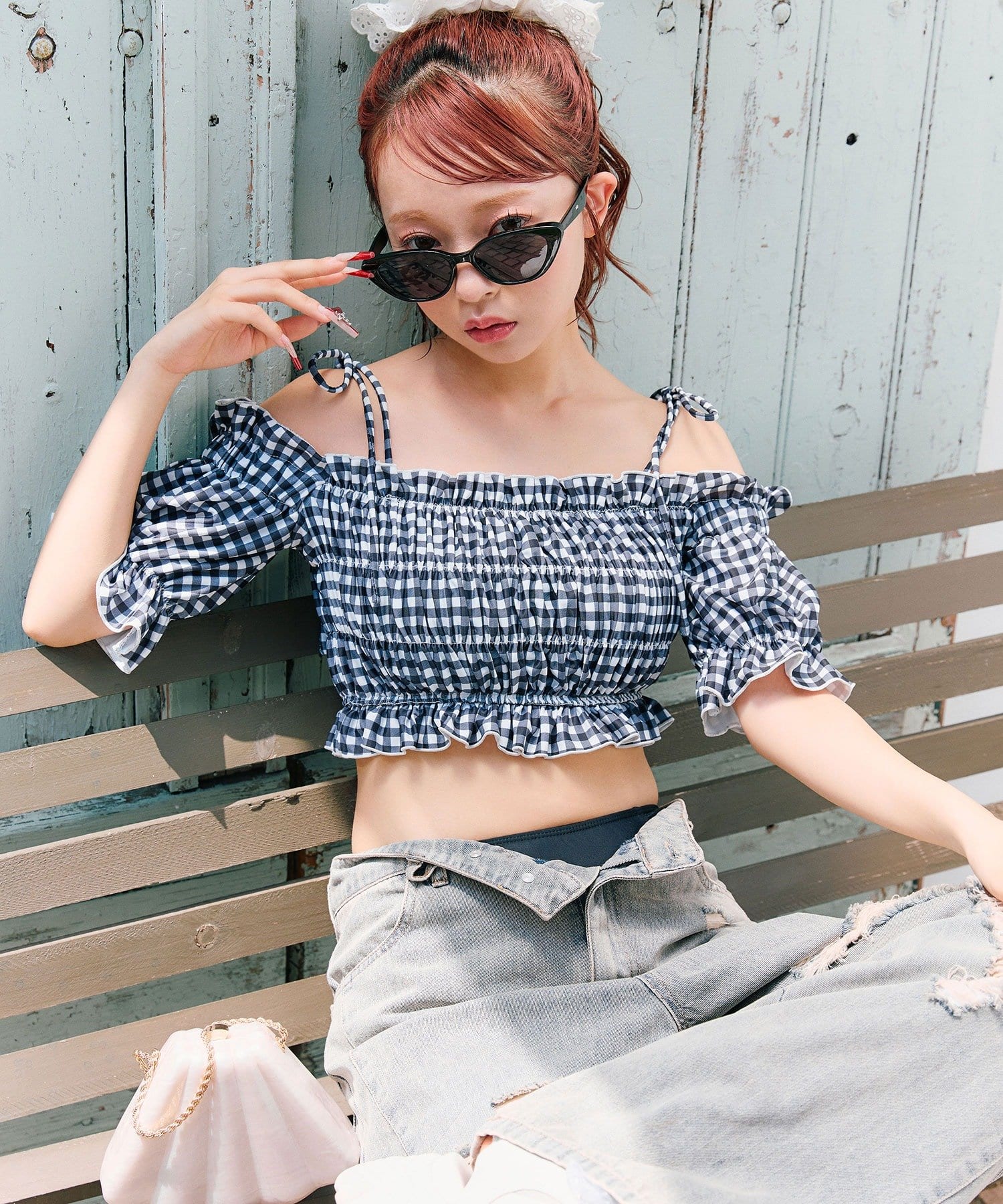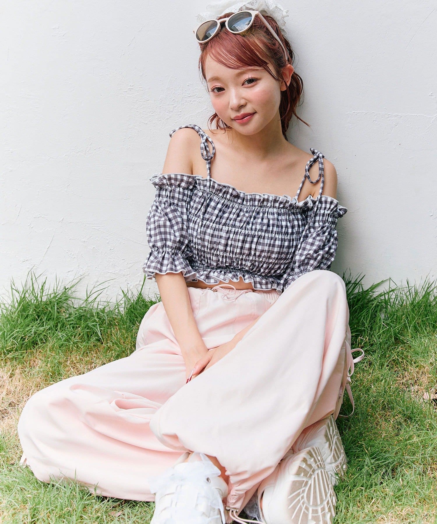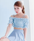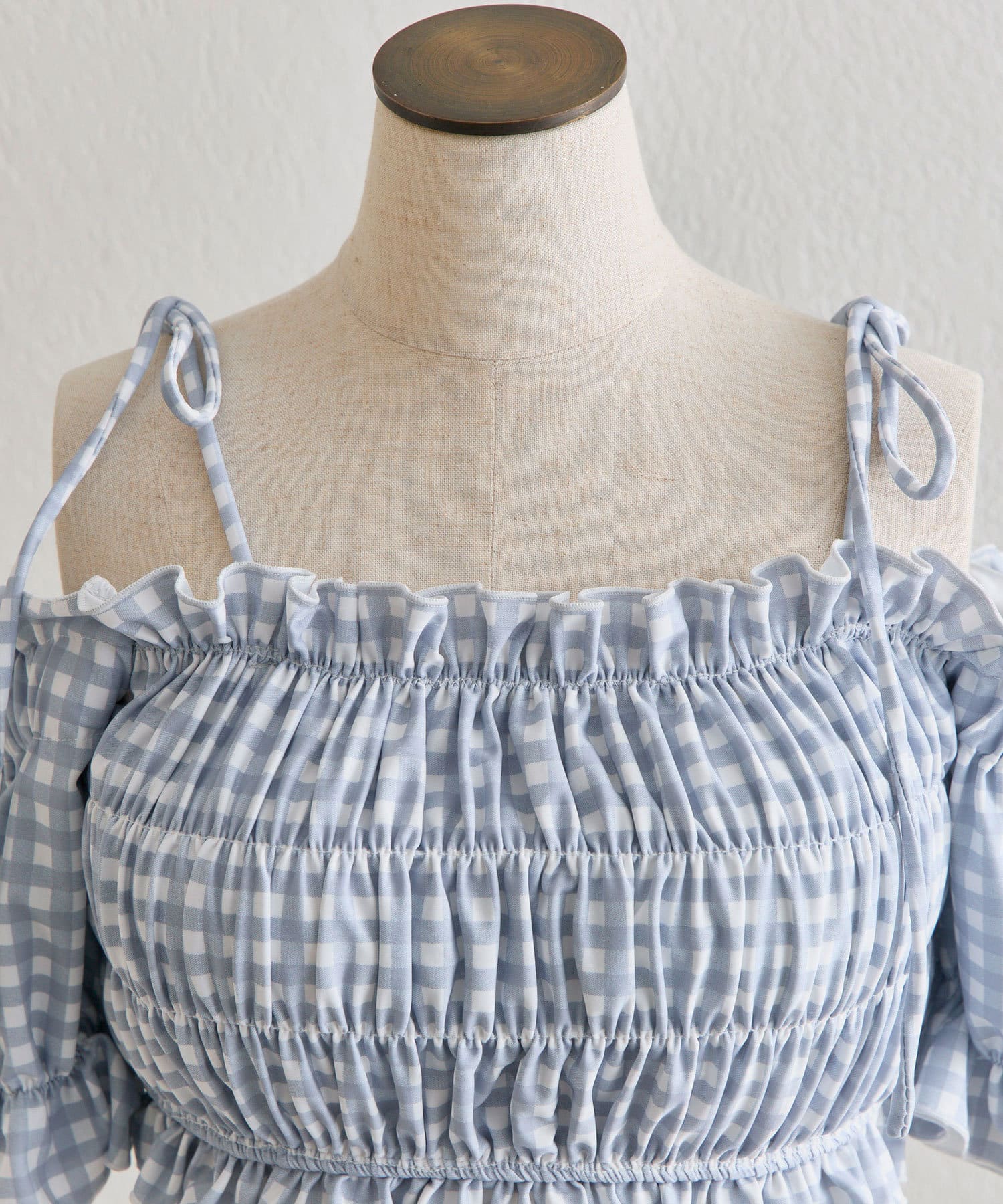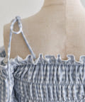 ・お好みの長さに調節できるリボンタイプの肩紐なので、オフショルダーでも安心感のある仕上がりに◎
