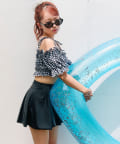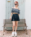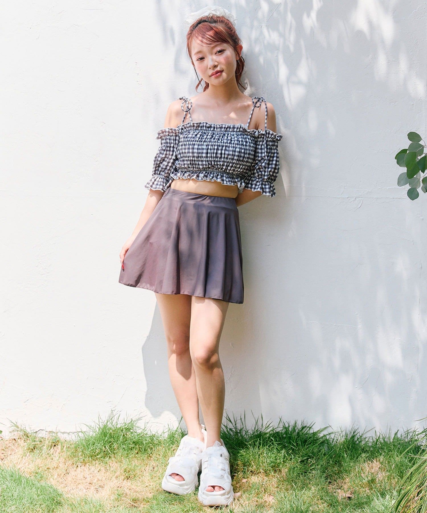 ・気になるウエストや太もも周りを隠せるスカートタイプでスッキリ着れます。