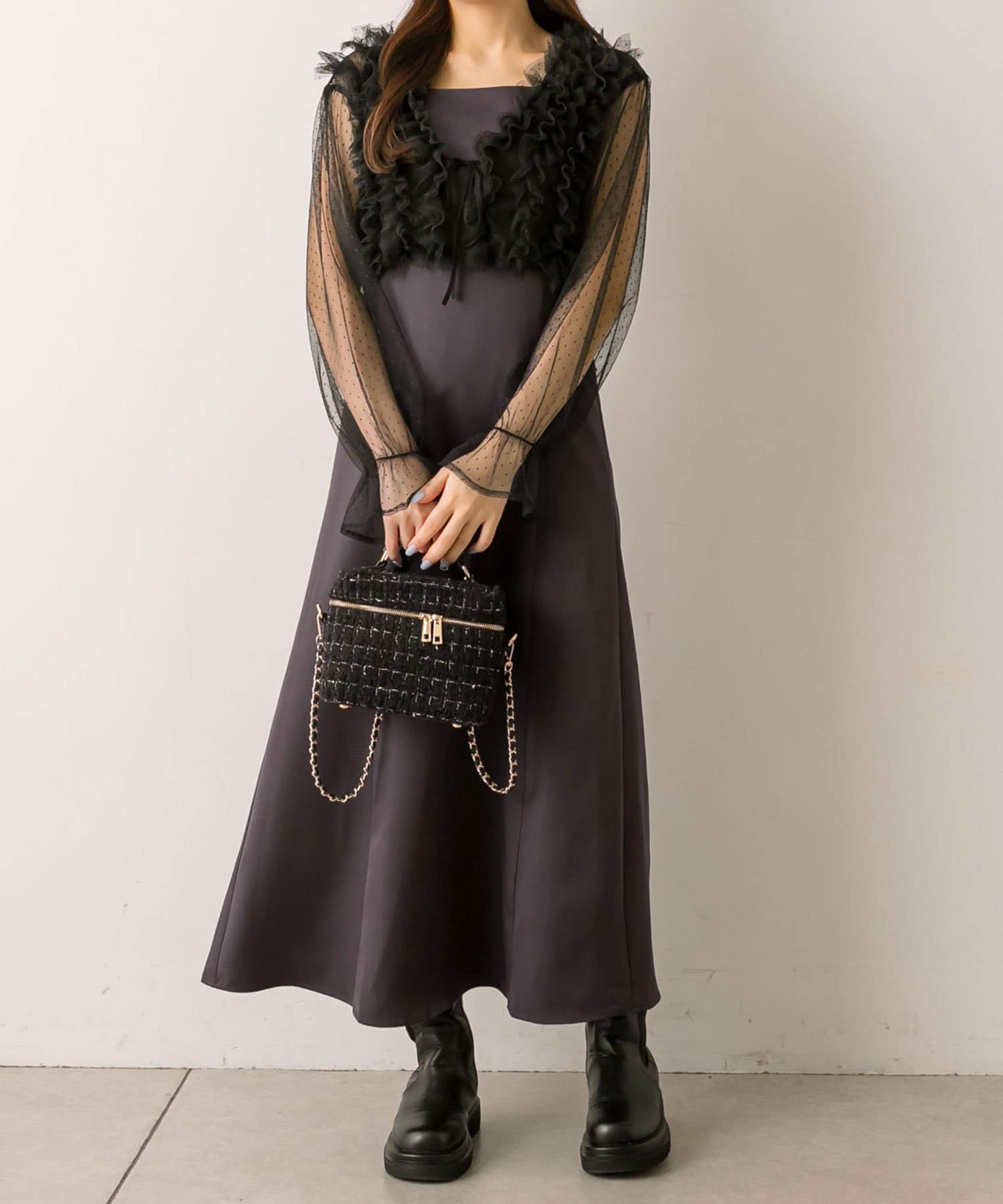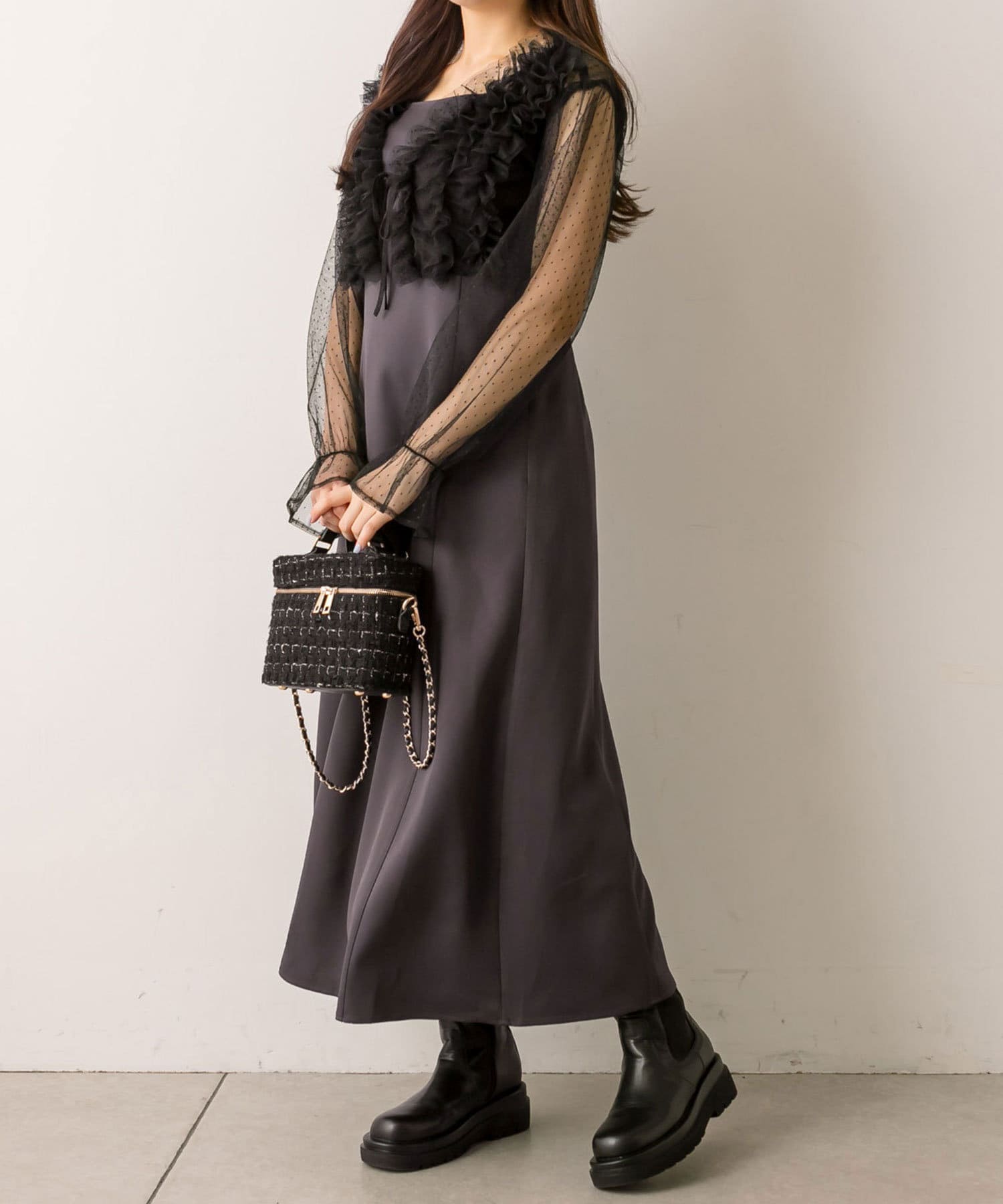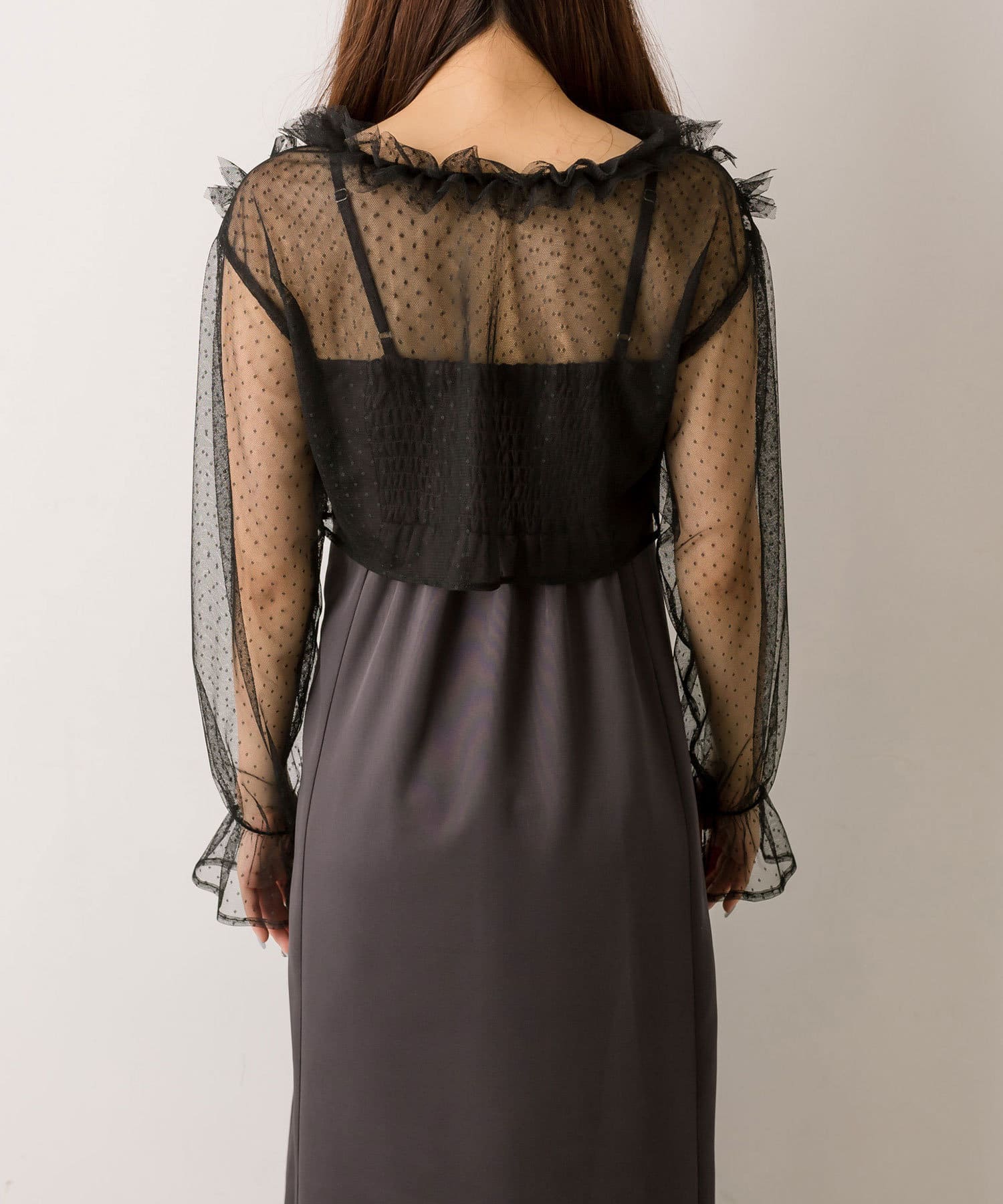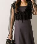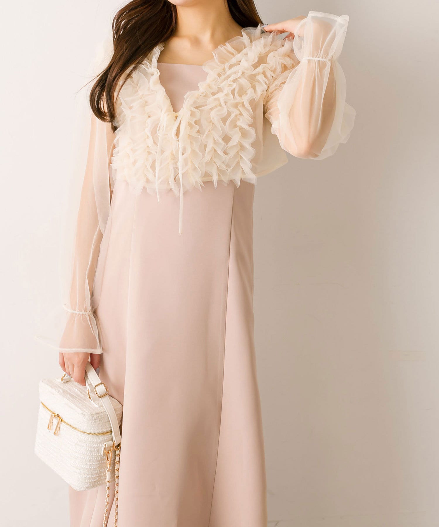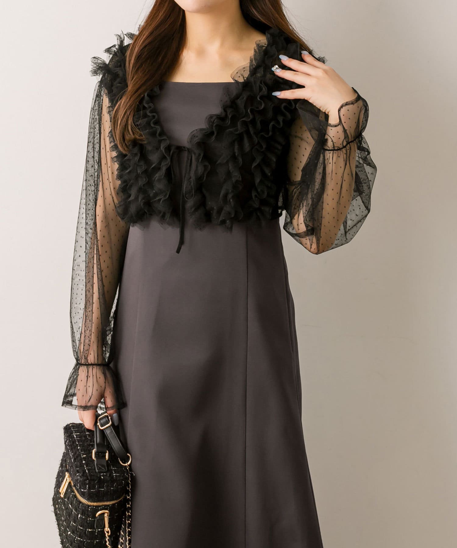 ・ボリュームたっぷりなチュールボレロと、着るだけでスタイルアップが叶うキャミワンピースのセット。