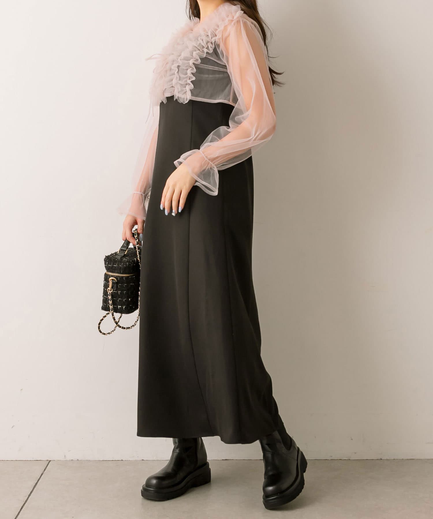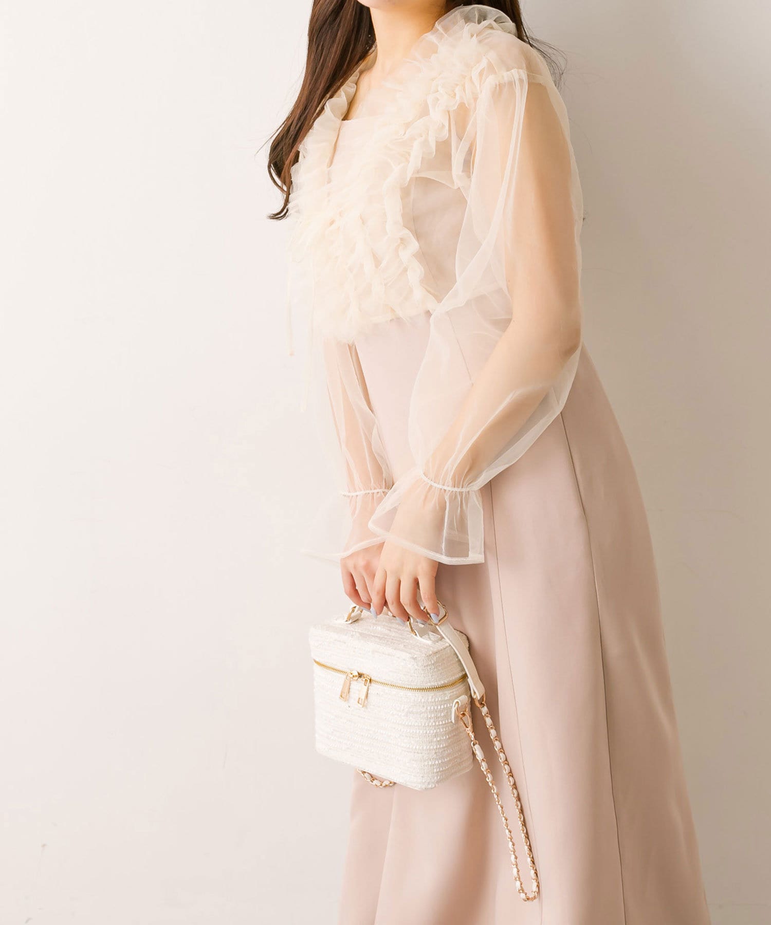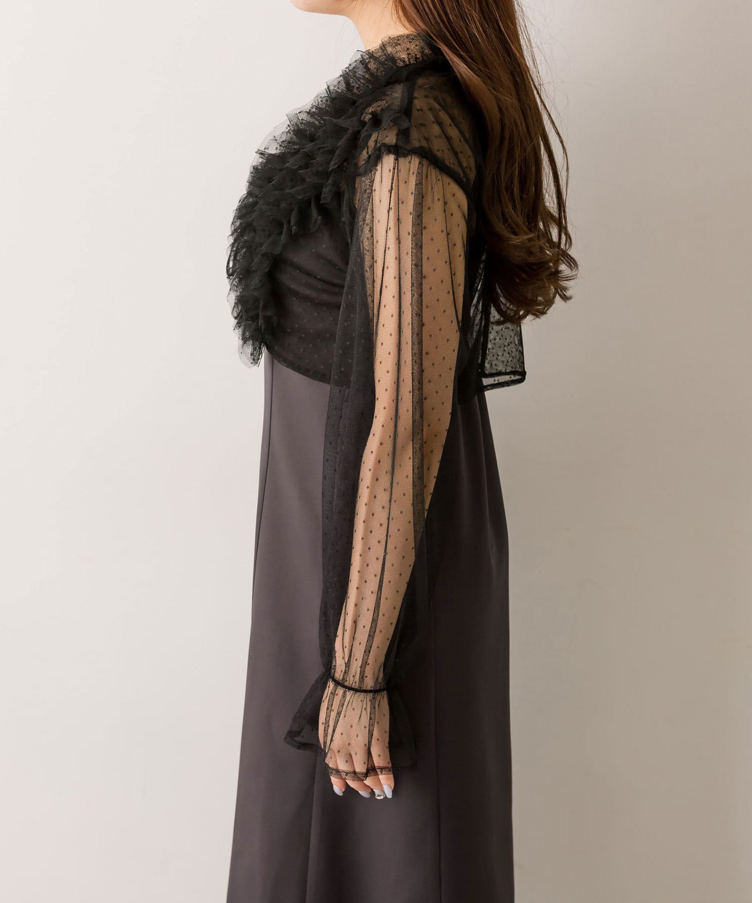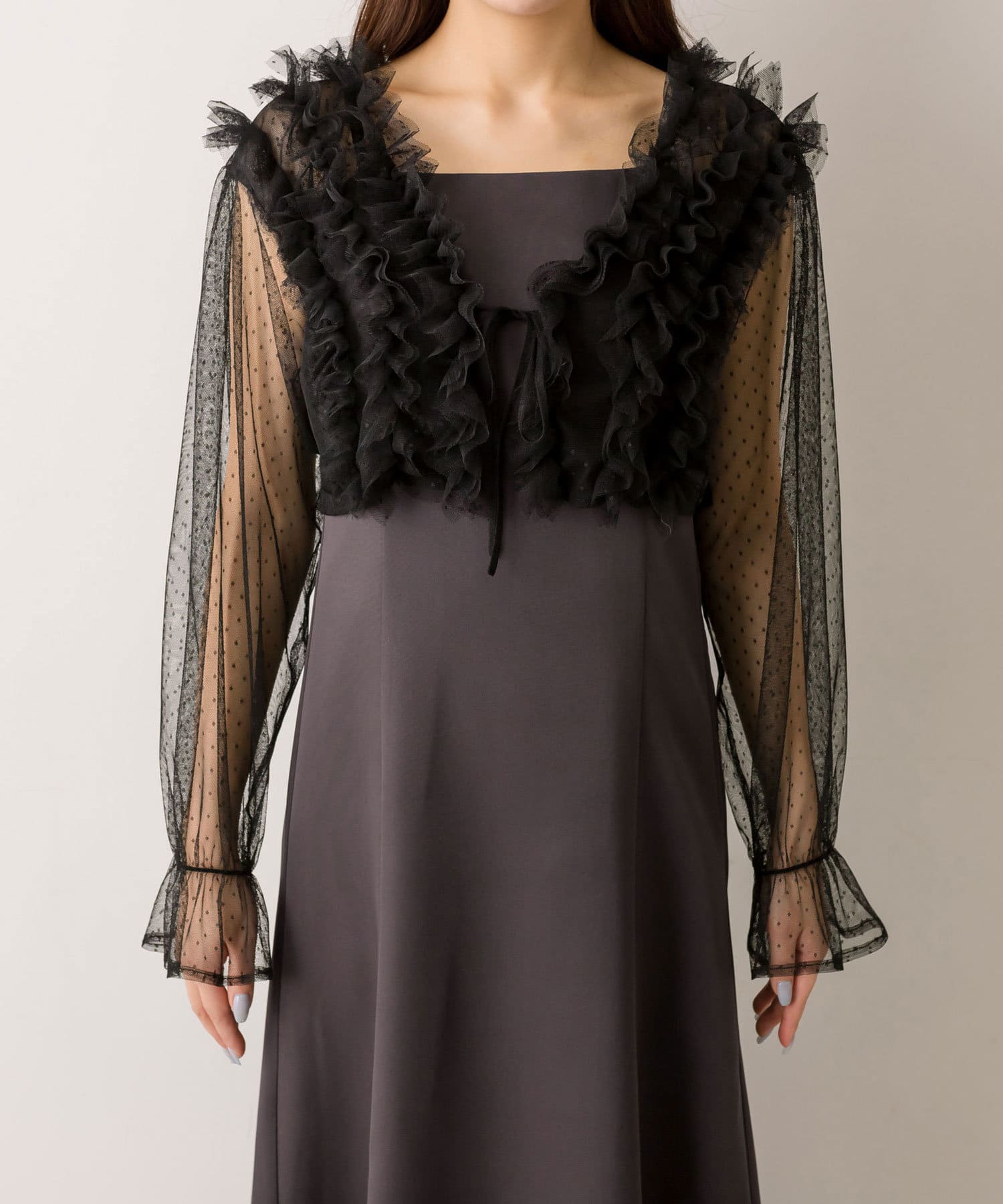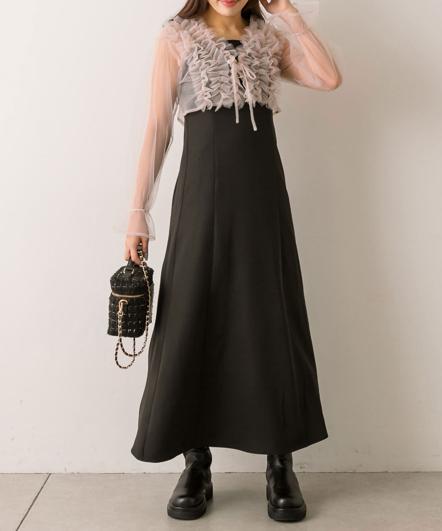 ・ボリュームたっぷりなチュールボレロと、着るだけでスタイルアップが叶うキャミワンピースのセット。