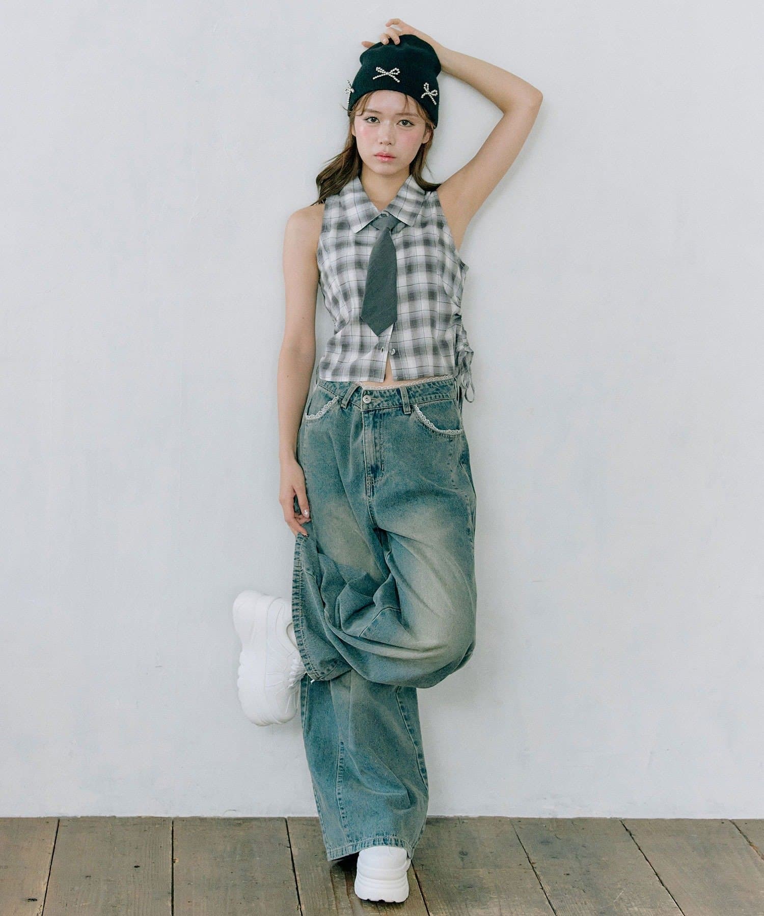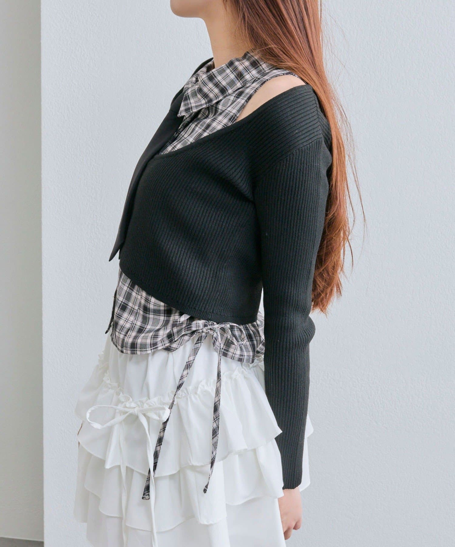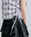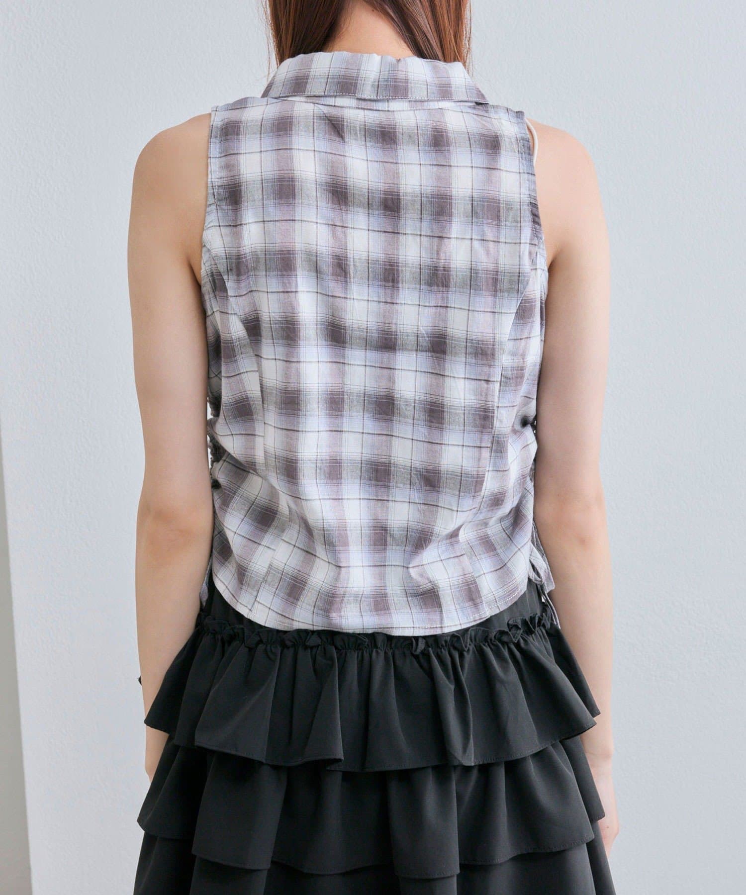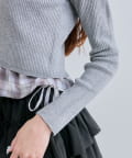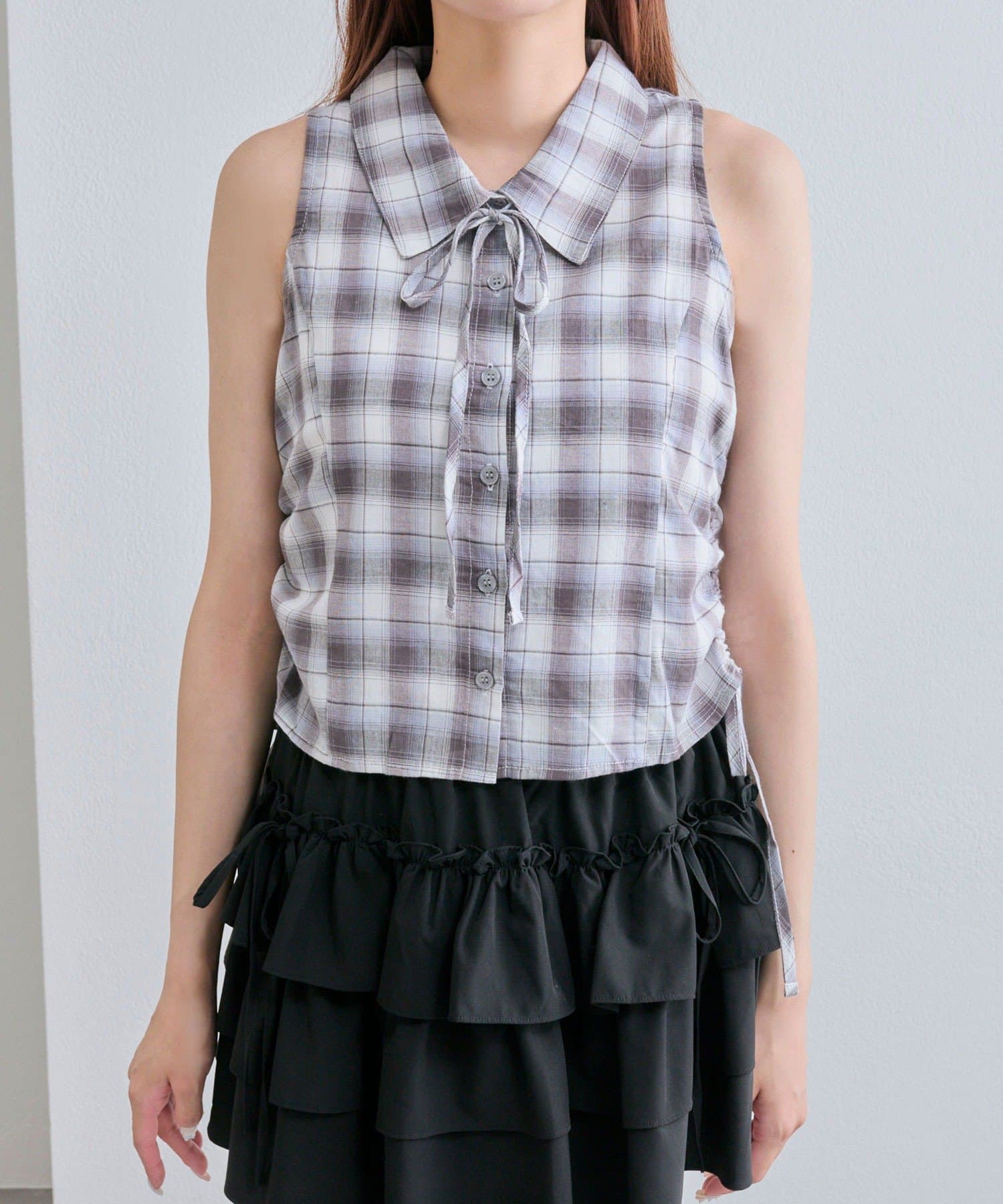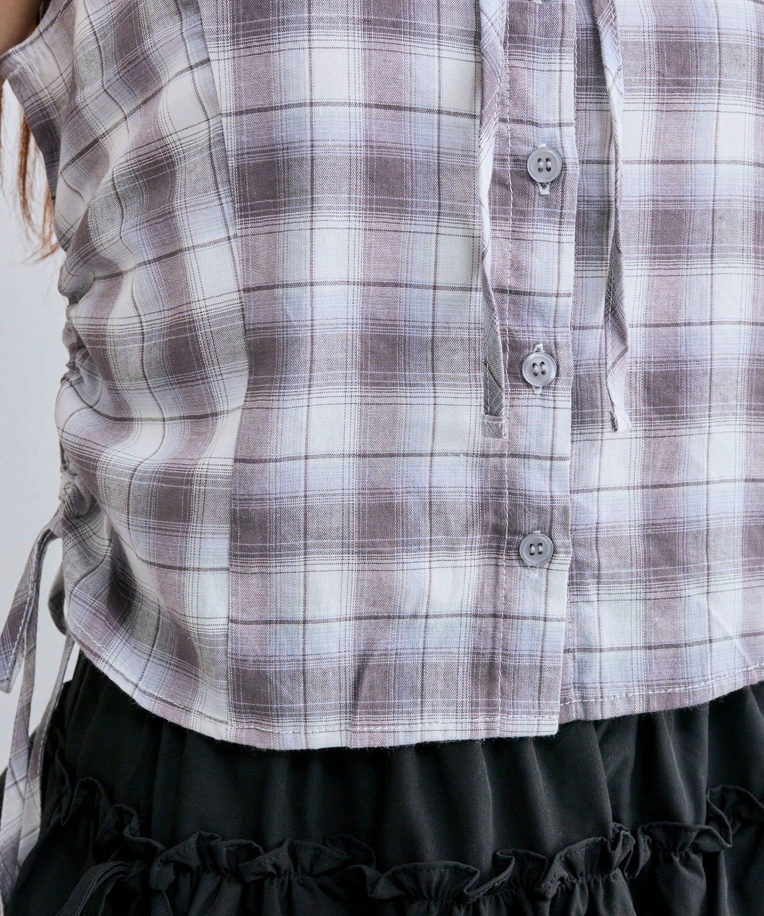 ・シャツのサイドにはドロストリボンが施され、絞り具合で丈感やシルエットを変えられます。