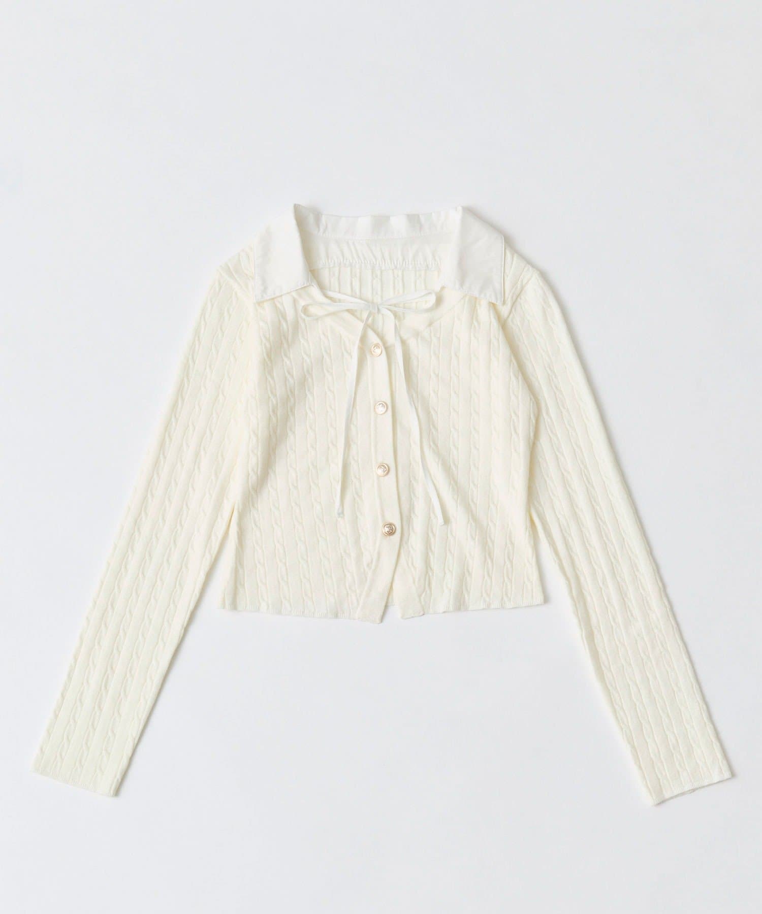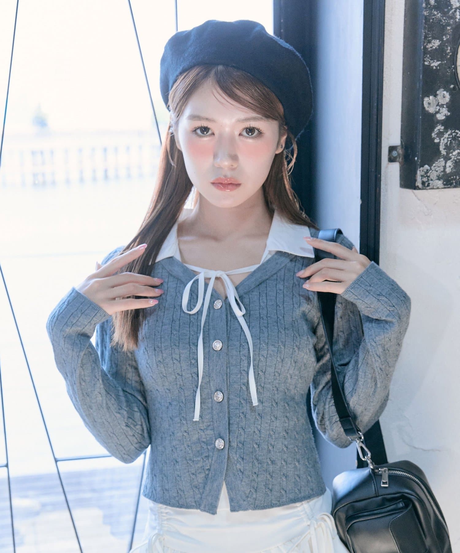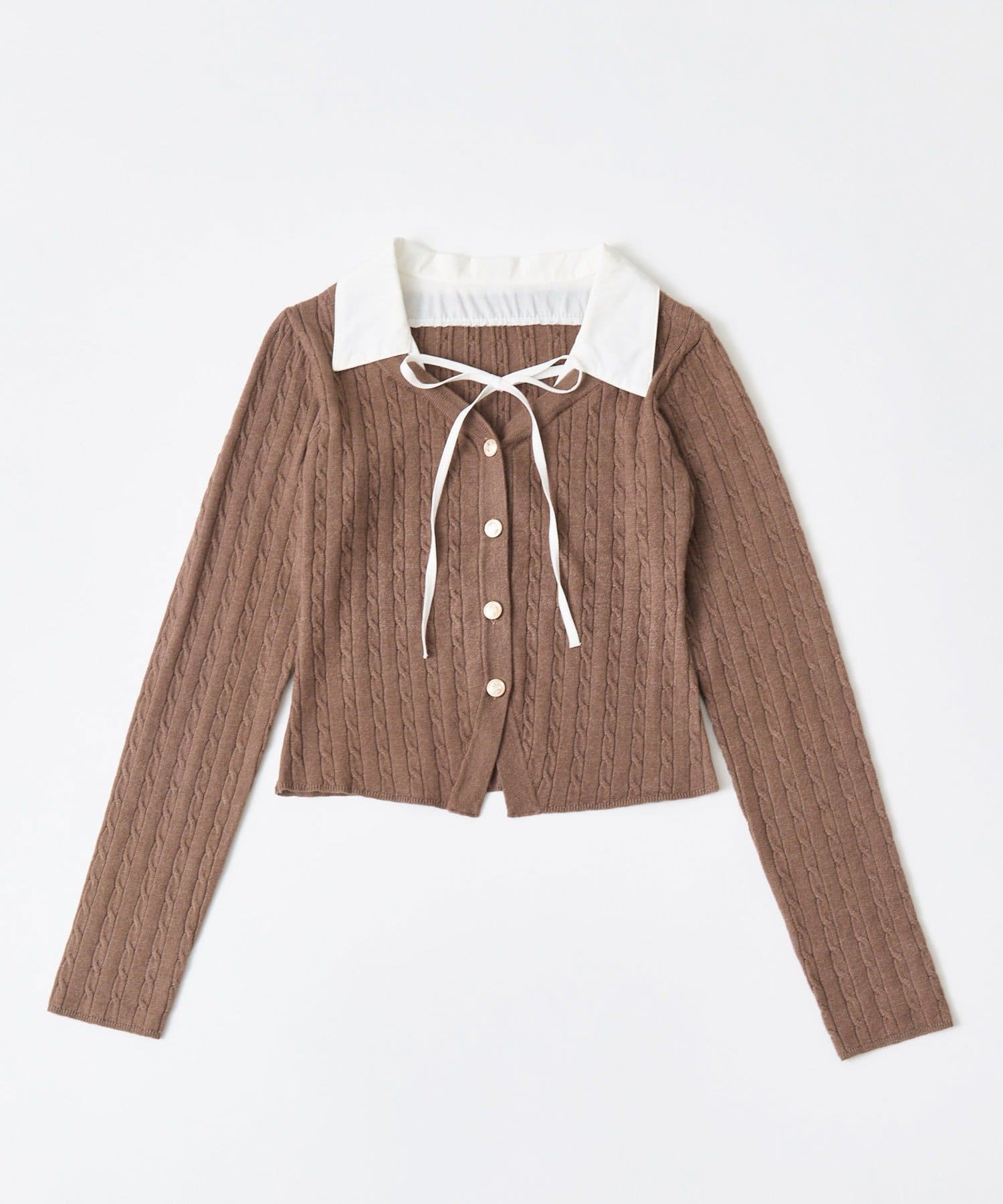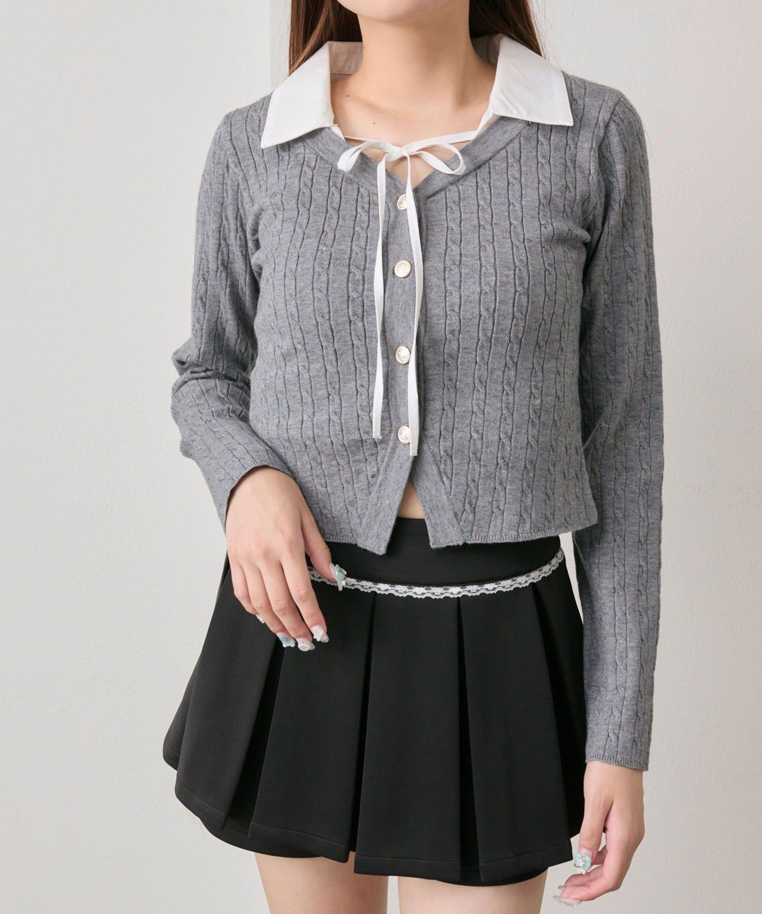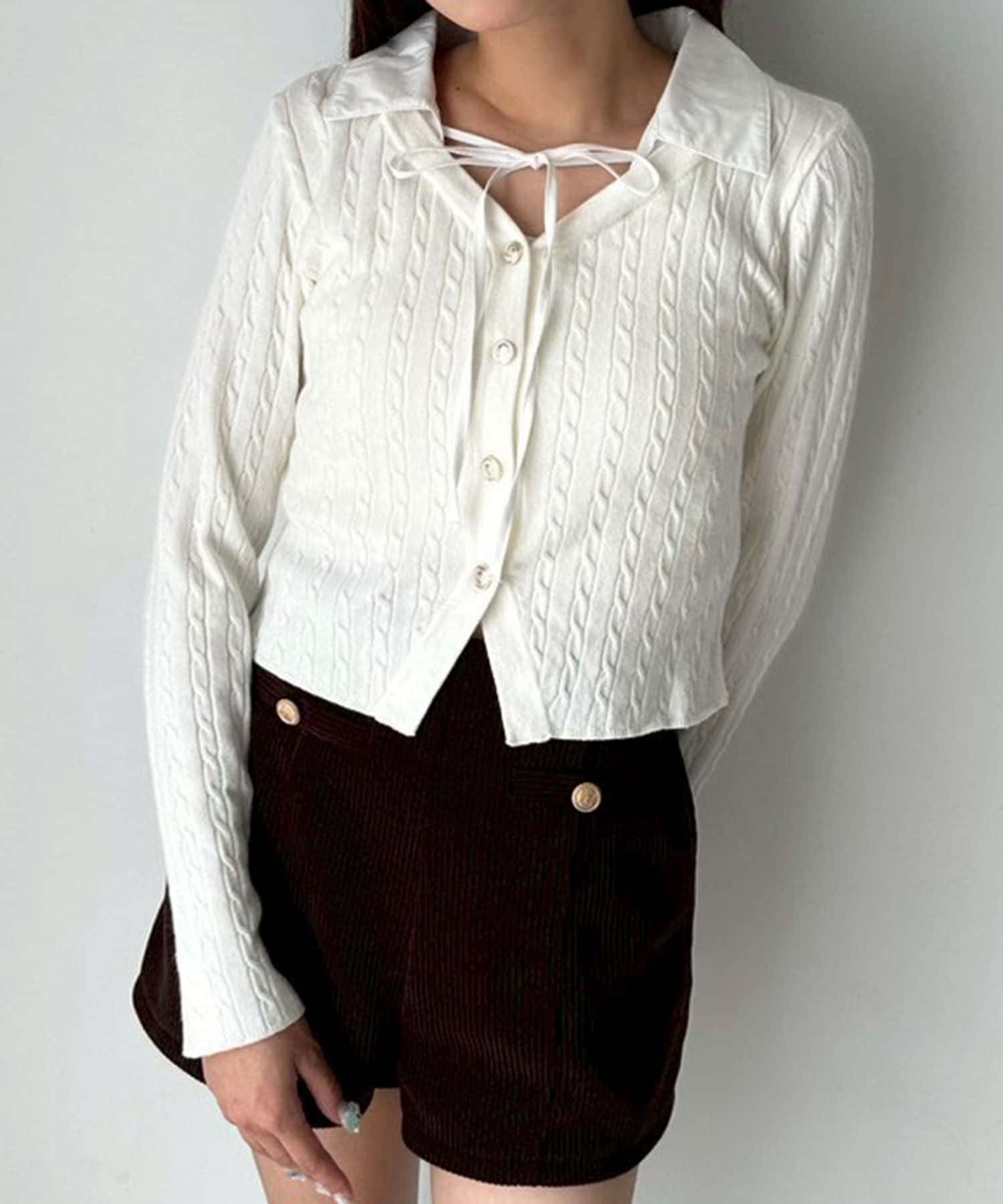 ・金ボタン付きのケーブルニットに、シャツをレイヤードしたようなきちんと感も可愛さも欲張れるデザイン。