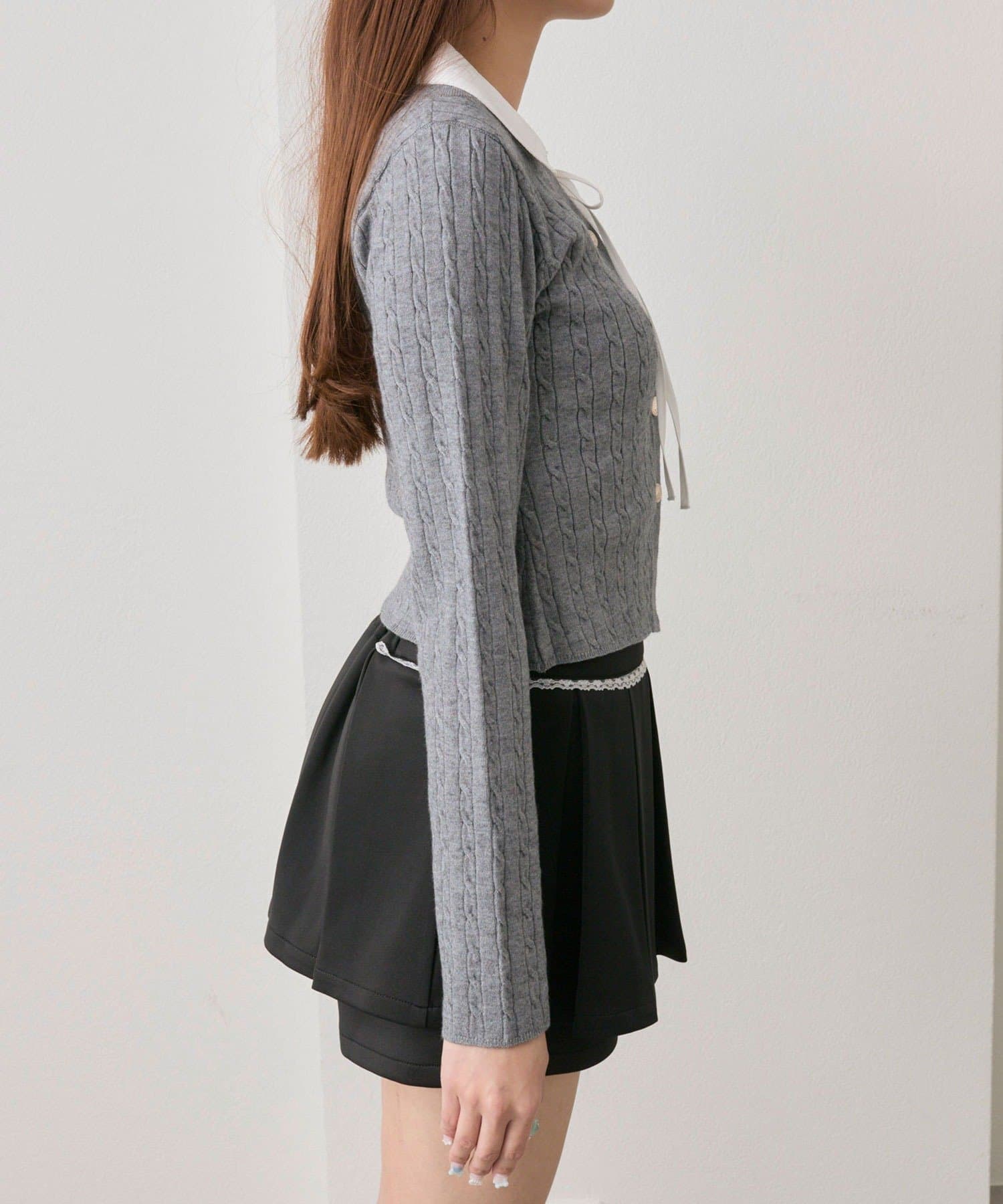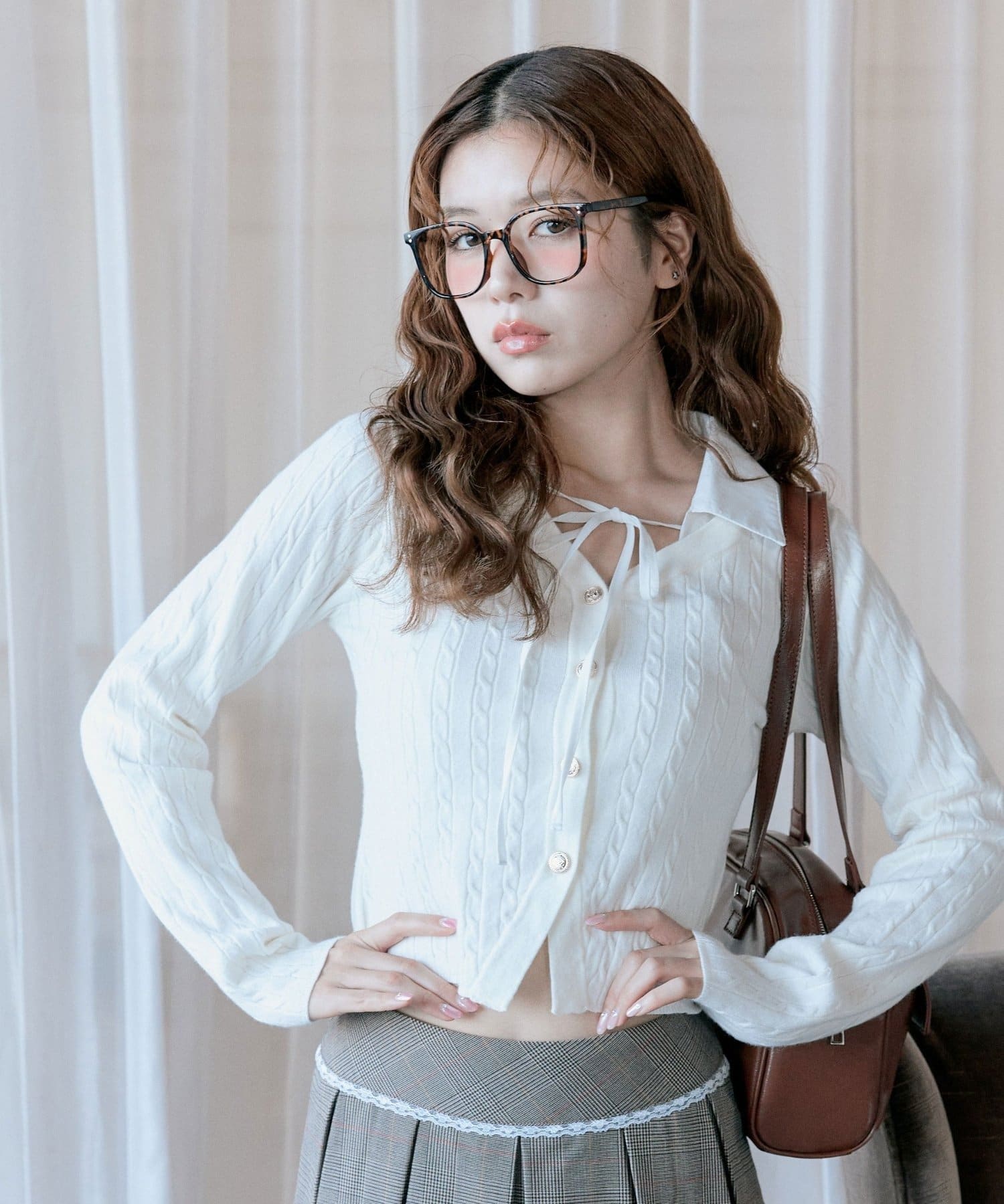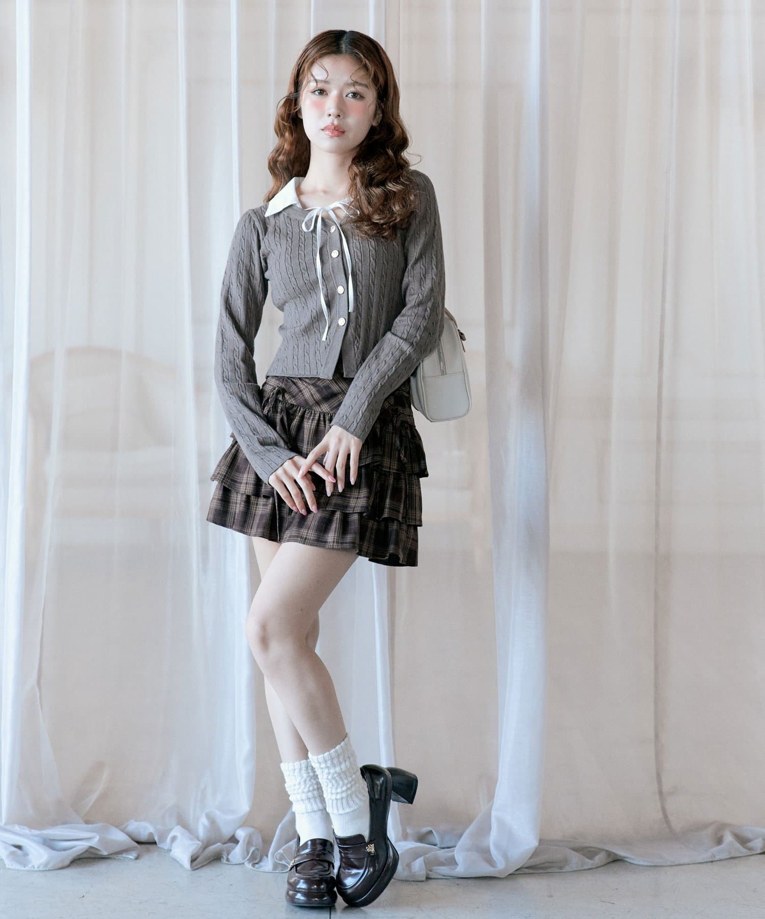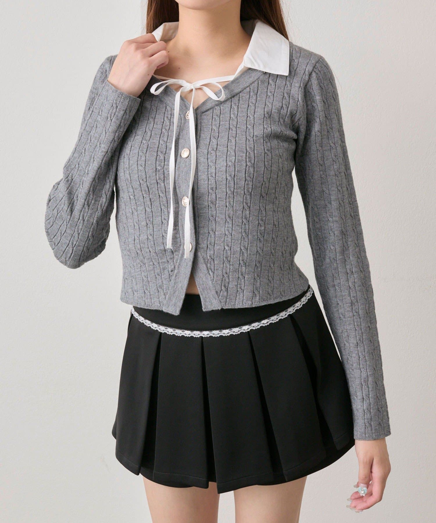 ・金ボタン付きのケーブルニットに、シャツをレイヤードしたようなきちんと感も可愛さも欲張れるデザイン。
