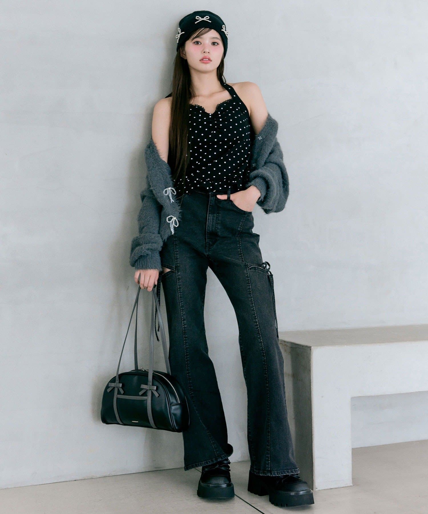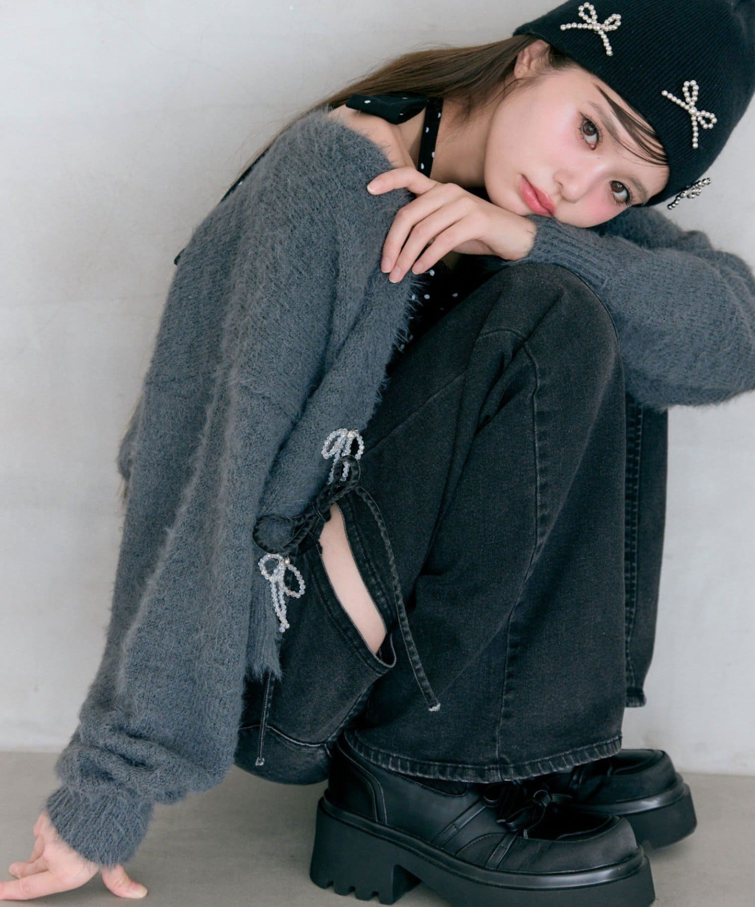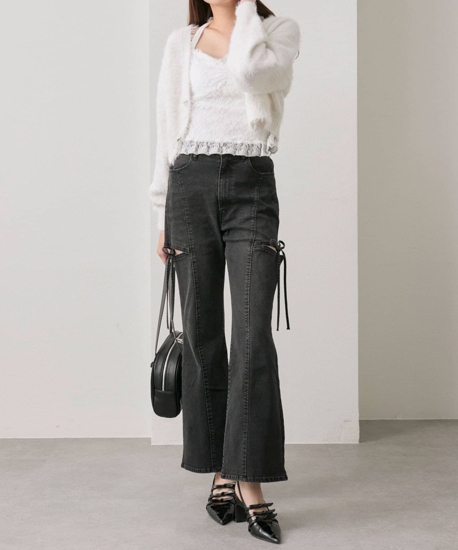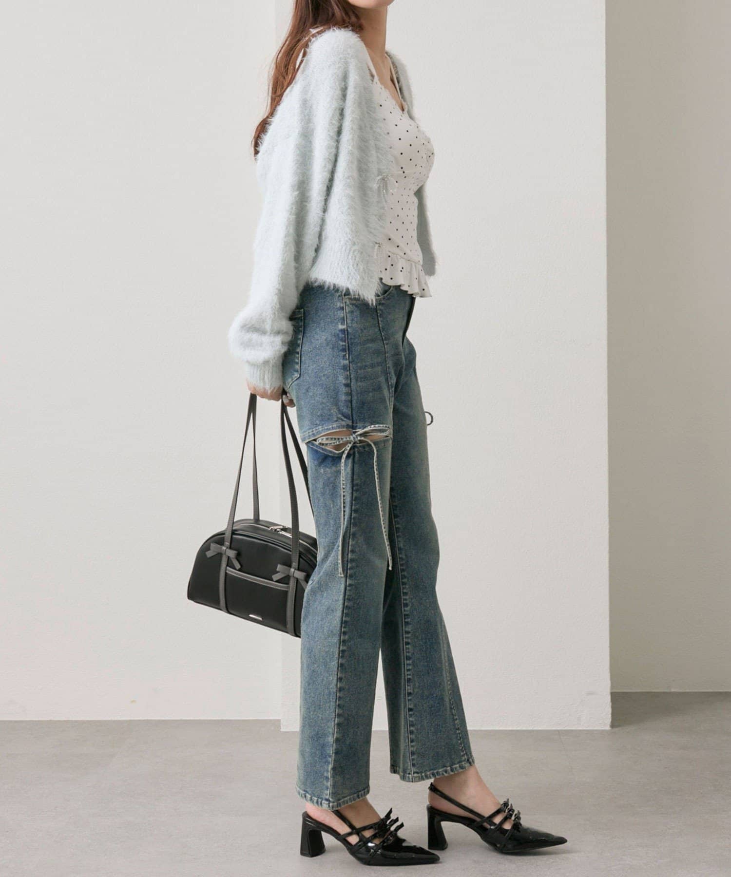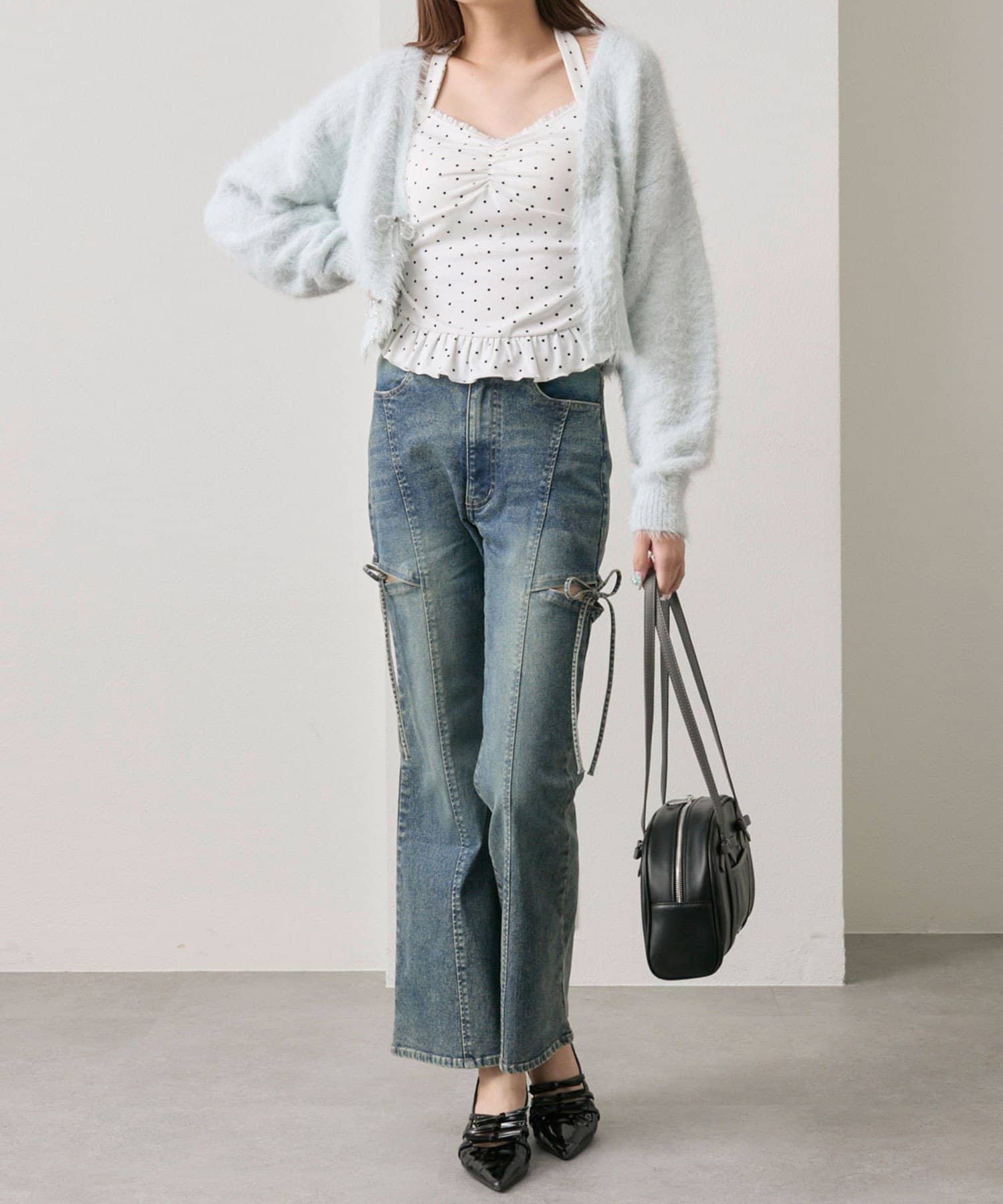 ・さりげなくきらめくビーズリボンが、コーデを華やかにしてくれるフェミニンデザイン。