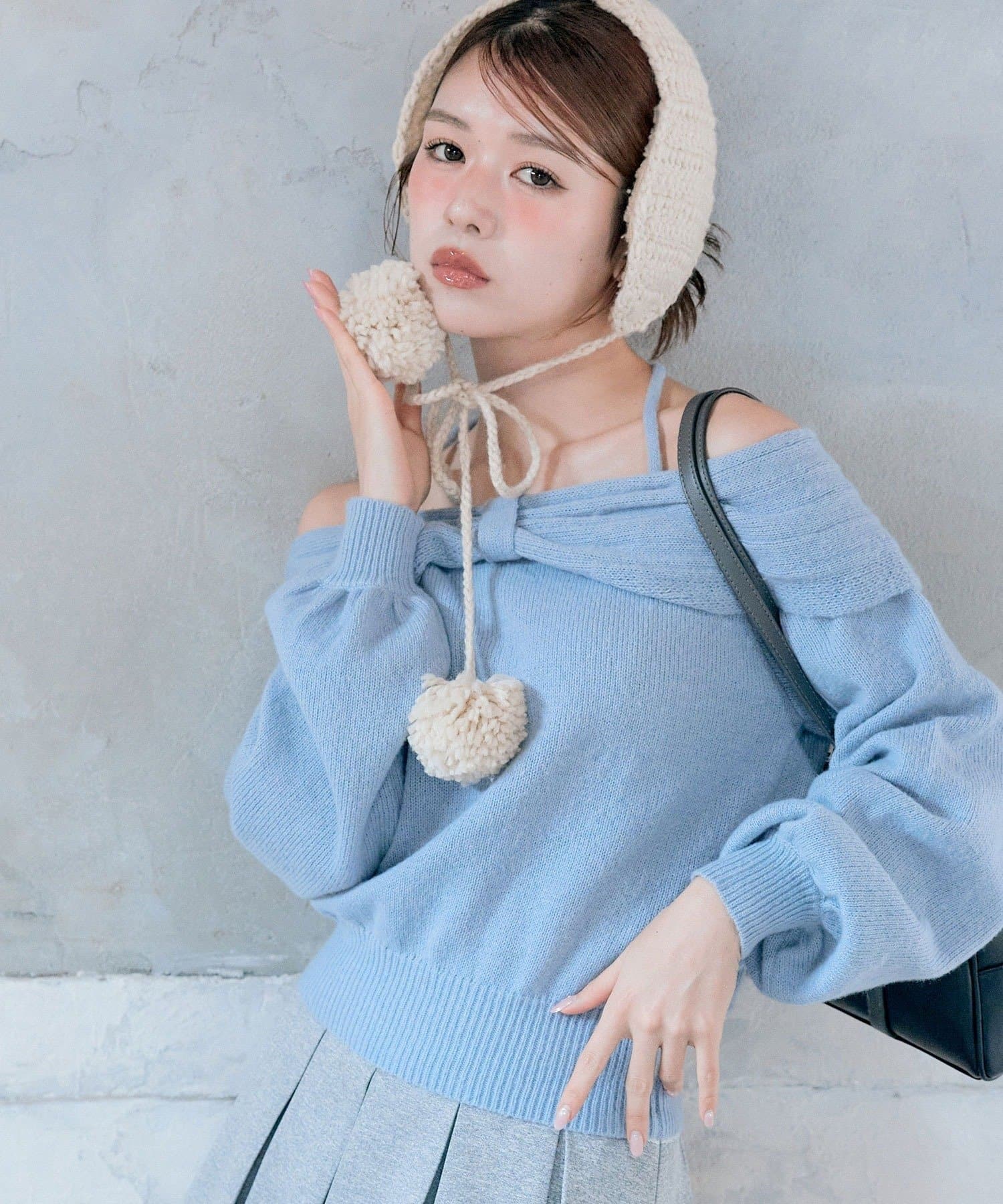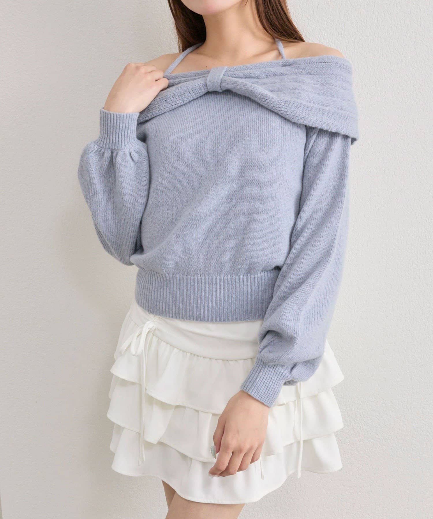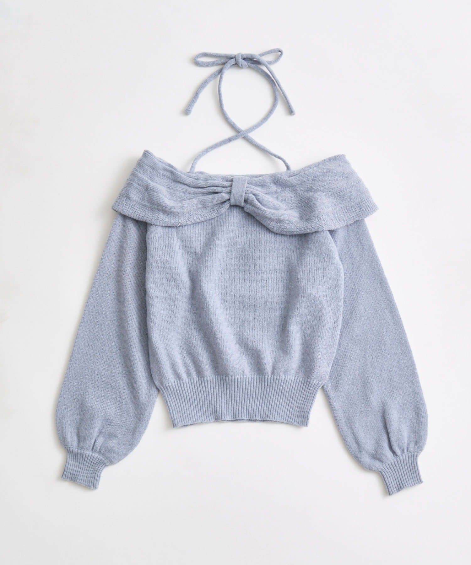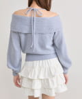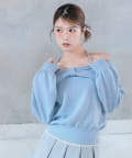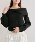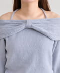 ・デコルテが綺麗にみえるオフショルと胸元のリボンがポイントで、大人かわいい印象になります。