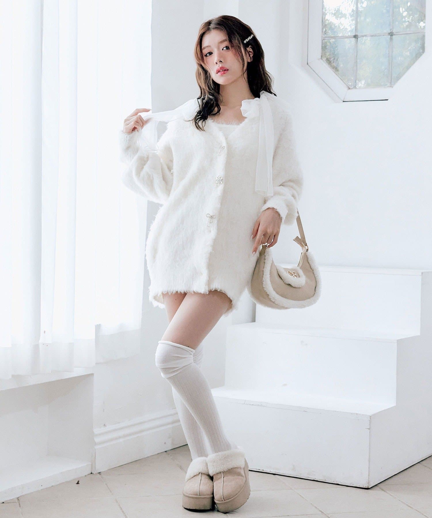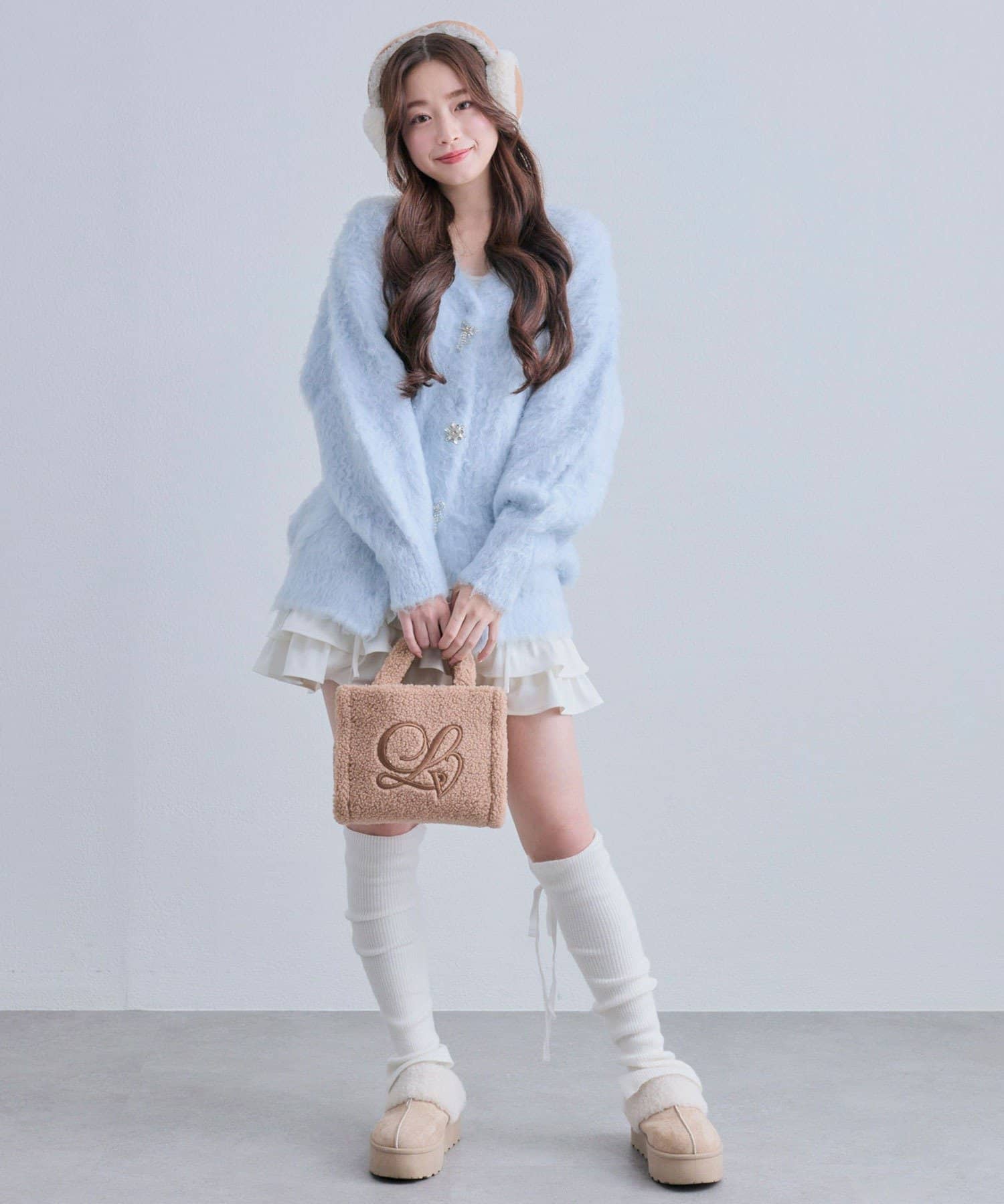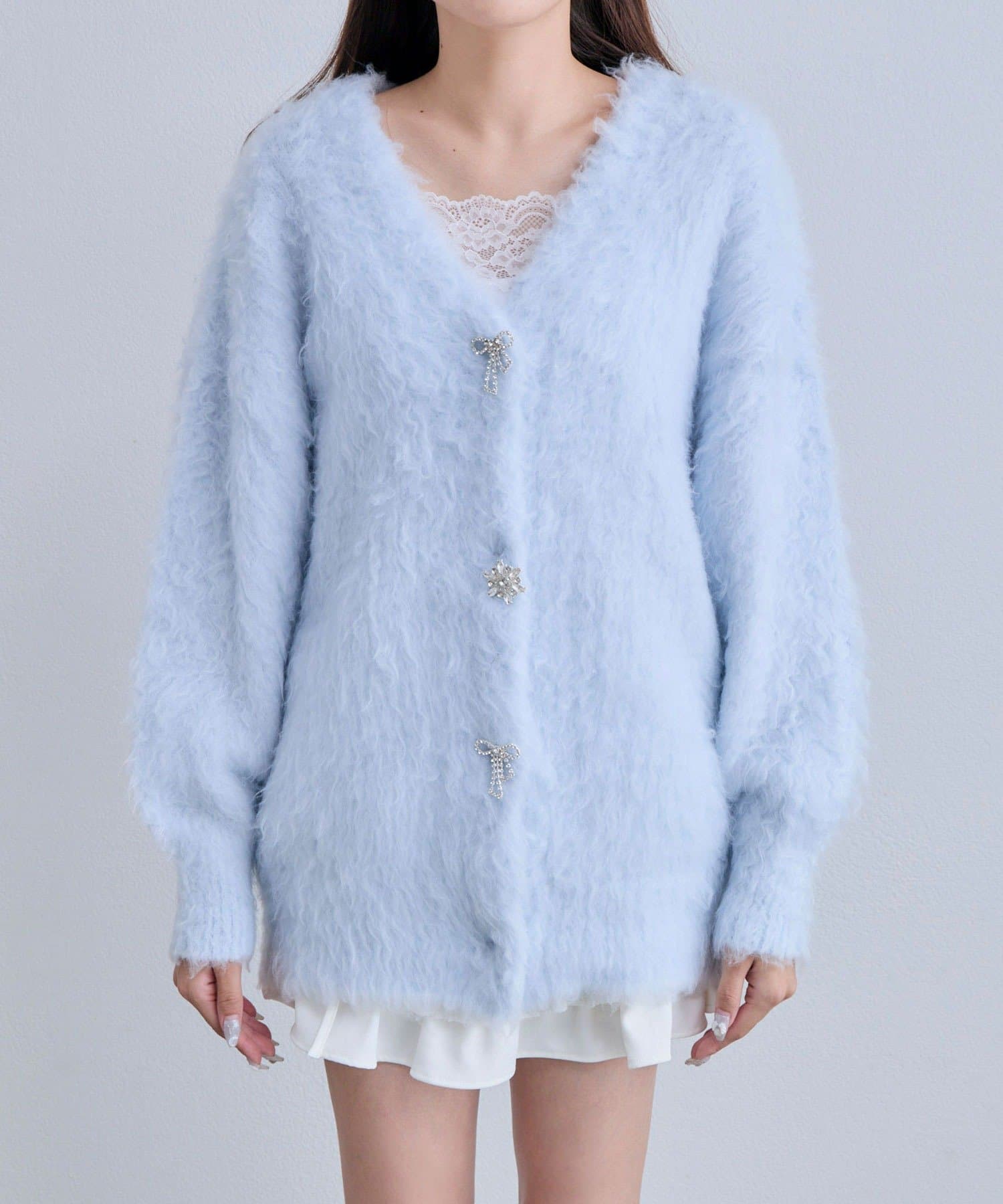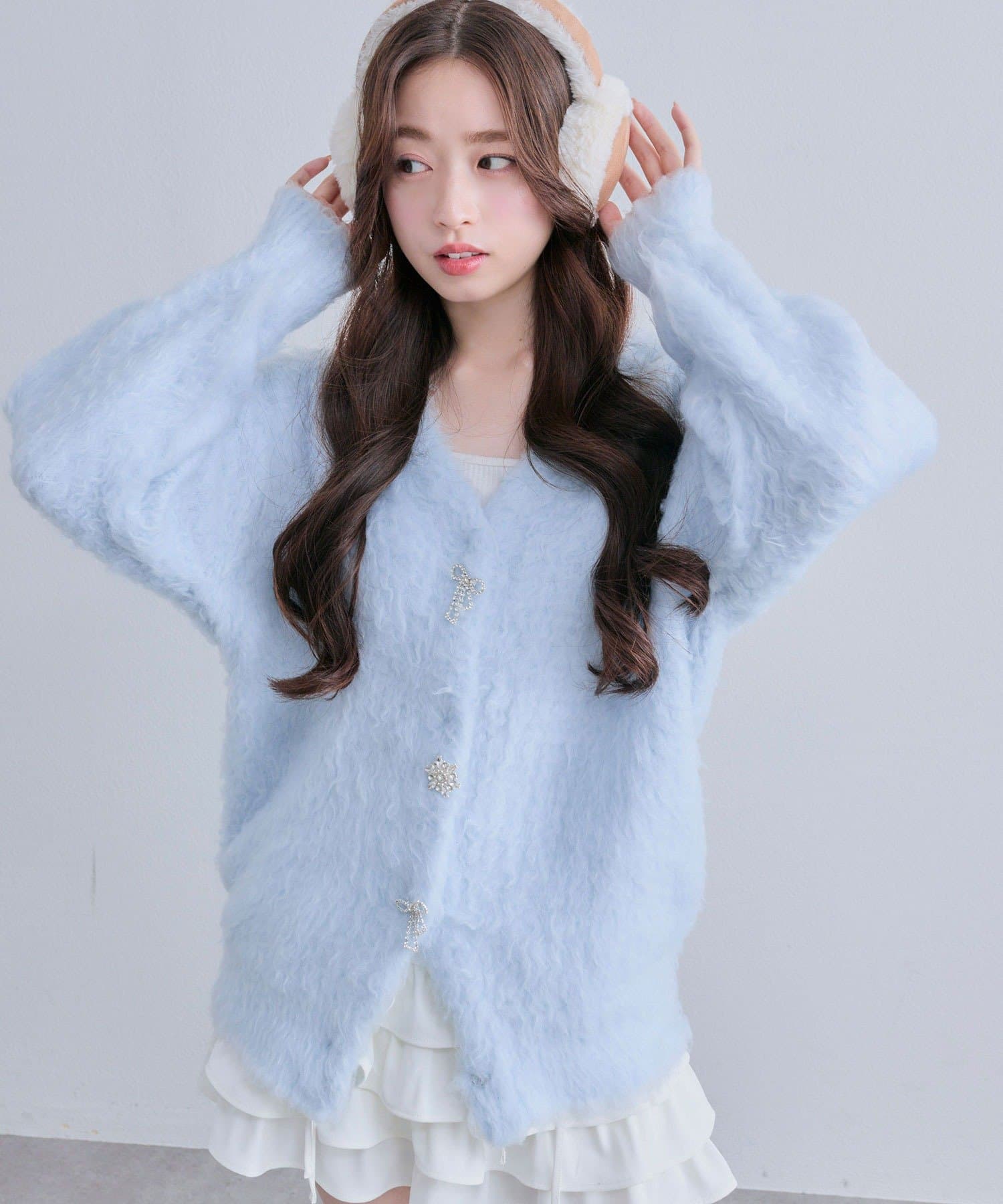 ・雪の結晶とリボンのビジューがかわいい、ロング丈のカーディガン。