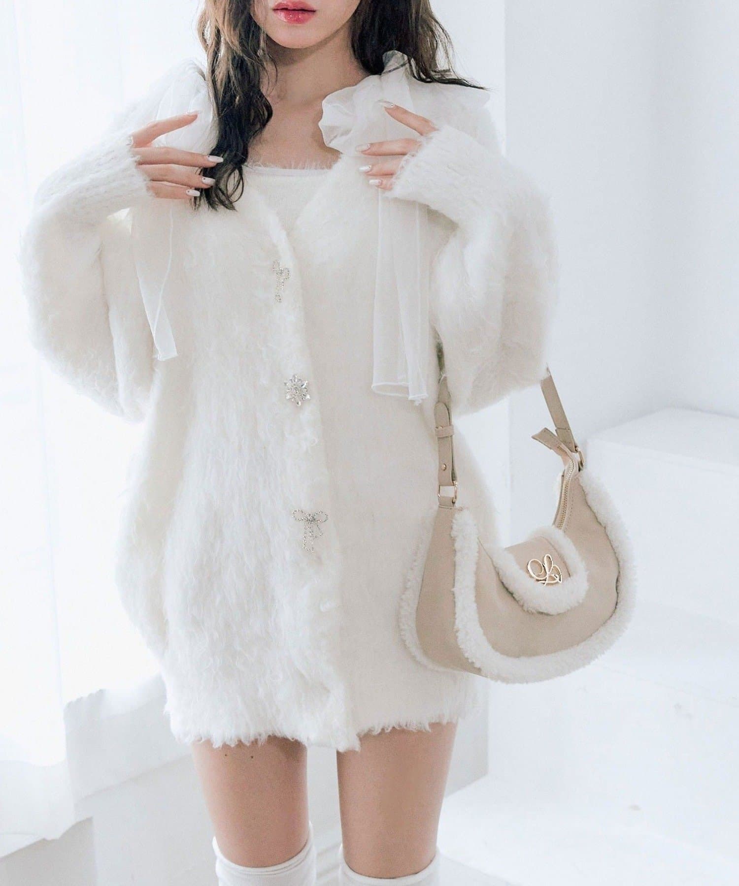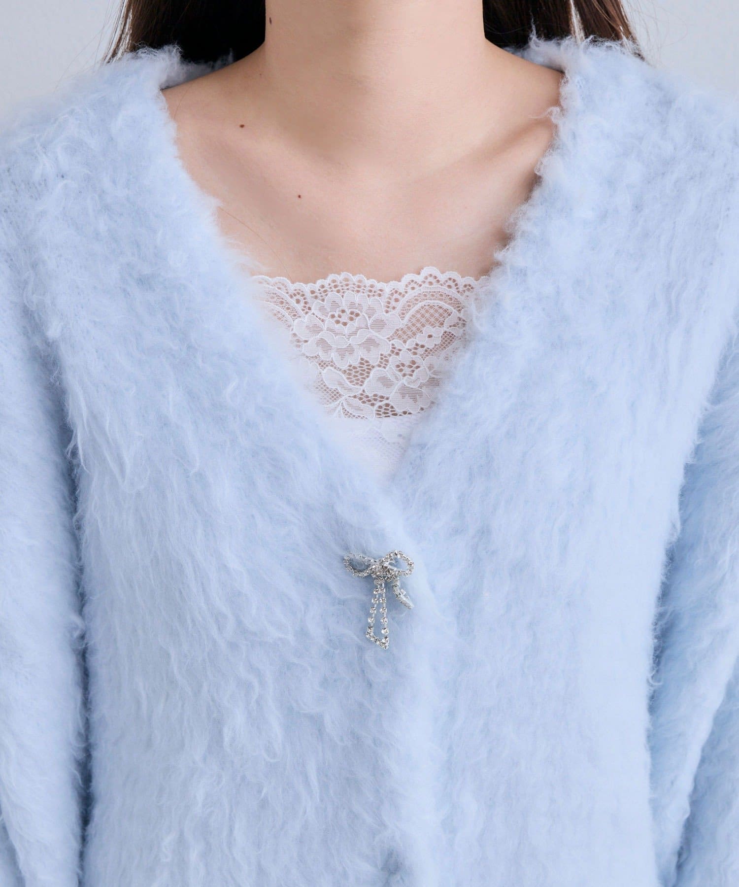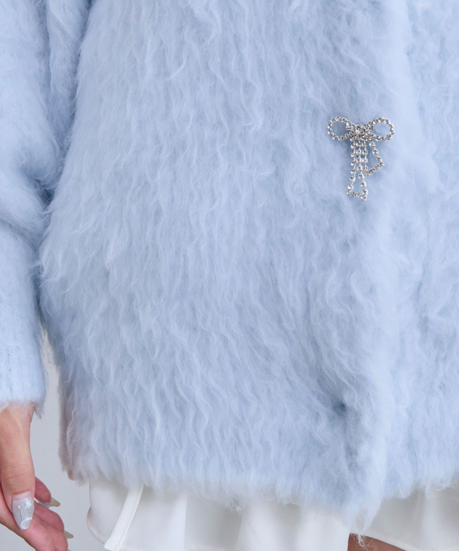 ・雪の結晶とリボンのビジューがかわいい、ロング丈のカーディガン。