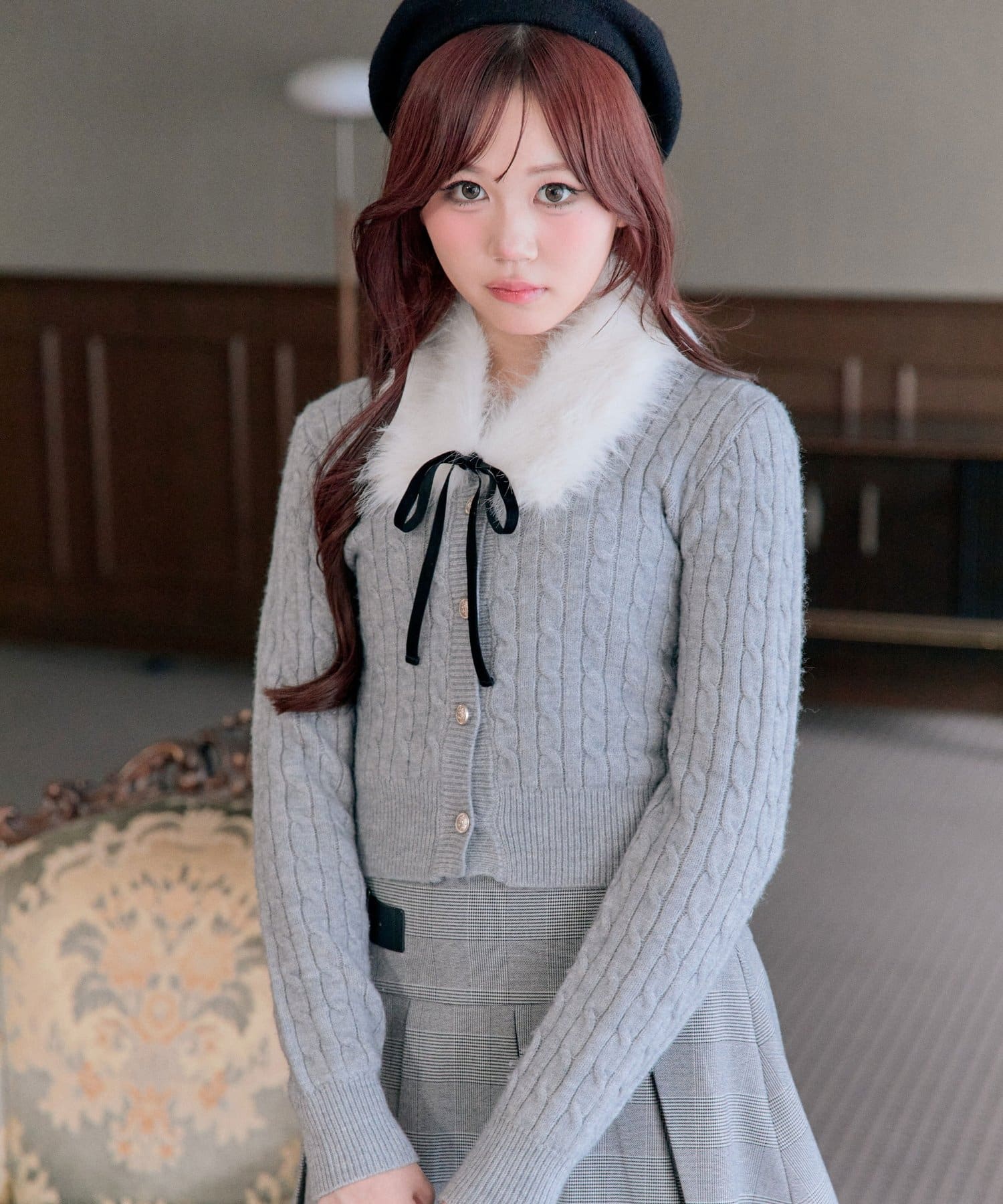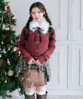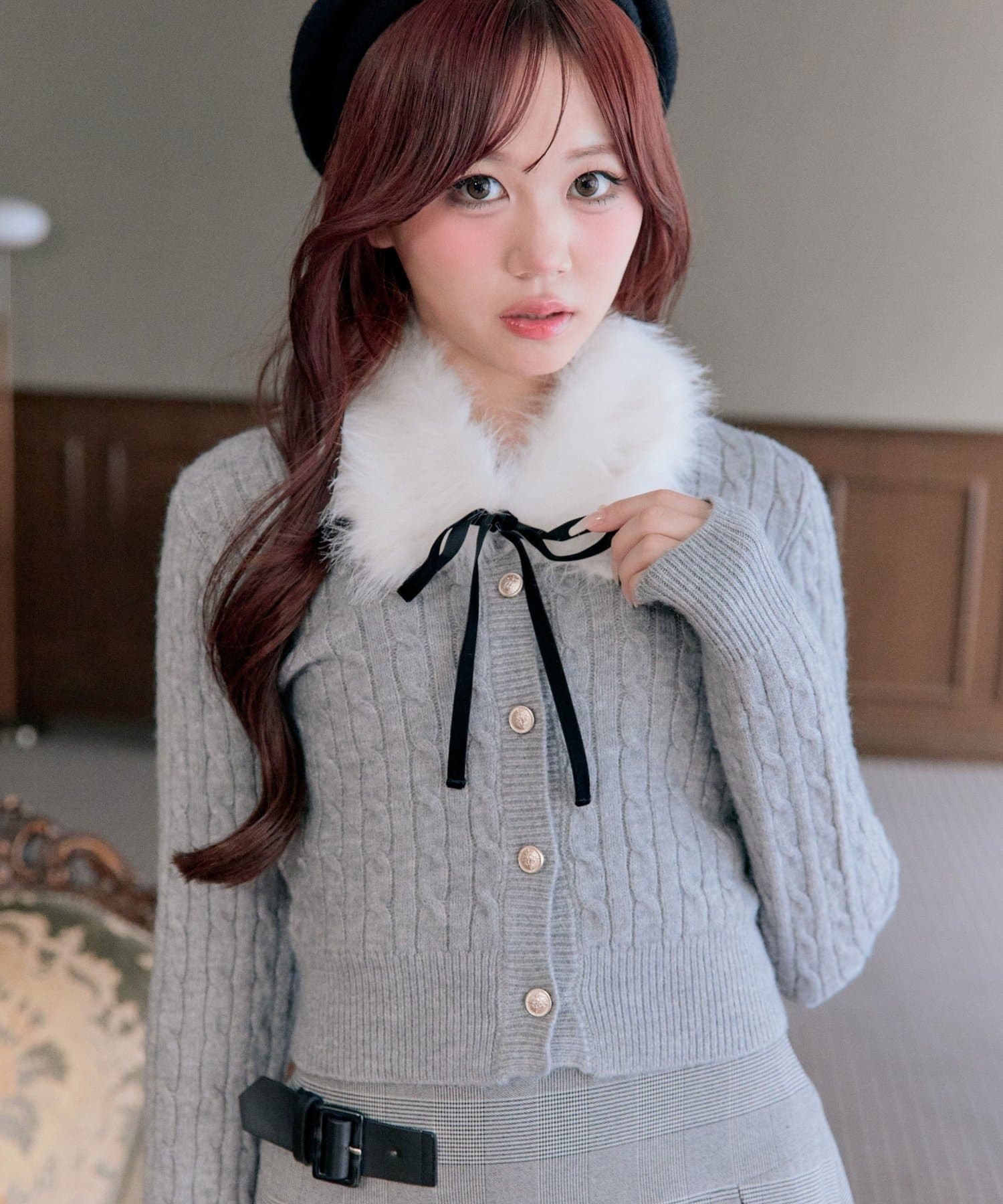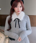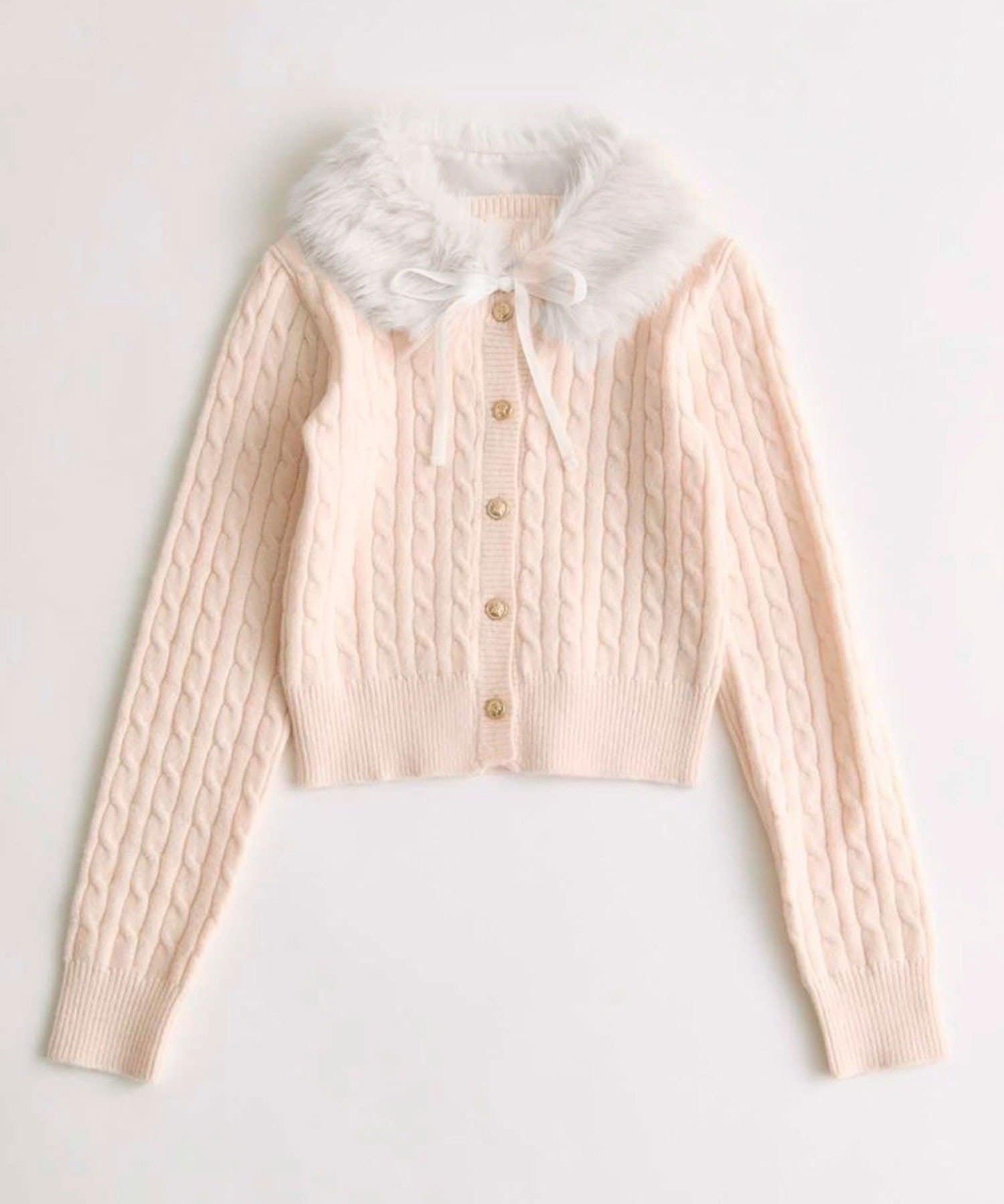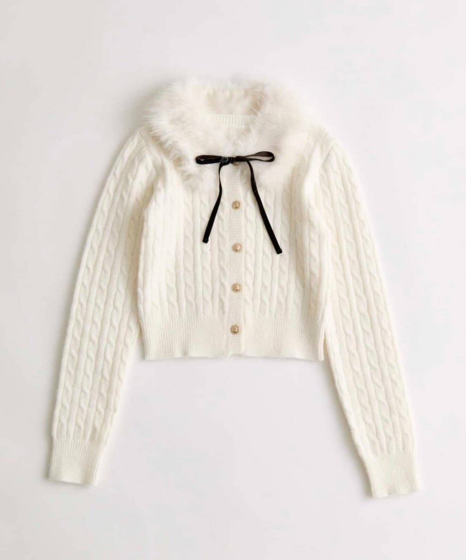 ・ベロアリボン付きのファーティペットと、金ボタンが映えるケーブルカーディガンのセット。