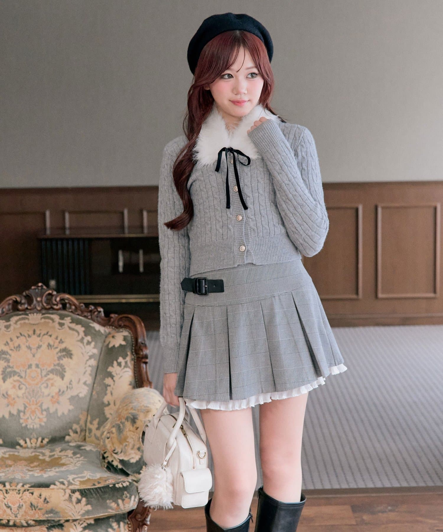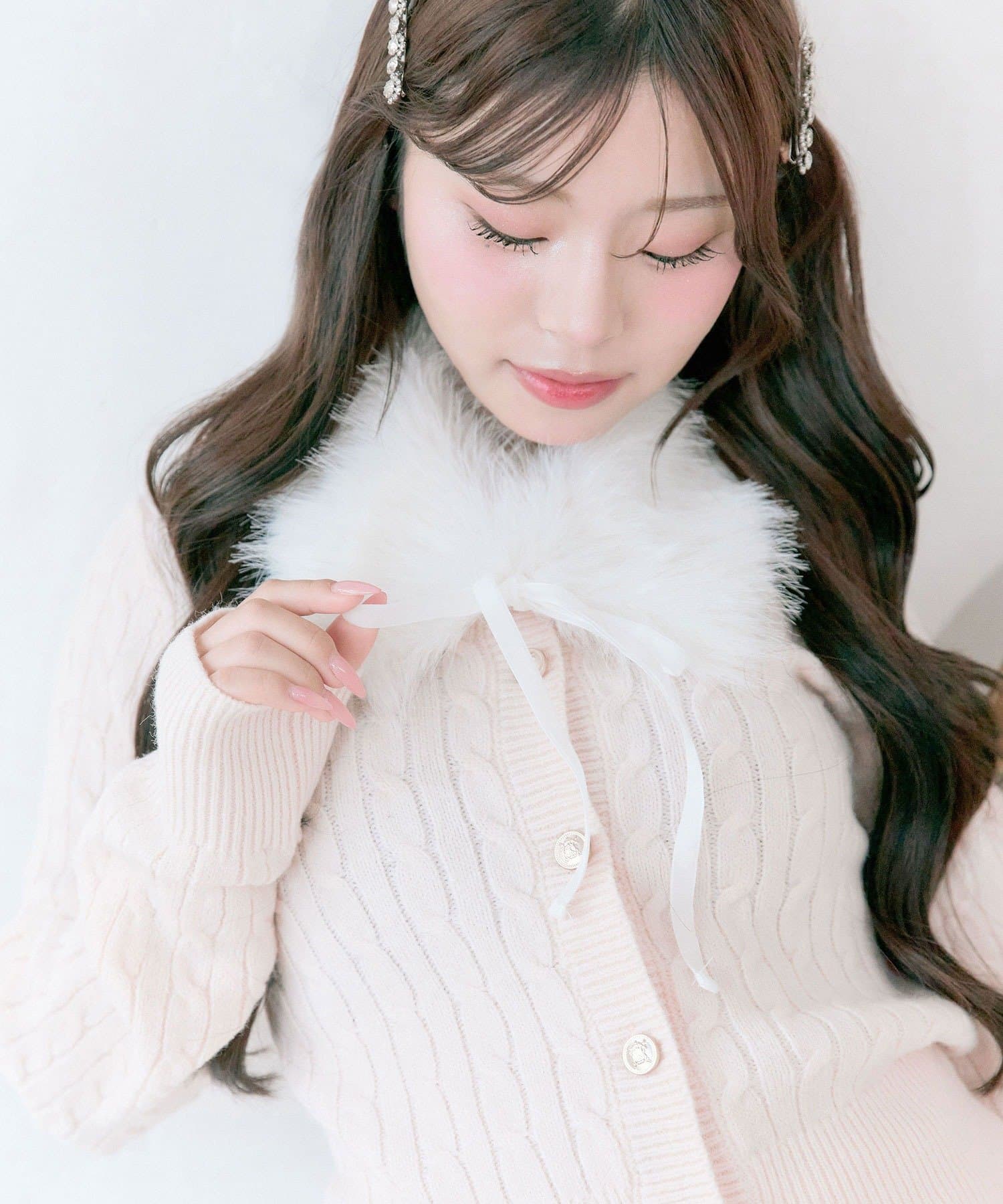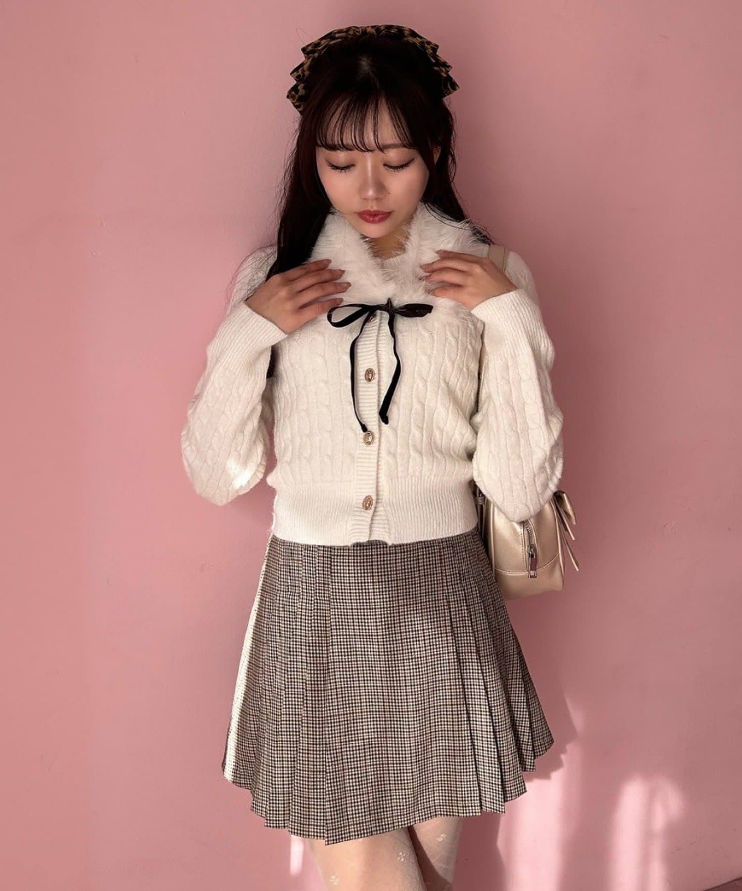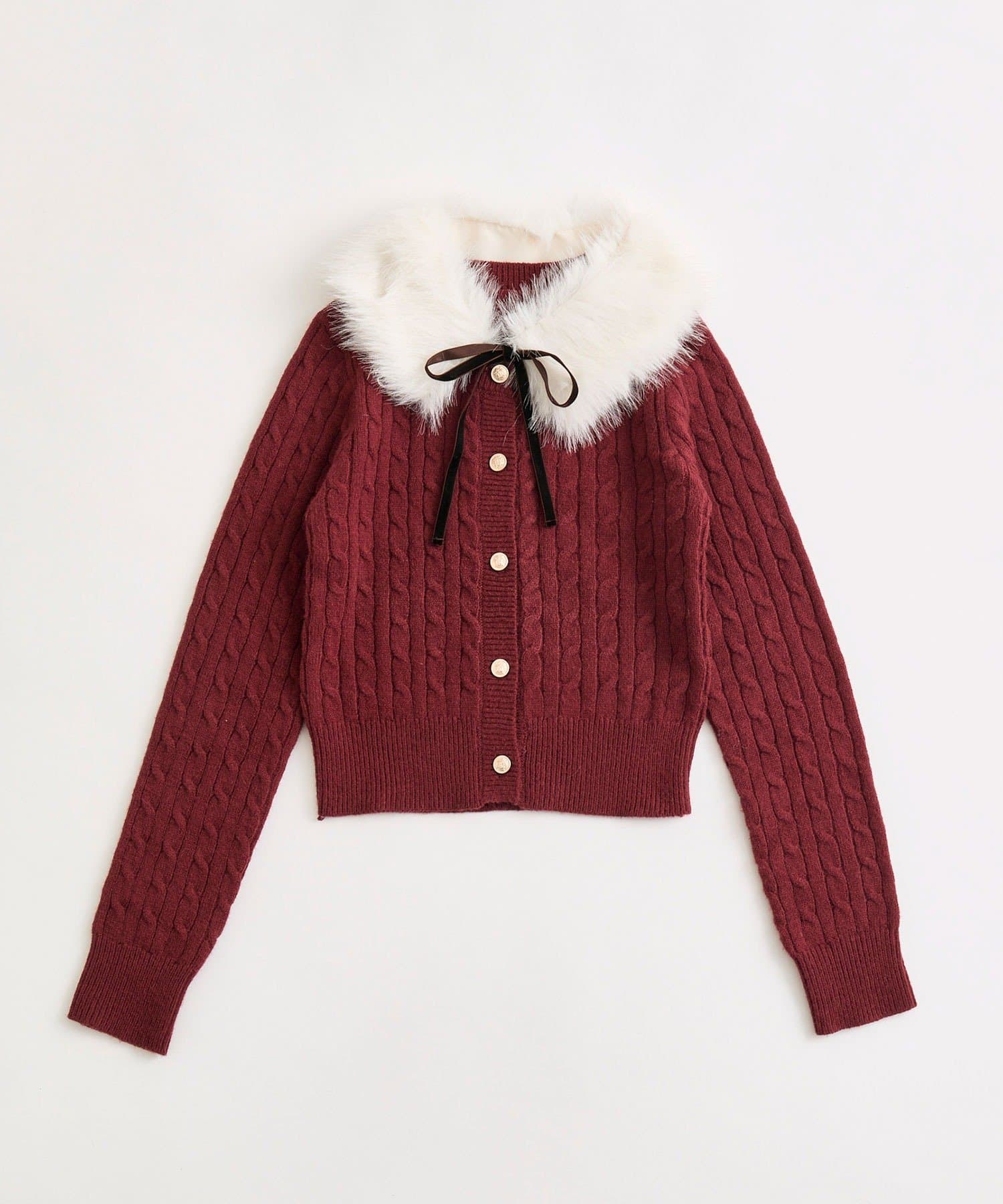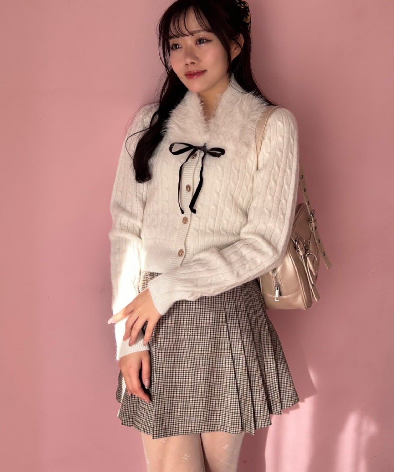 ・ベロアリボン付きのファーティペットと、金ボタンが映えるケーブルカーディガンのセット。