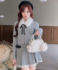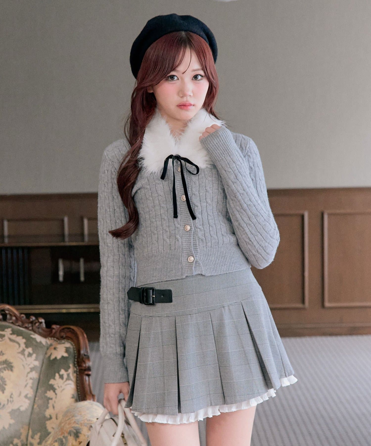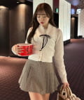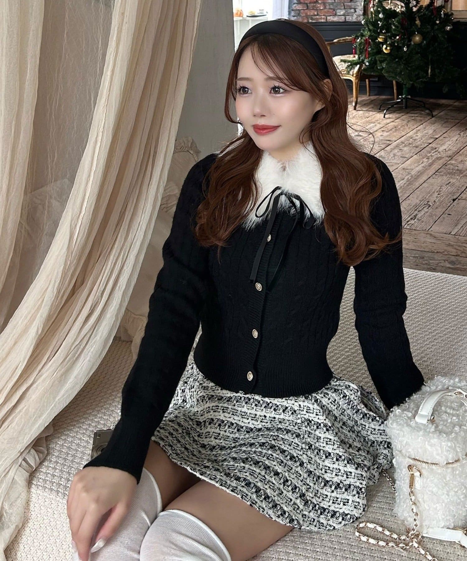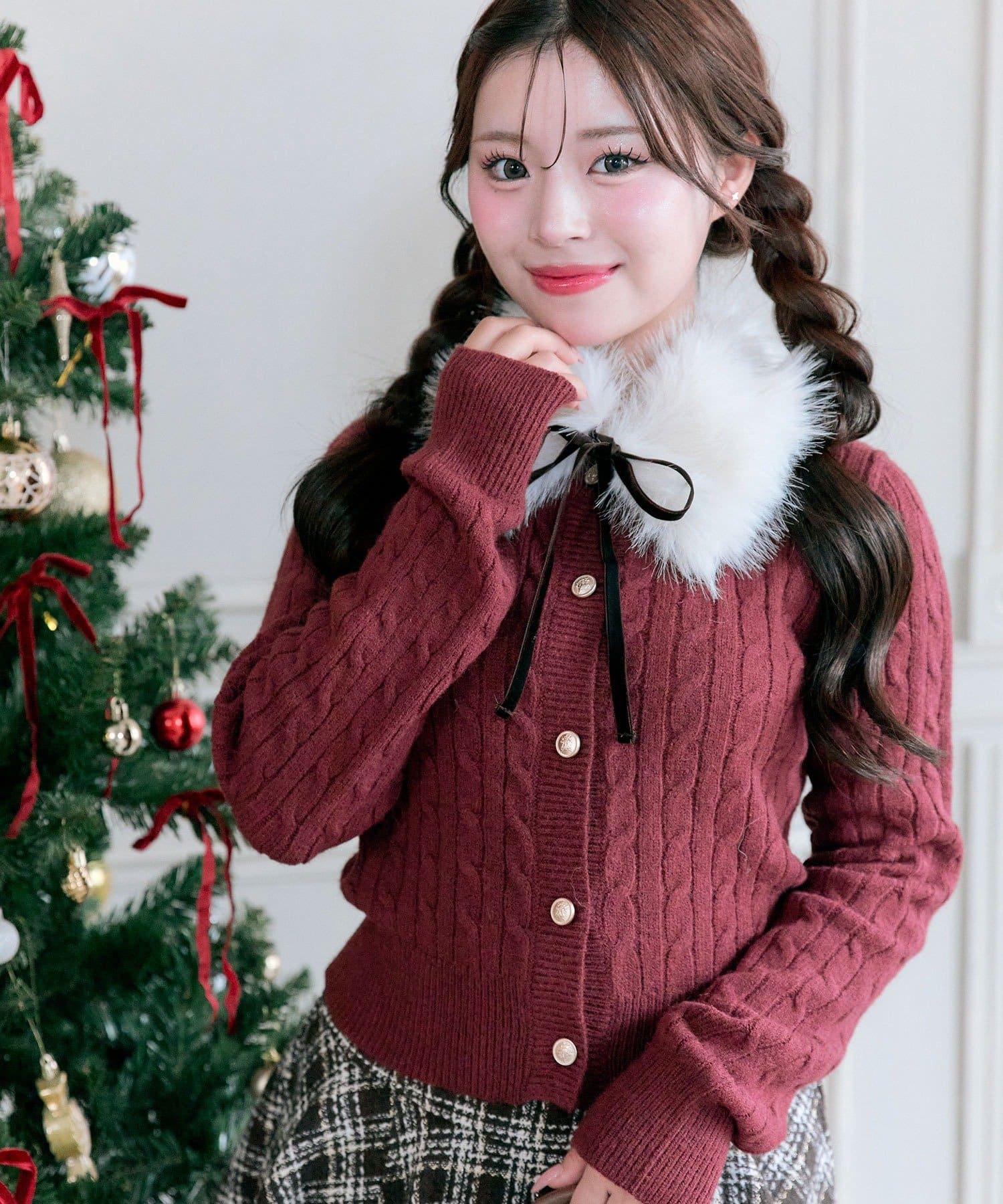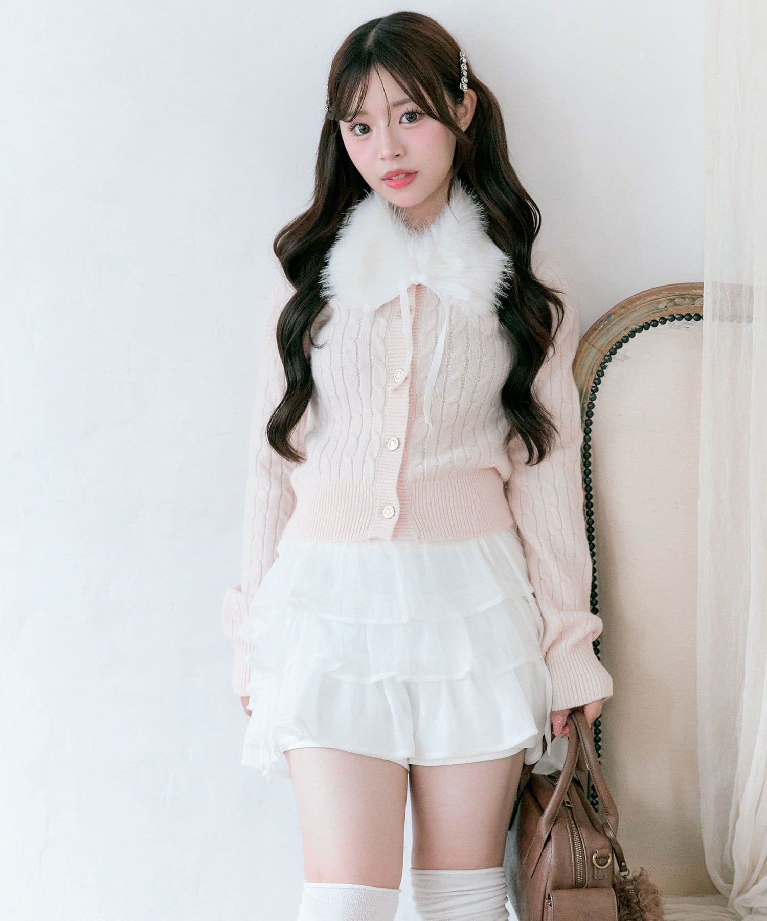 ・ベロアリボン付きのファーティペットと、金ボタンが映えるケーブルカーディガンのセット。