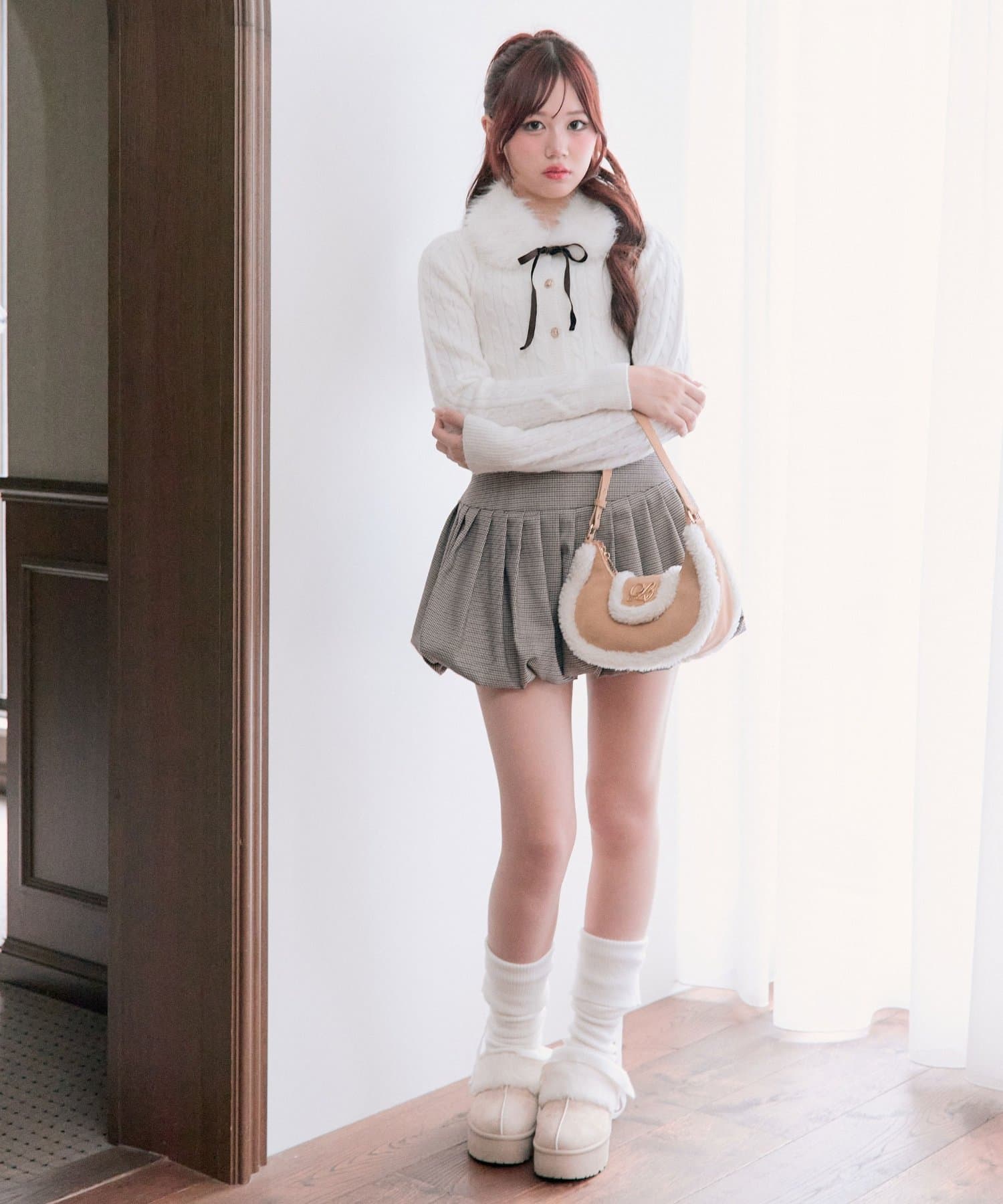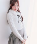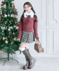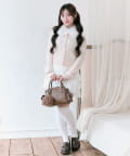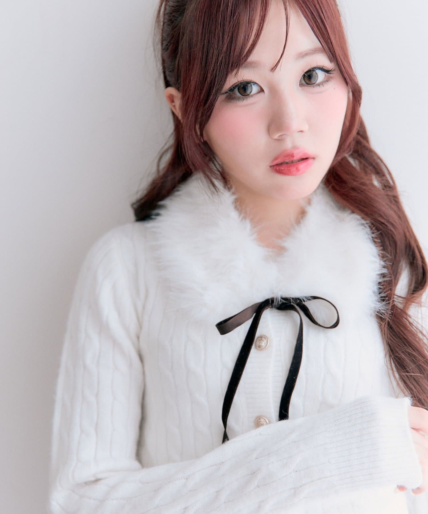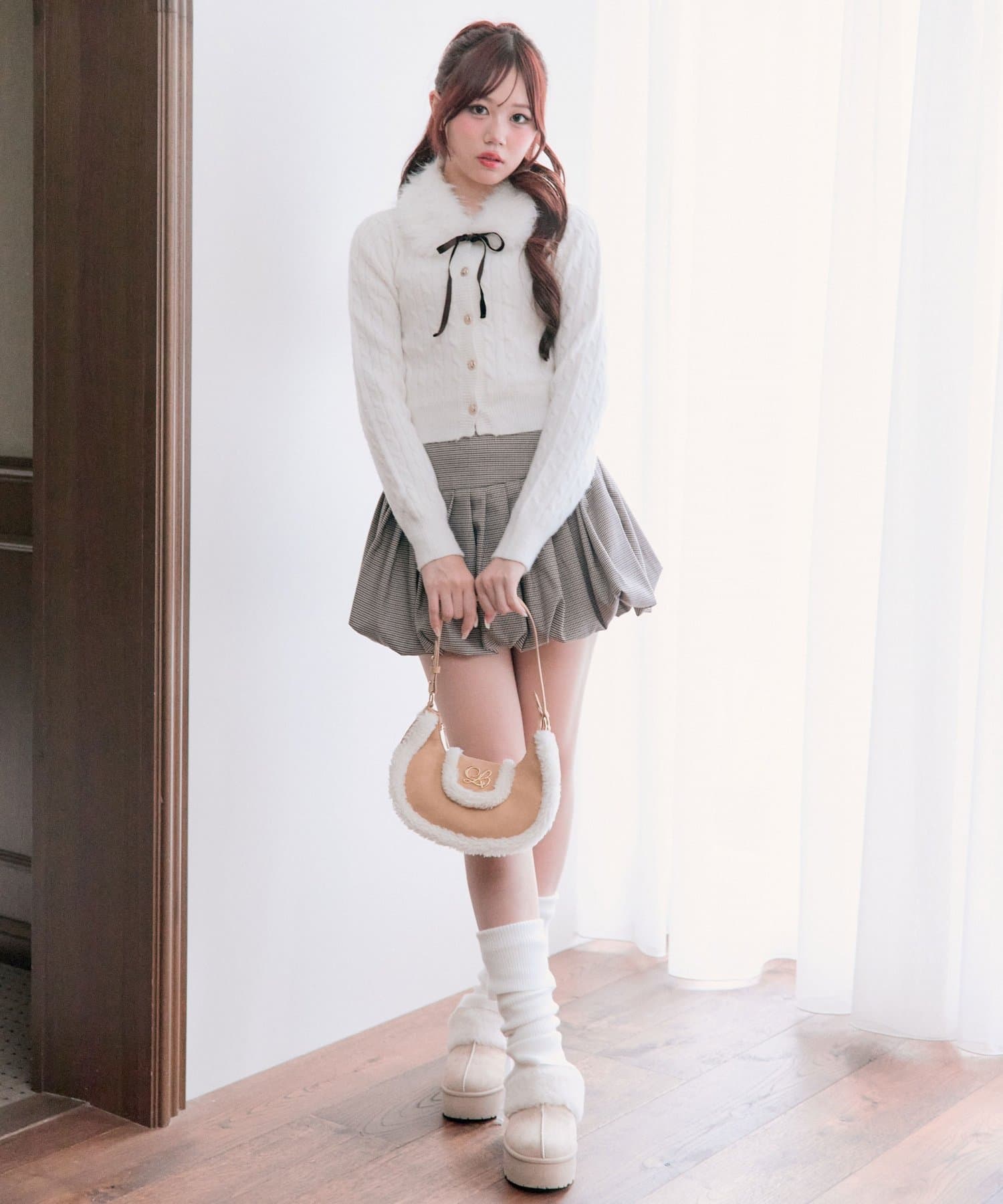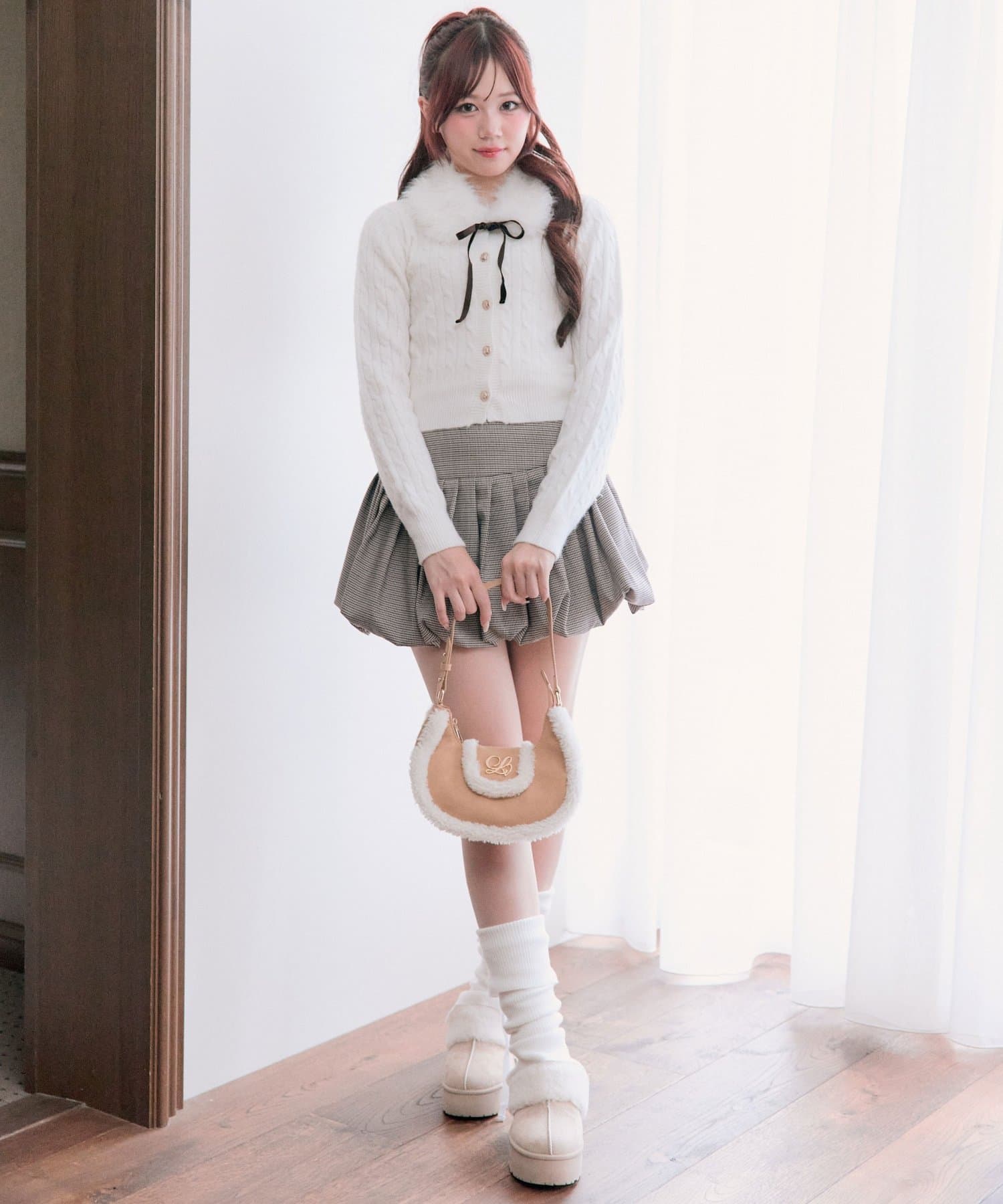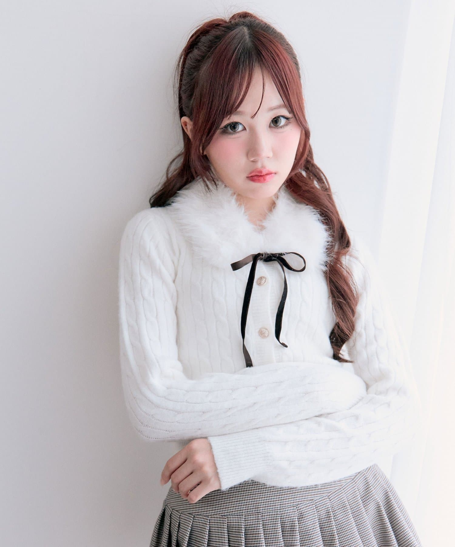 ・ベロアリボン付きのファーティペットと、金ボタンが映えるケーブルカーディガンのセット。