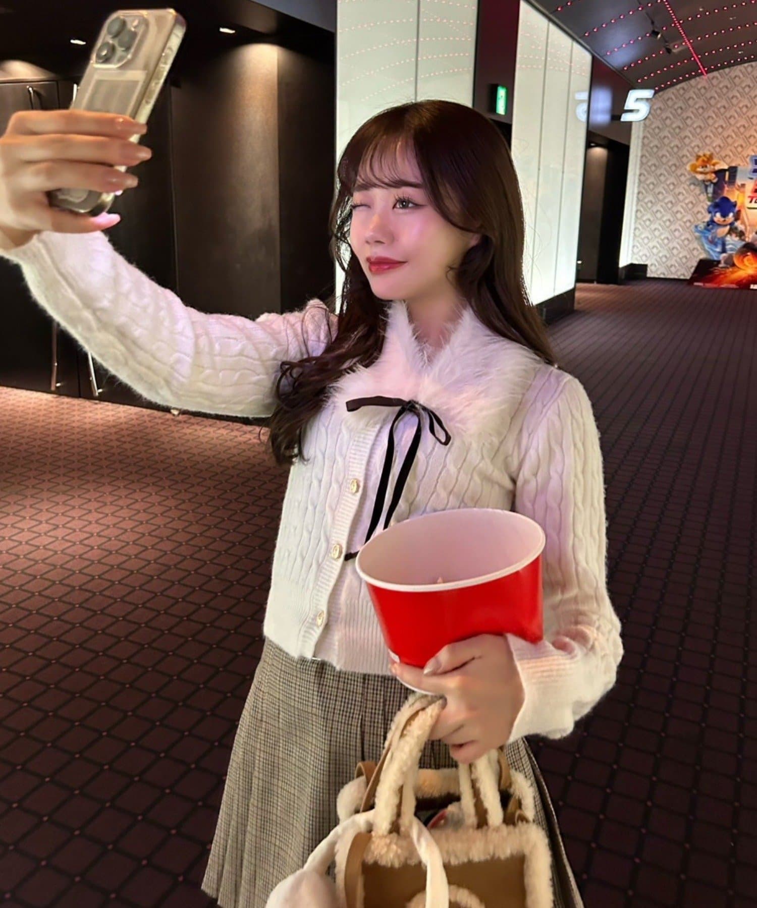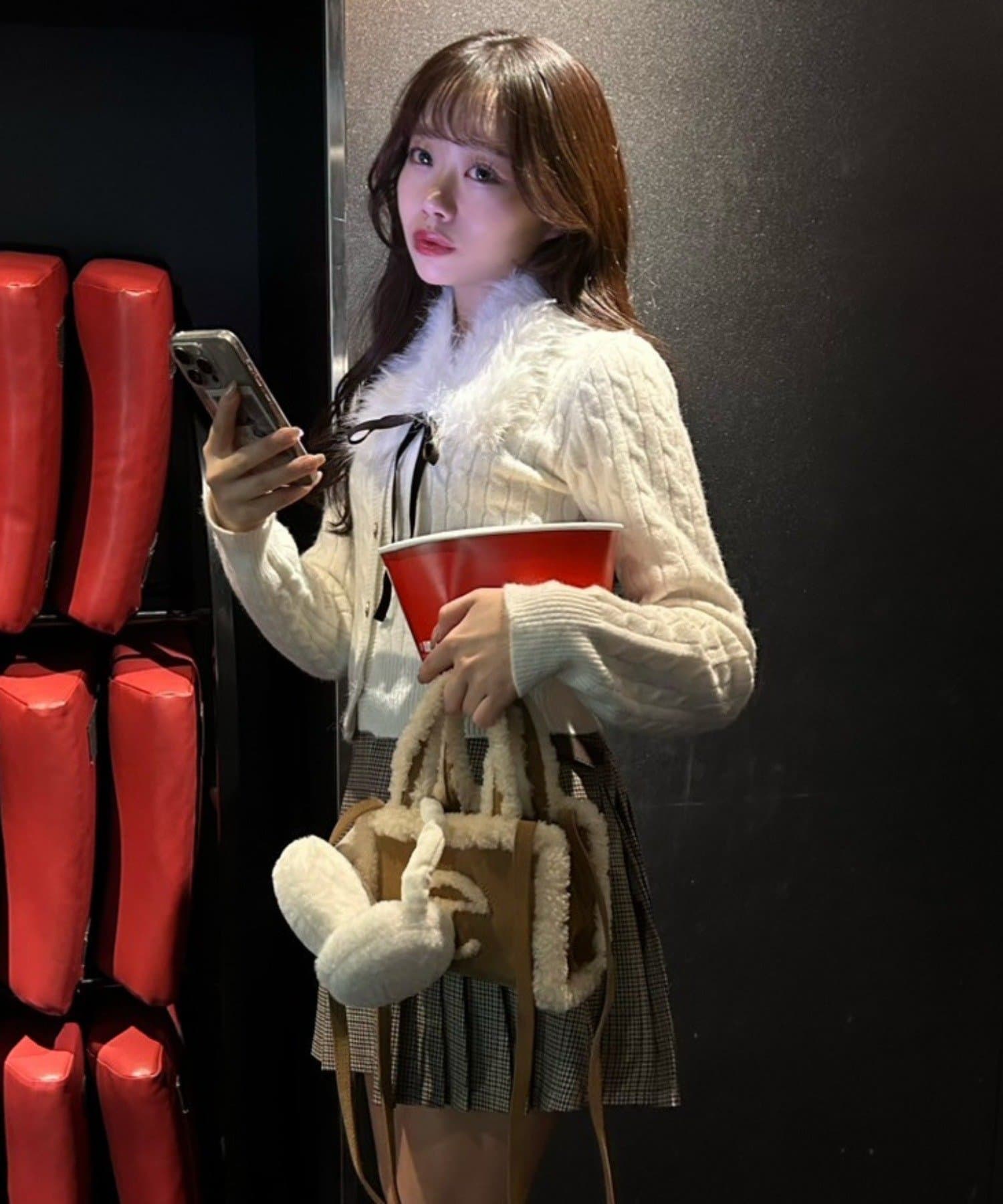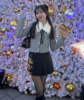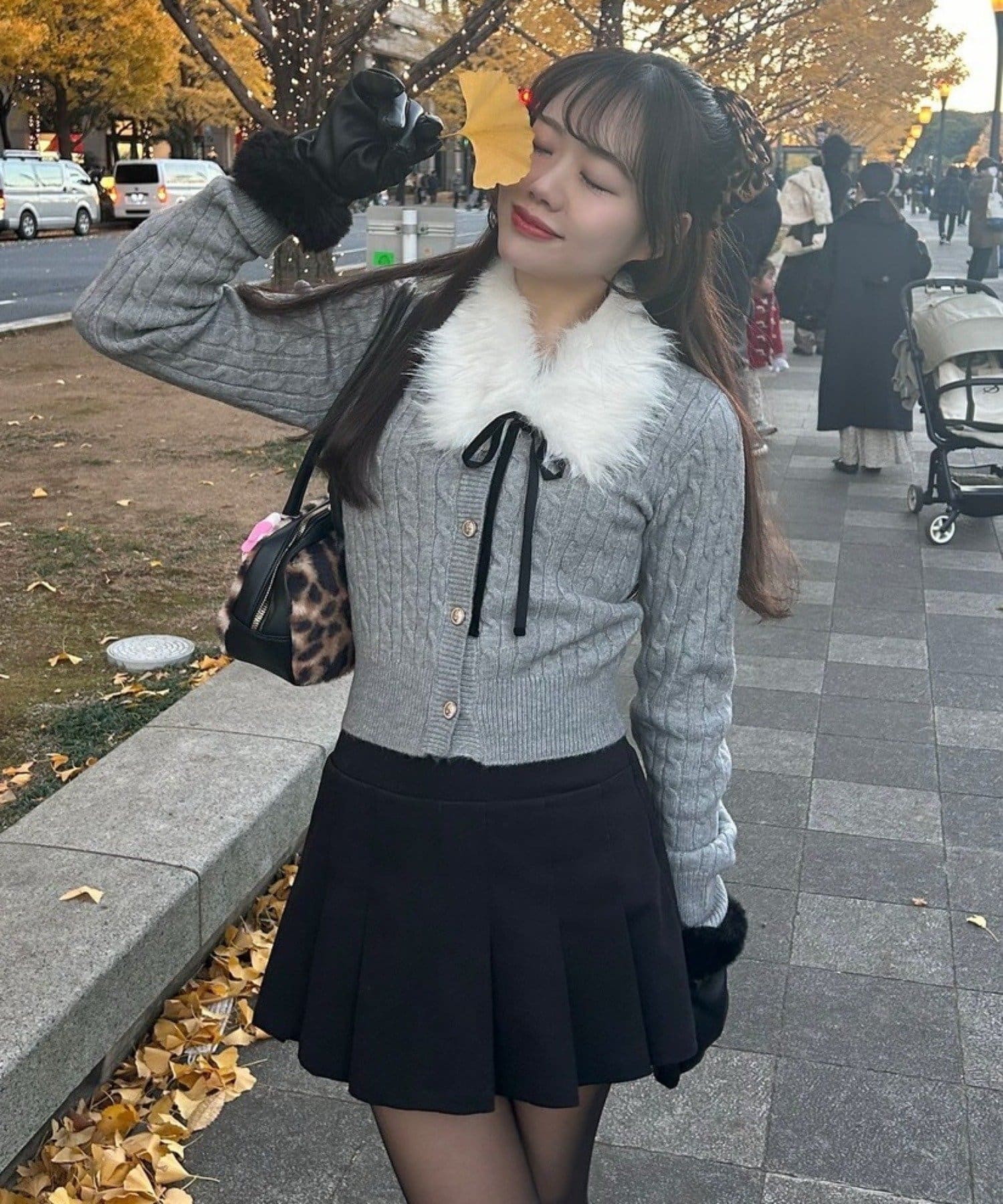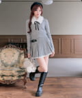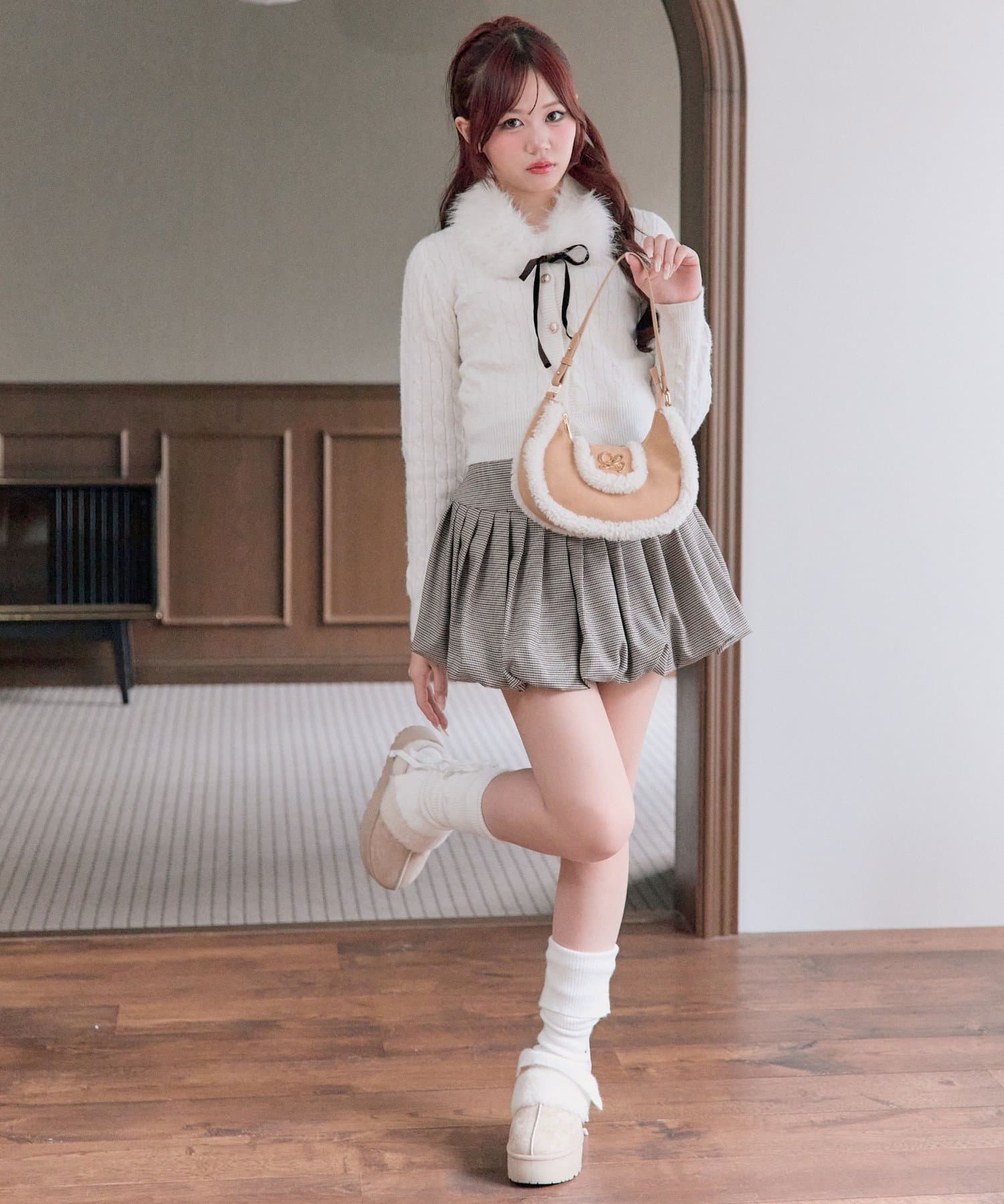 ・ベロアリボン付きのファーティペットと、金ボタンが映えるケーブルカーディガンのセット。