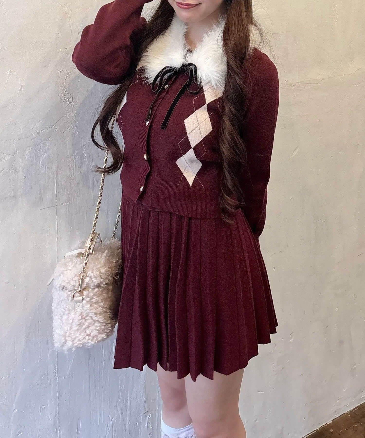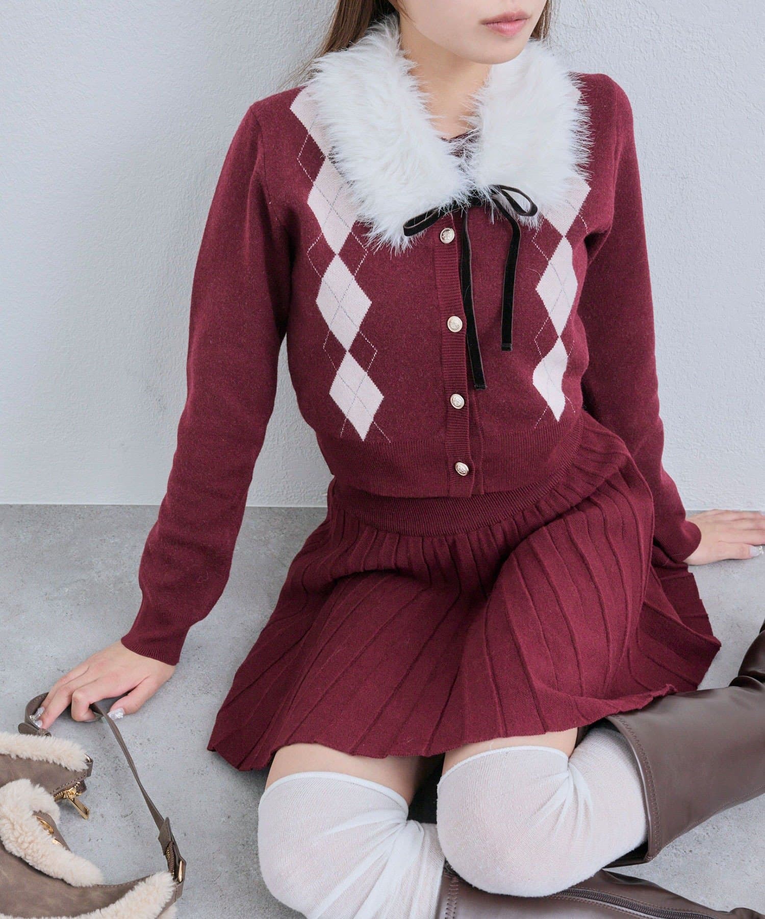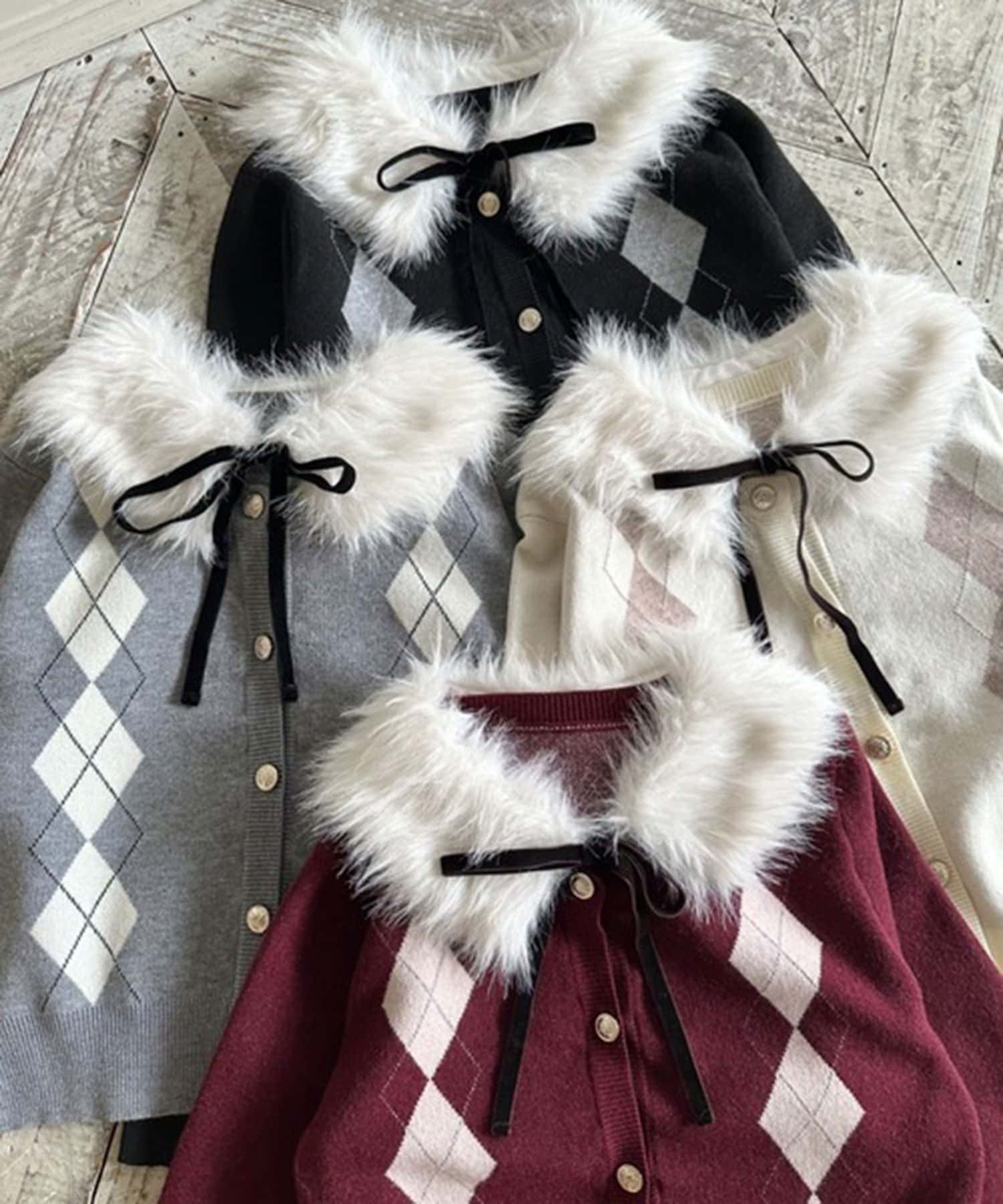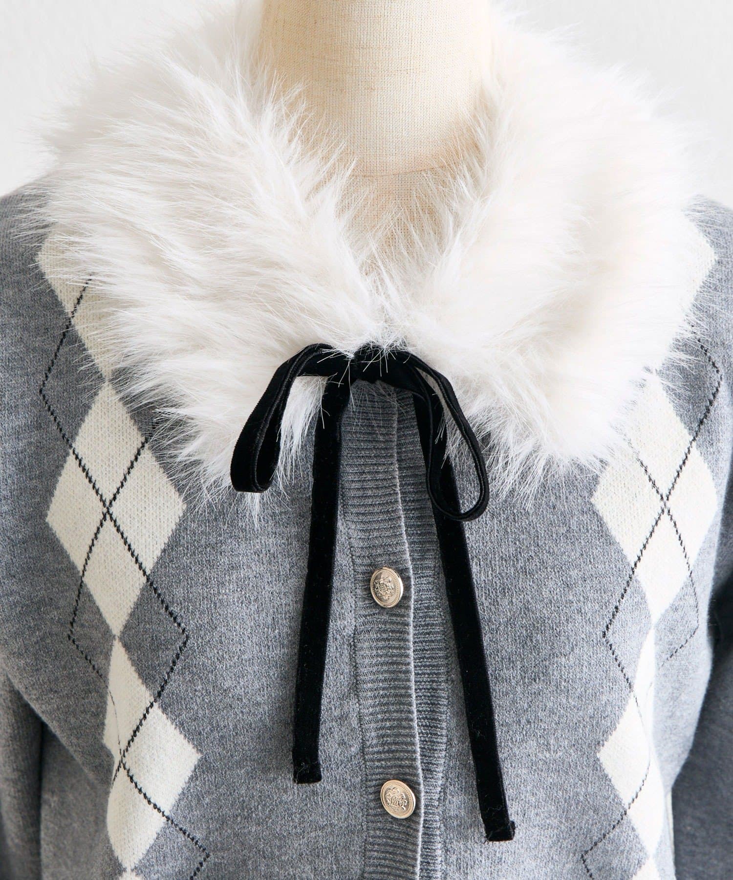・ベロアリボン付きのファーティペットと、キラキラの糸を使用したアーガイルチェックのニットセット。