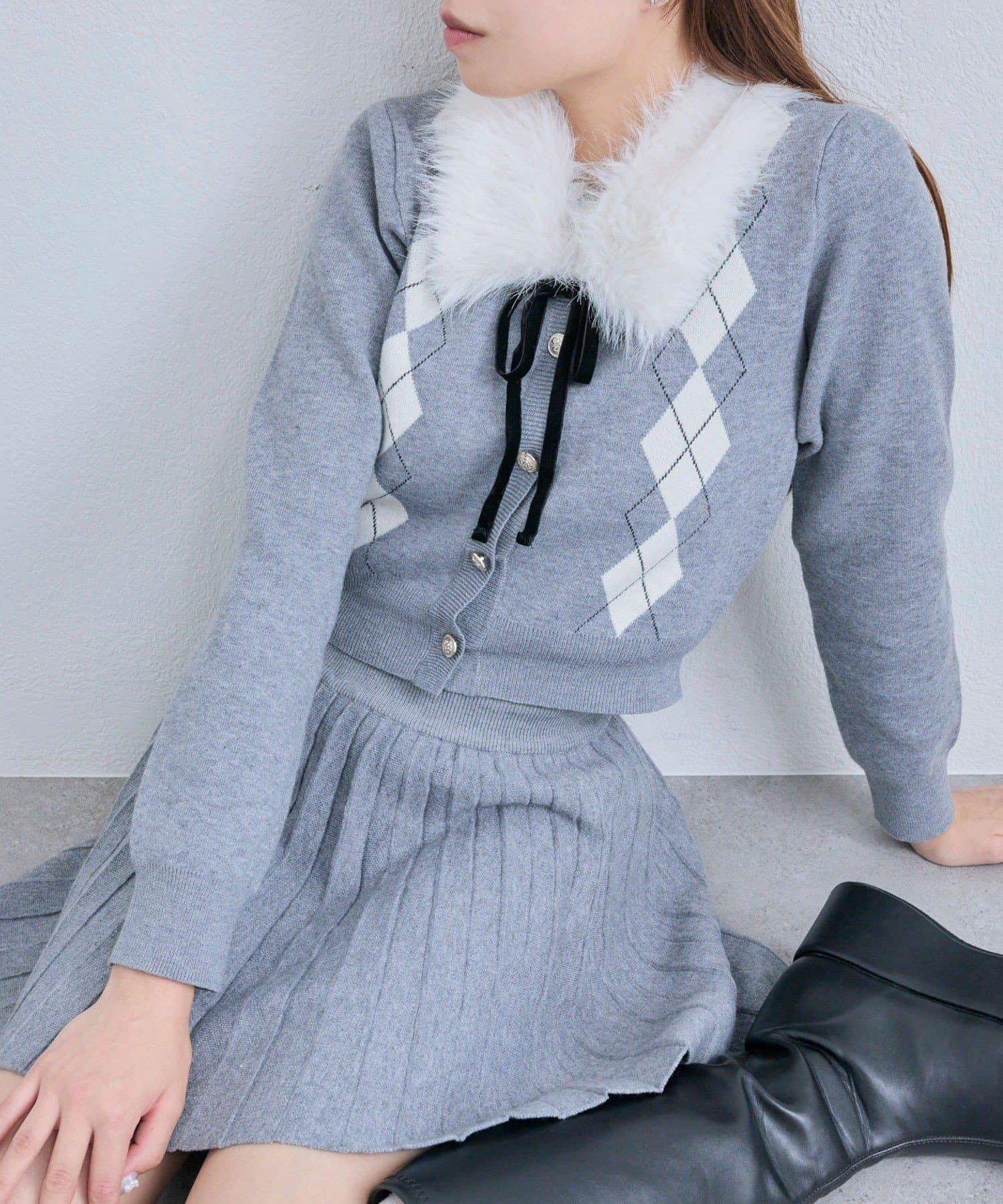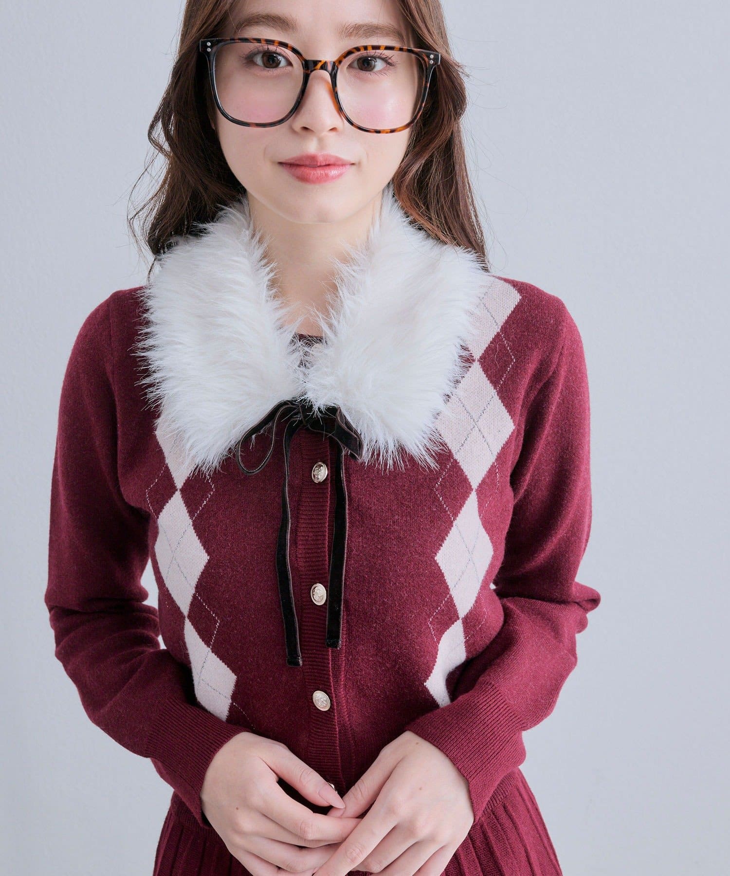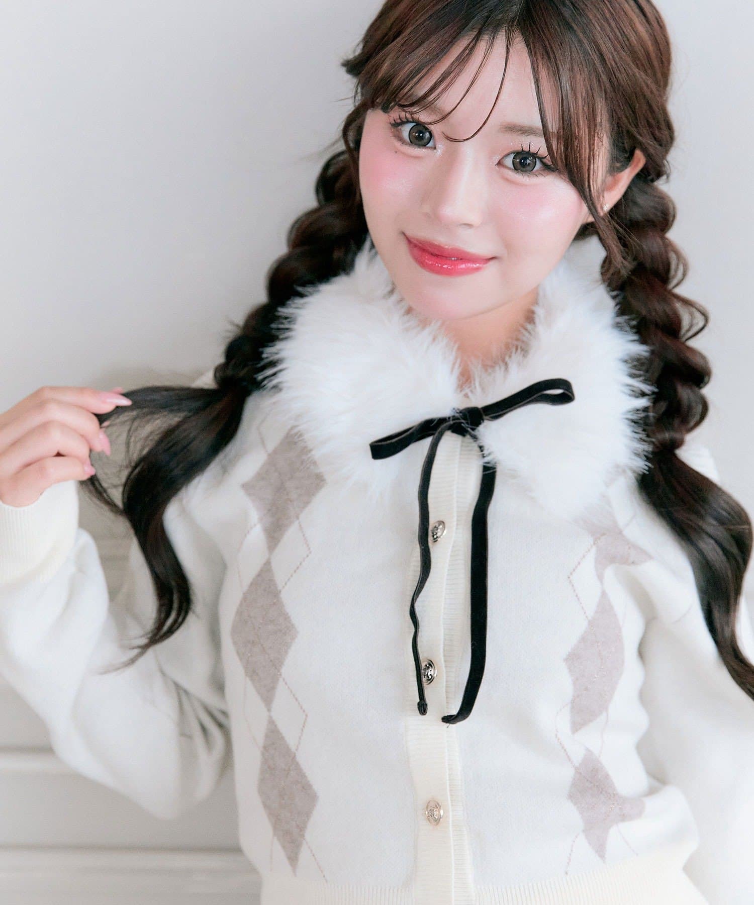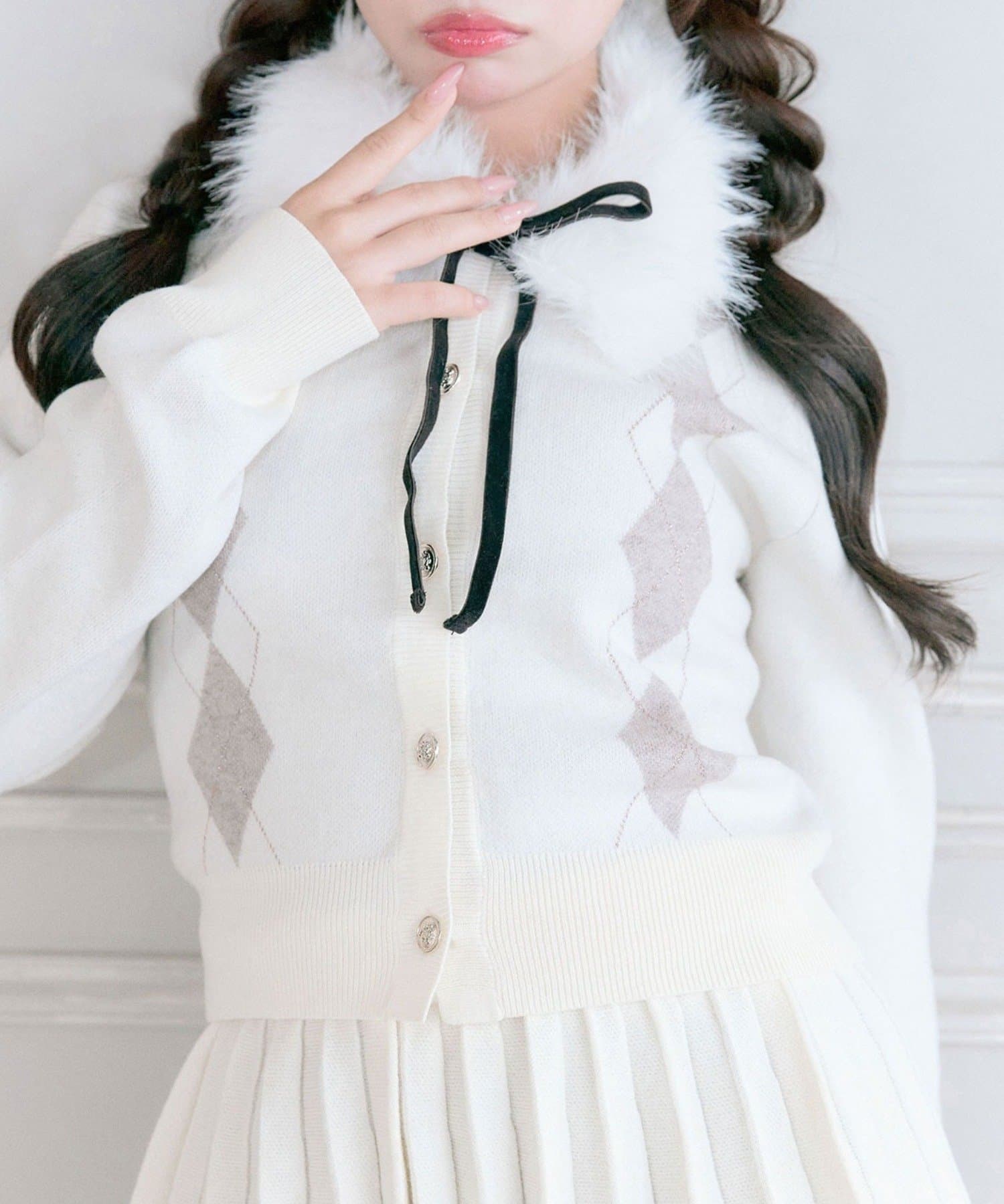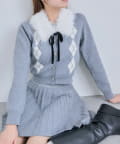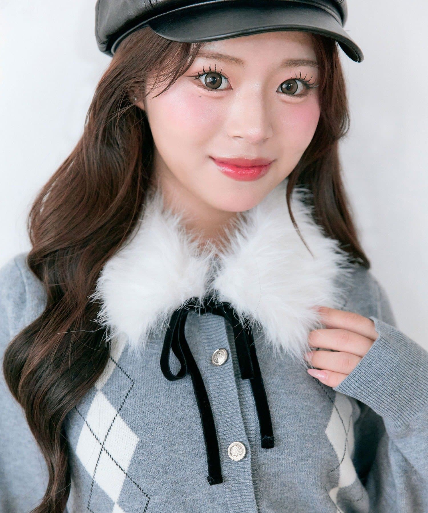 ・ベロアリボン付きのファーティペットと、キラキラの糸を使用したアーガイルチェックのニットセット。