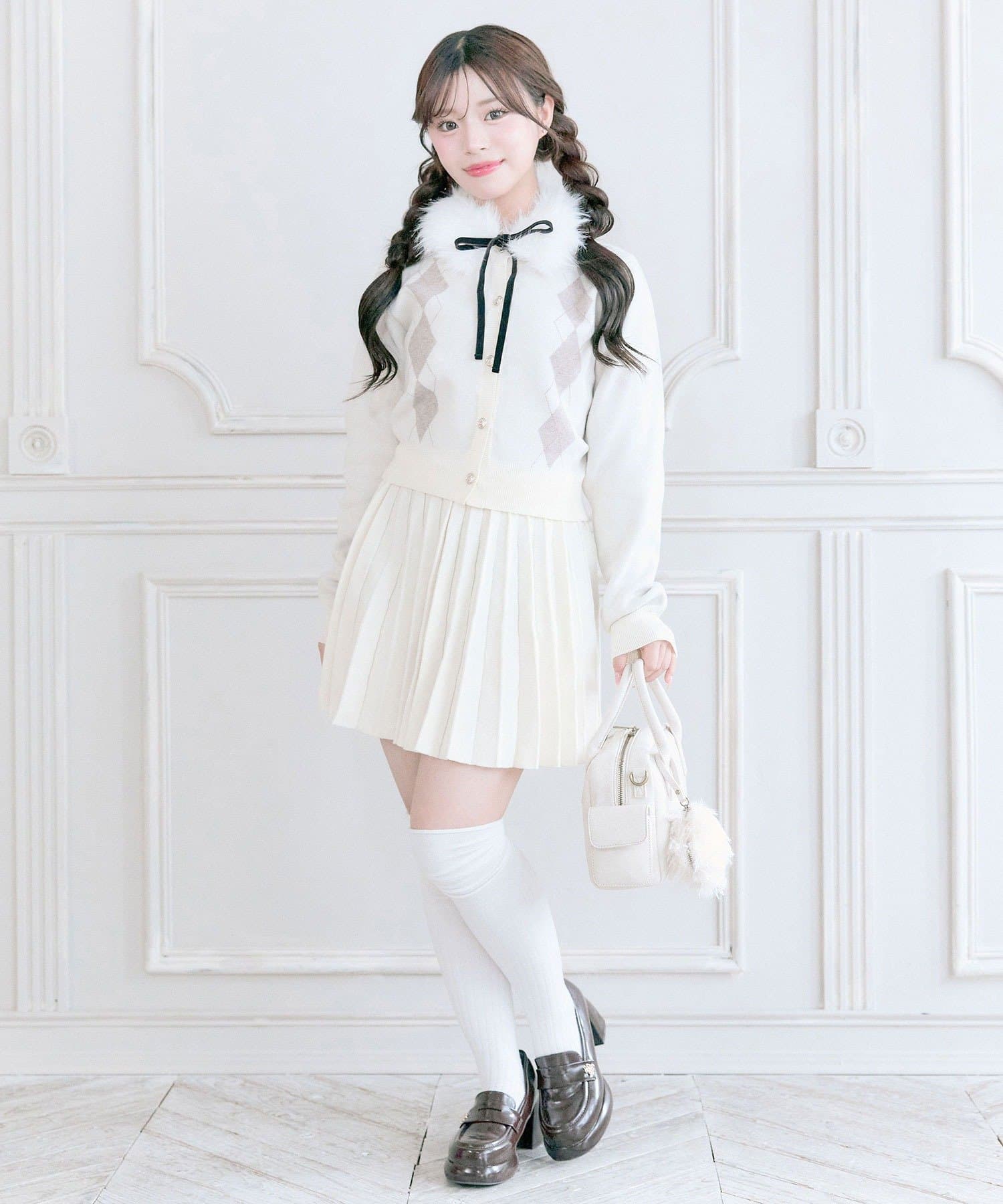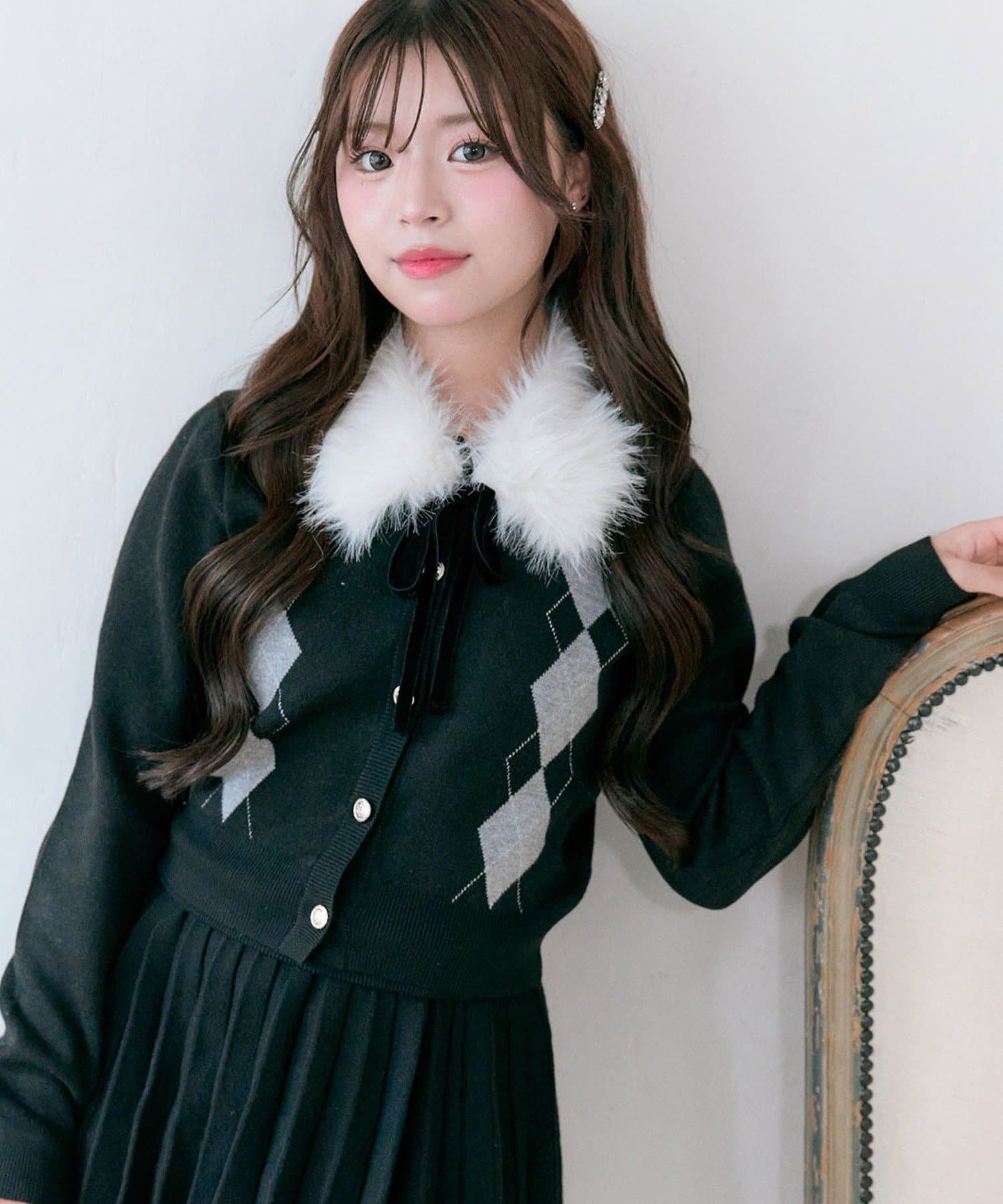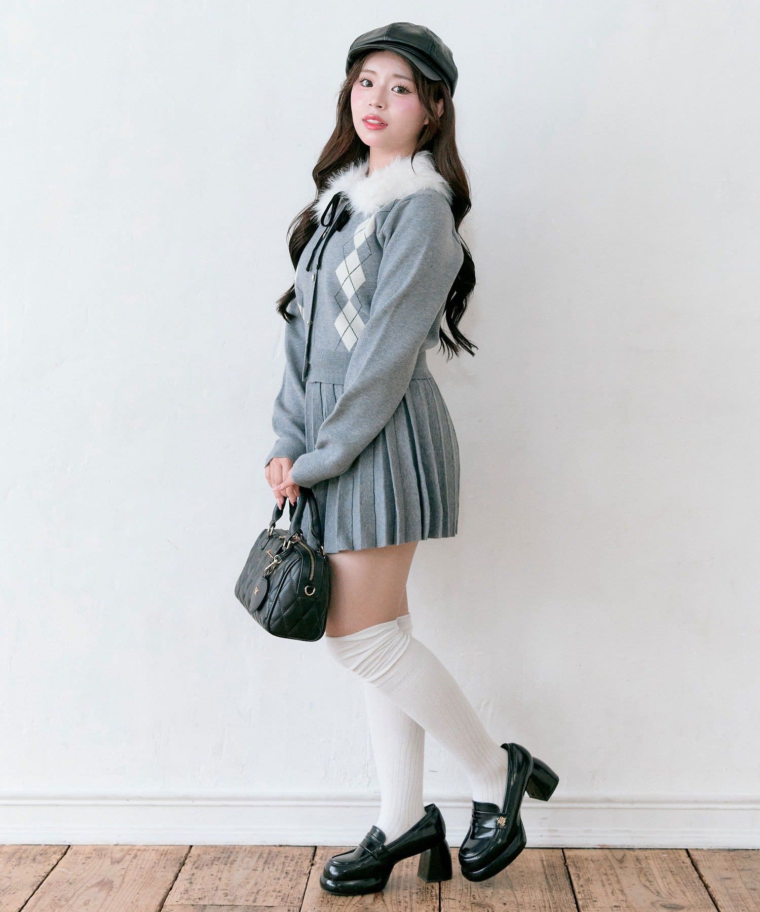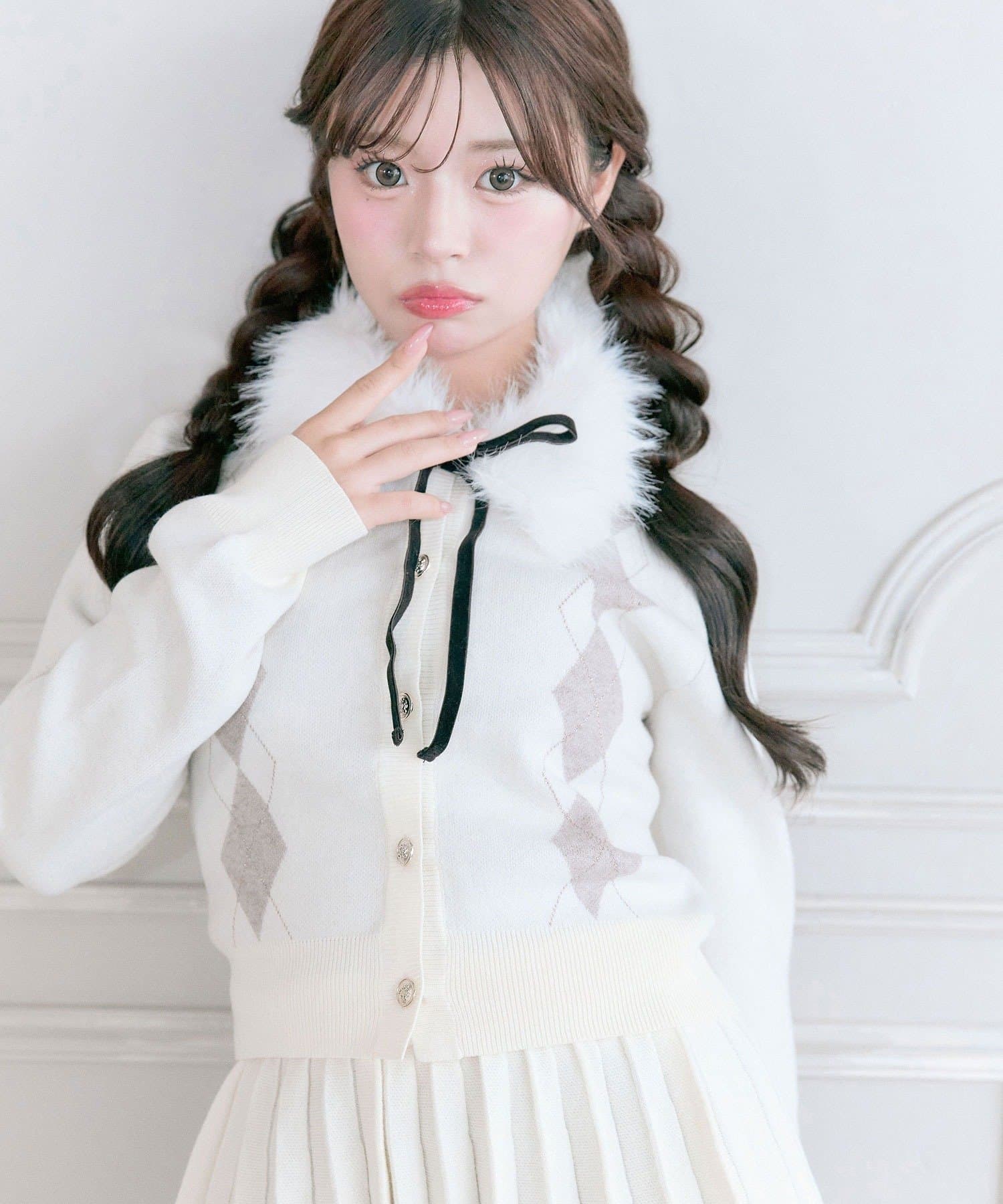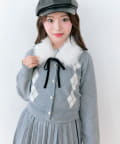 ・ベロアリボン付きのファーティペットと、キラキラの糸を使用したアーガイルチェックのニットセット。