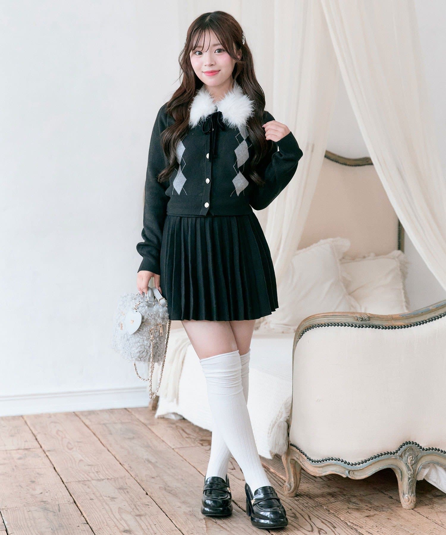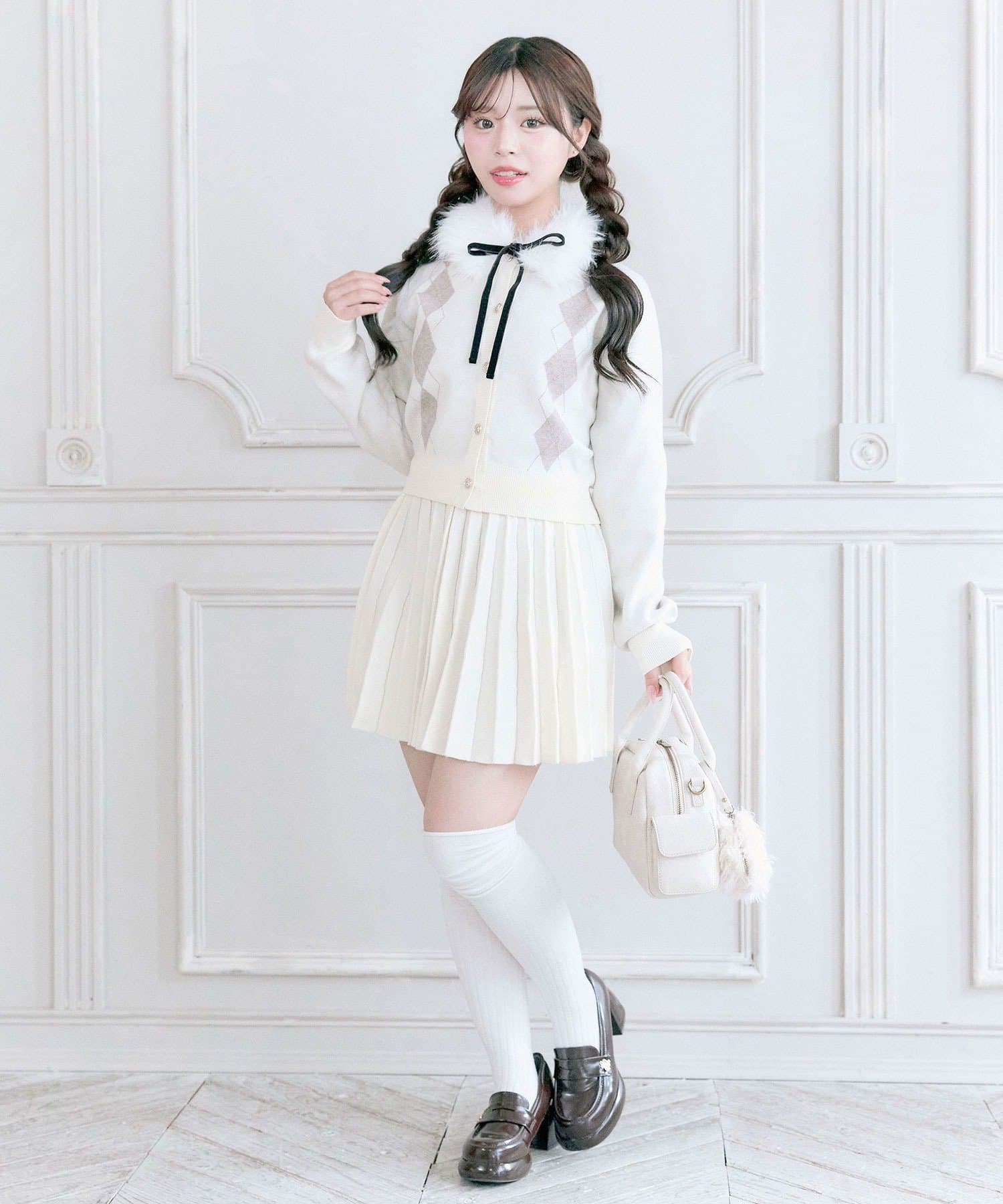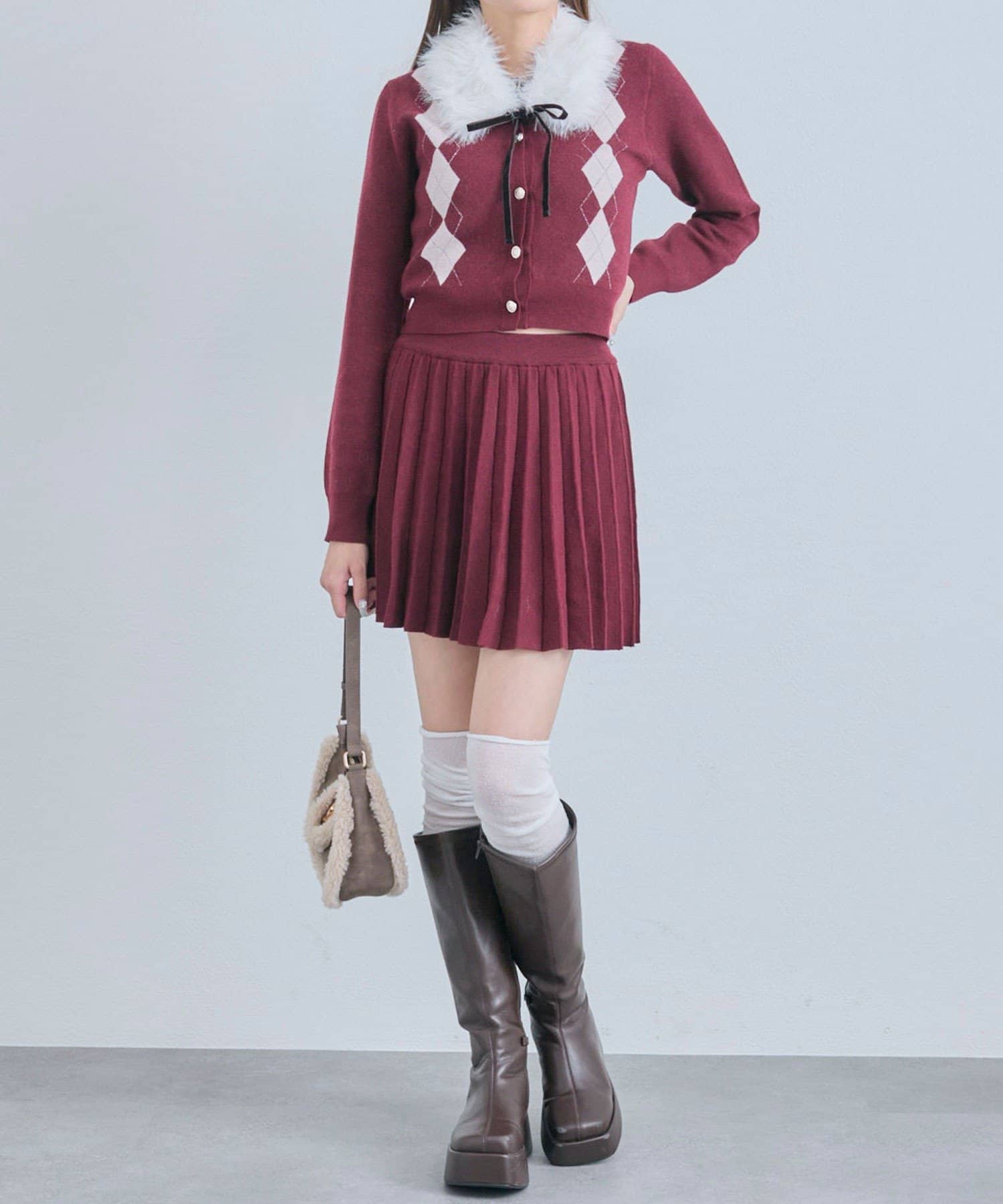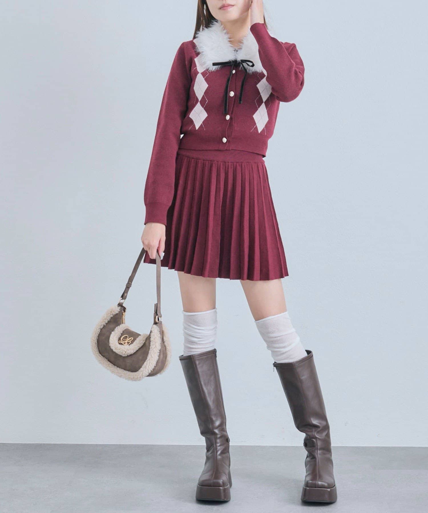 ・ベロアリボン付きのファーティペットと、キラキラの糸を使用したアーガイルチェックのニットセット。