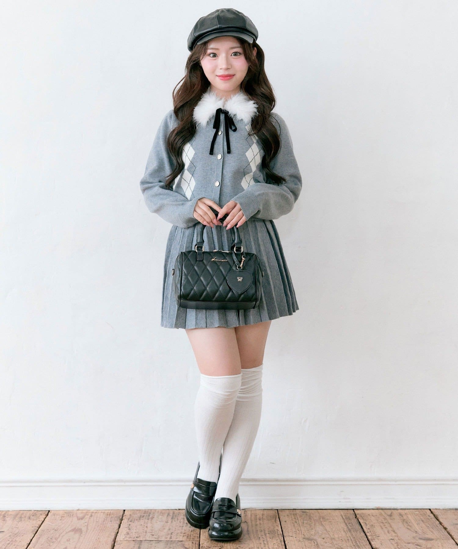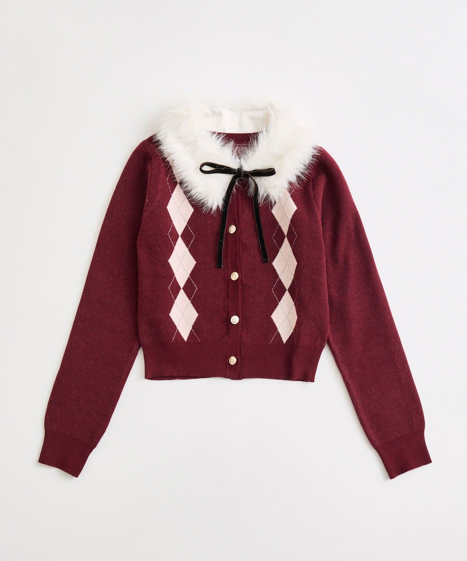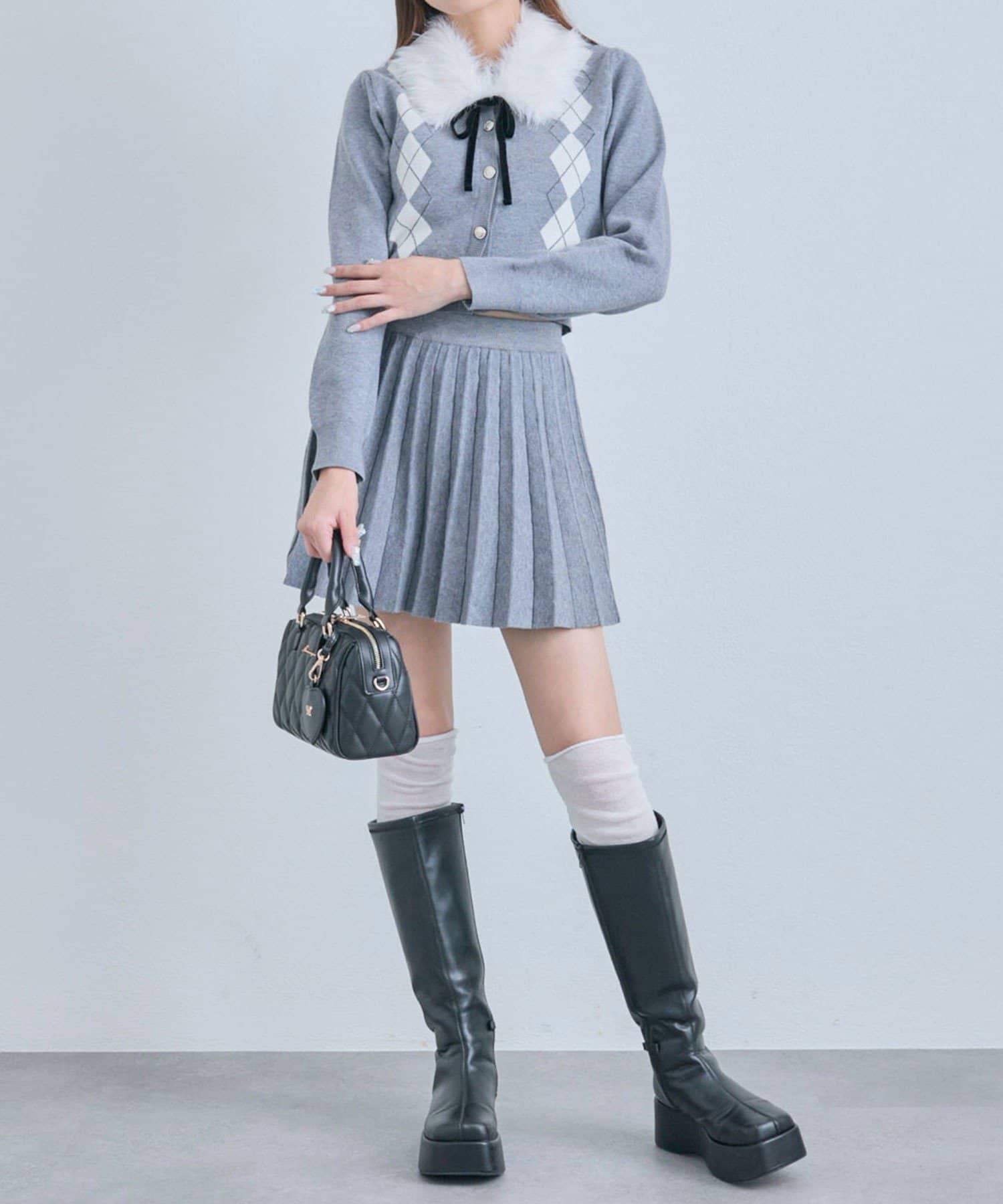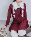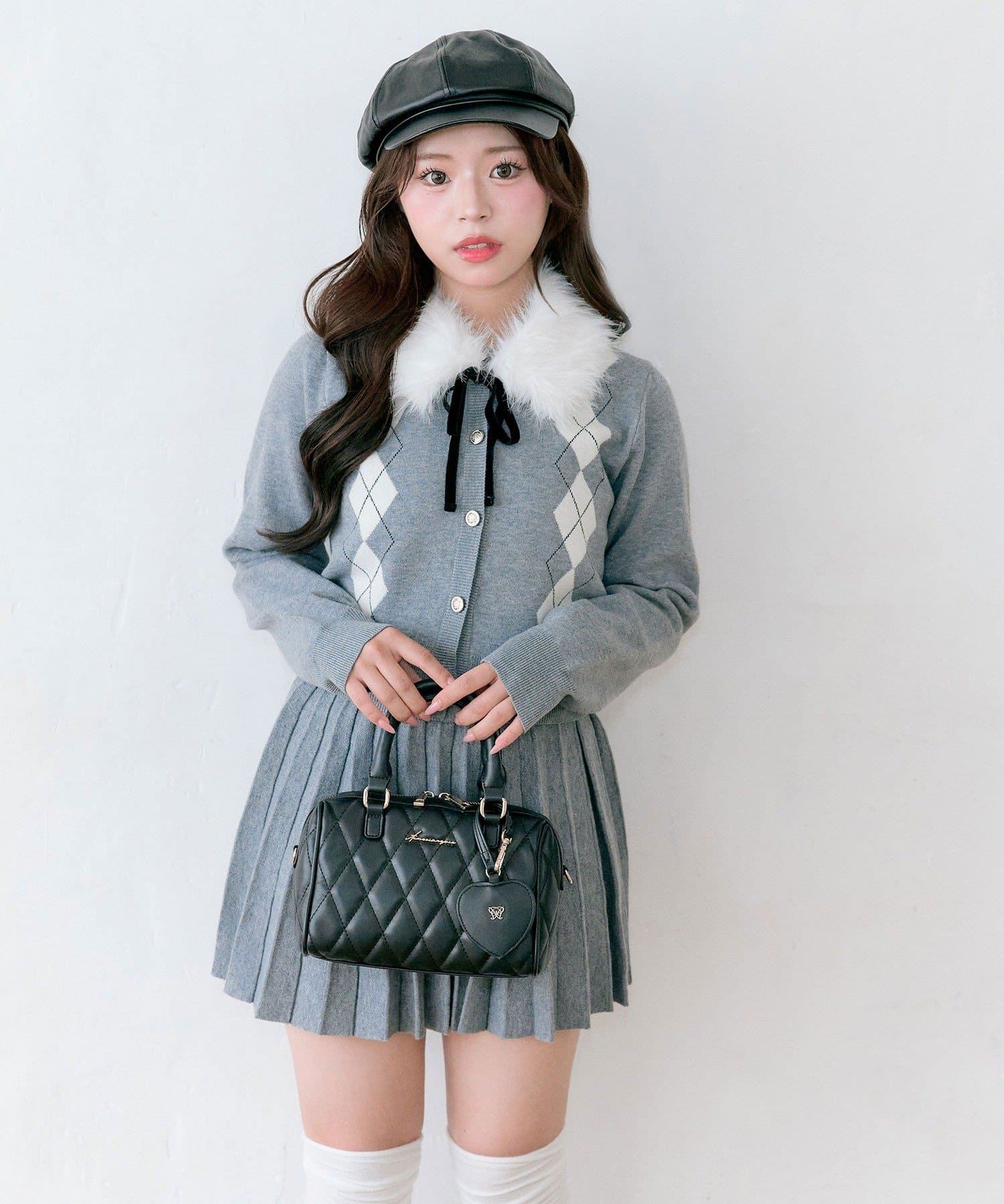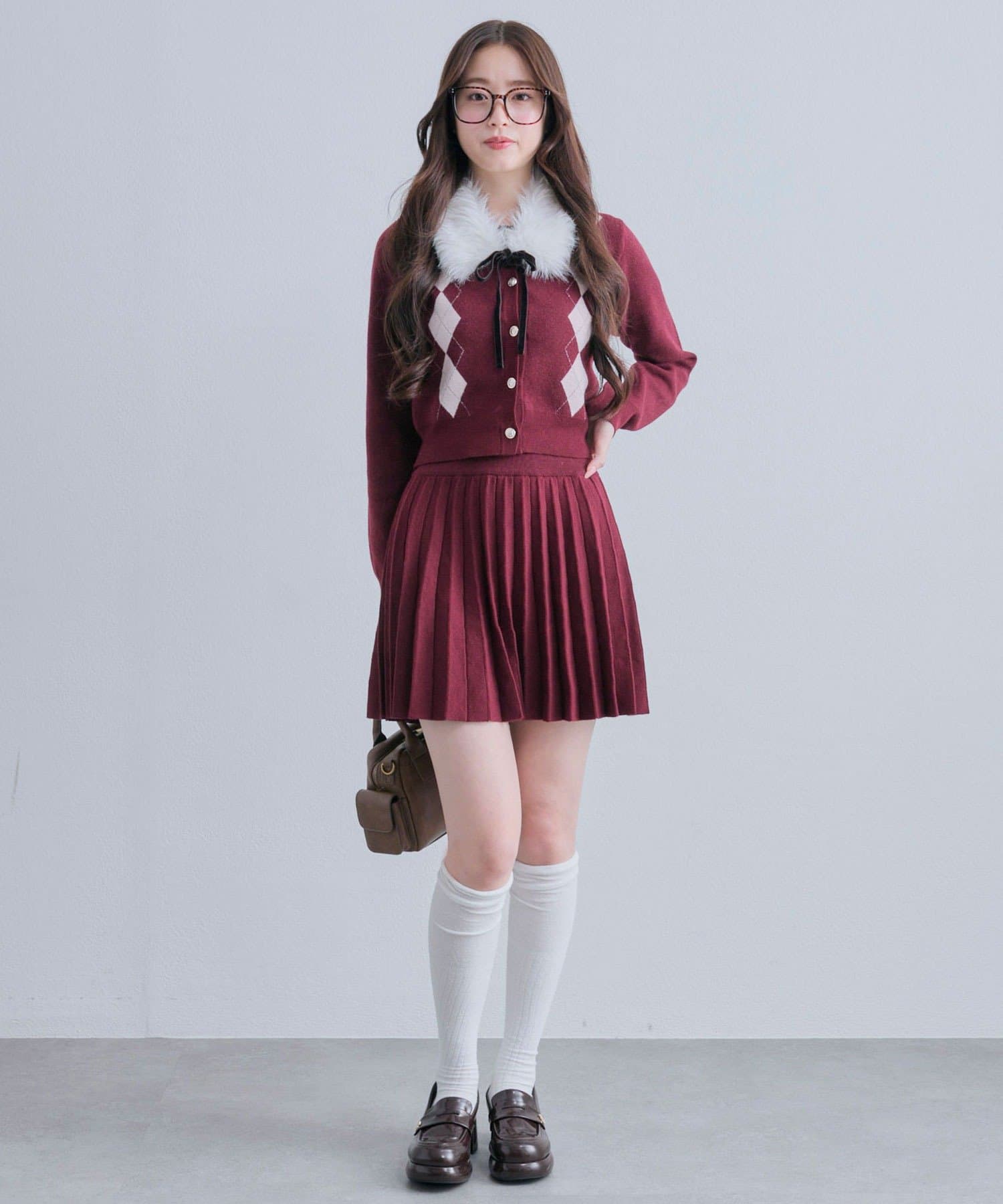 ・ベロアリボン付きのファーティペットと、キラキラの糸を使用したアーガイルチェックのニットセット。