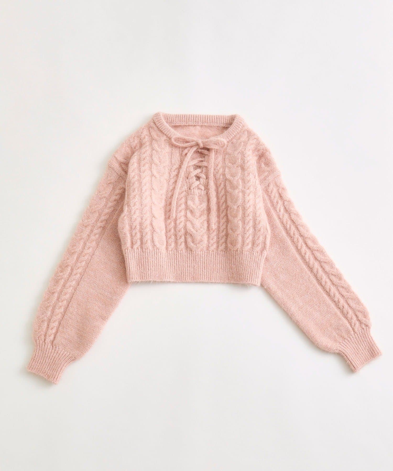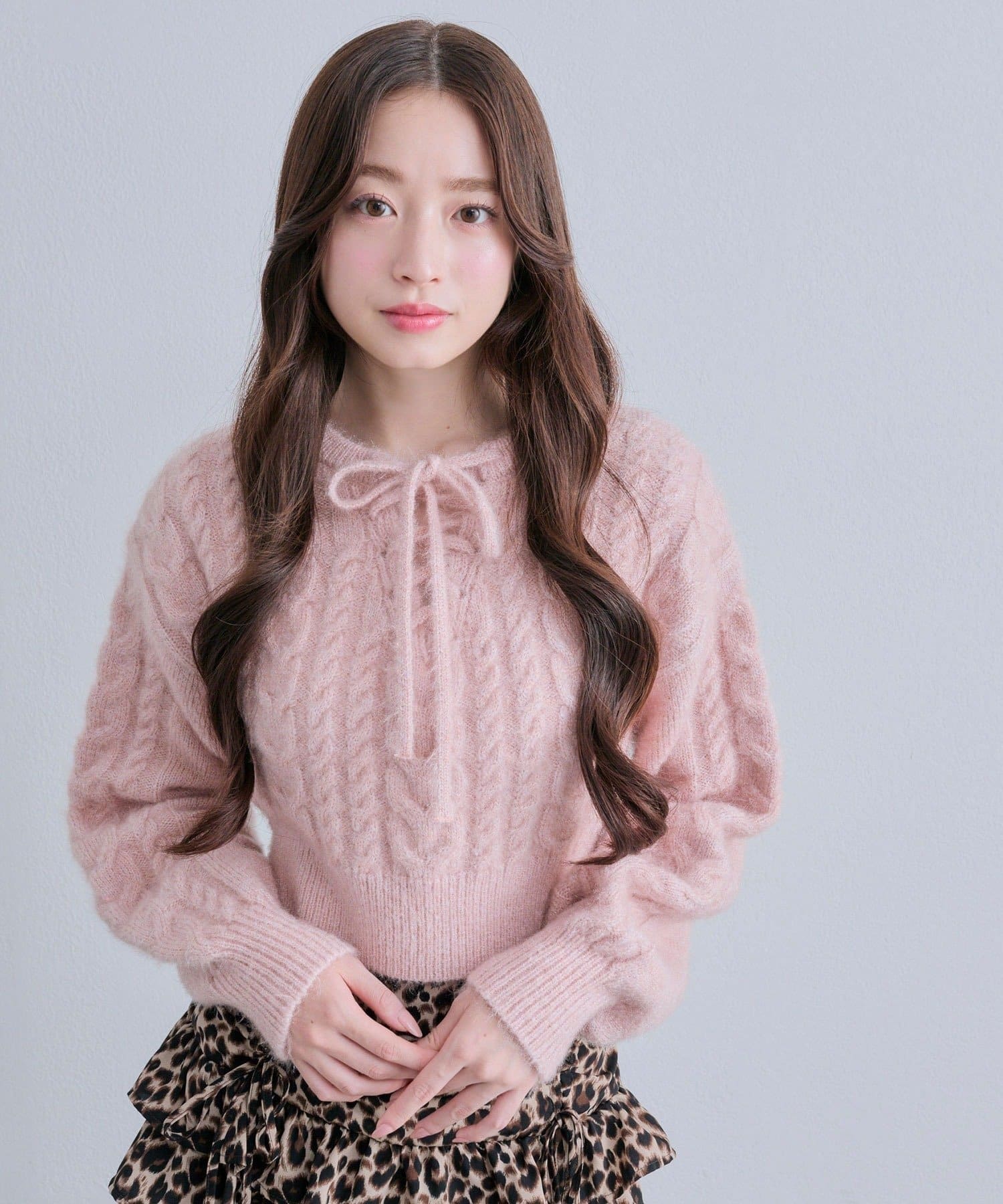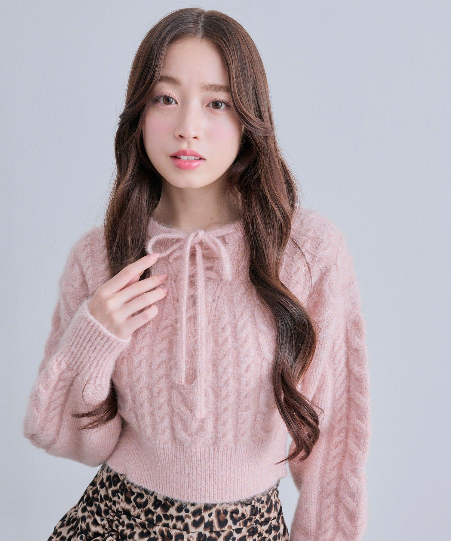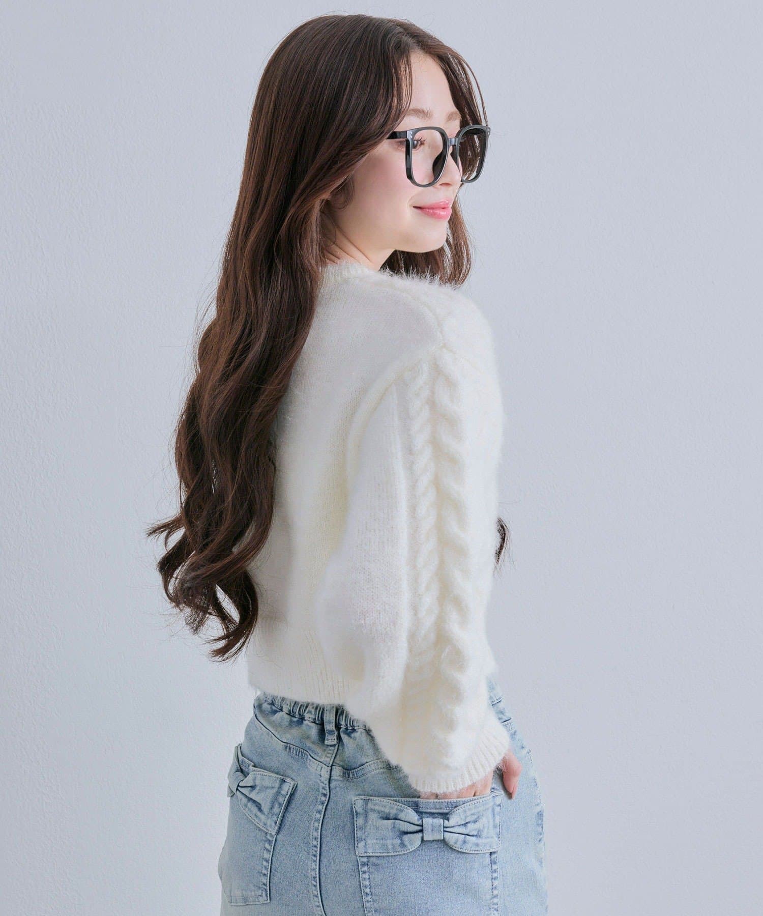 ・ラメ入りのケーブル編みが華やかで女の子らしい印象のニット。
