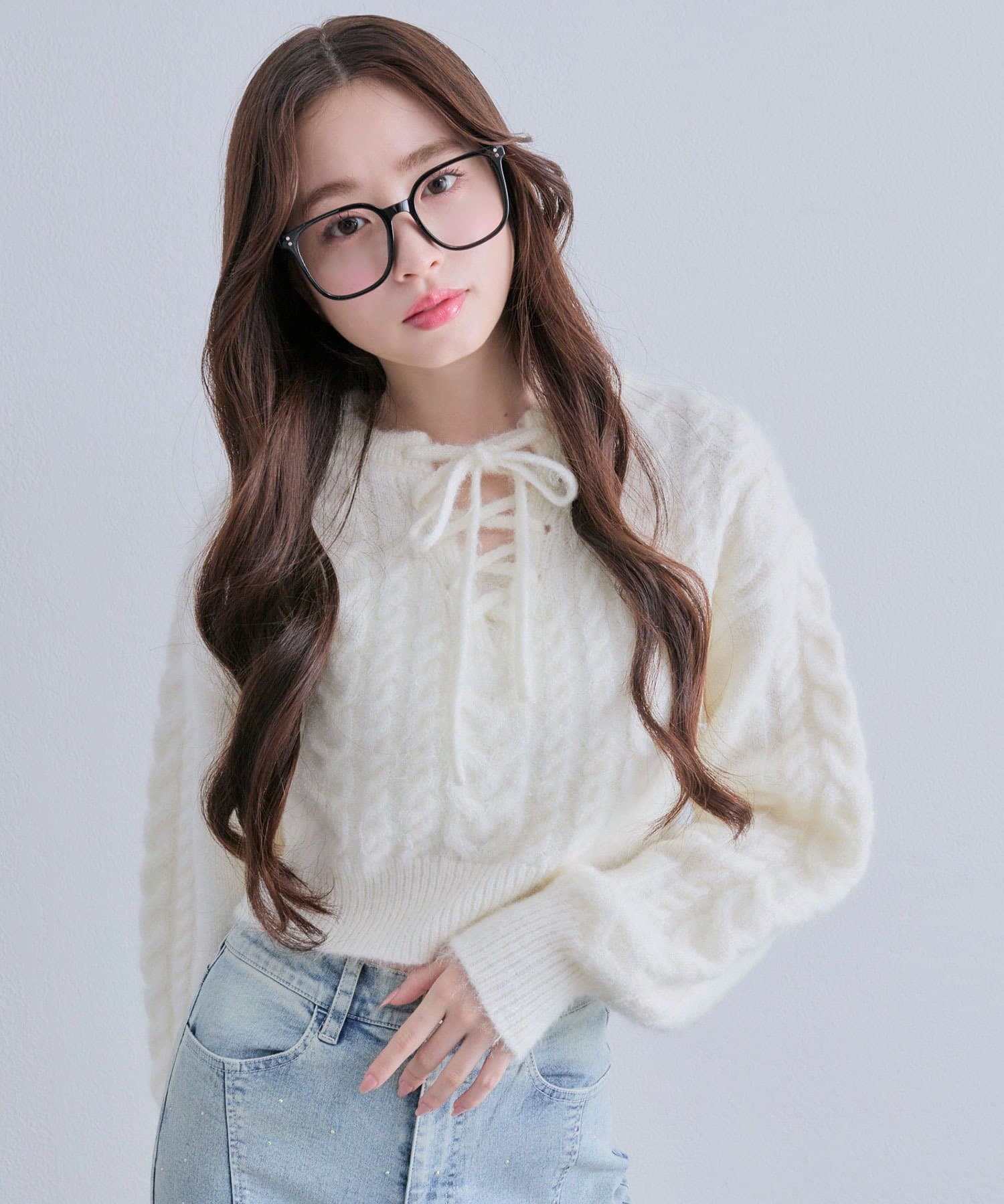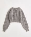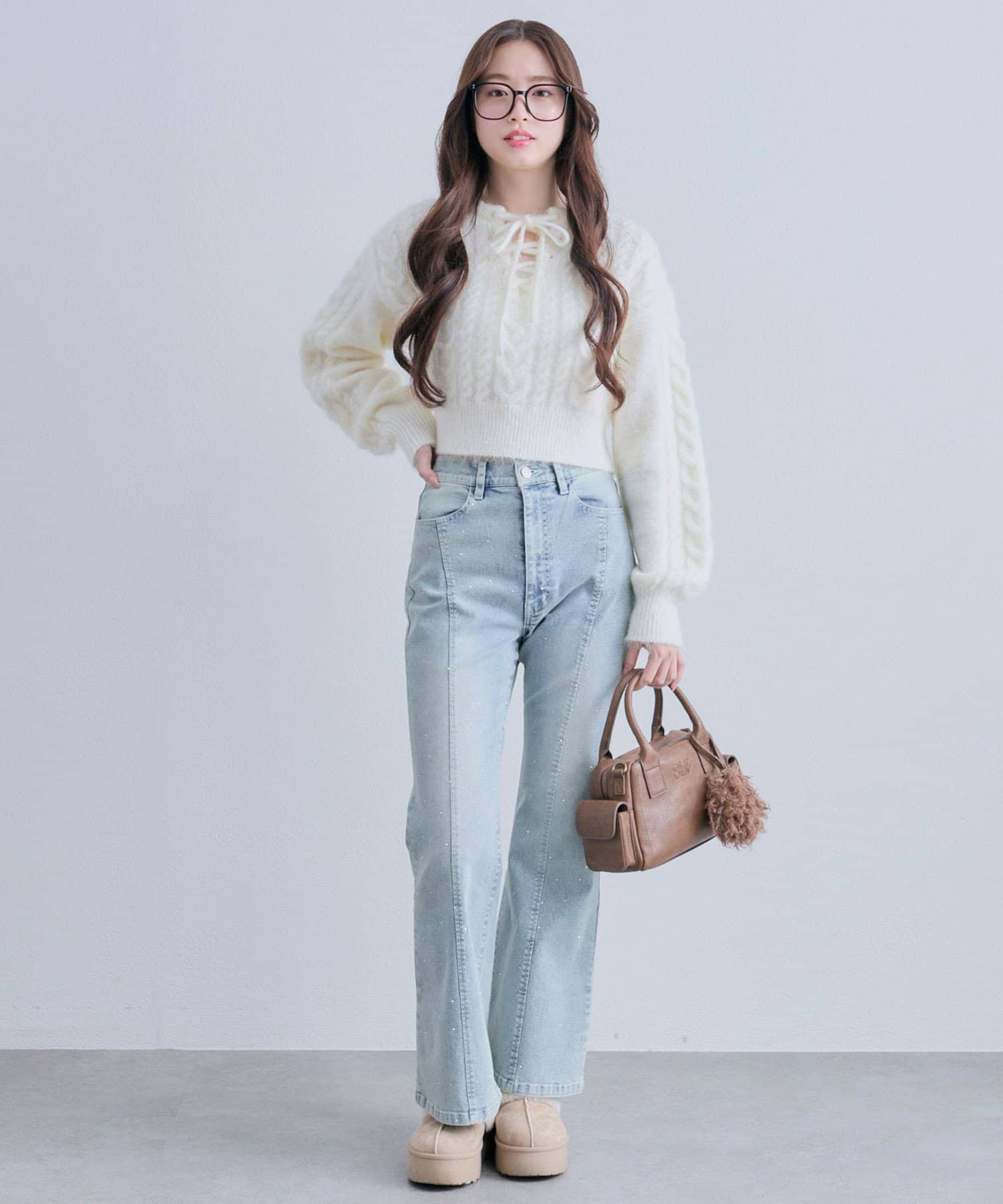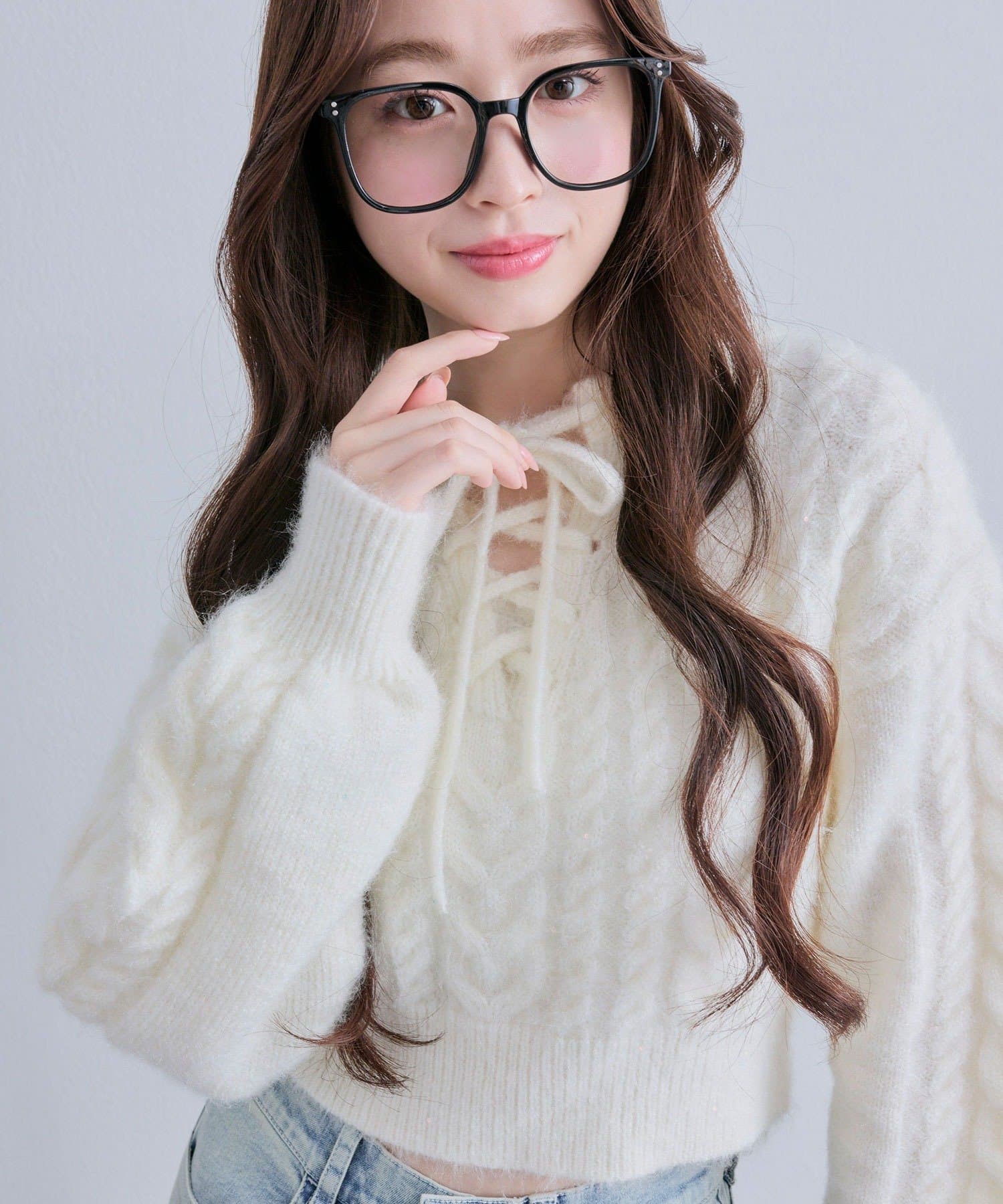 ・ラメ入りのケーブル編みが華やかで女の子らしい印象のニット。