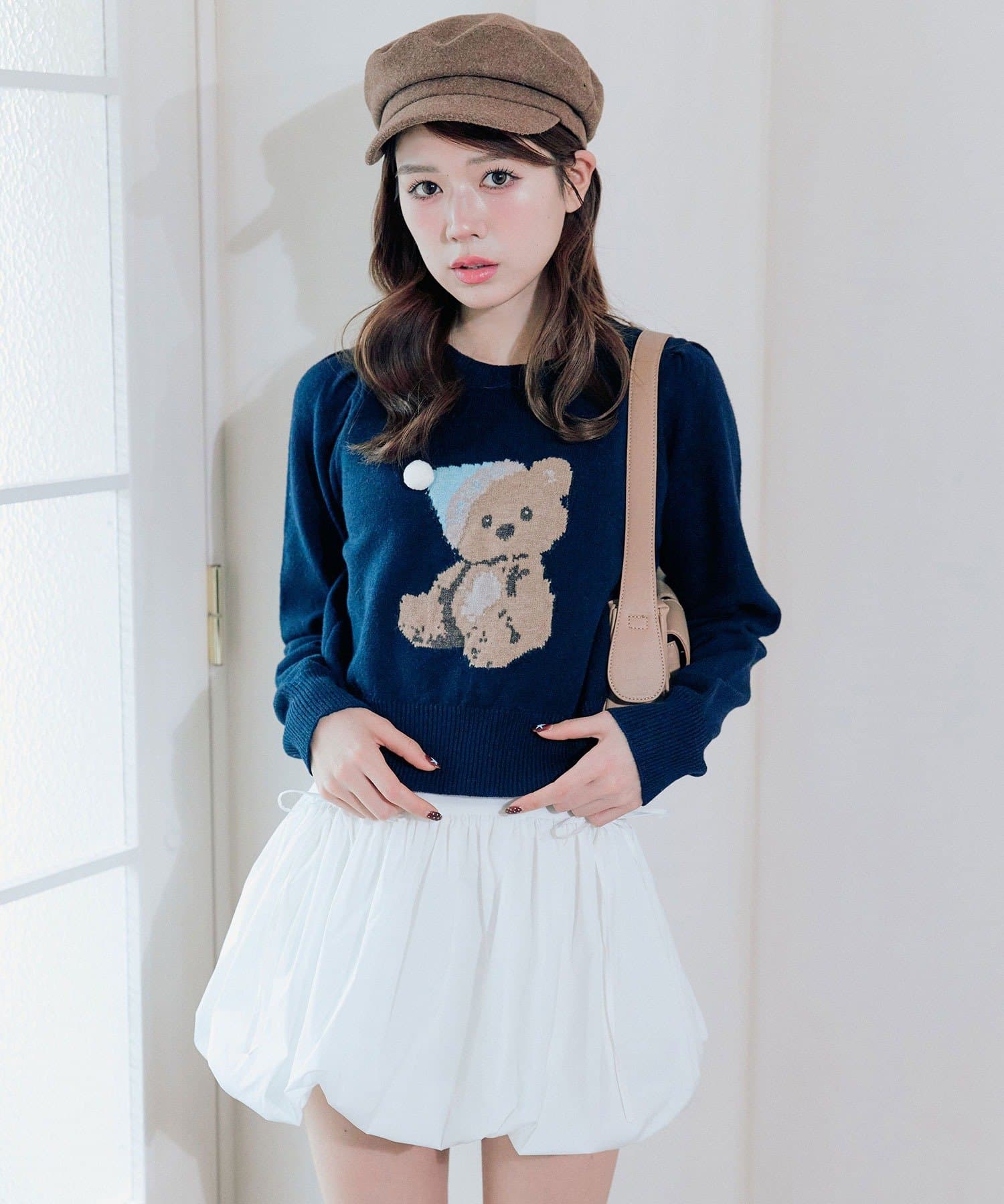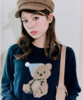 ・カラーによって柄が異なり、オフはうさぎの被り物をしたクマ、ピンク/グレーはビジュー付きのネコ、ネイビーはポンポン付き帽子のクマのデザインです。