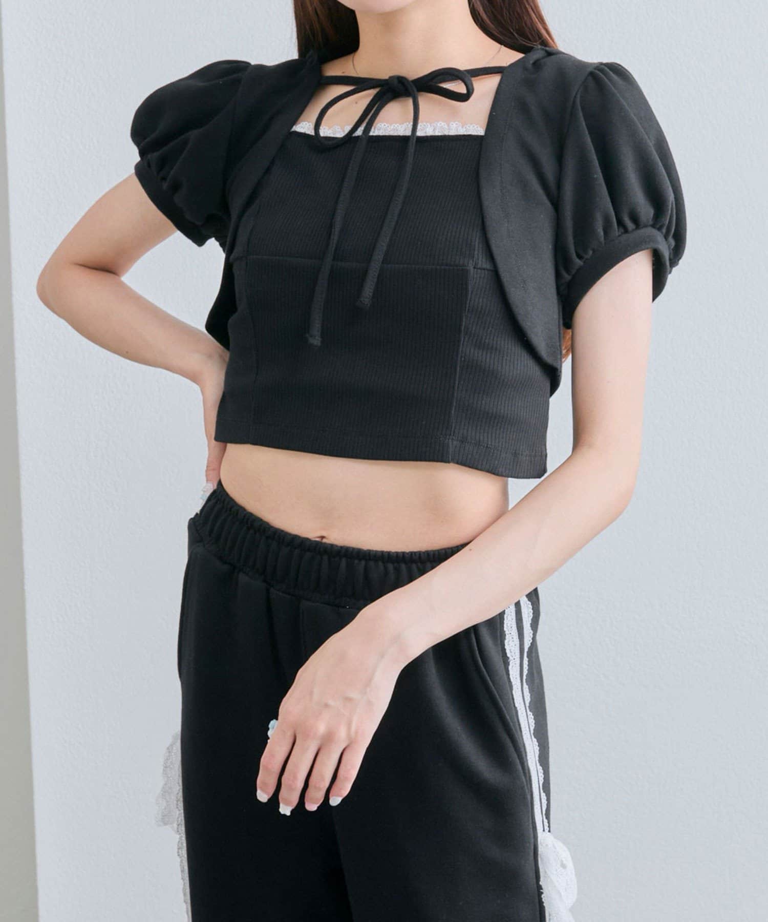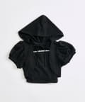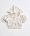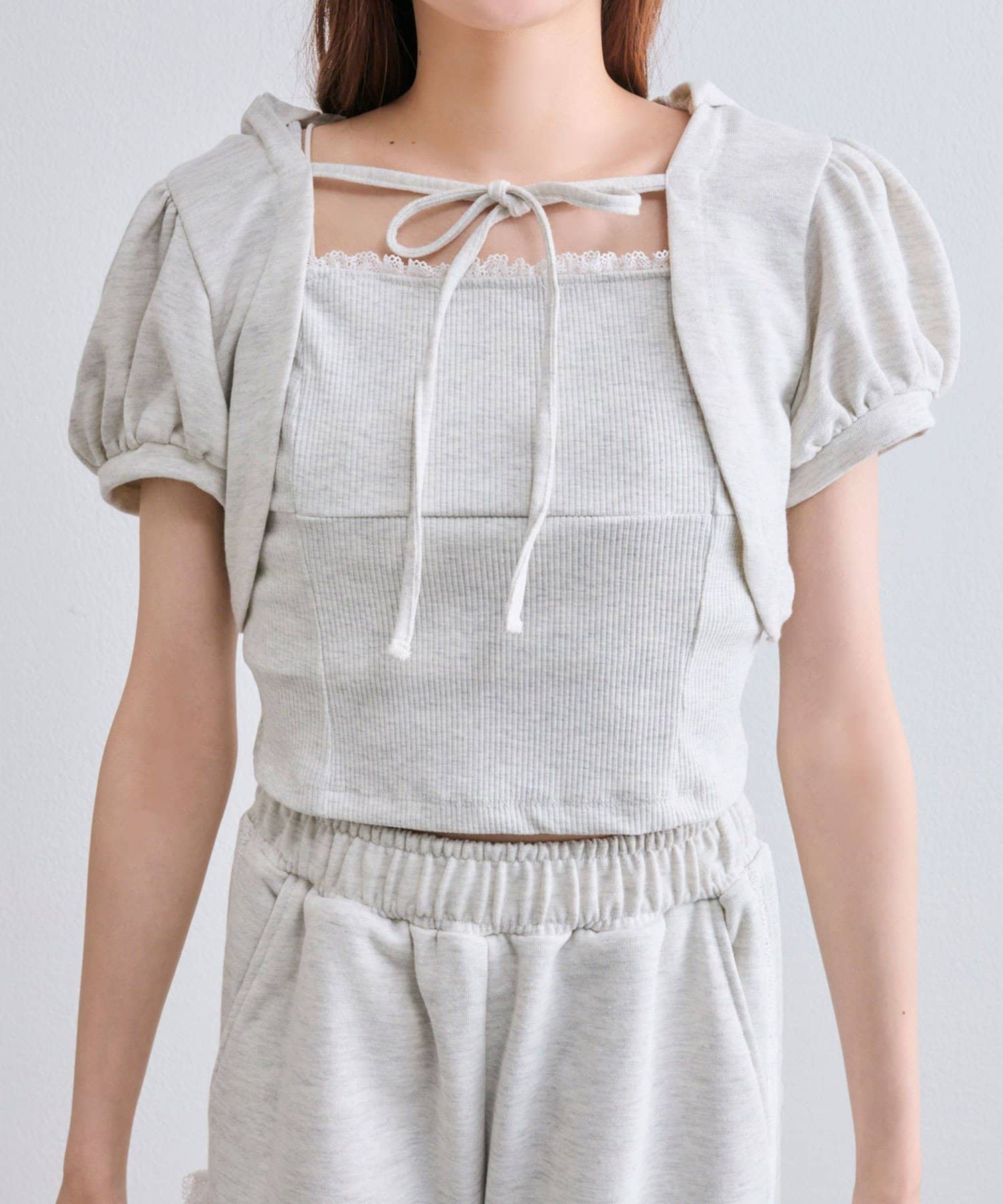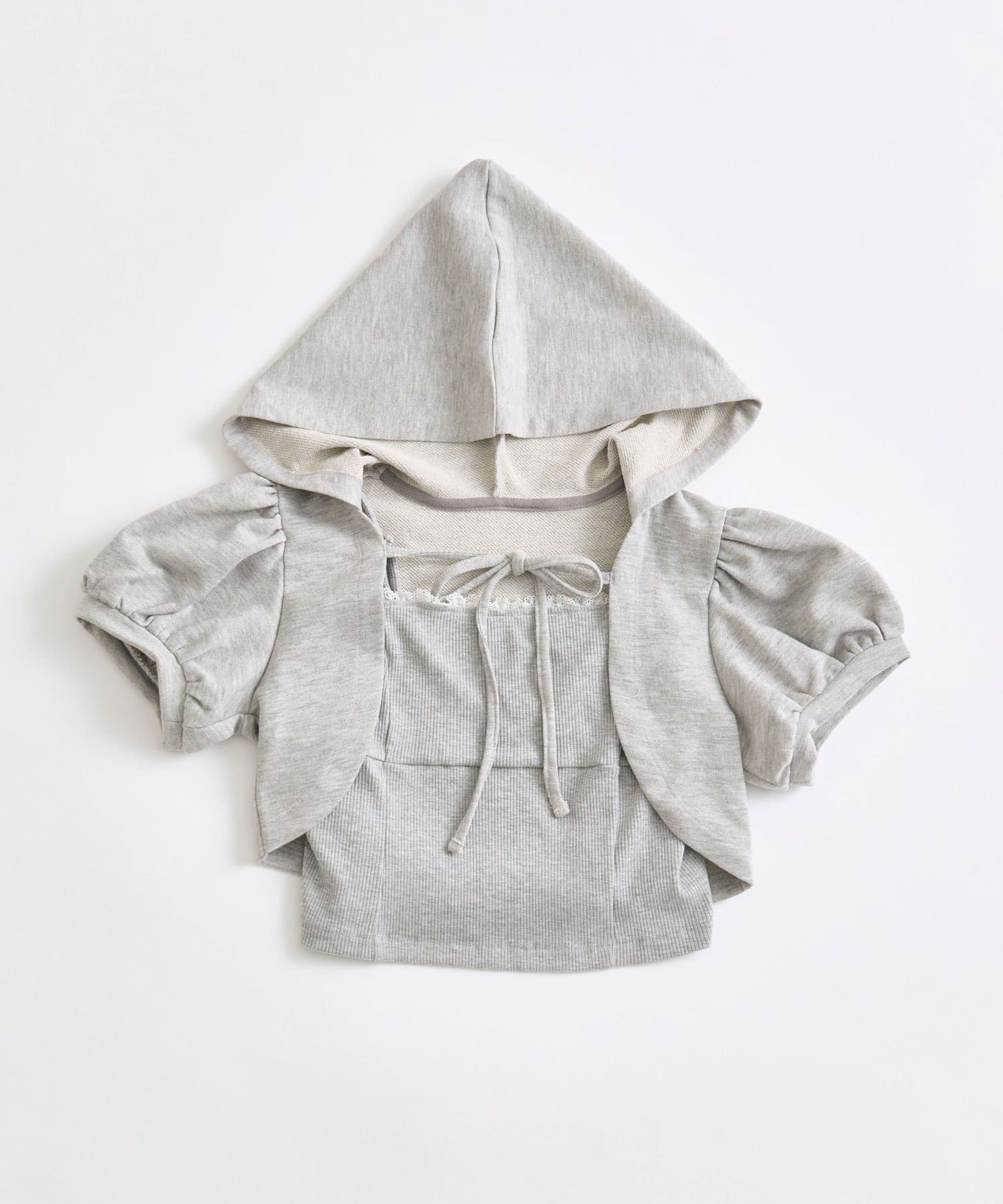 ・フード付きのボレロとリブ素材のキャミインナーがセットになった、簡単にレイヤードコーデが作れるトップス。