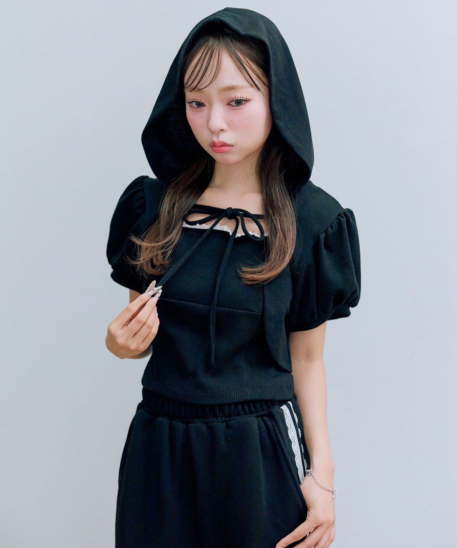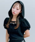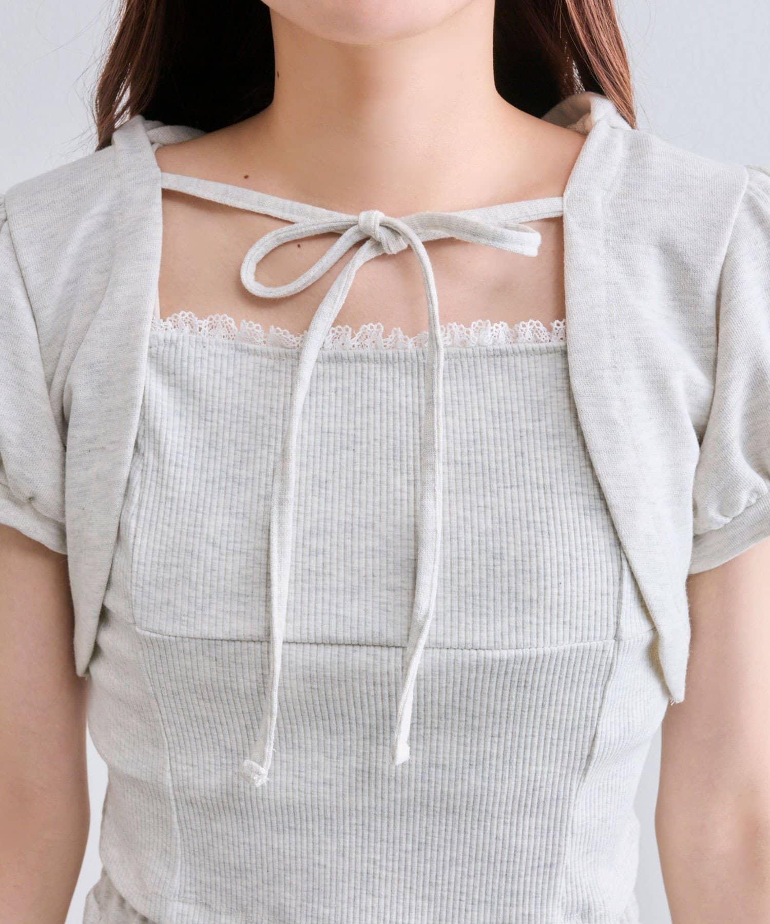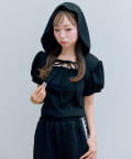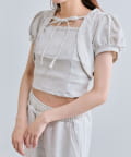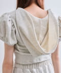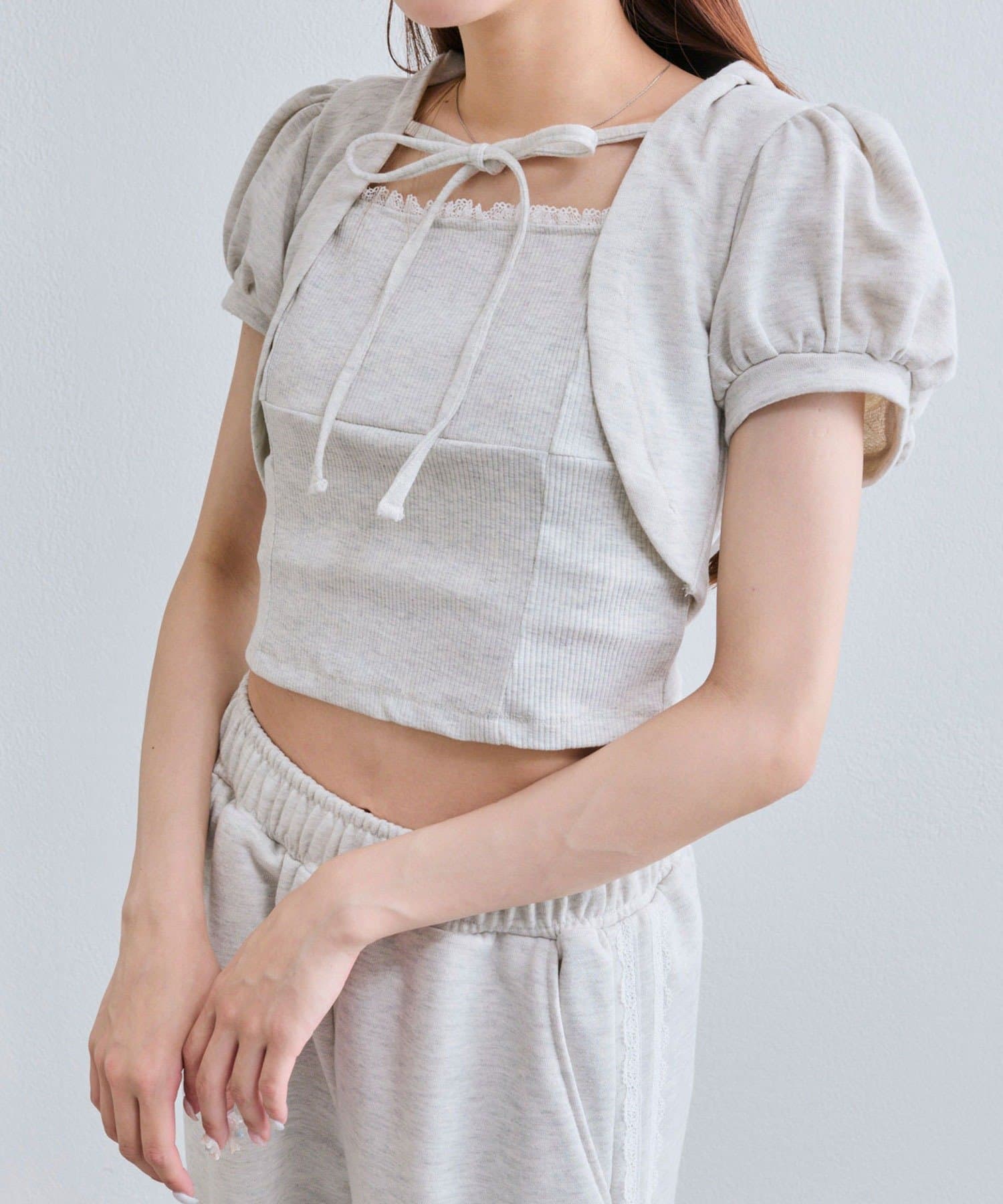 ・フード付きのボレロとリブ素材のキャミインナーがセットになった、簡単にレイヤードコーデが作れるトップス。