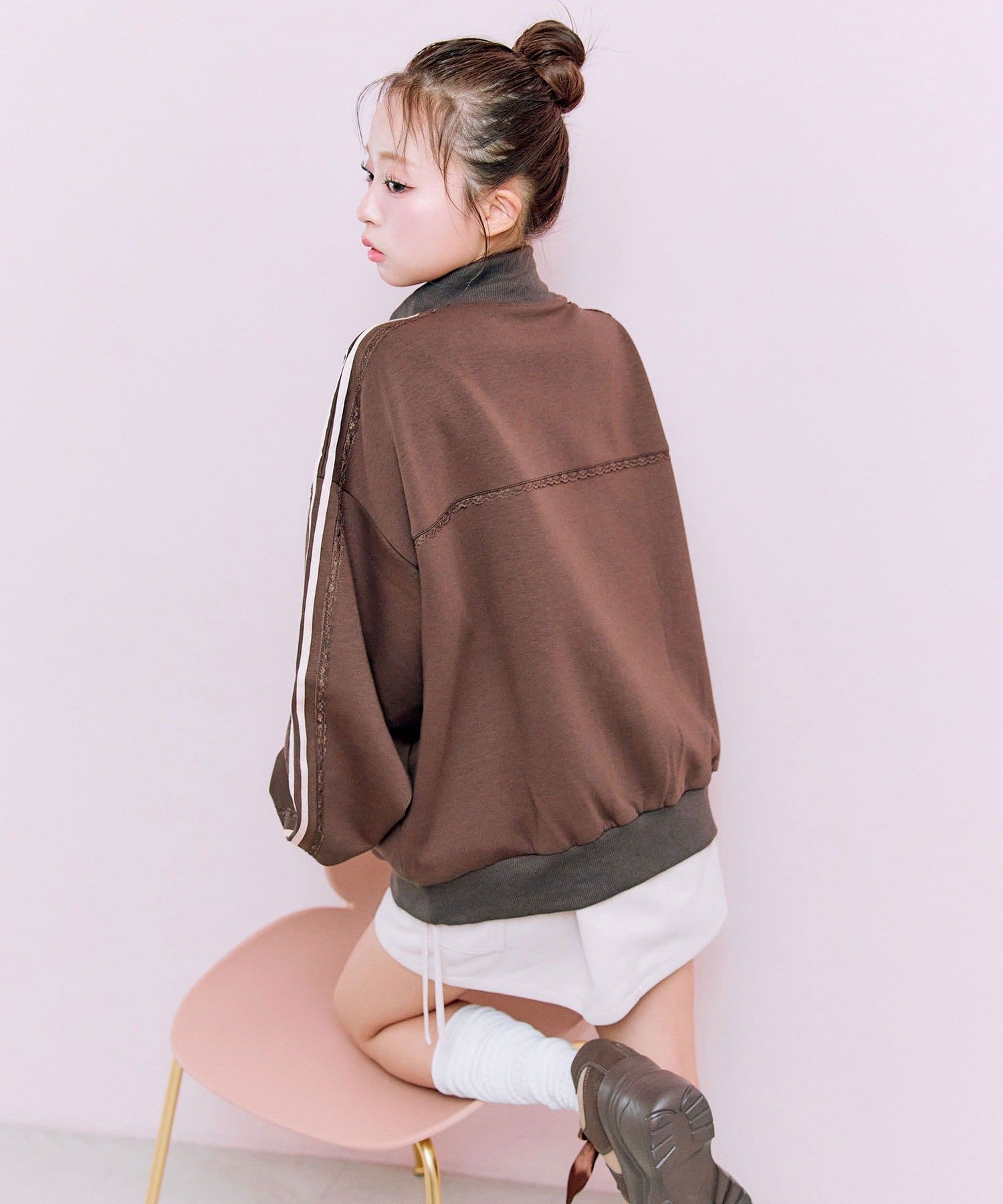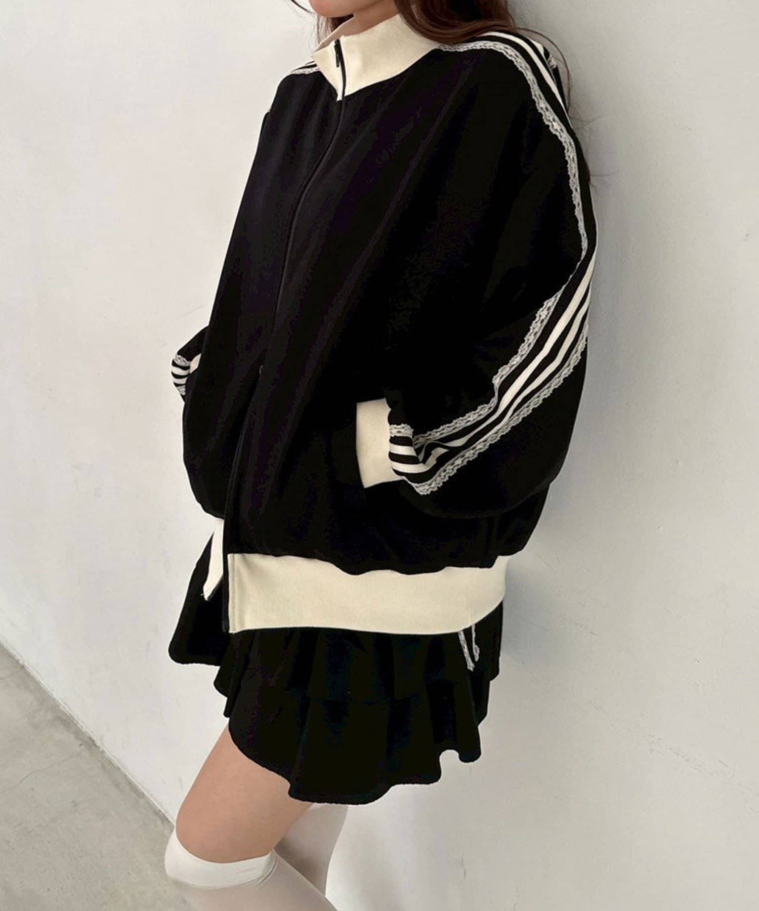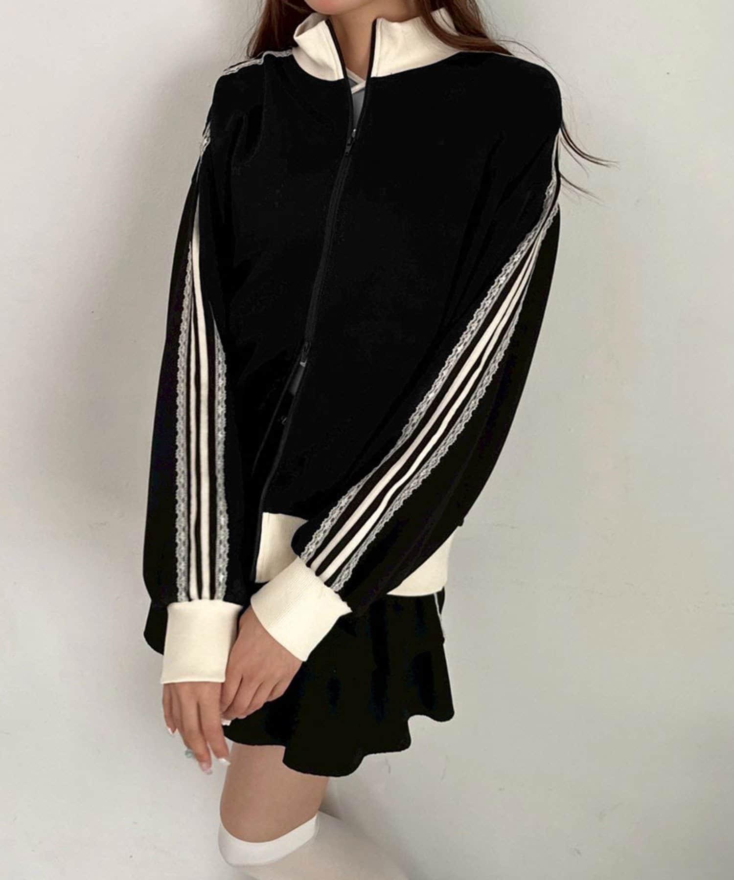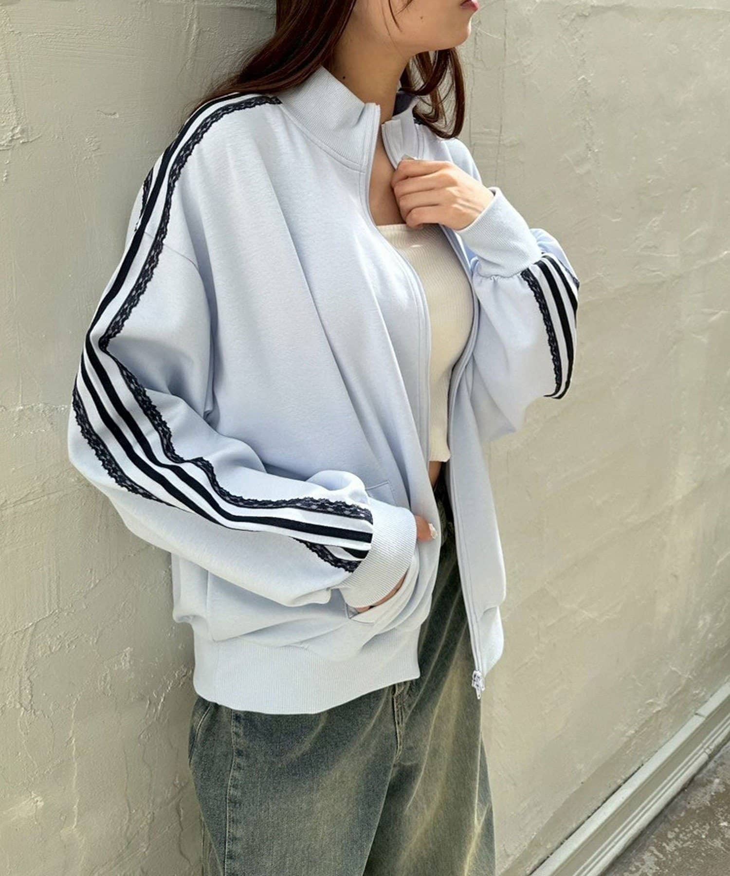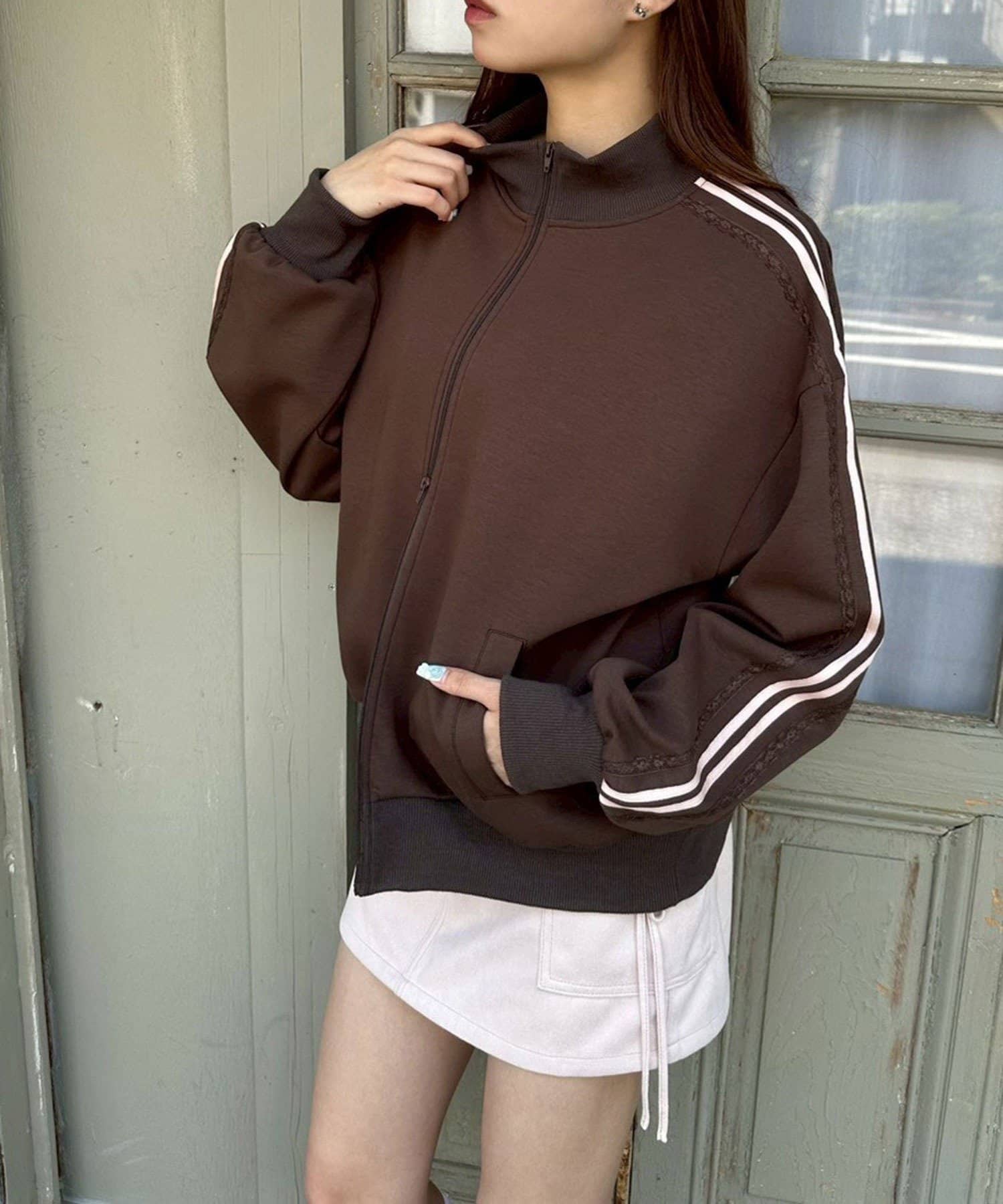 ・配色カラーの袖ラインとリボンがトレンドライクなトラックジャケット。