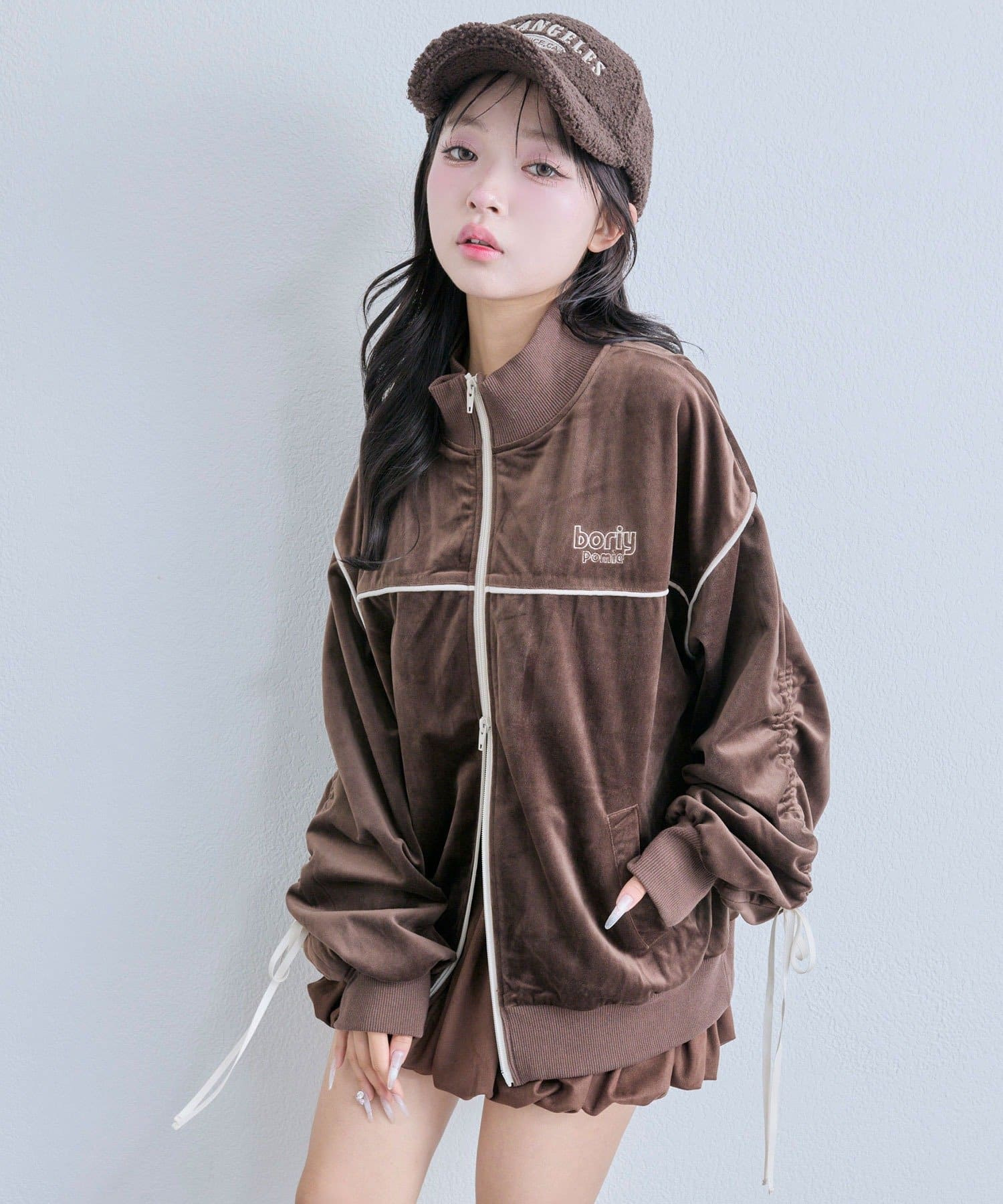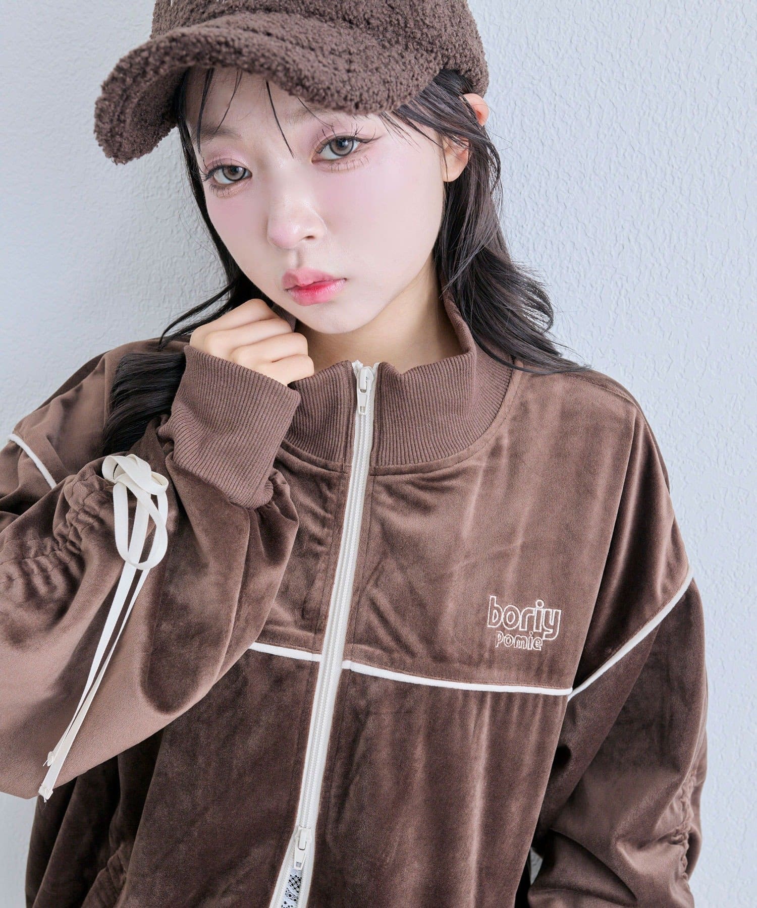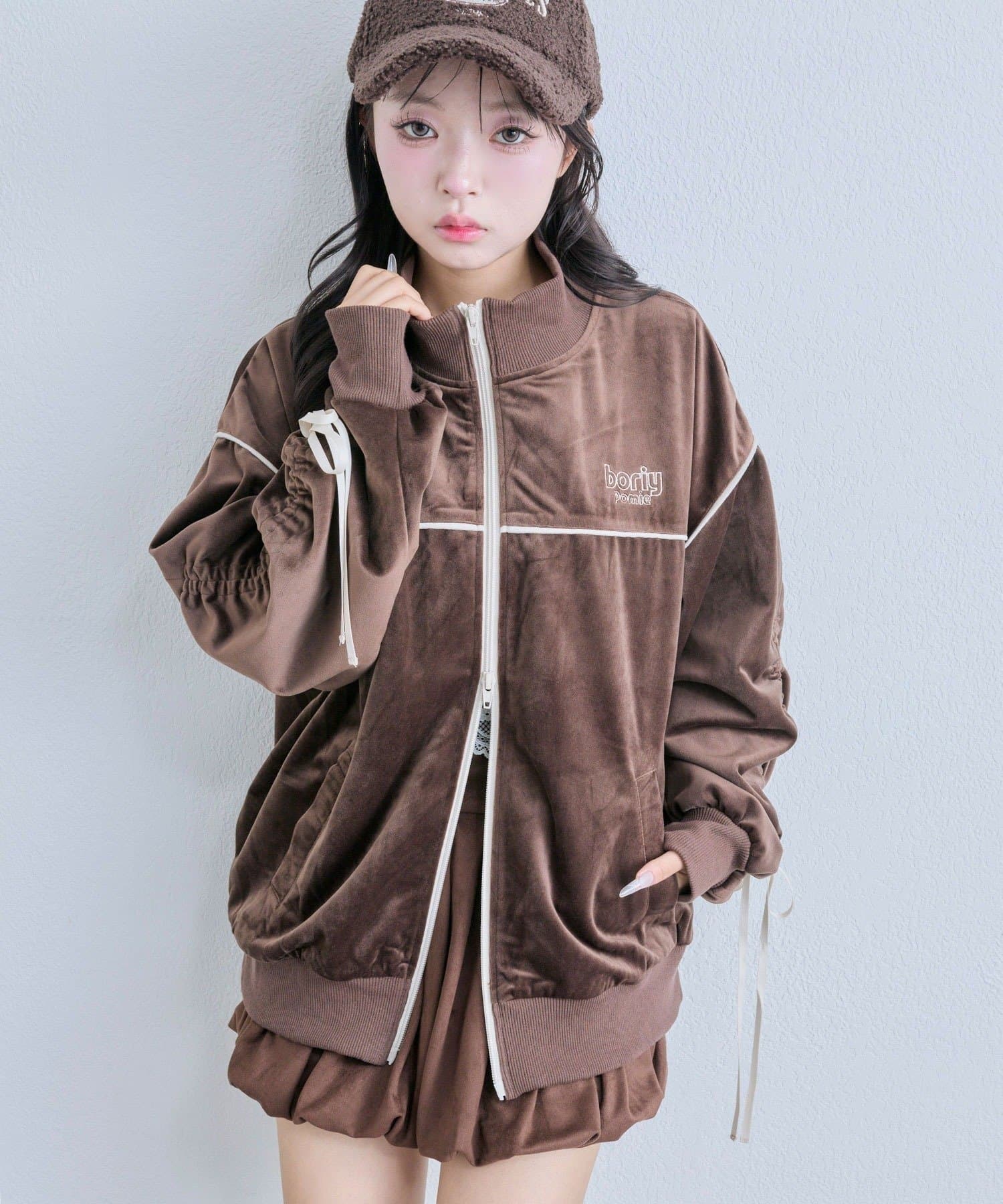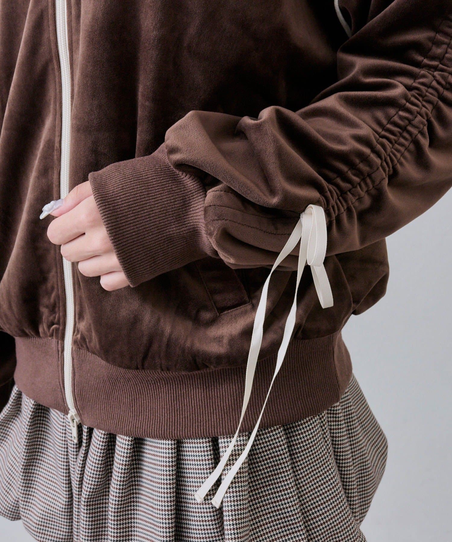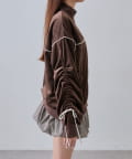 ・高見えするベロア素材でカジュアルすぎず、大人っぽく着映えするデザイン。
