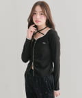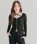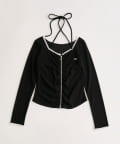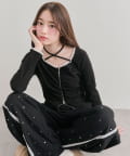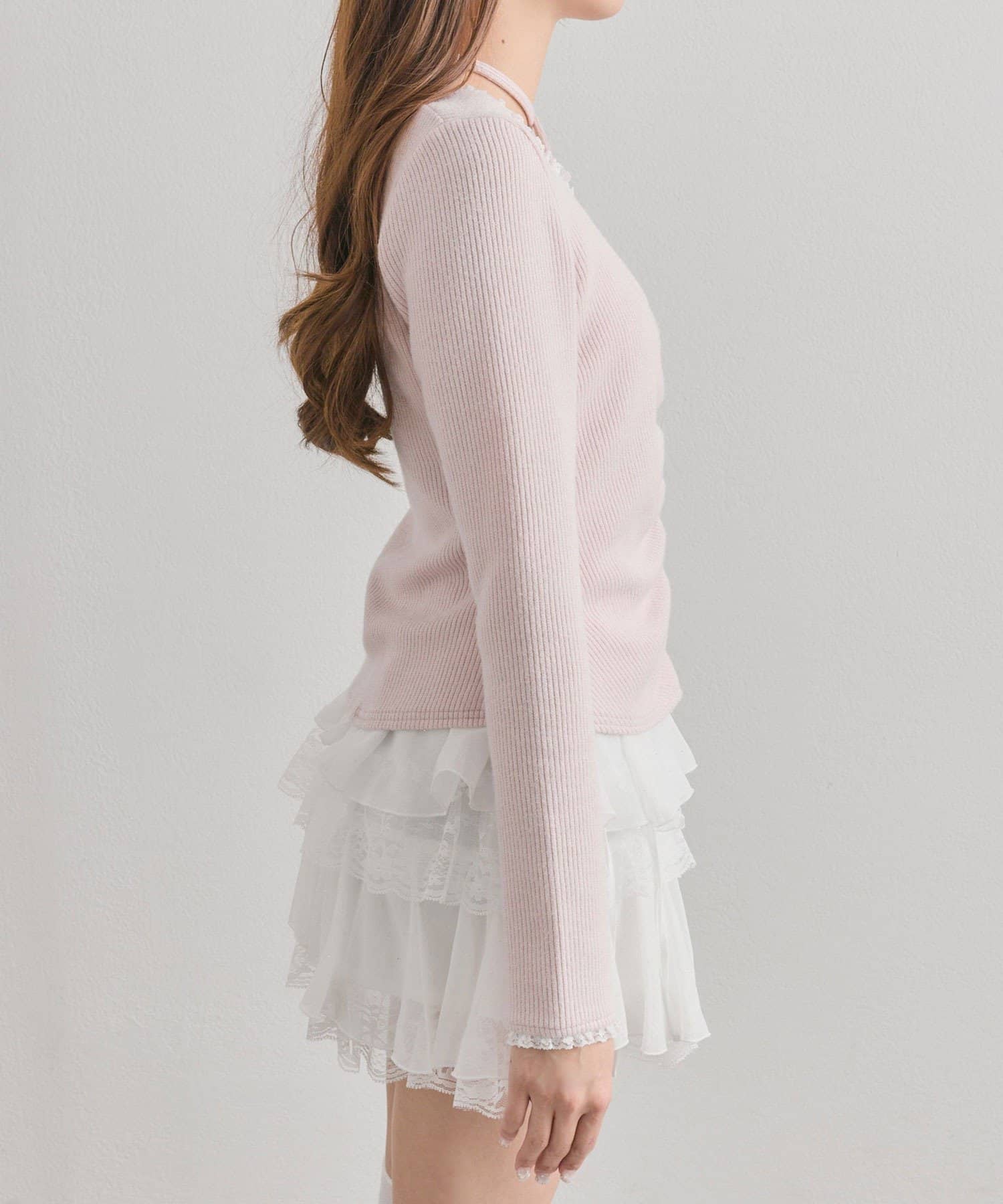 ・デコルテの華奢ストラップがアクセサリー感覚で映える、大人ガーリーなトップス。