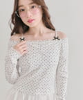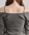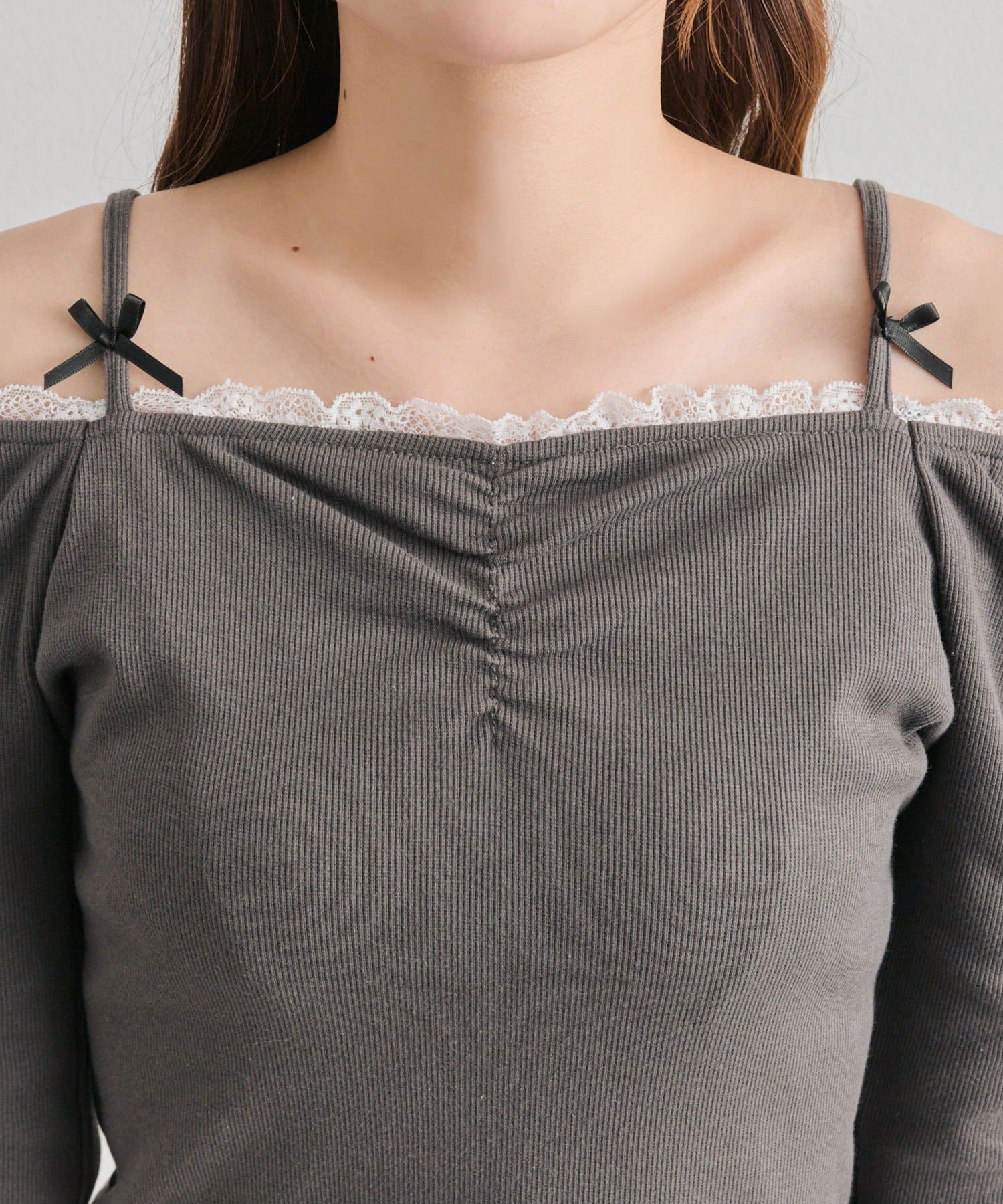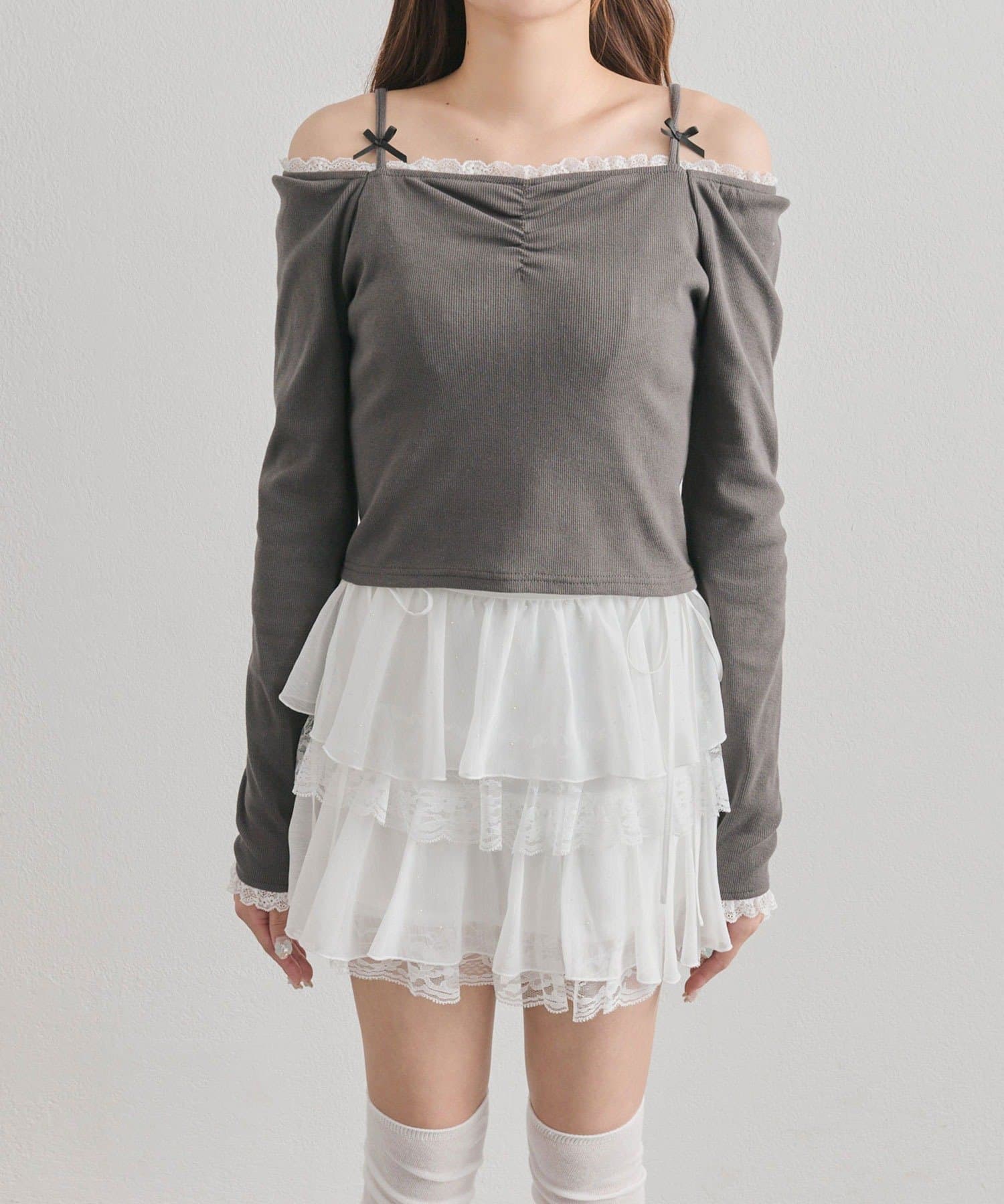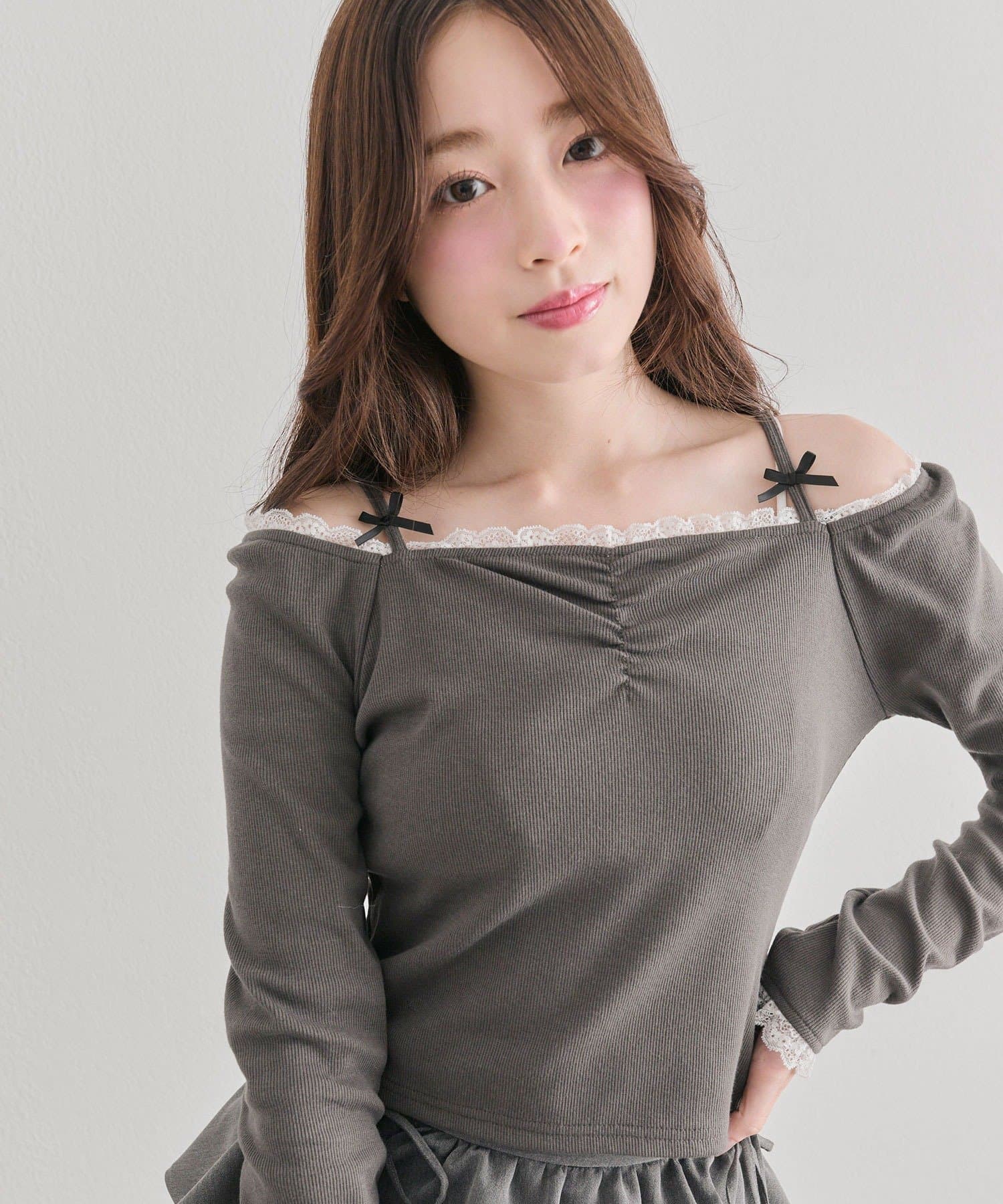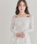 ・デコルテを綺麗に見せてくれるオフショルで、繊細なレースがフェミニンな印象になります。