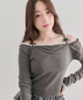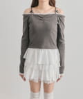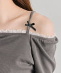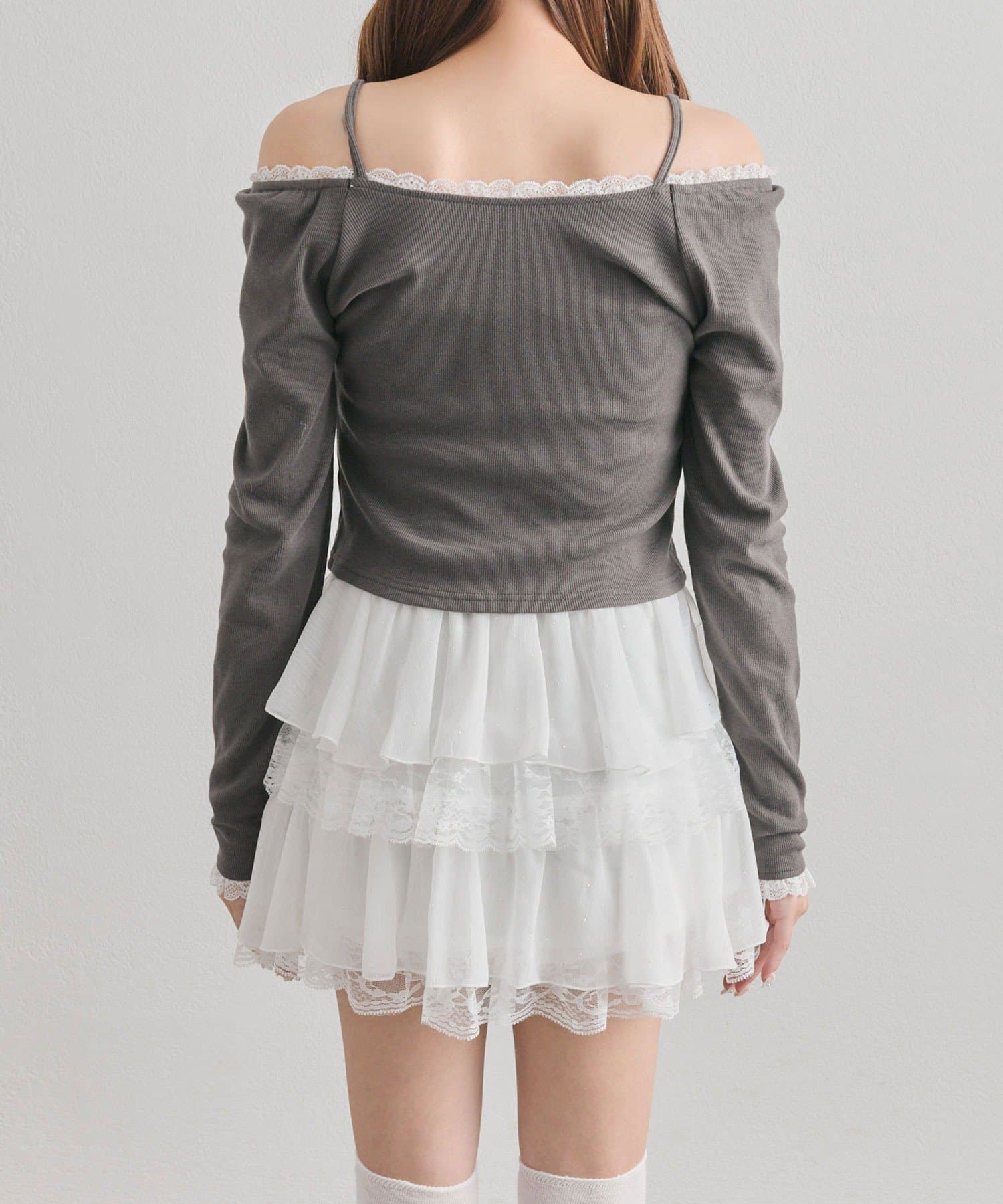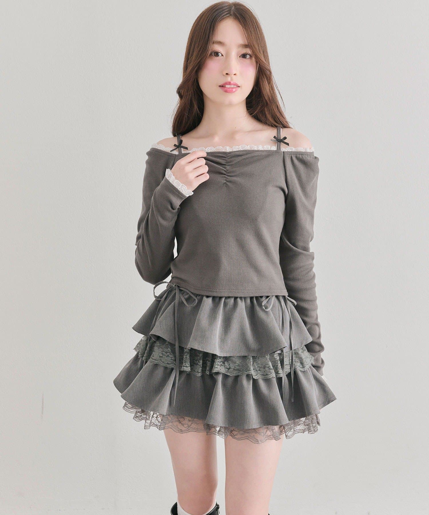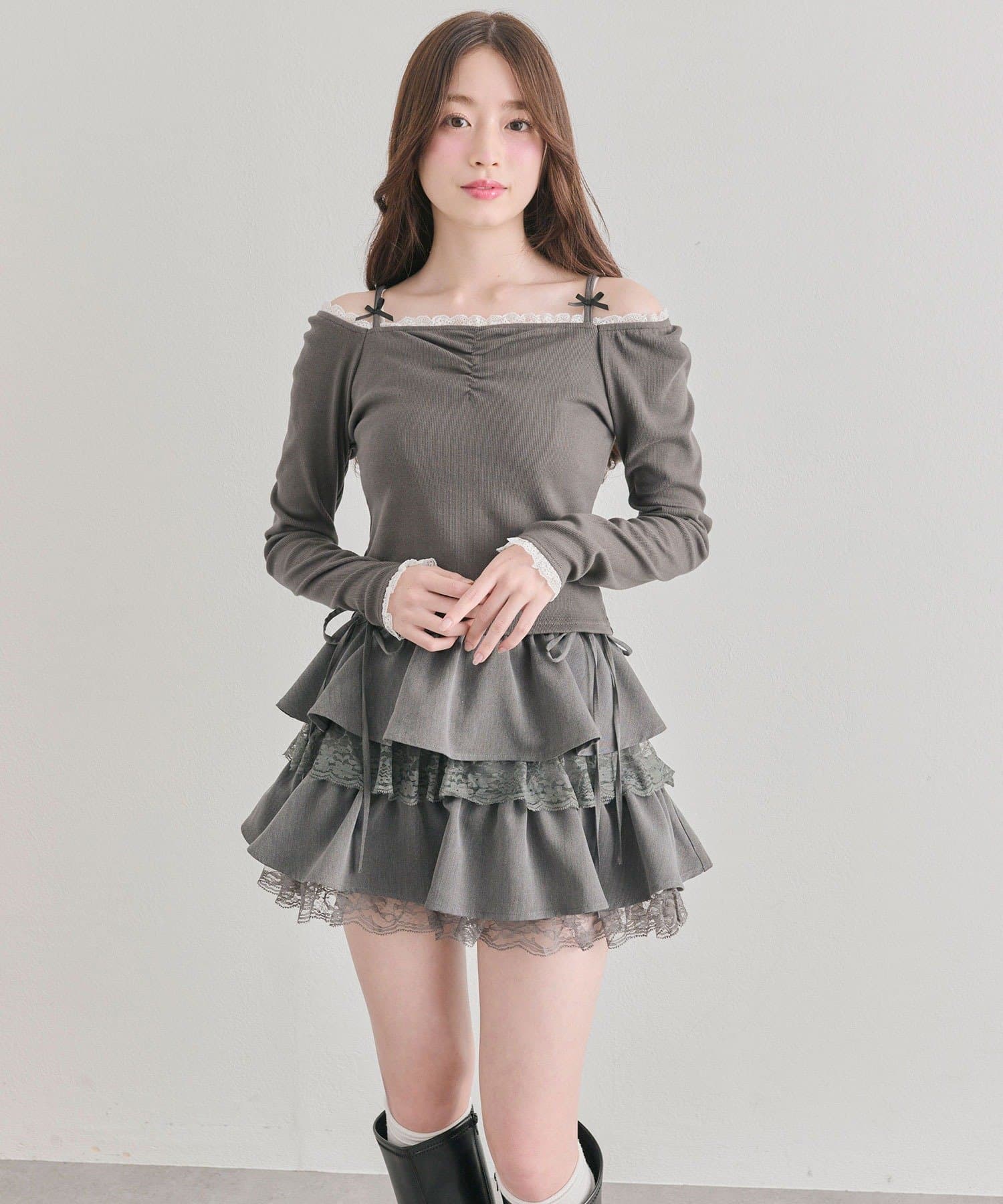 ・デコルテを綺麗に見せてくれるオフショルで、繊細なレースがフェミニンな印象になります。