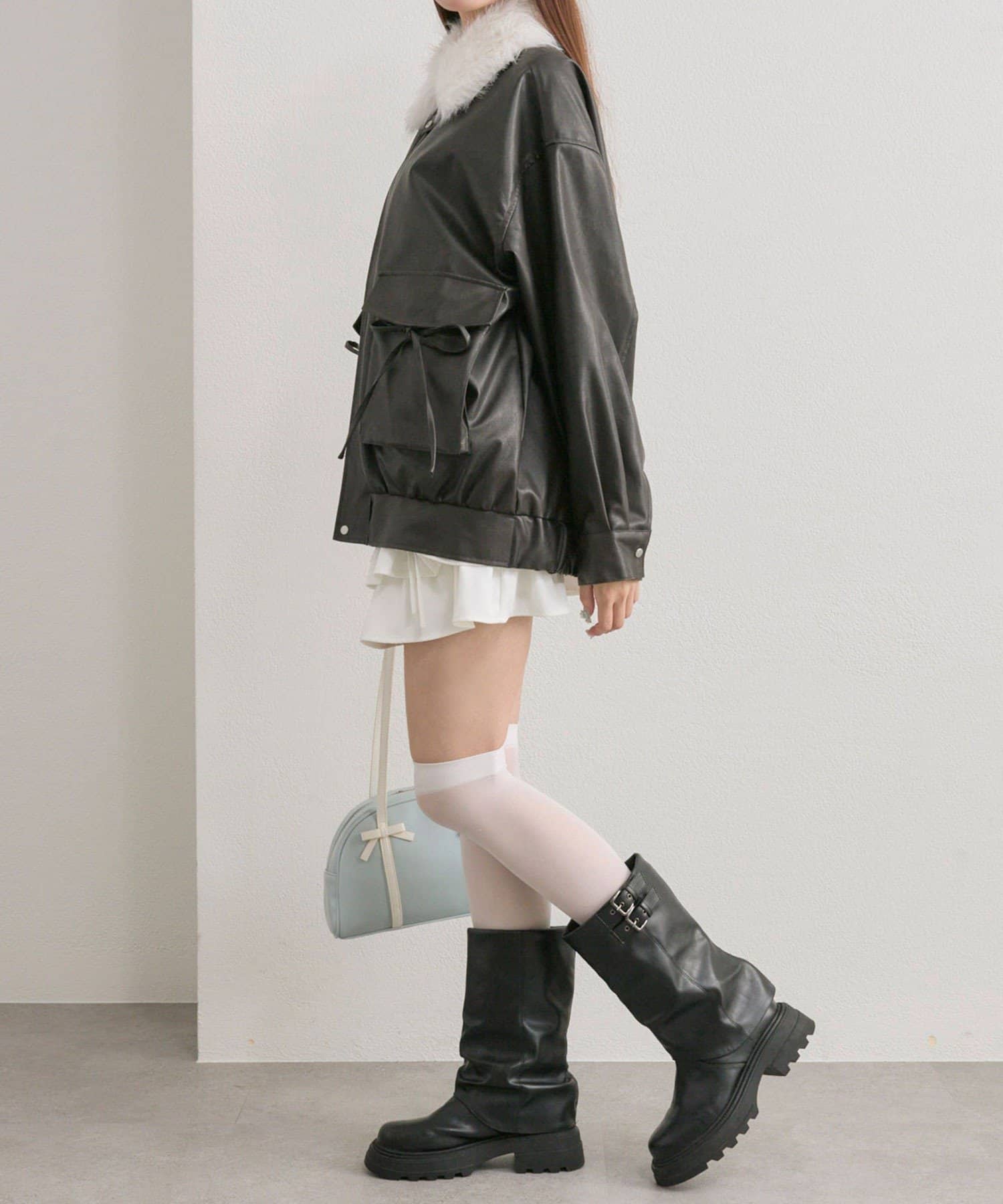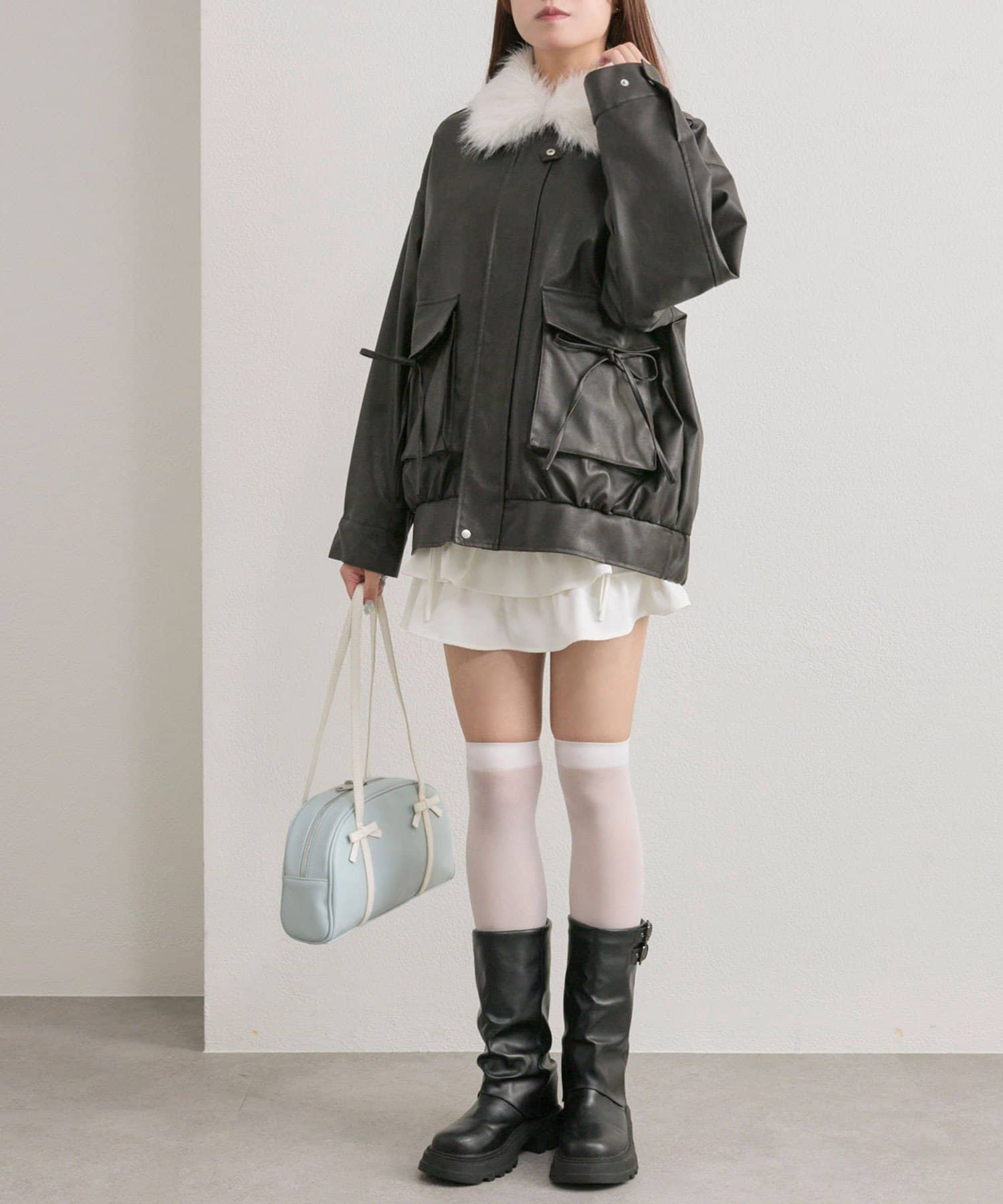 リボンとファーでガーリーデザインのエコレザーブルゾン