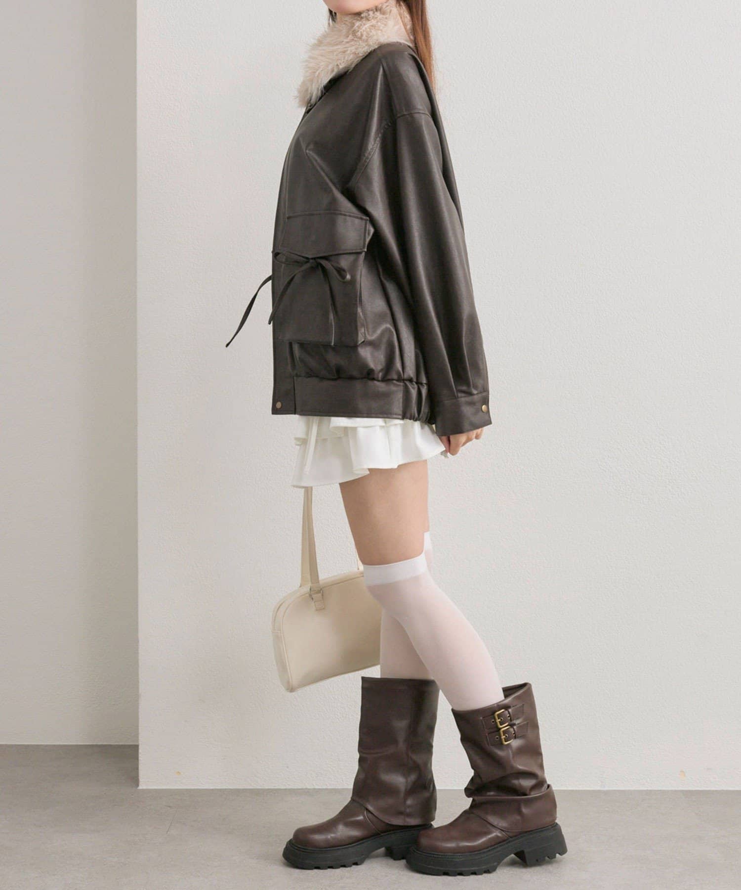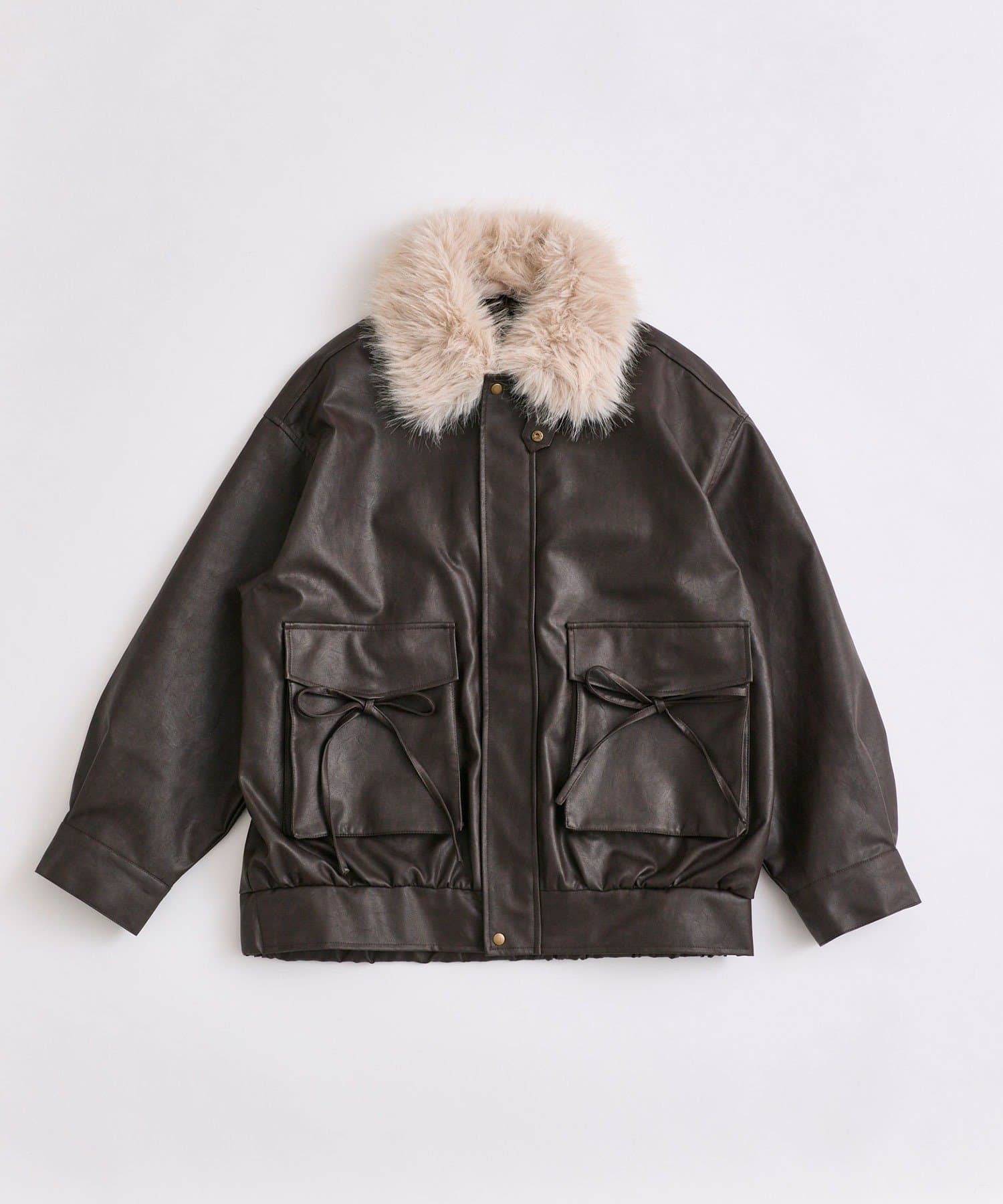 リボンとファーでガーリーデザインのエコレザーブルゾン