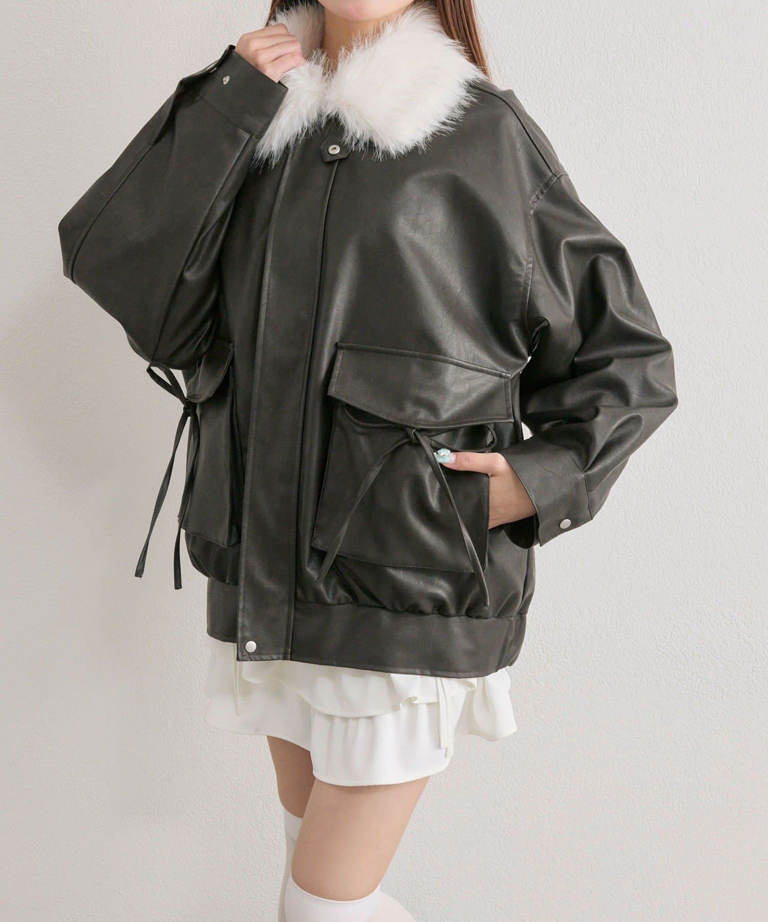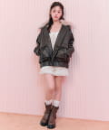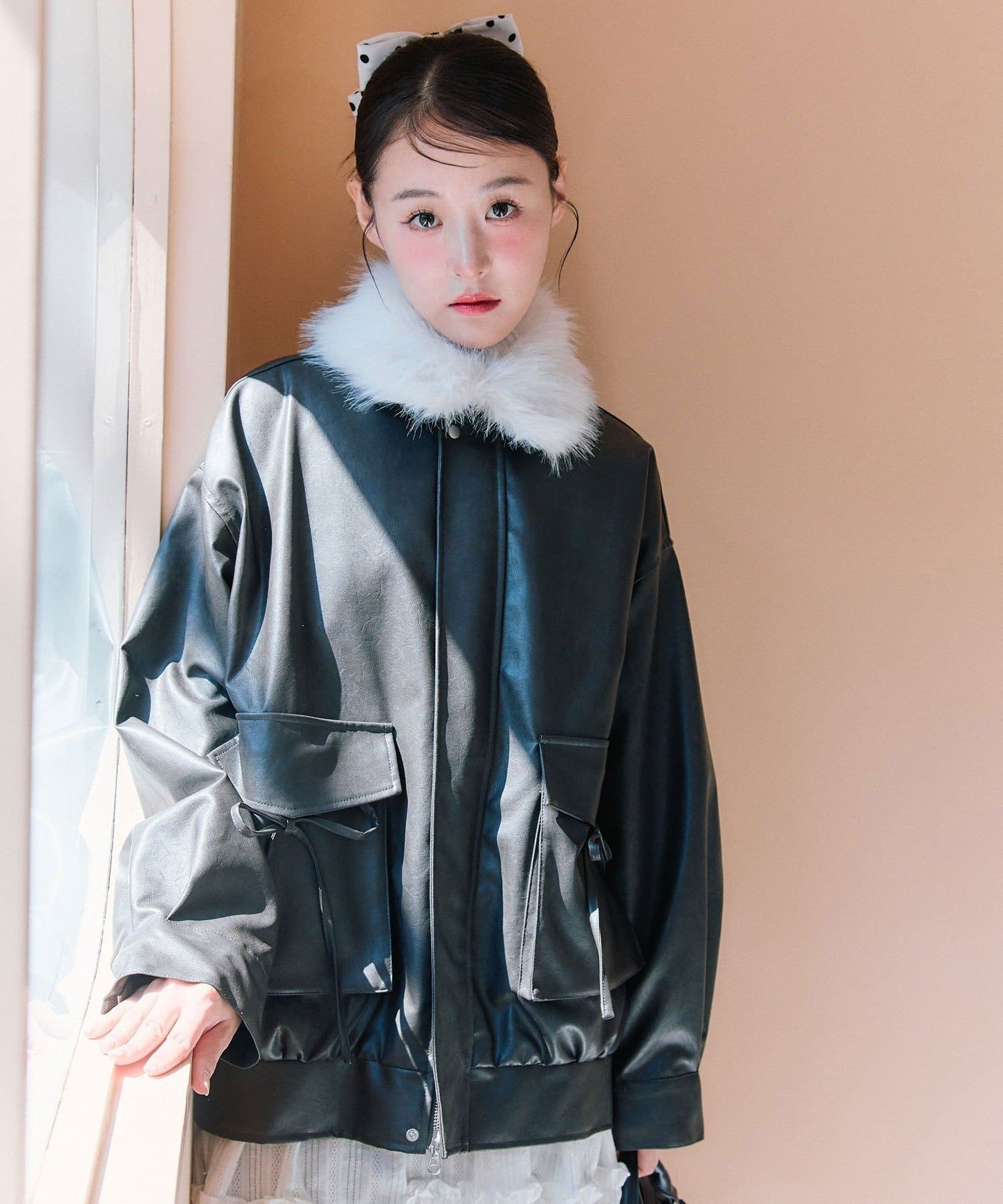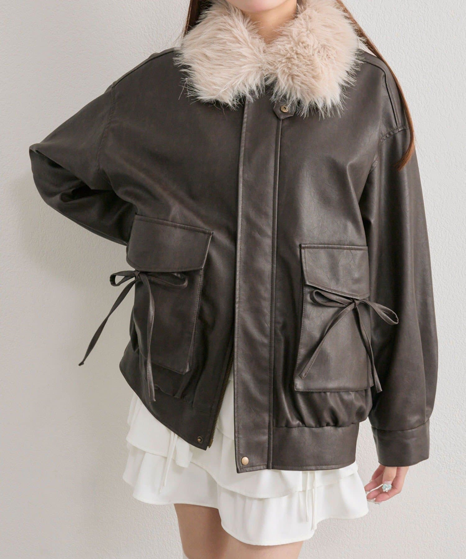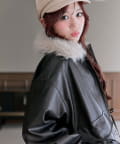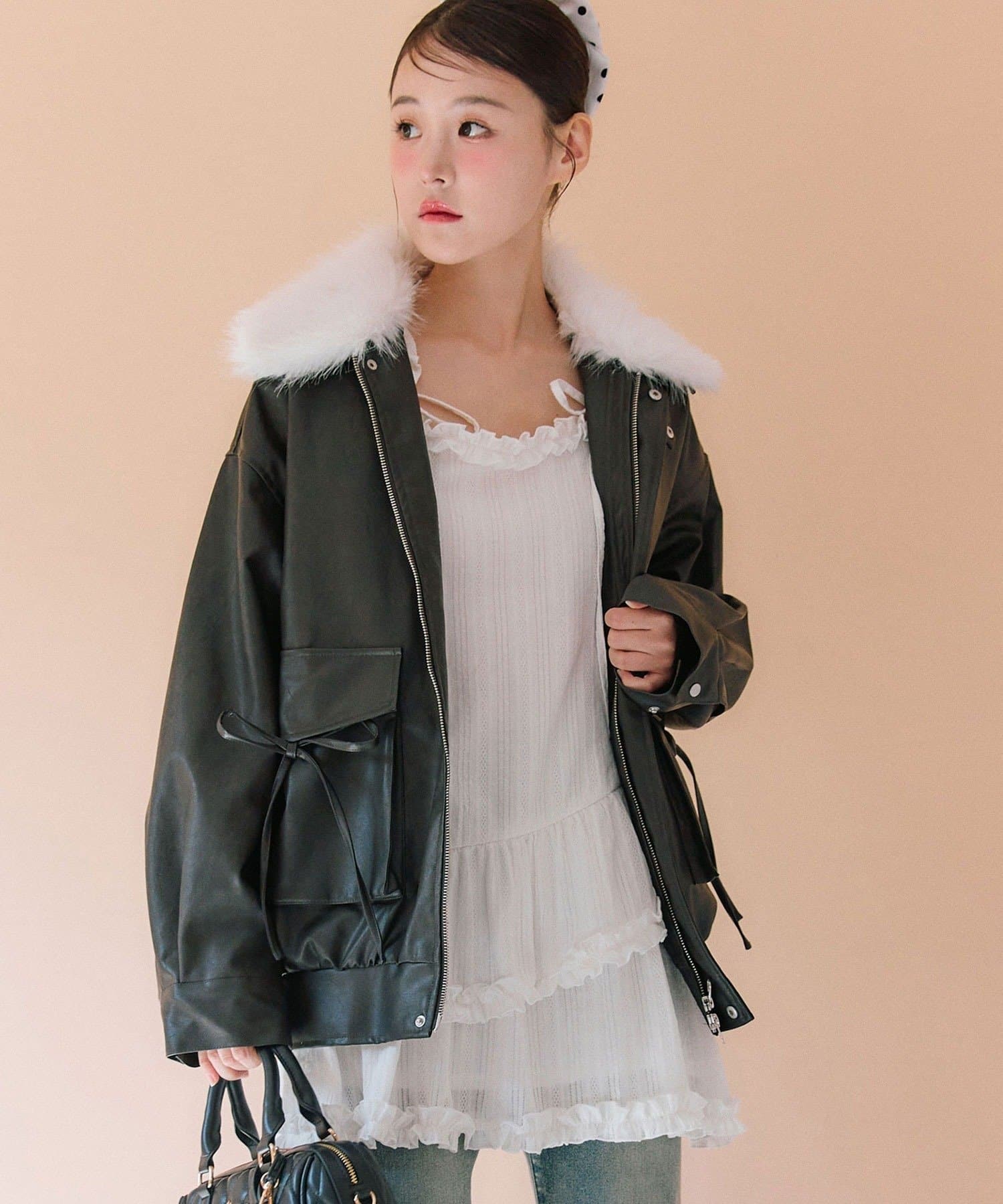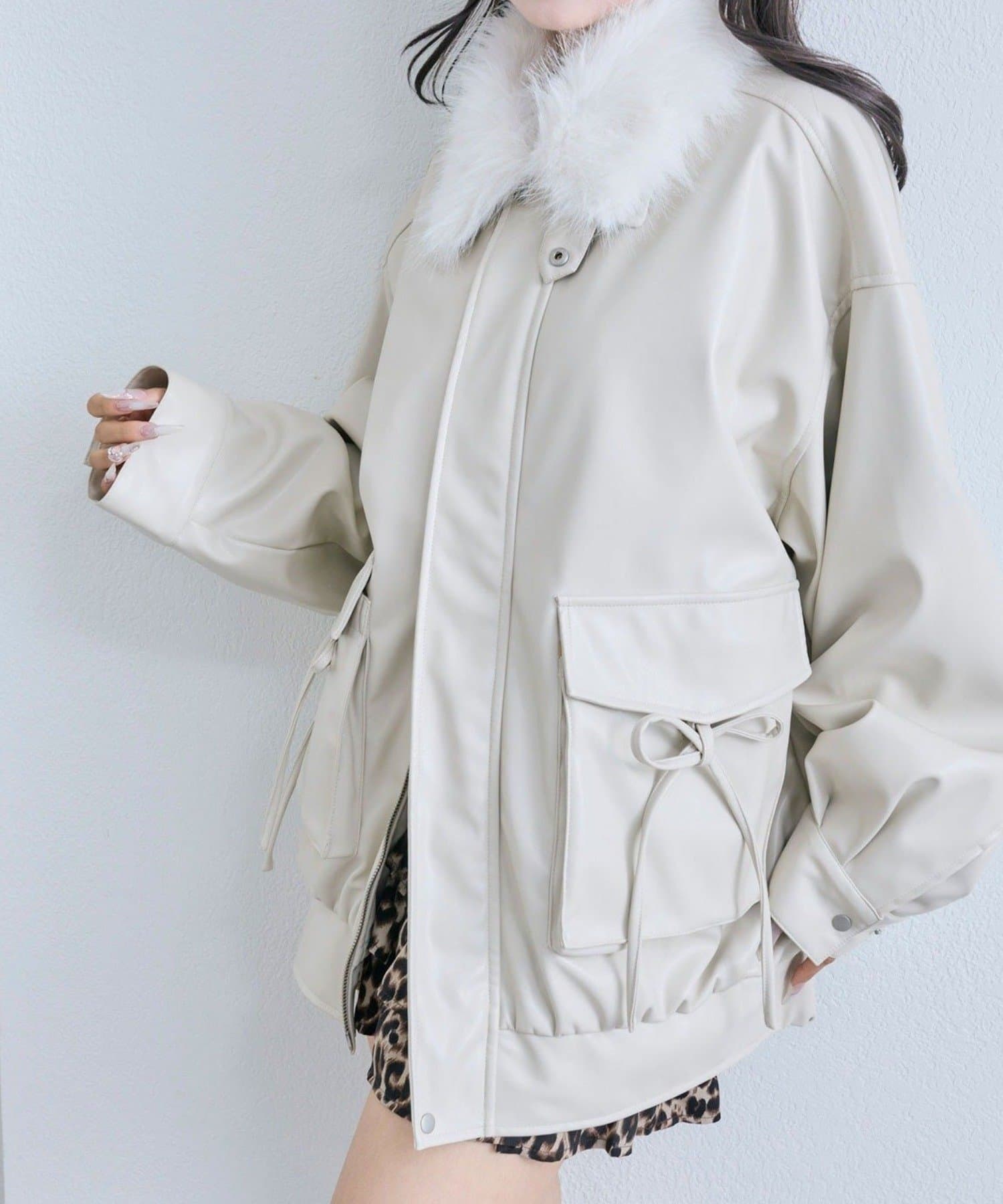 リボンとファーでガーリーデザインのエコレザーブルゾン