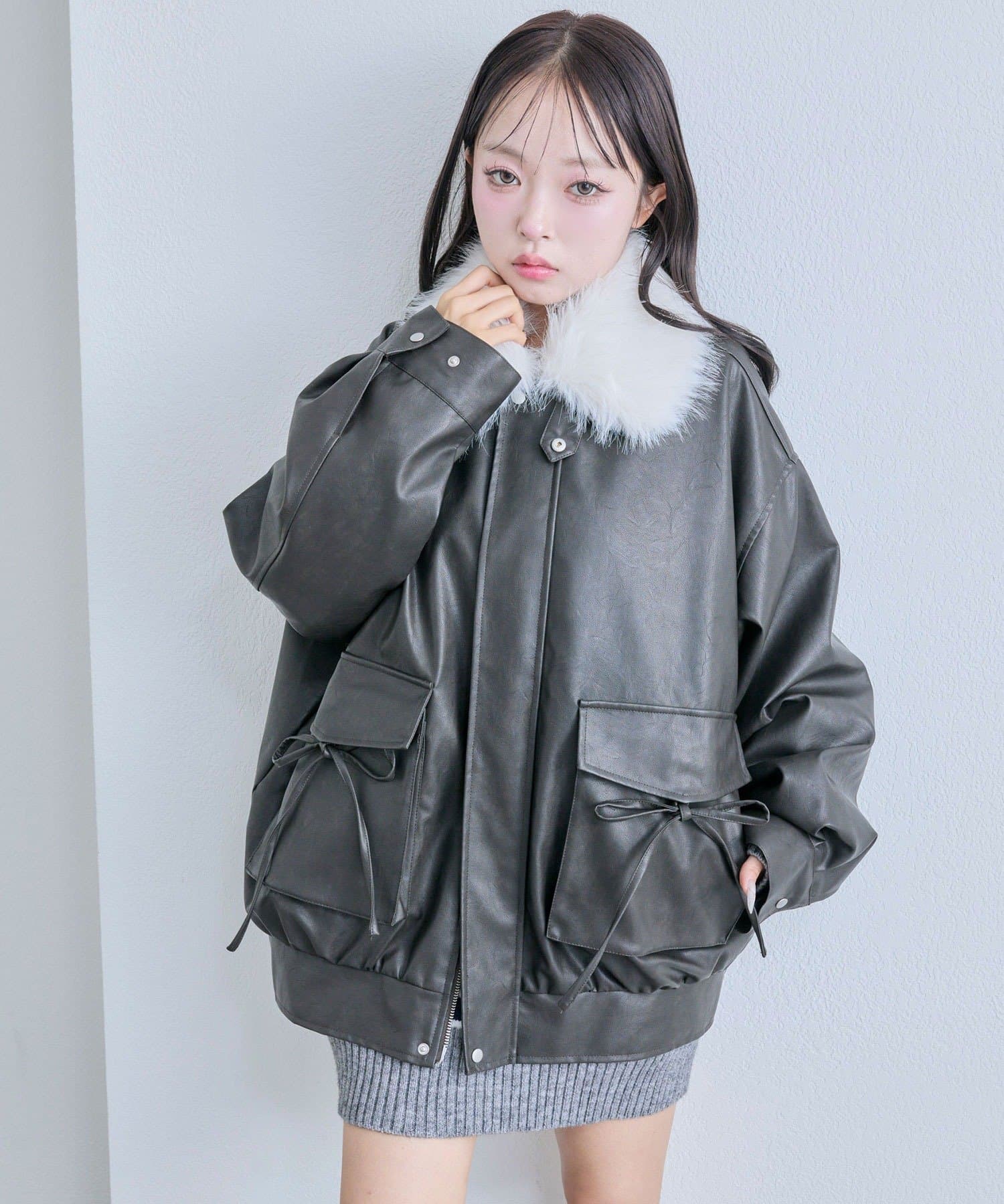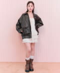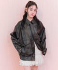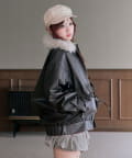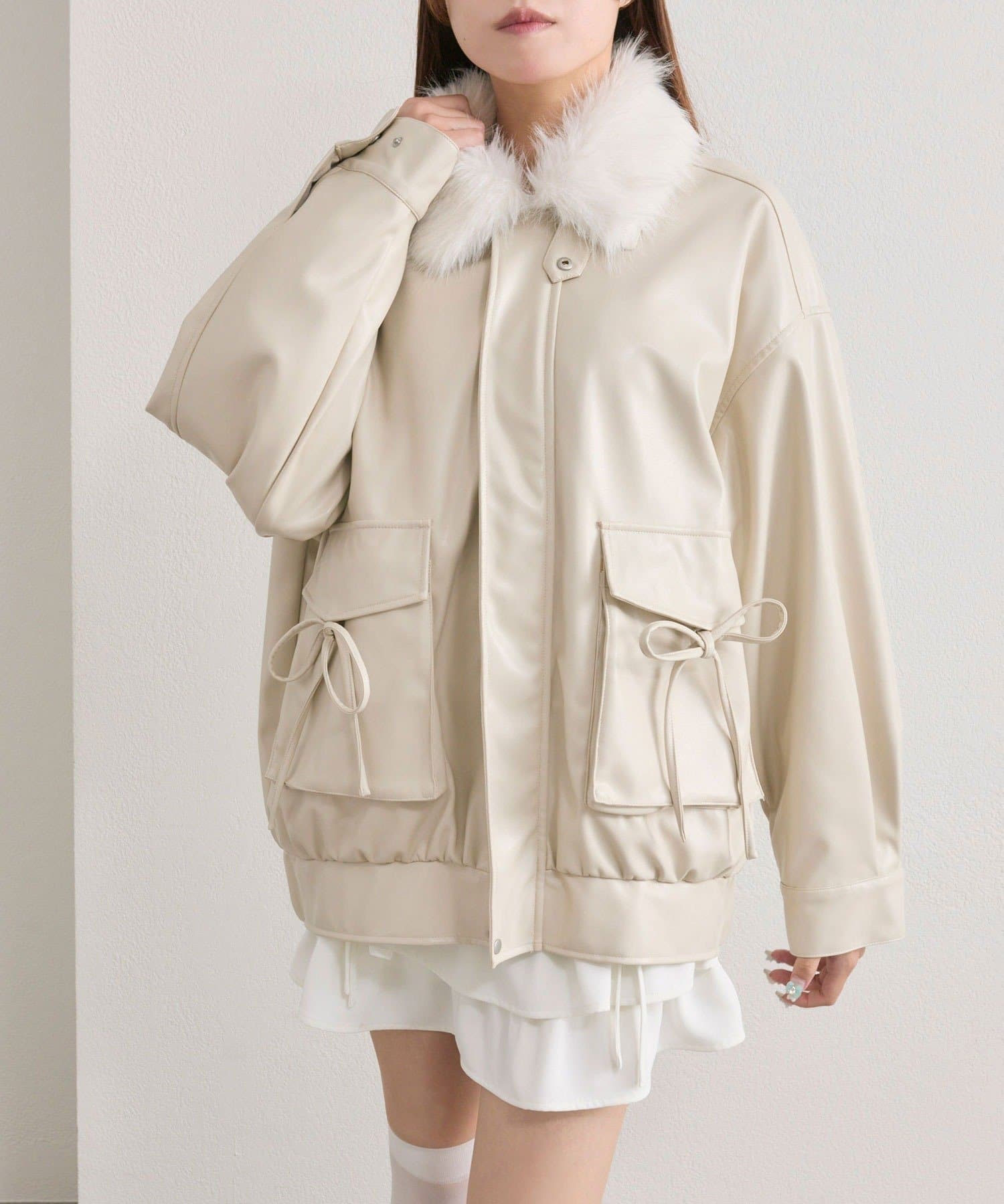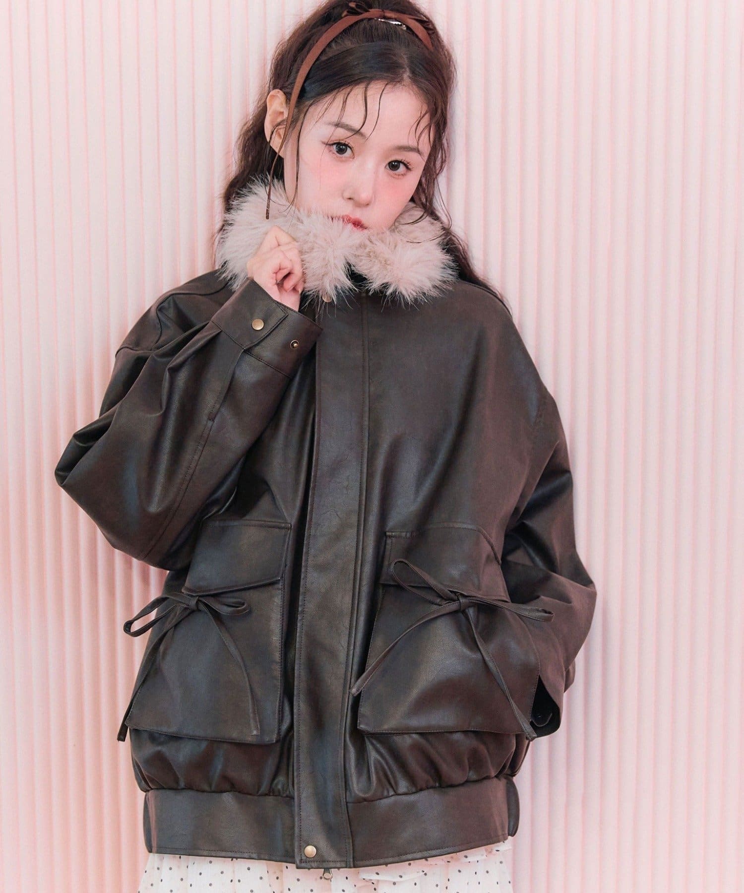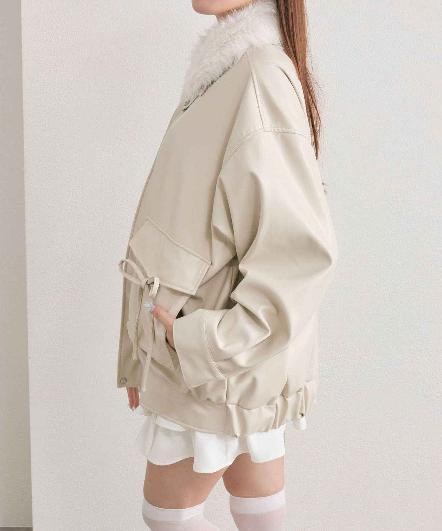 リボンとファーでガーリーデザインのエコレザーブルゾン