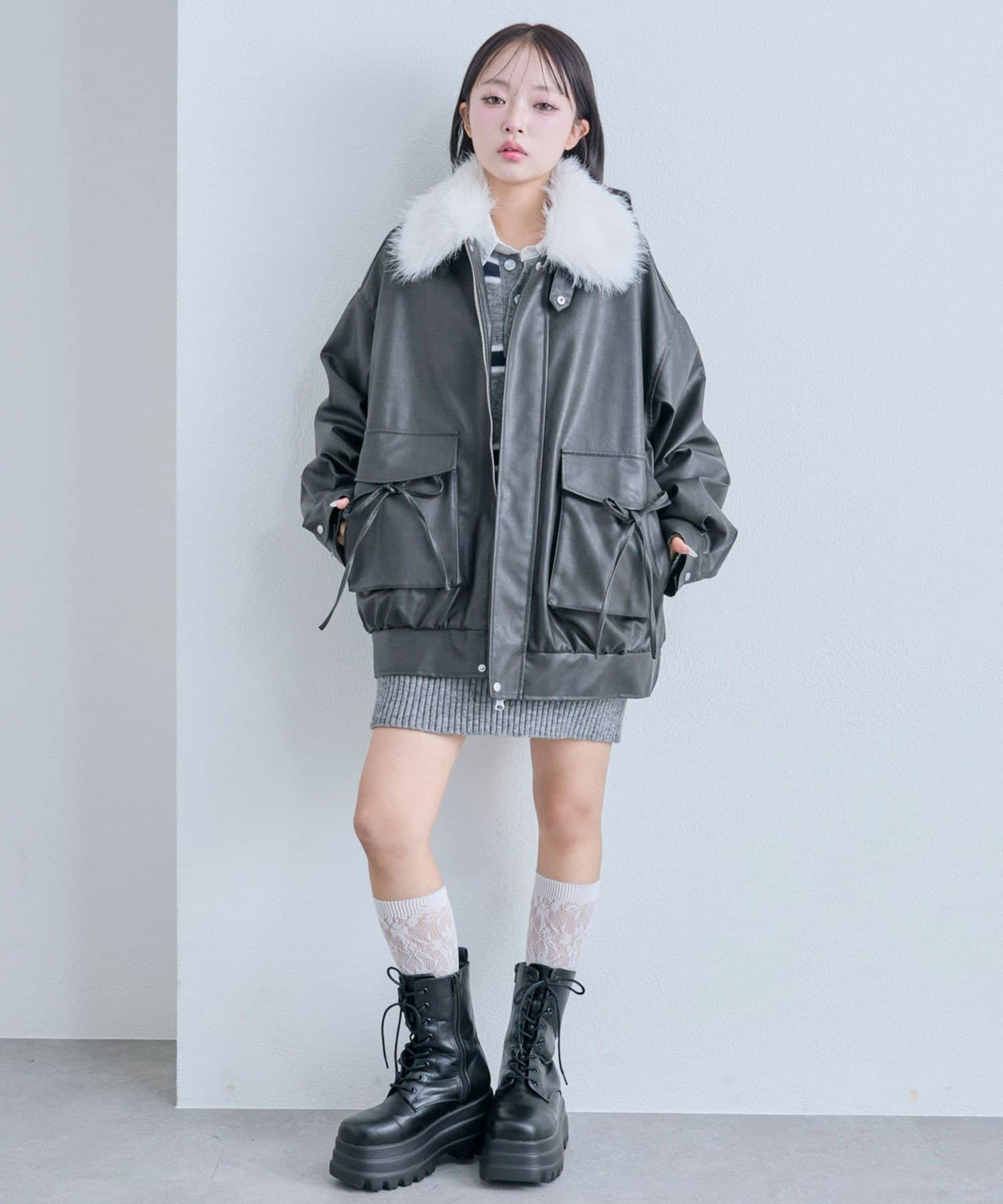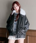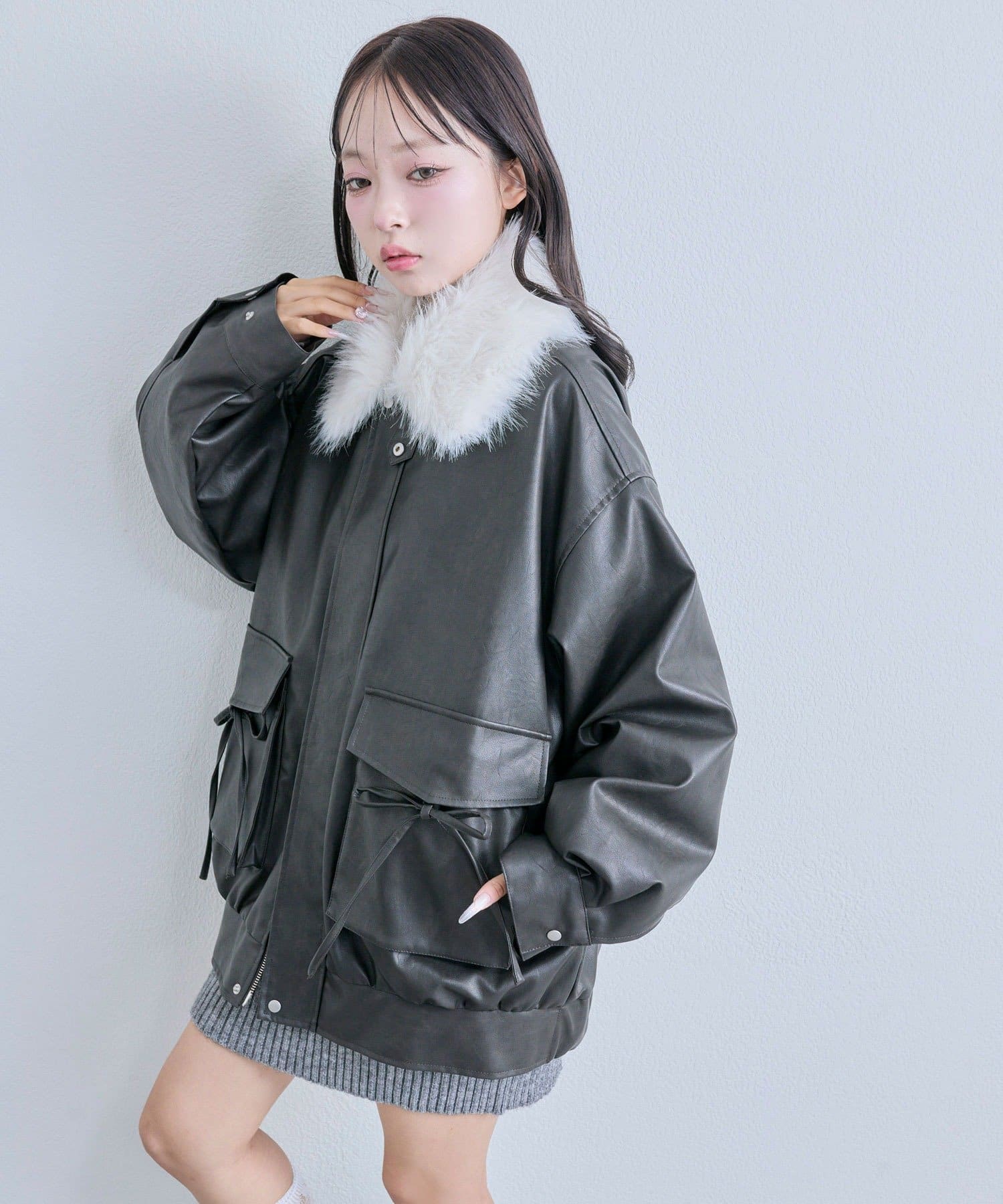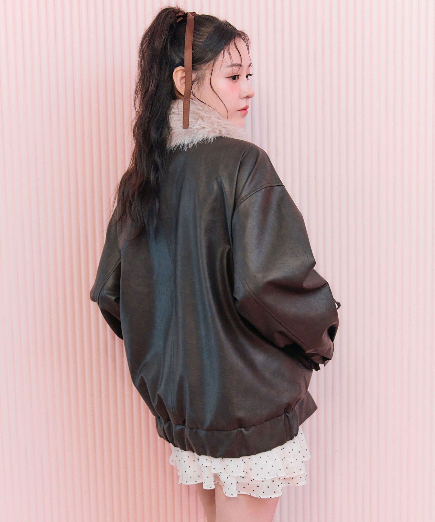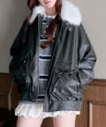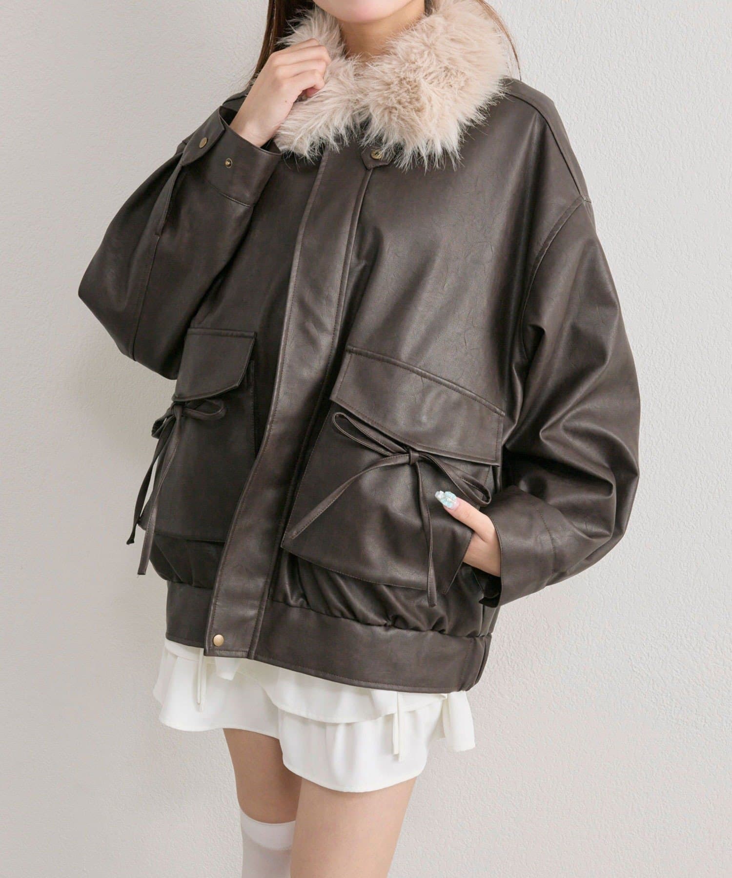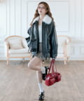 リボンとファーでガーリーデザインのエコレザーブルゾン