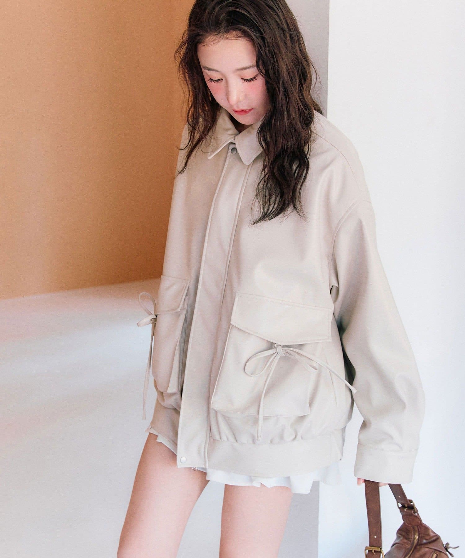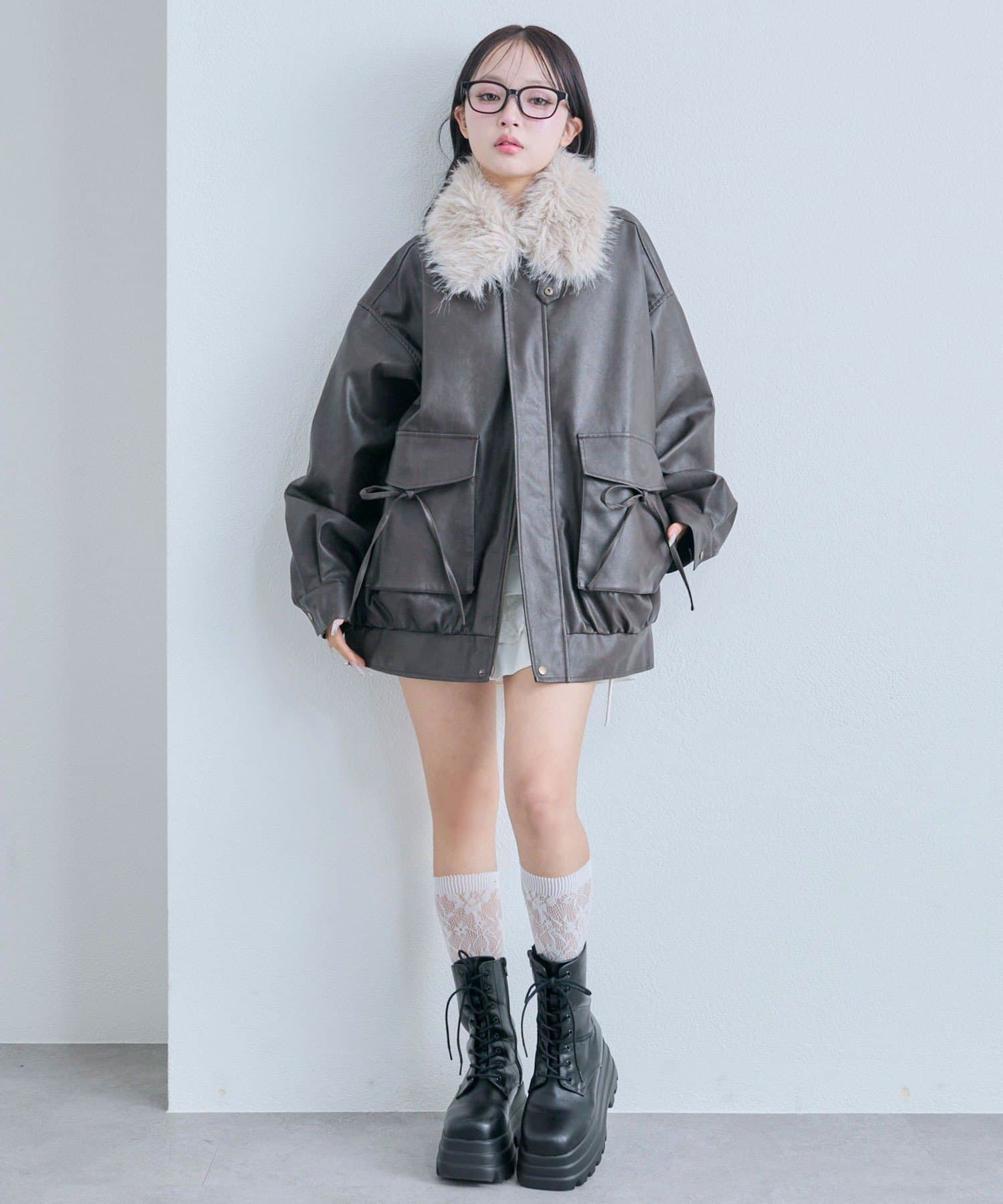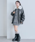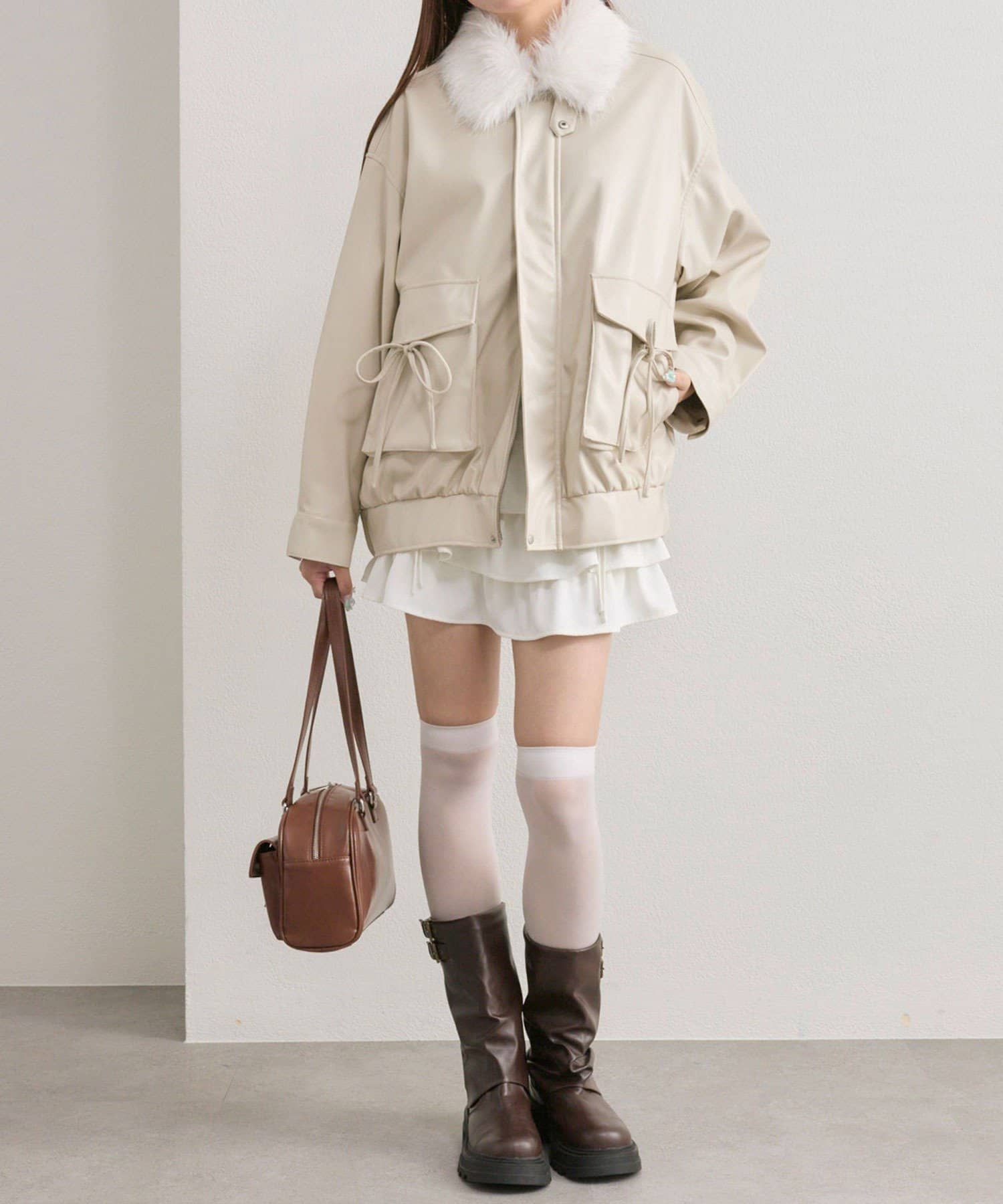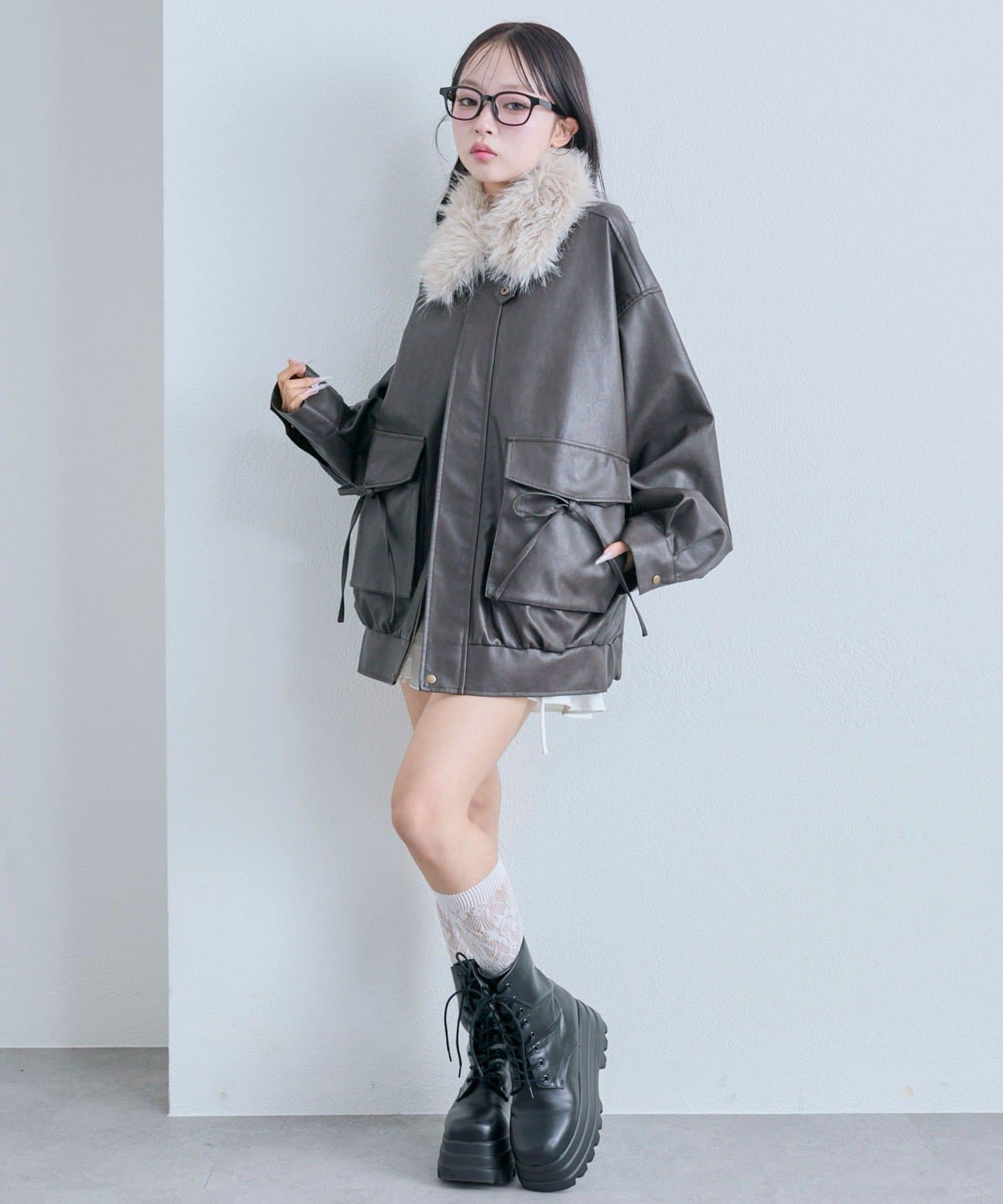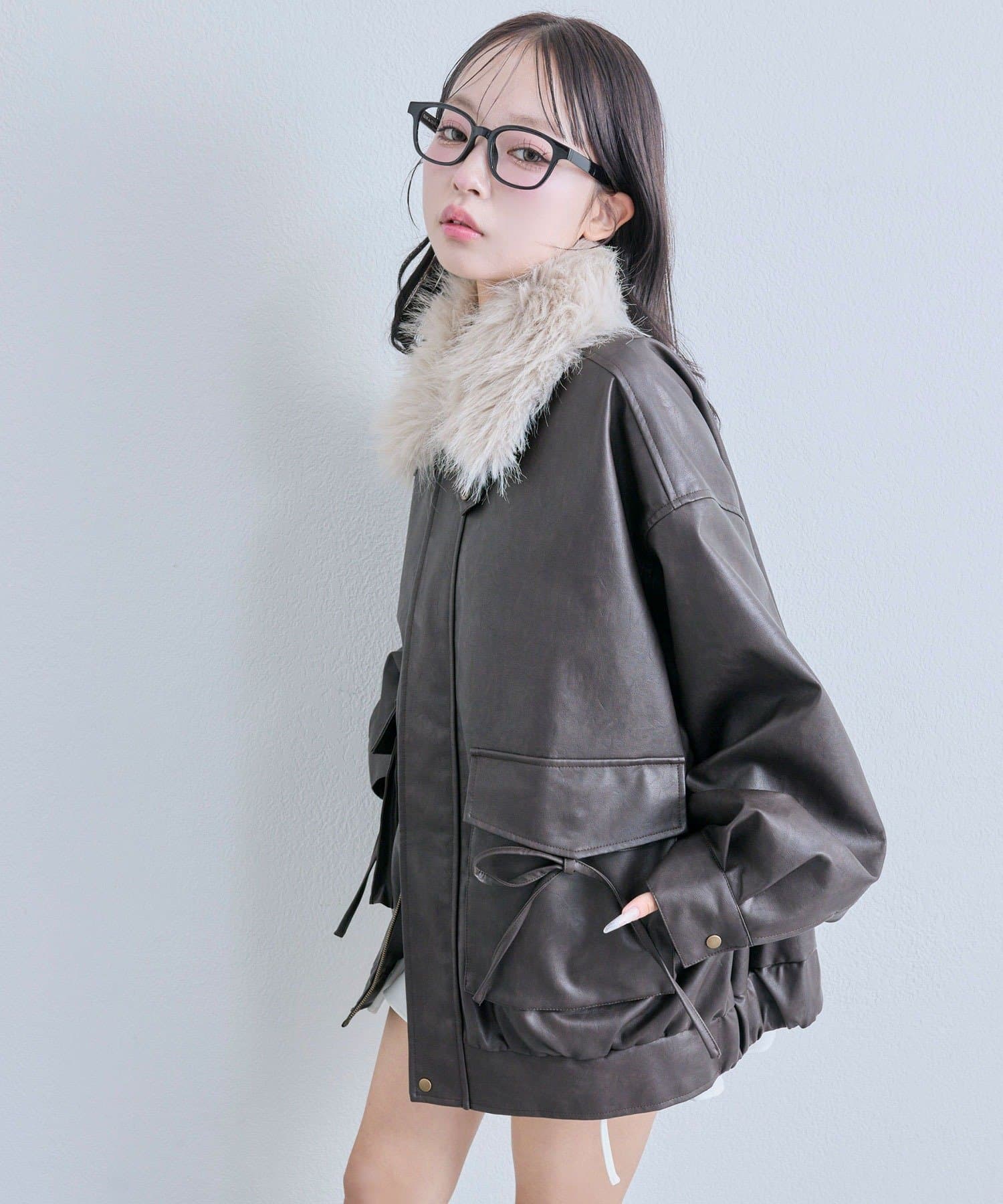 リボンとファーでガーリーデザインのエコレザーブルゾン