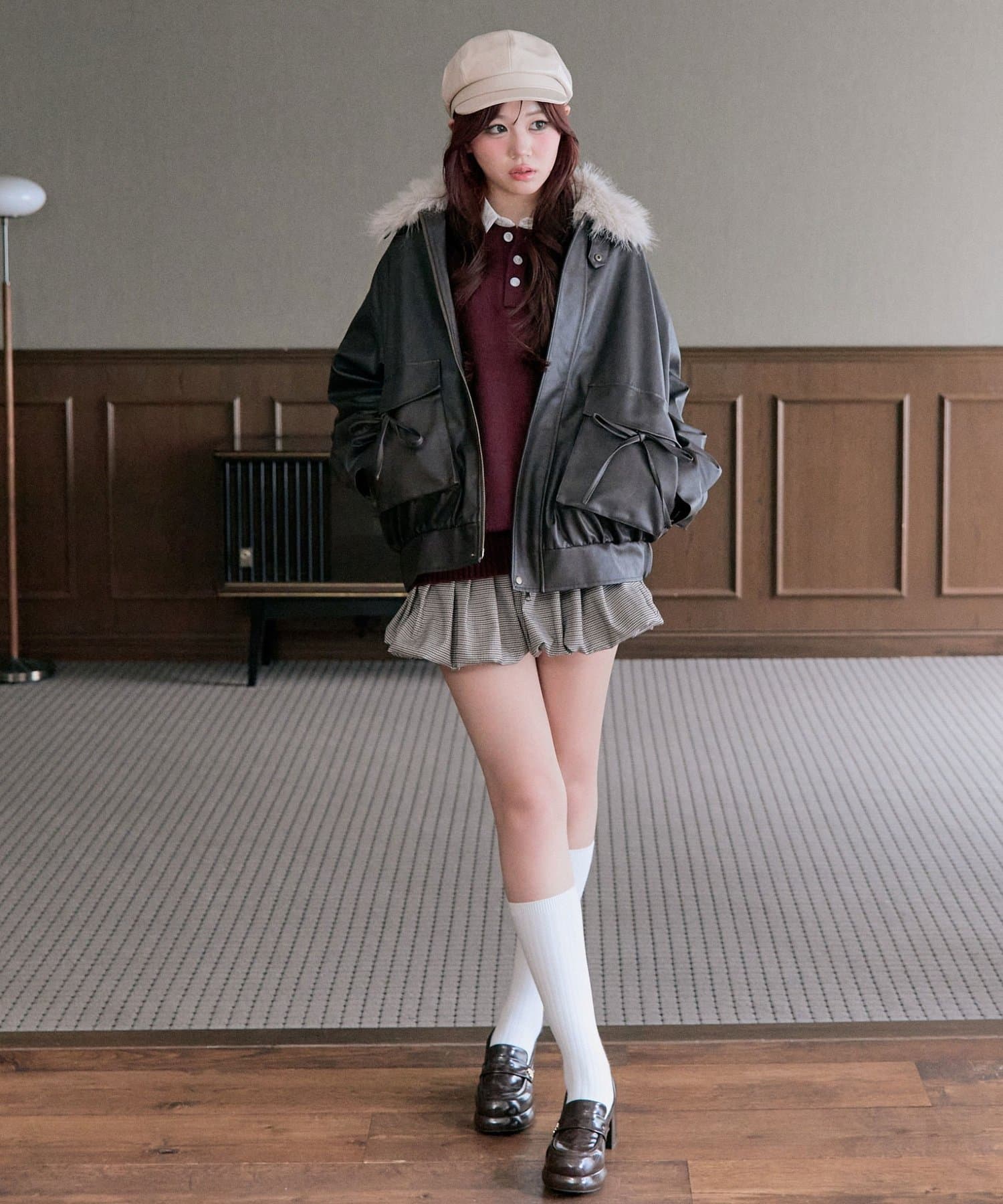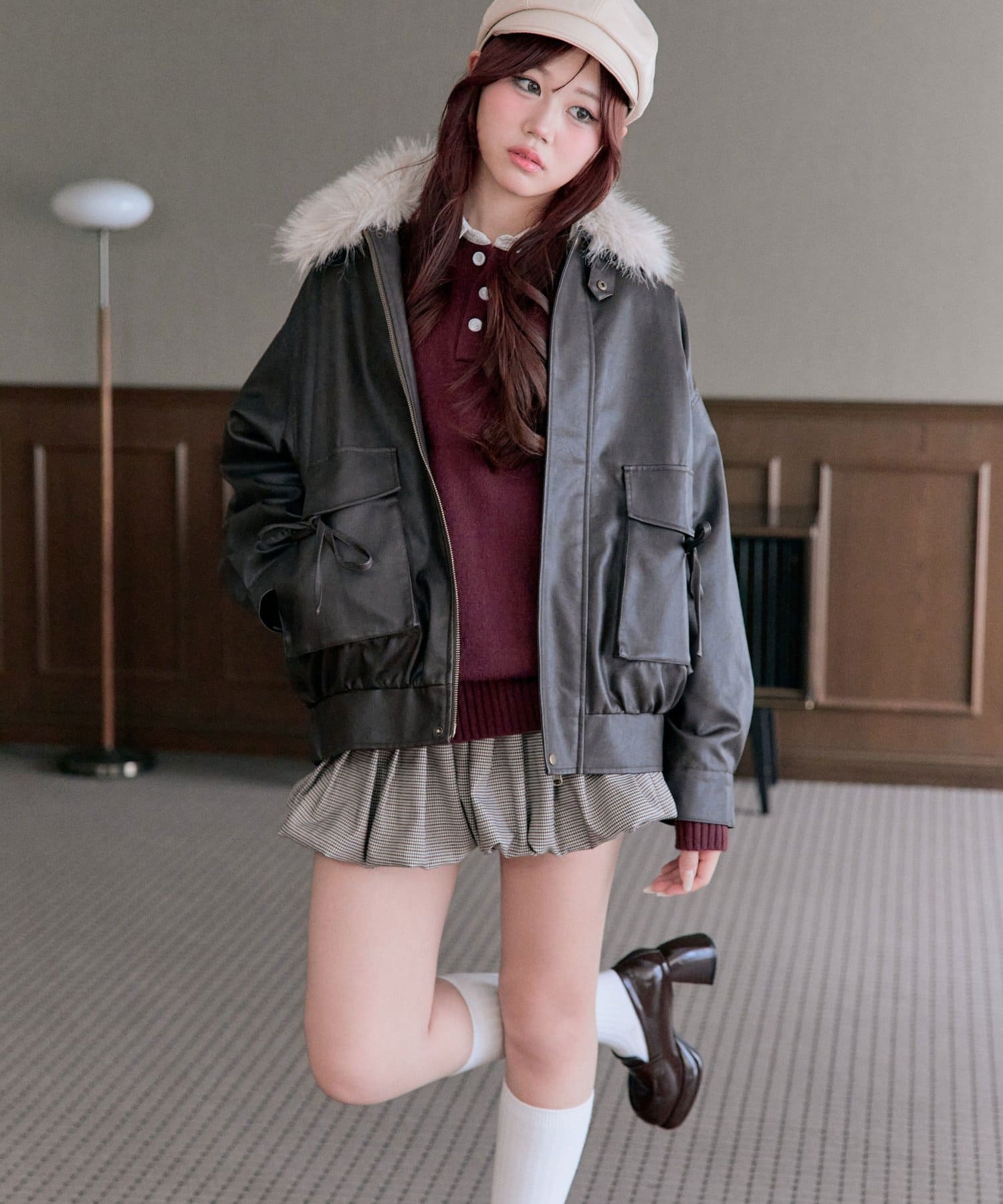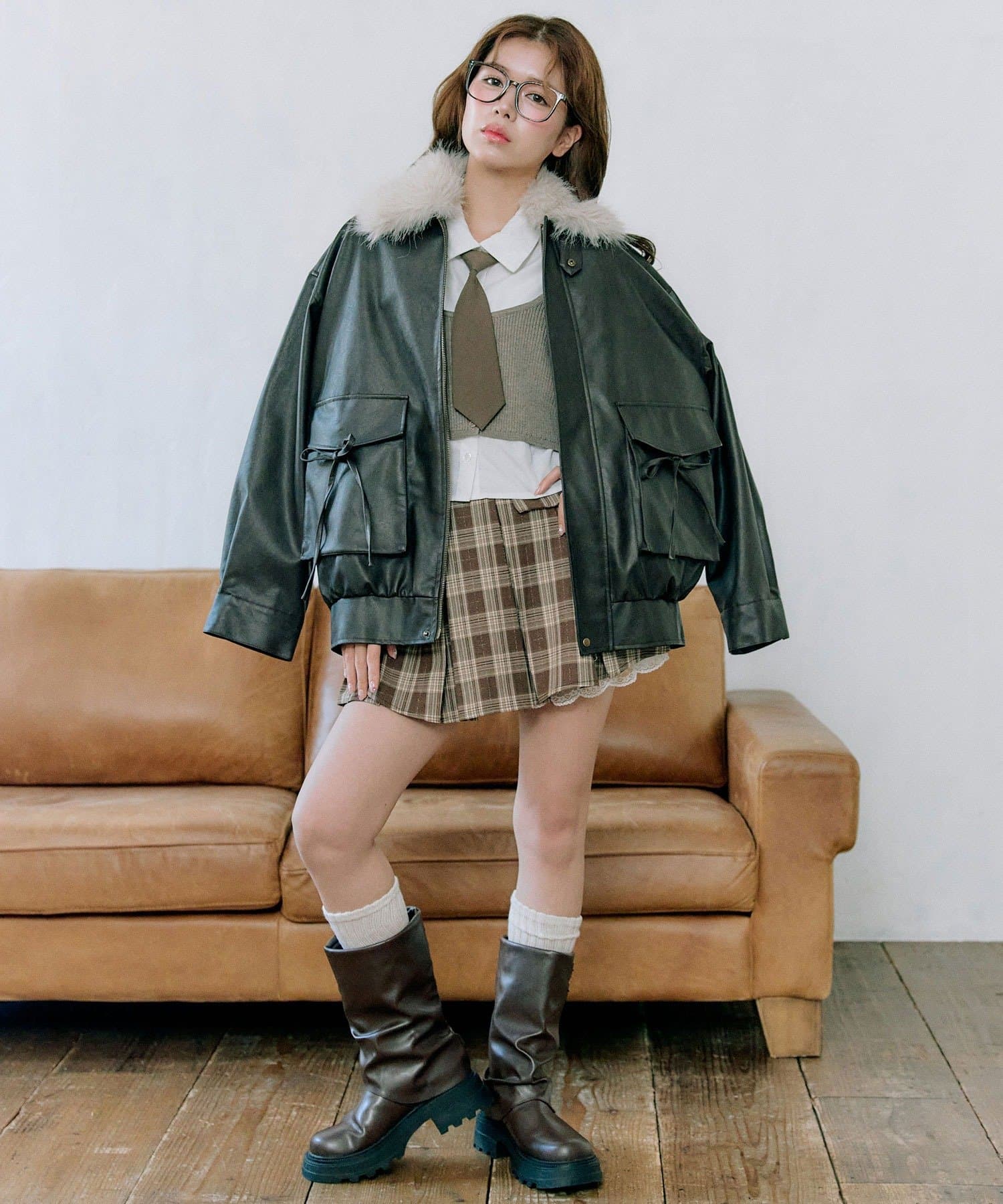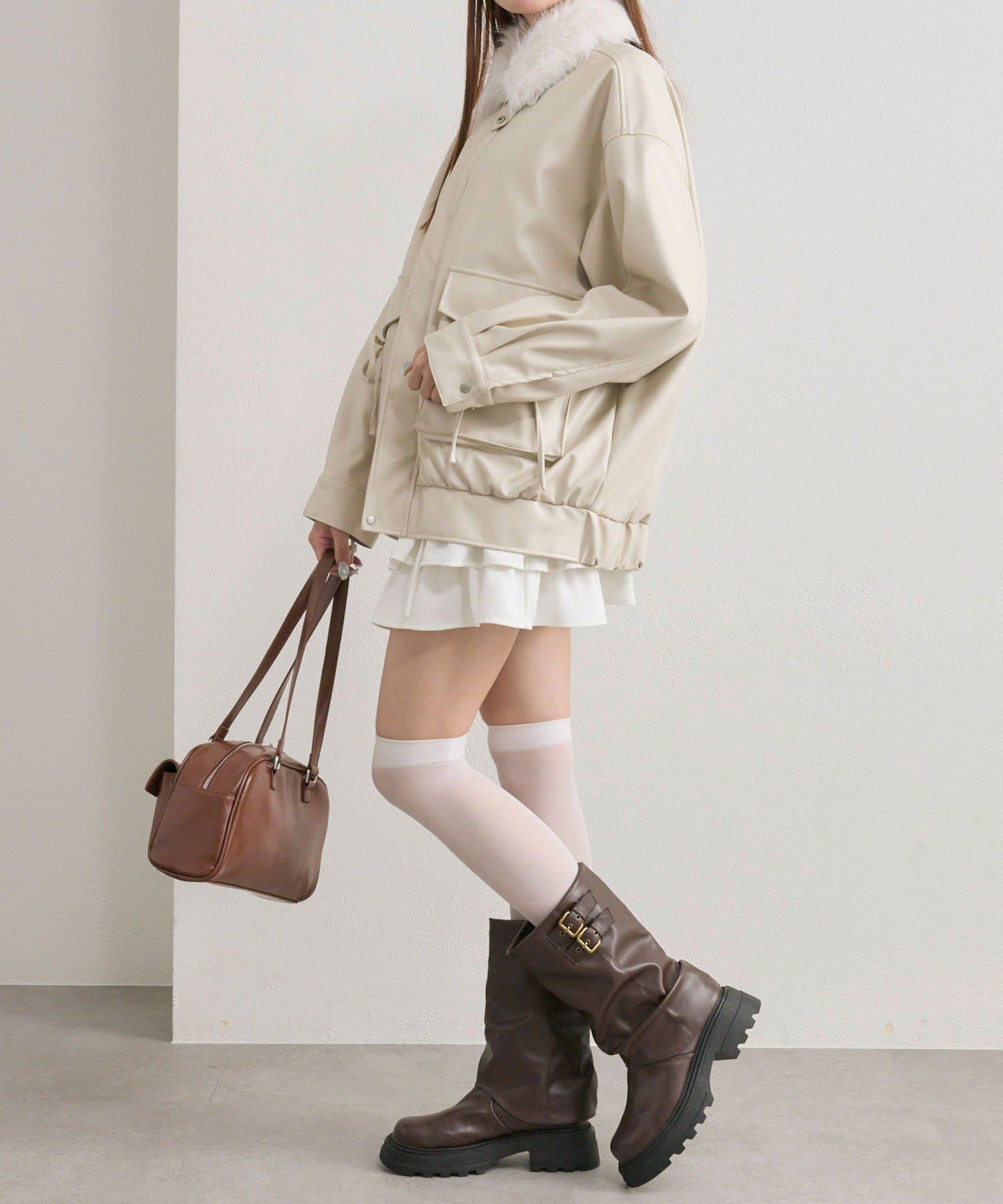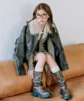 ・足元はロングブーツを合わせると韓国っぽい着こなしに。