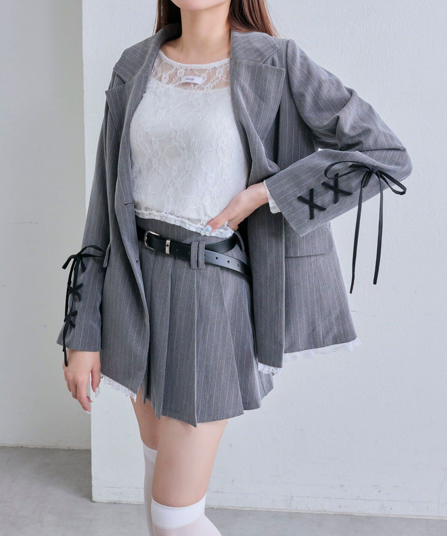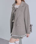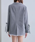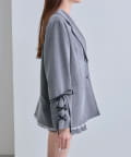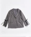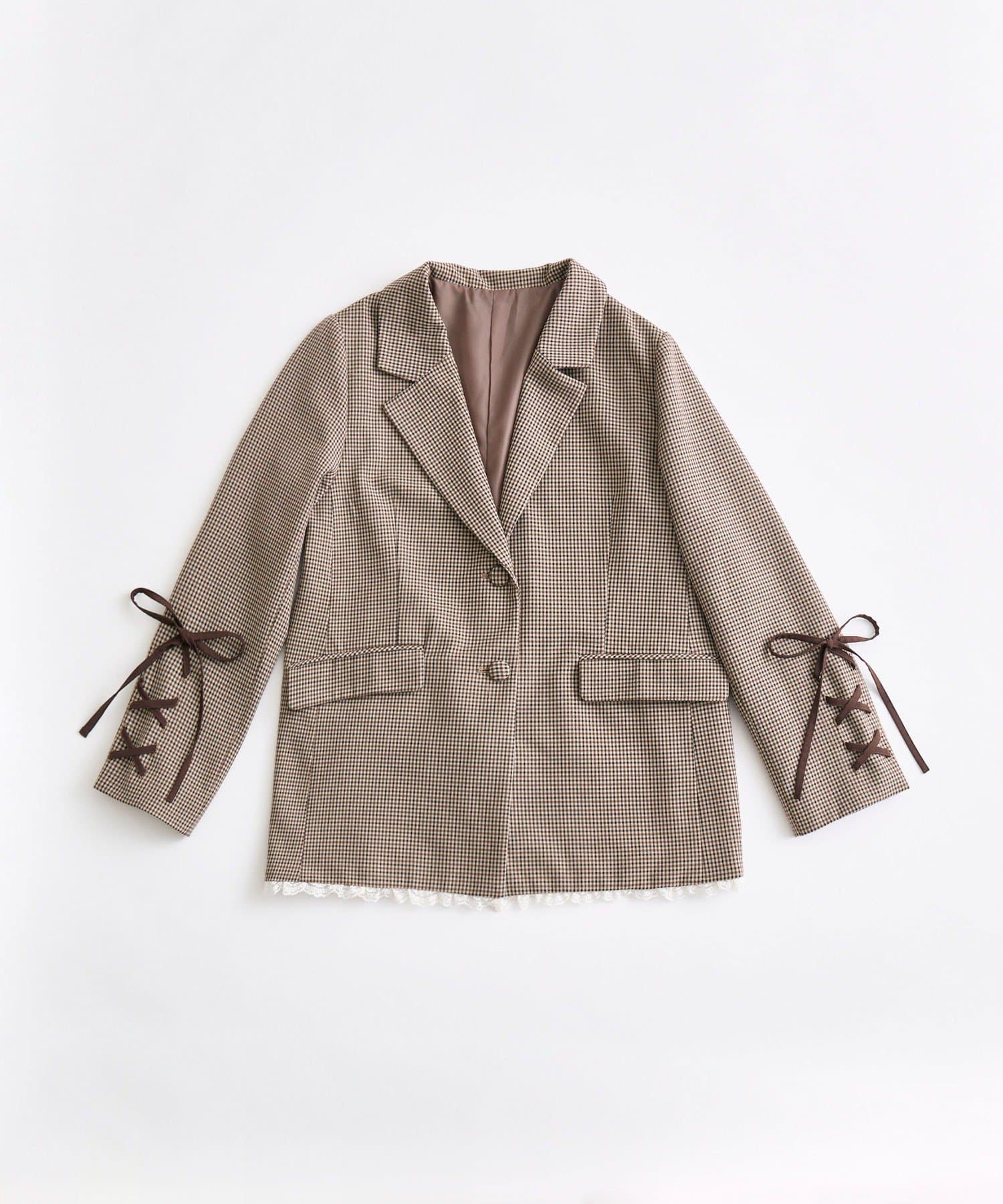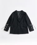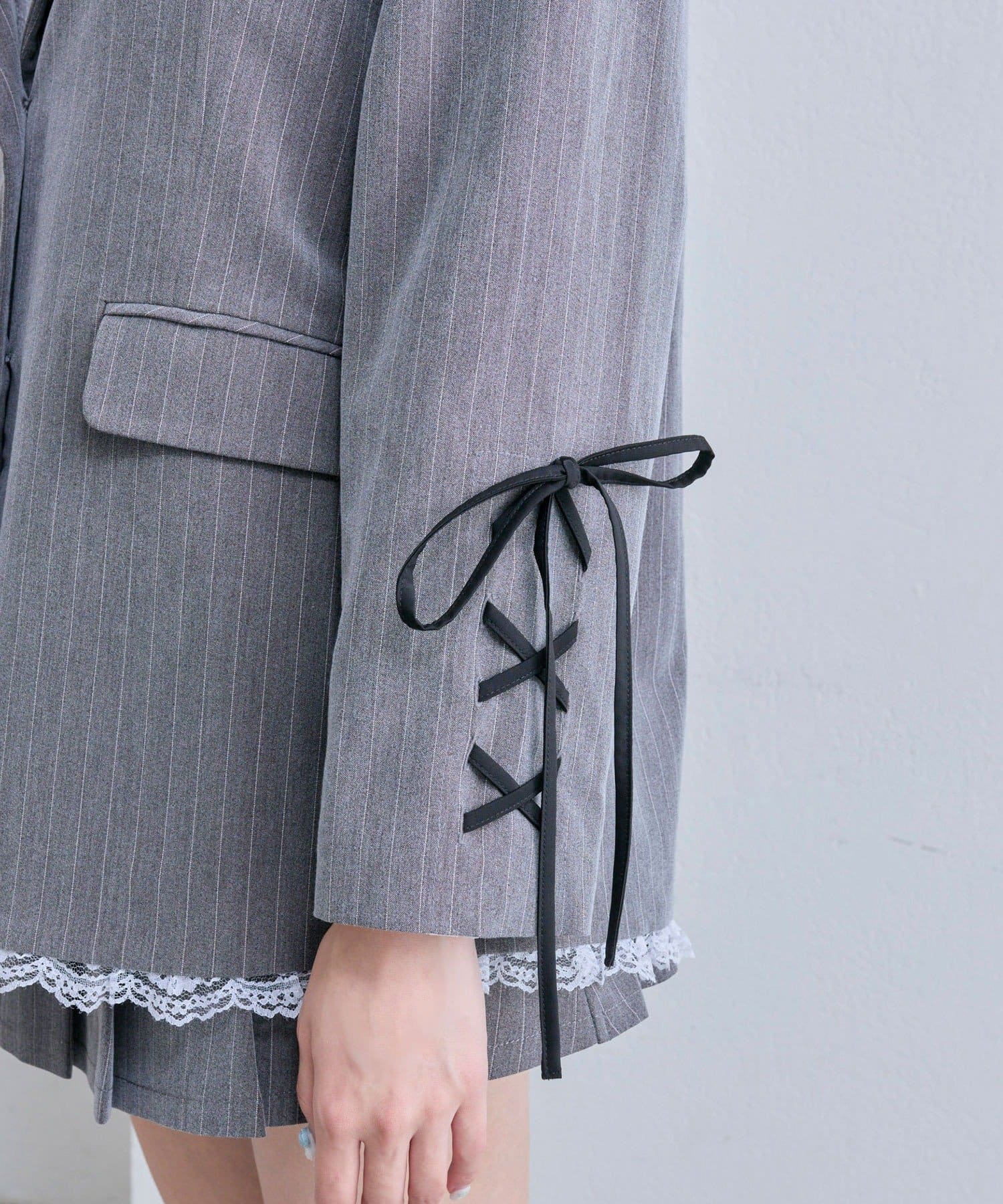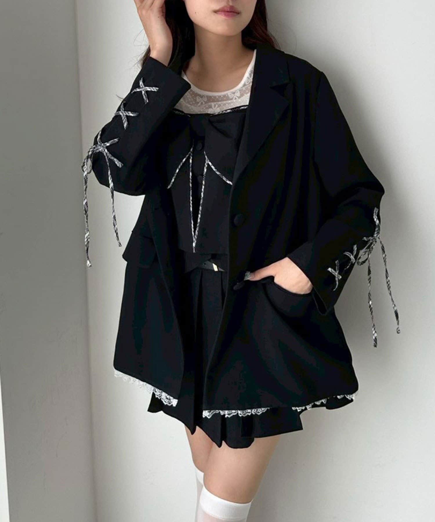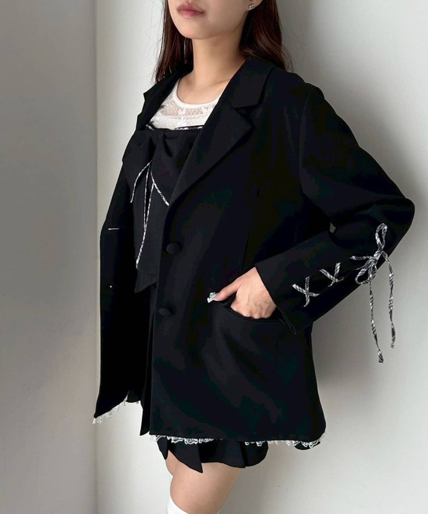 ・袖のリボンや裾のレースがかっちりとした印象のジャケットに抜け感をプラスし、女性らしい雰囲気を演出します。