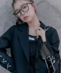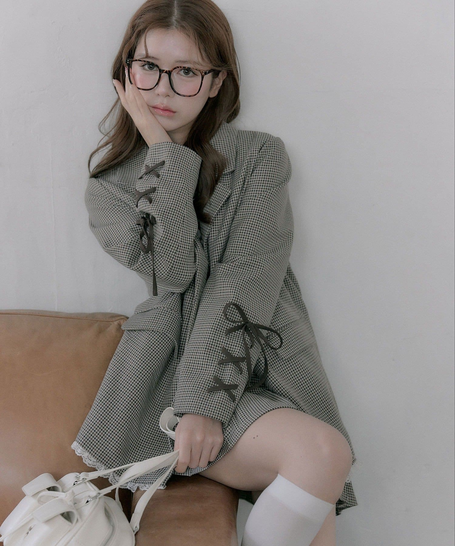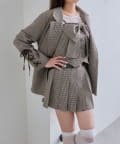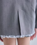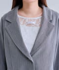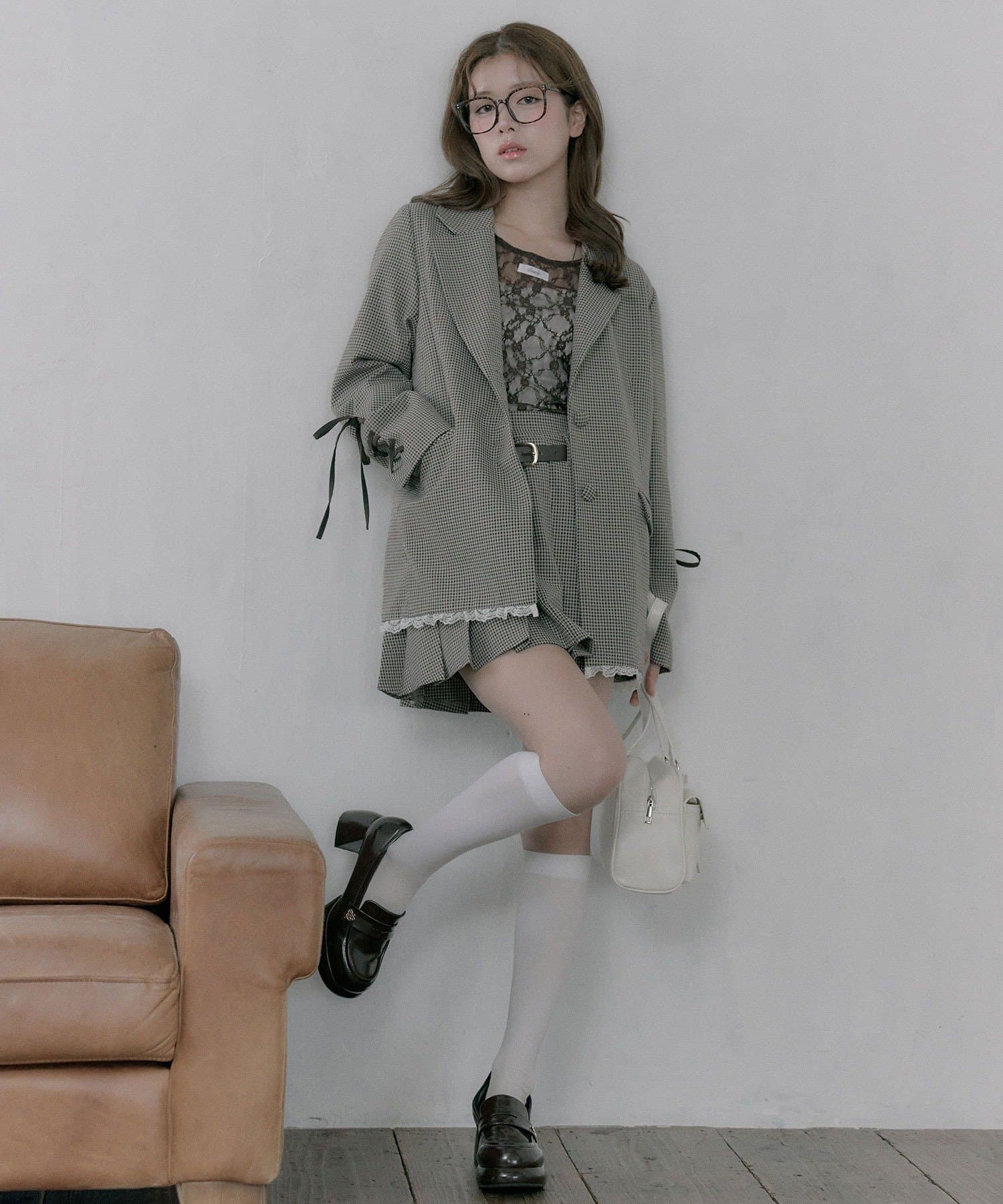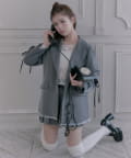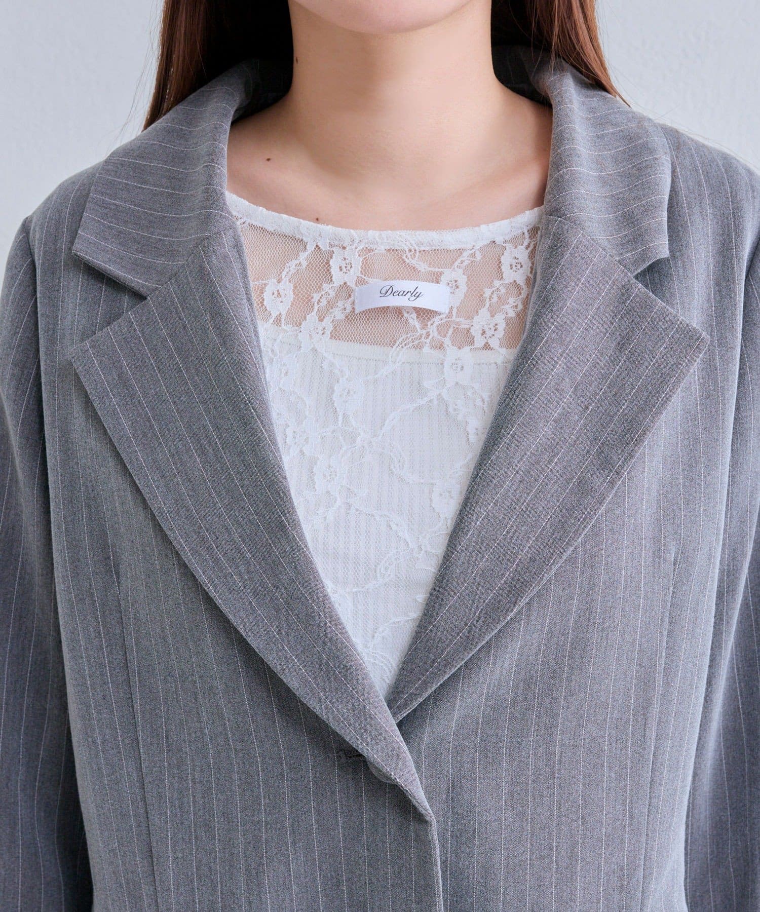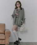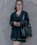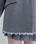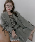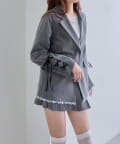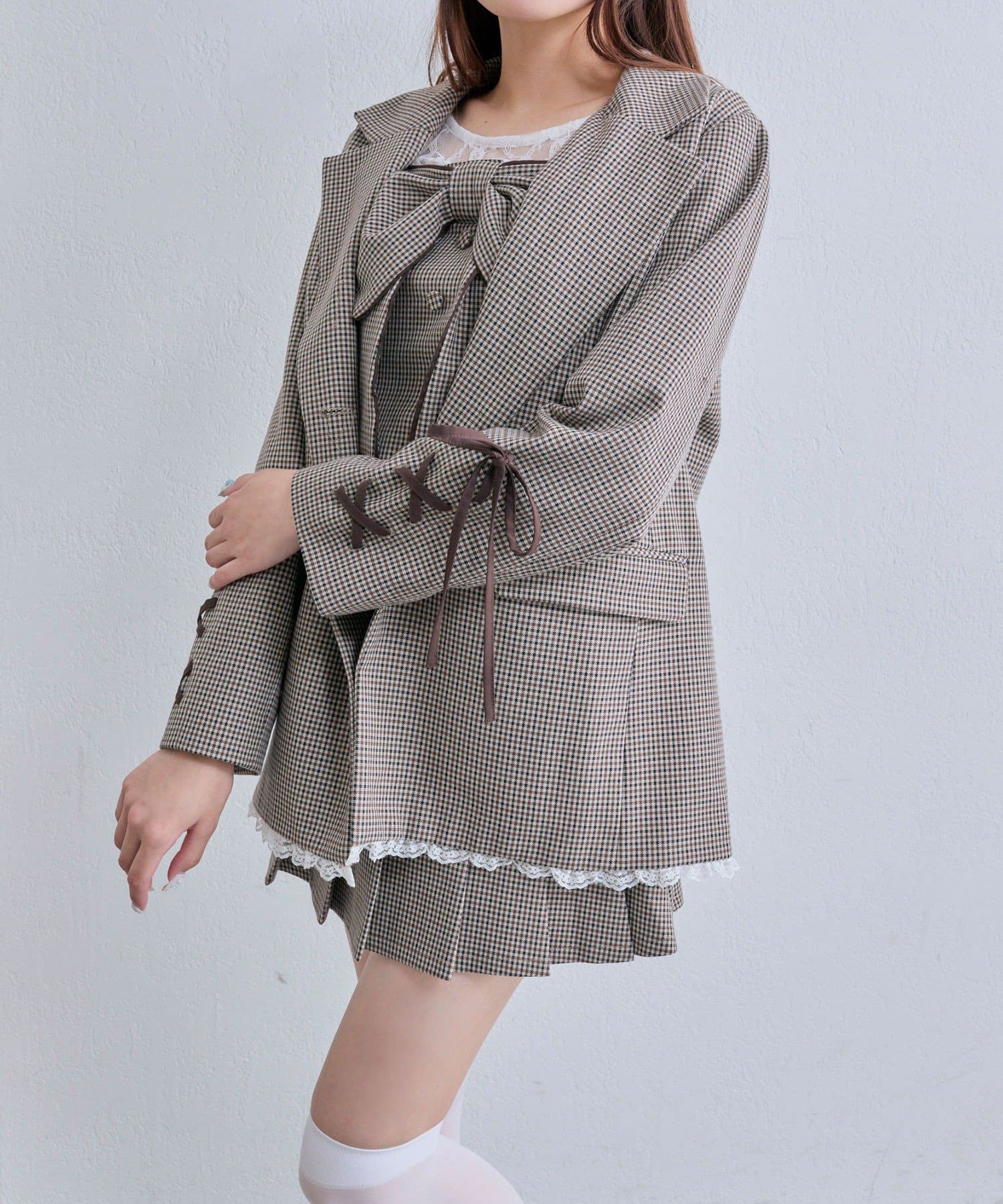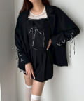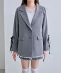 ・袖のリボンや裾のレースがかっちりとした印象のジャケットに抜け感をプラスし、女性らしい雰囲気を演出します。