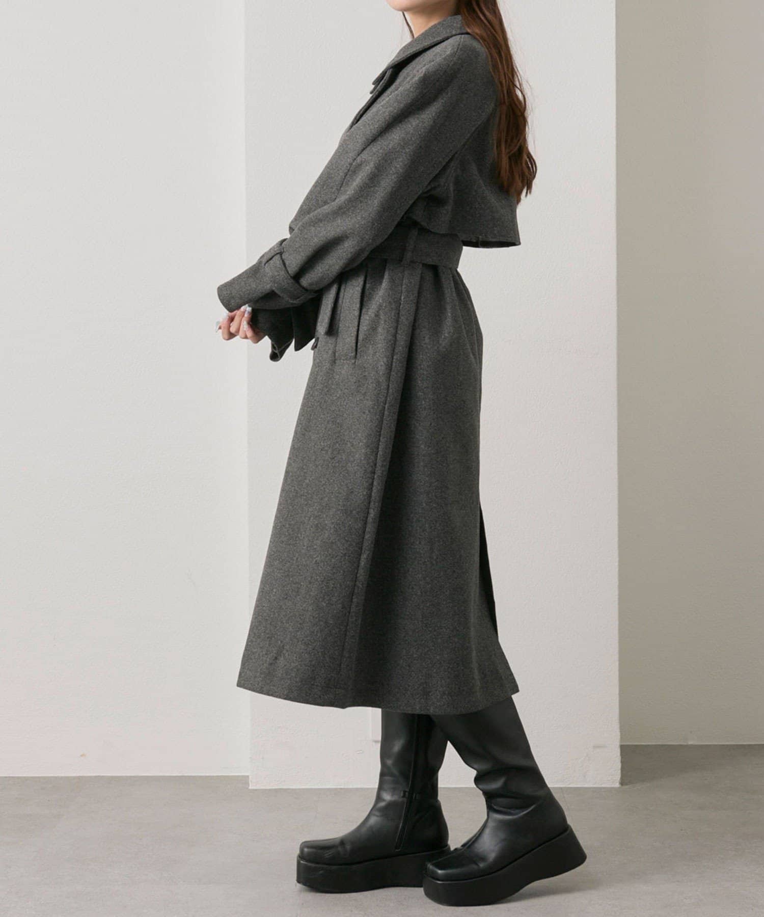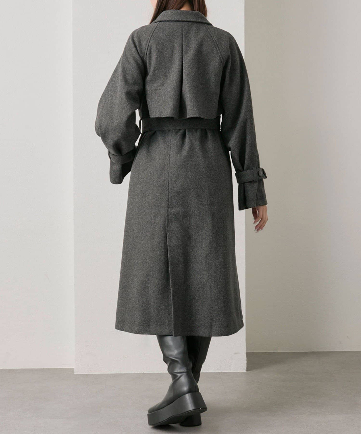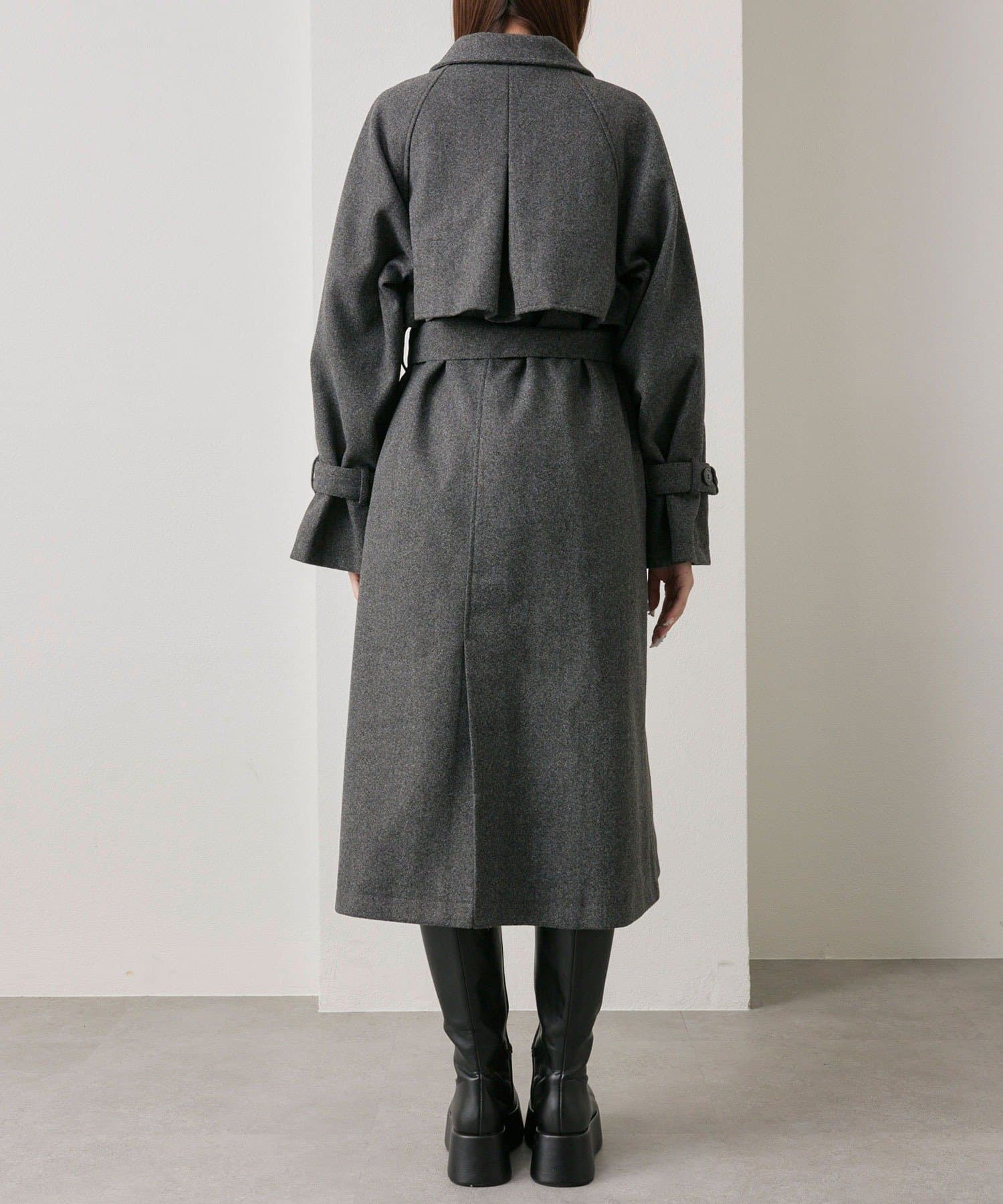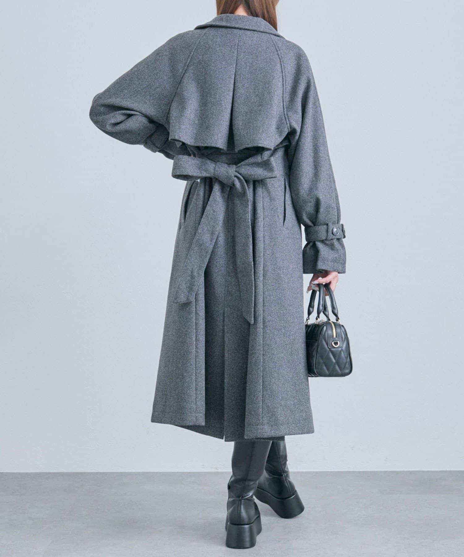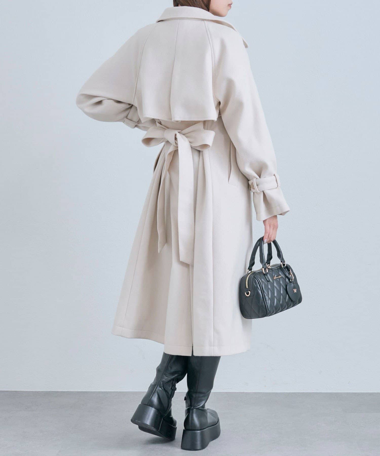 ・前を開けて着るときは後ろでベルトを結ぶとすっきりとしたシルエットで着用していただけます。