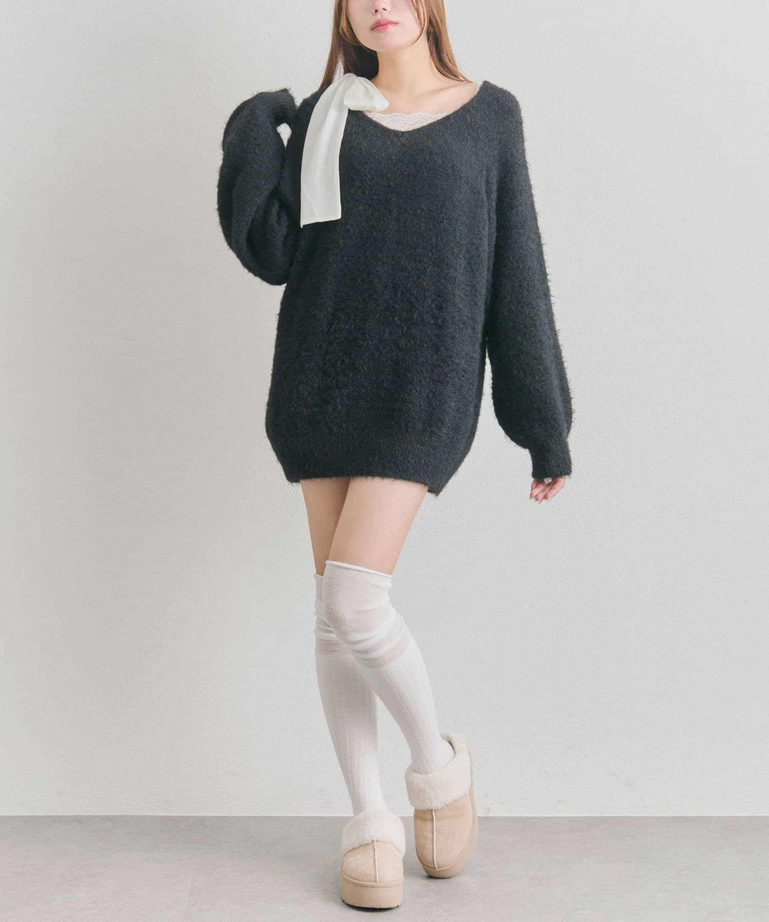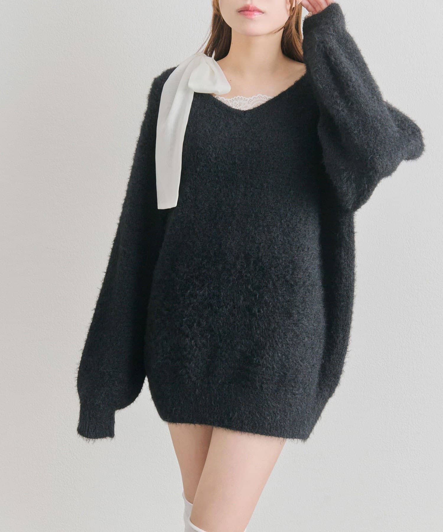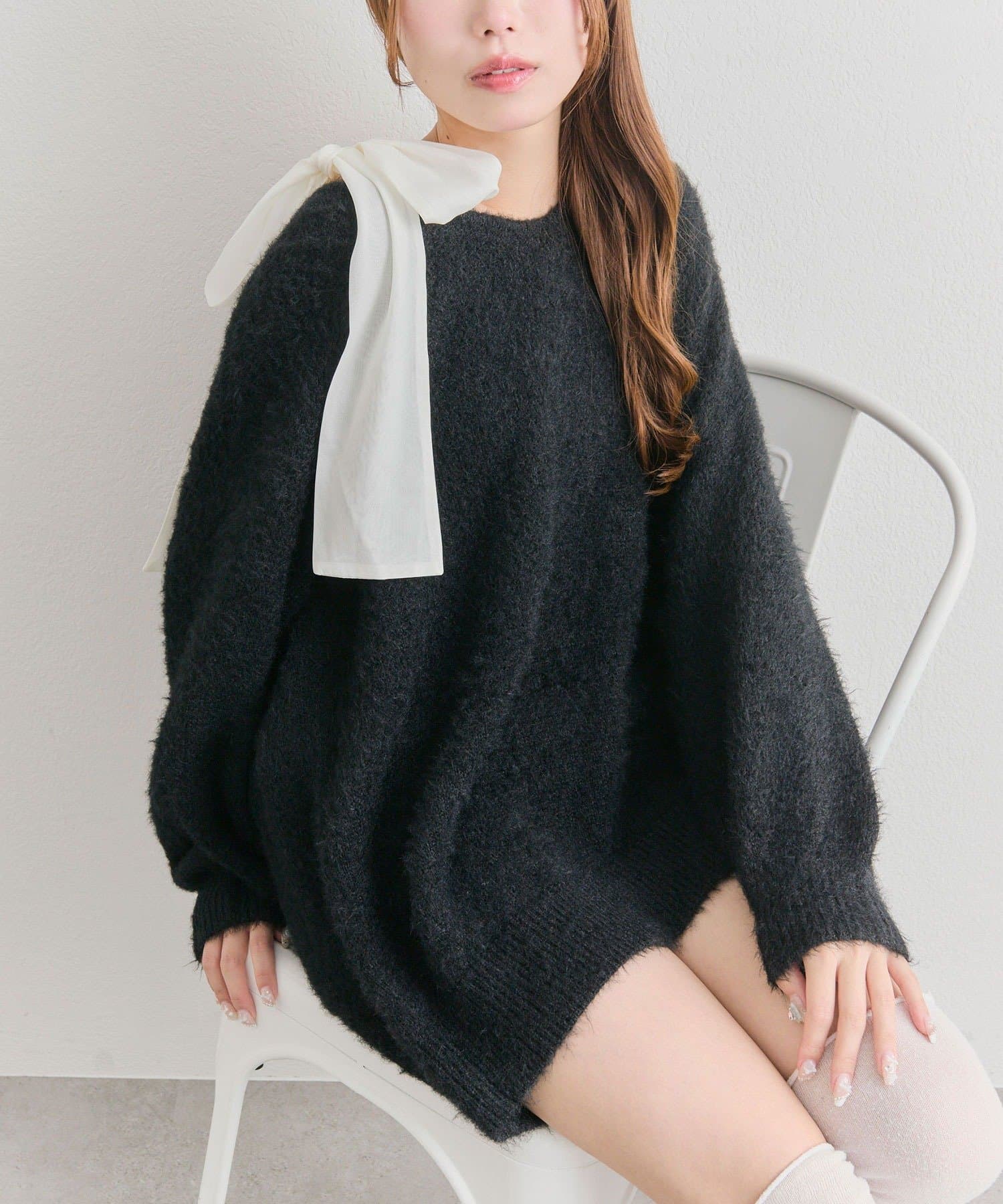 ・ふわふわシャギーニットに、大きなリボンをあしらったガーリーデザイン。