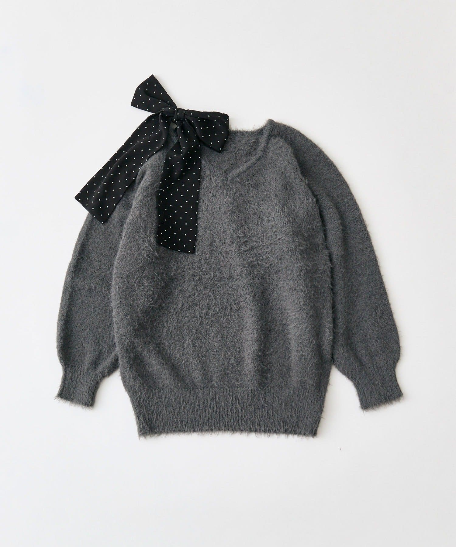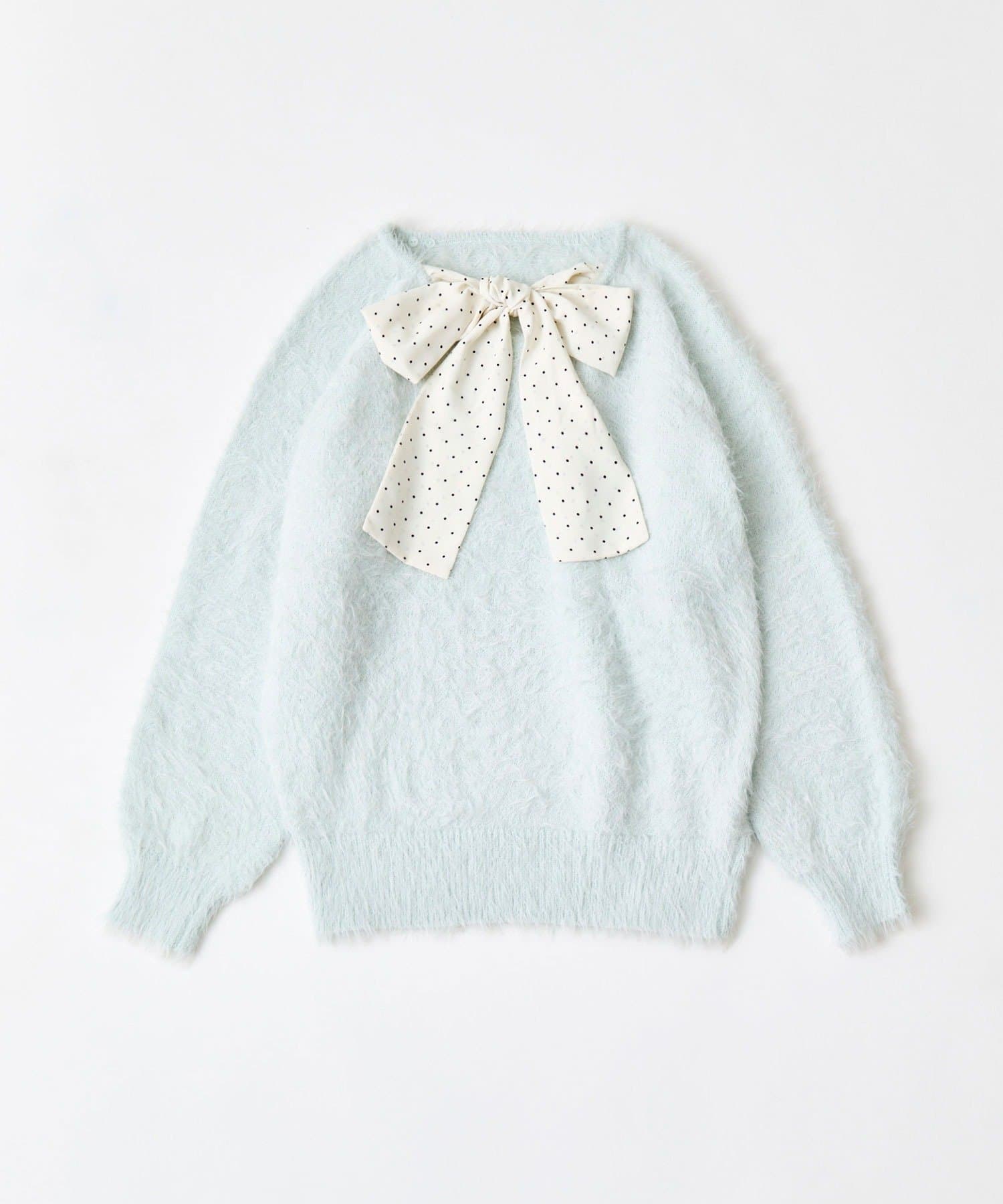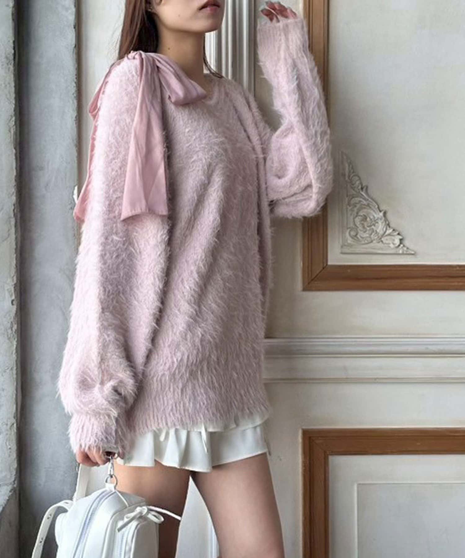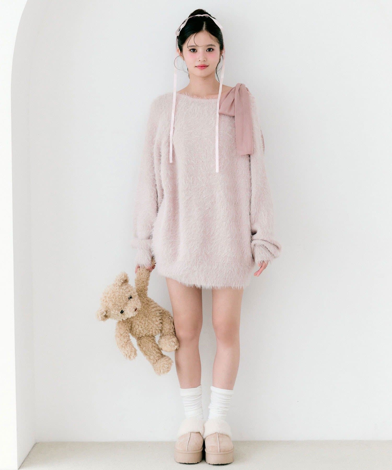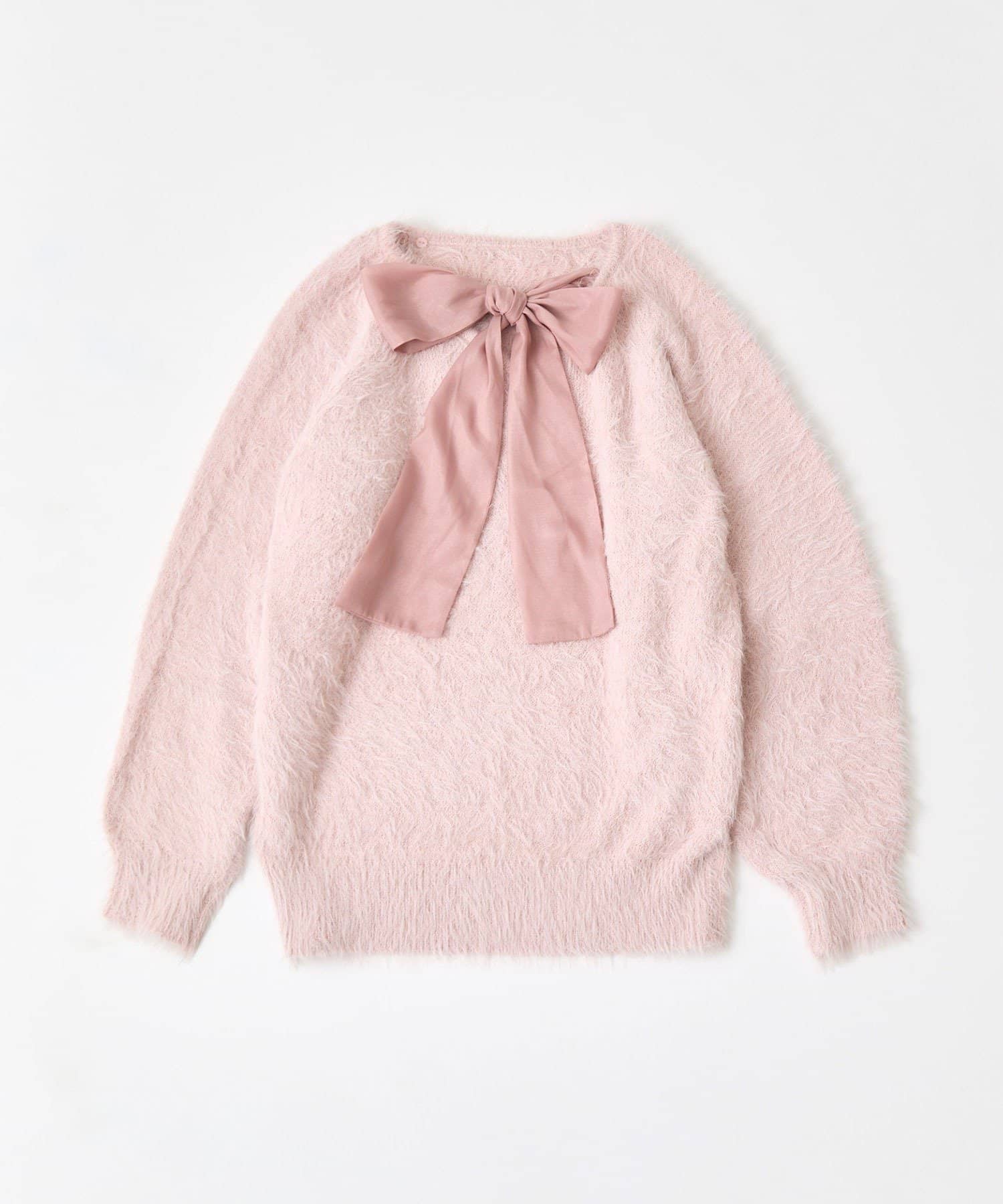 ・ふわふわシャギーニットに、大きなリボンをあしらったガーリーデザイン。