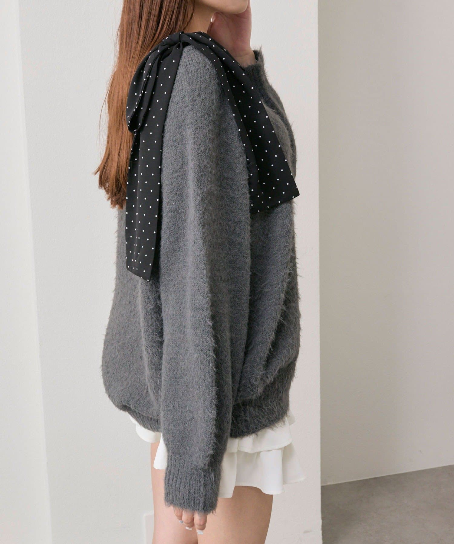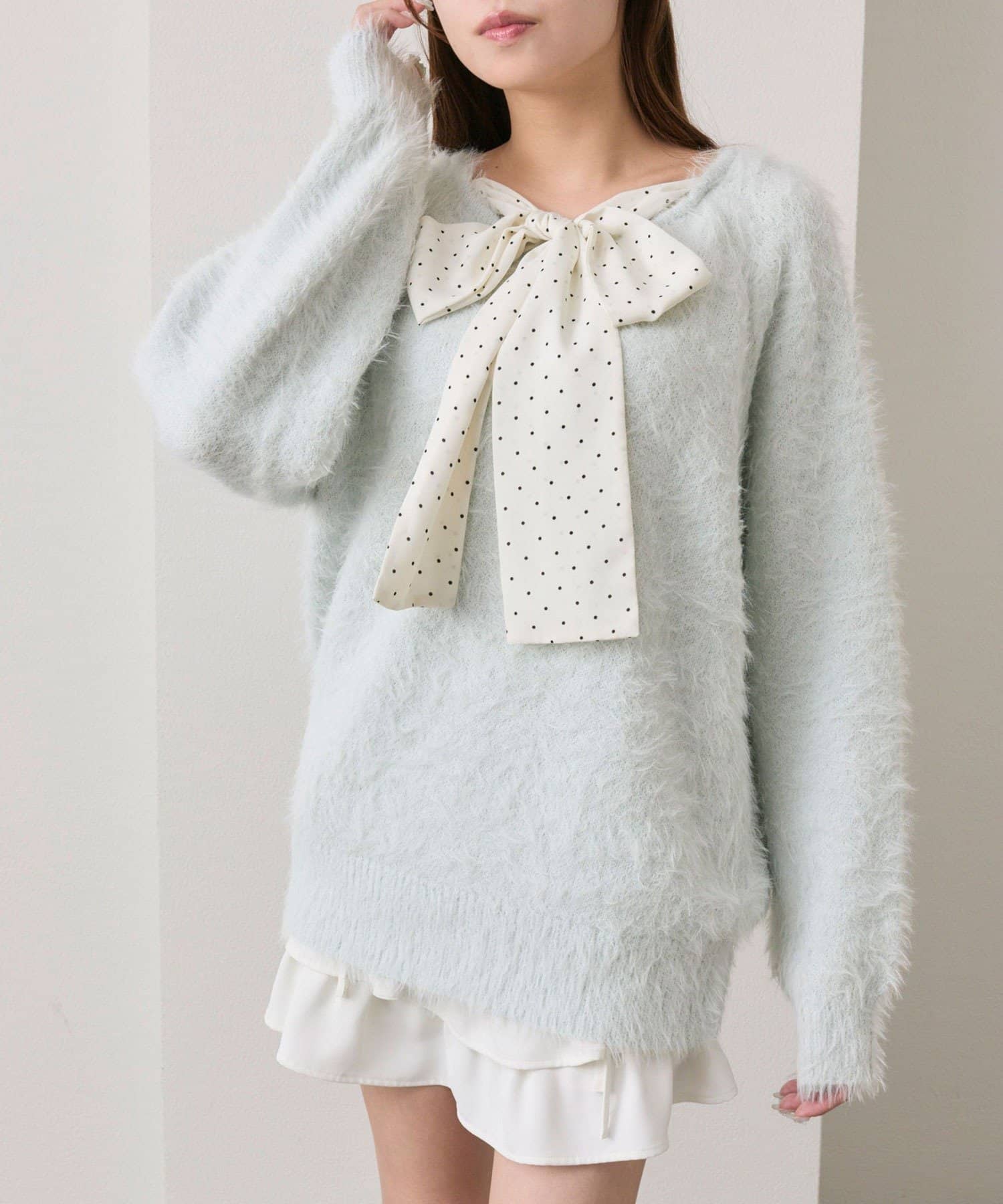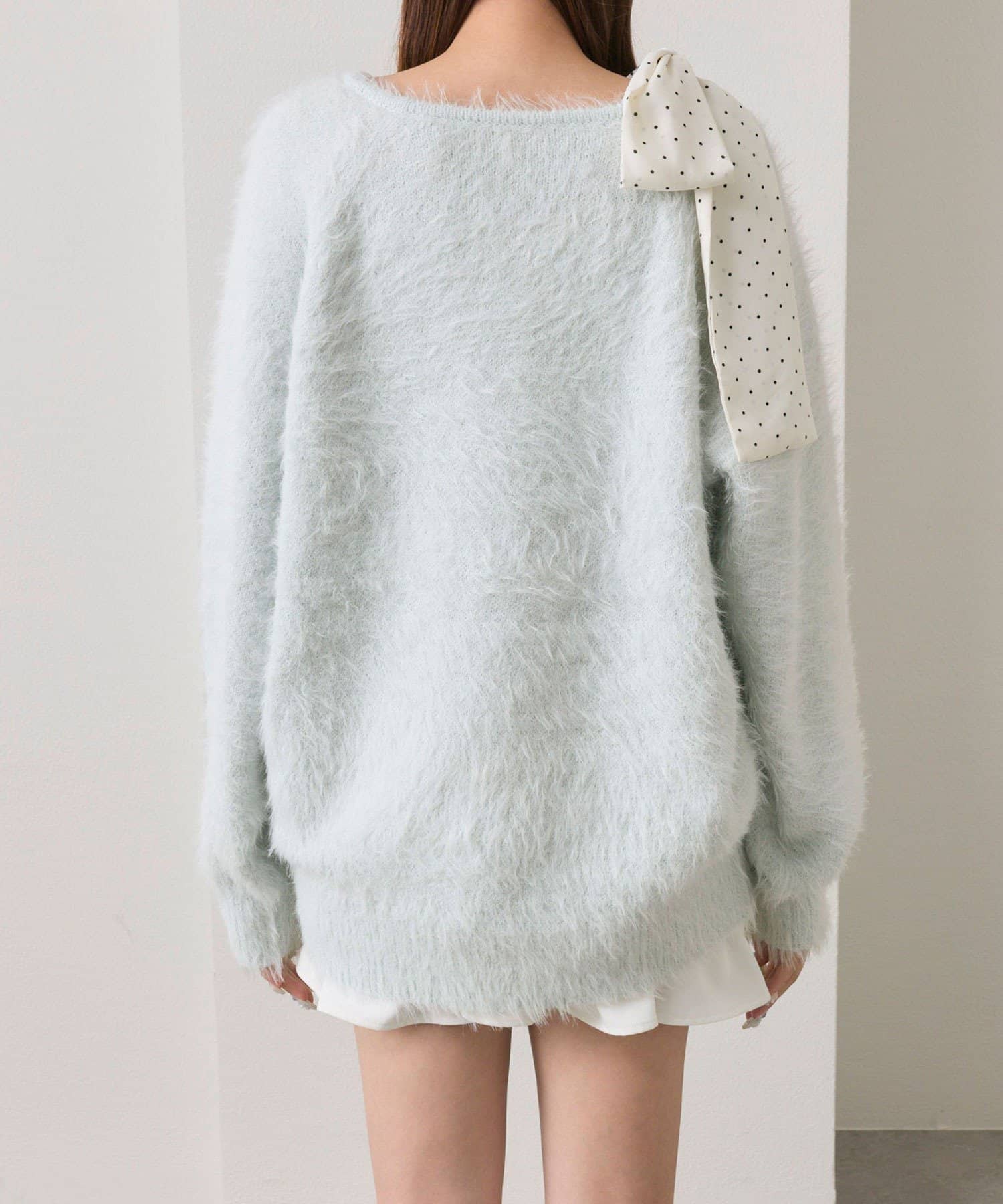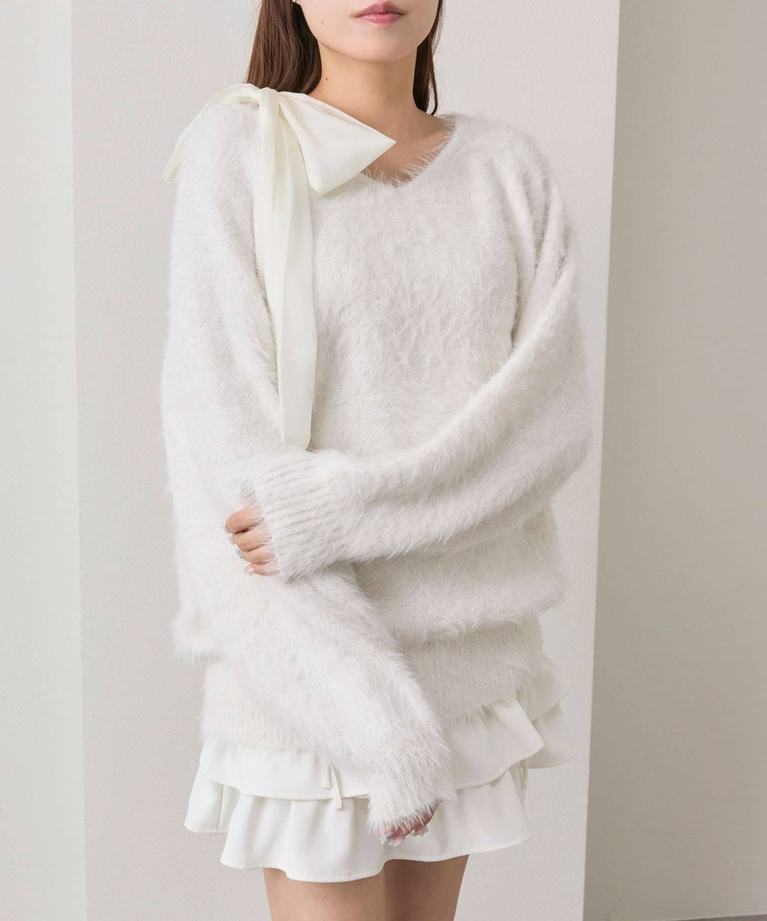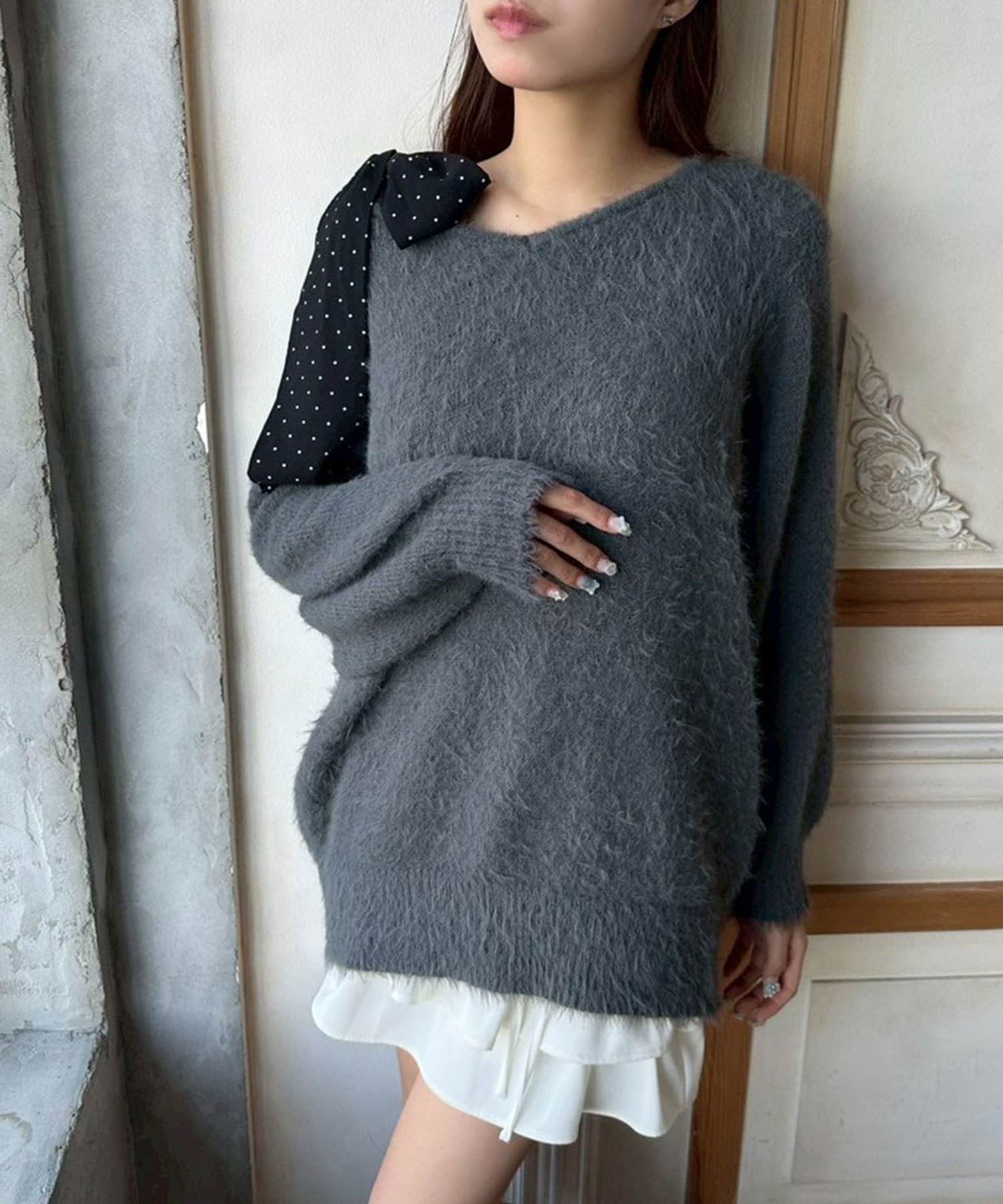 ・ふわふわシャギーニットに、大きなリボンをあしらったガーリーデザイン。
