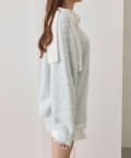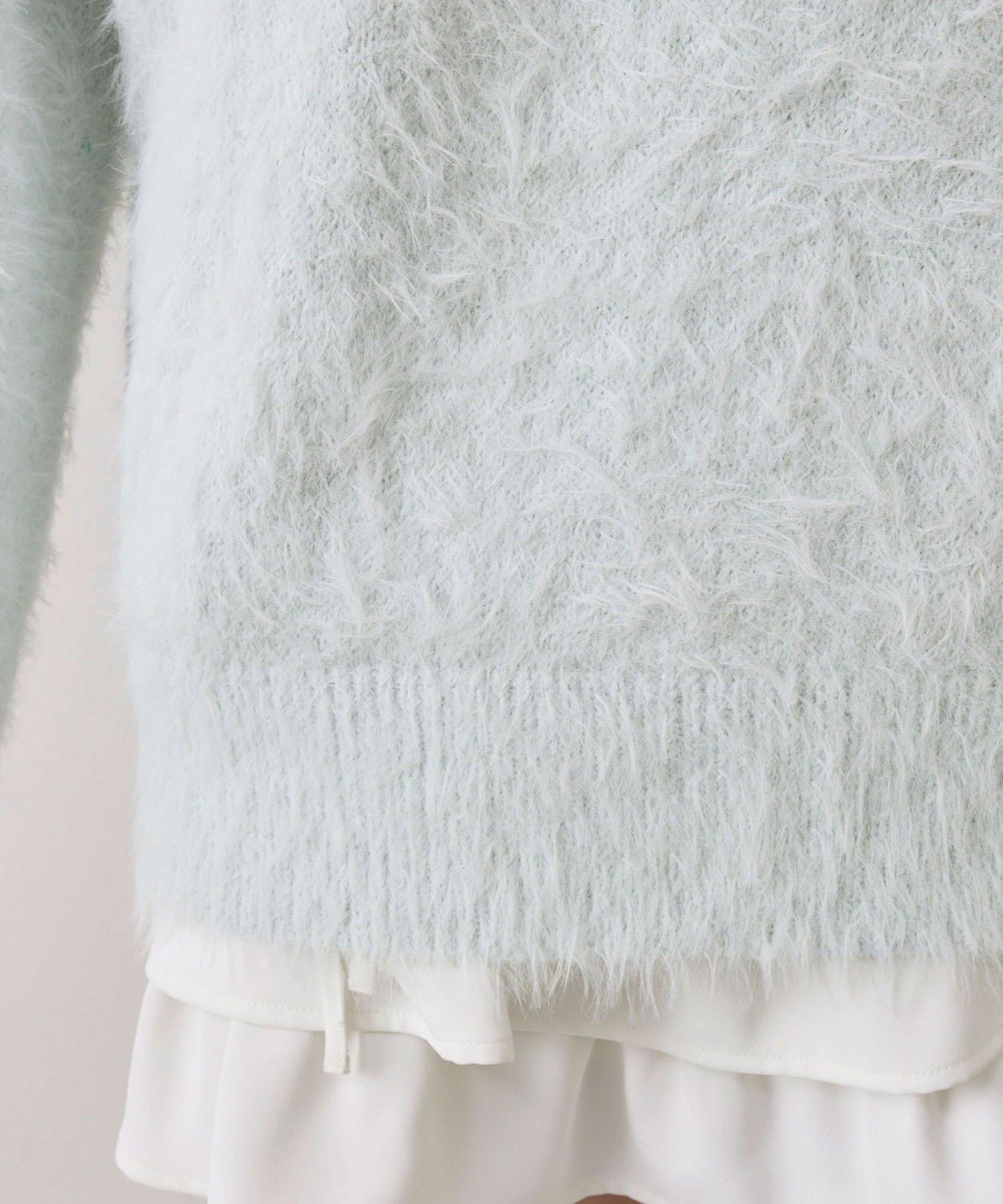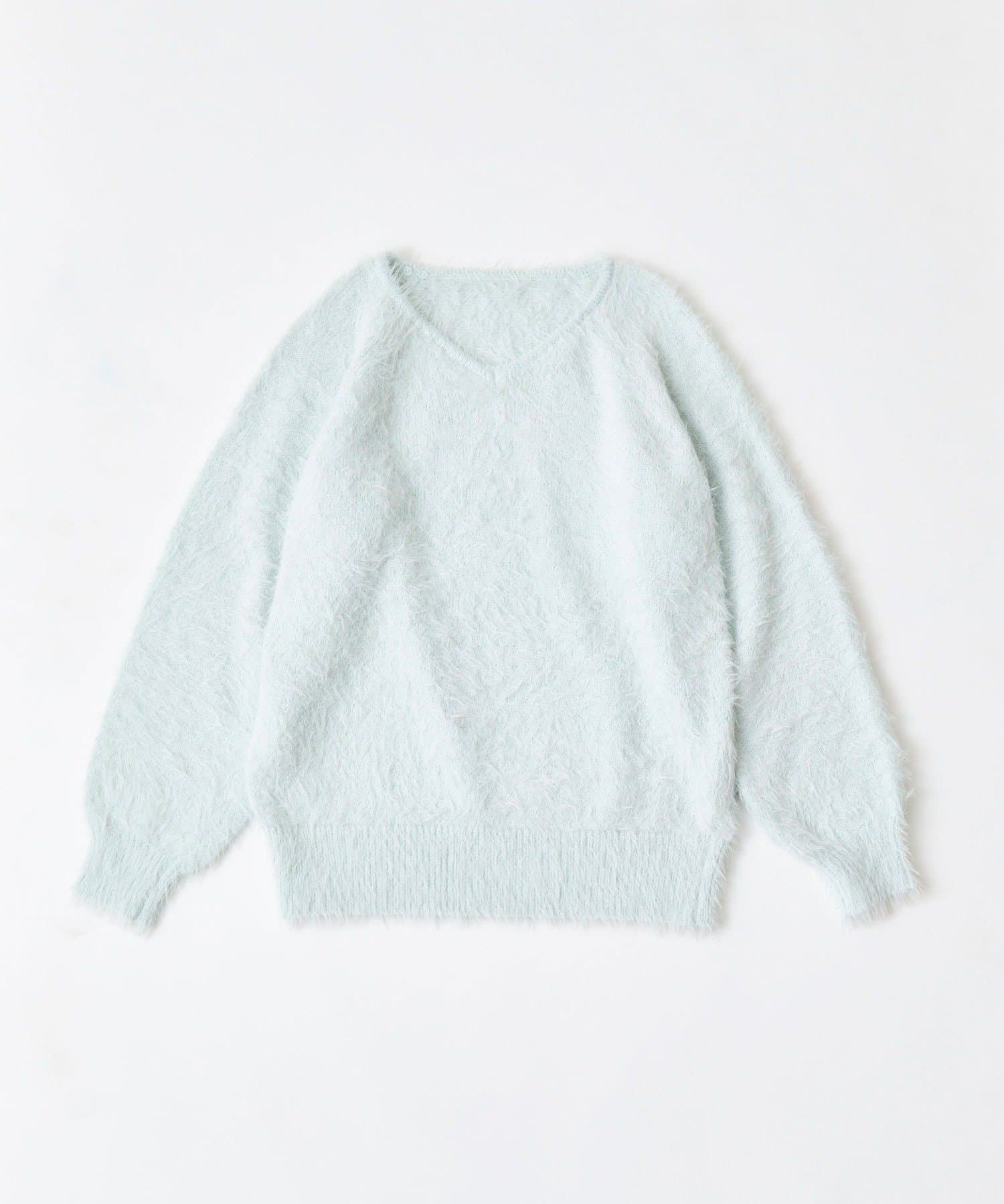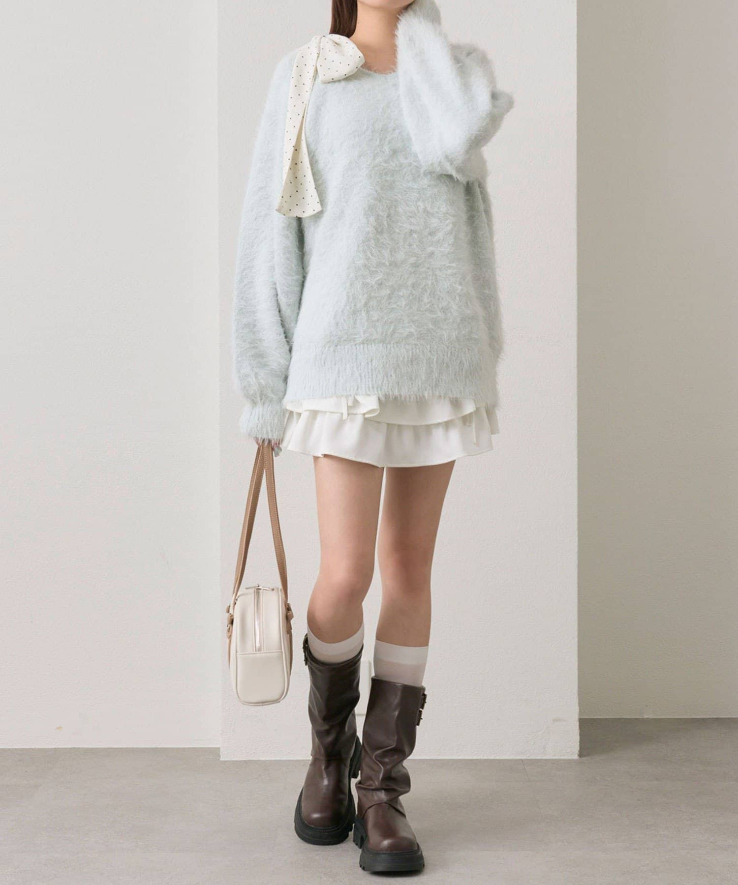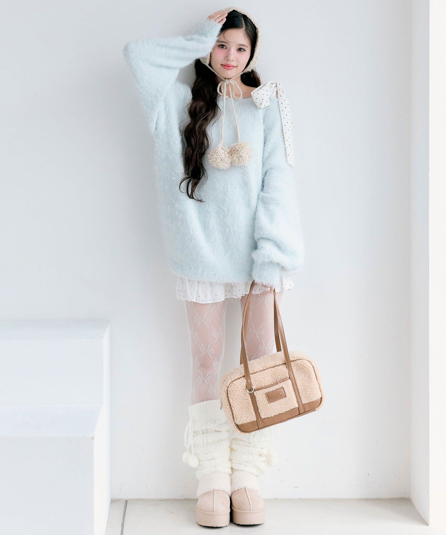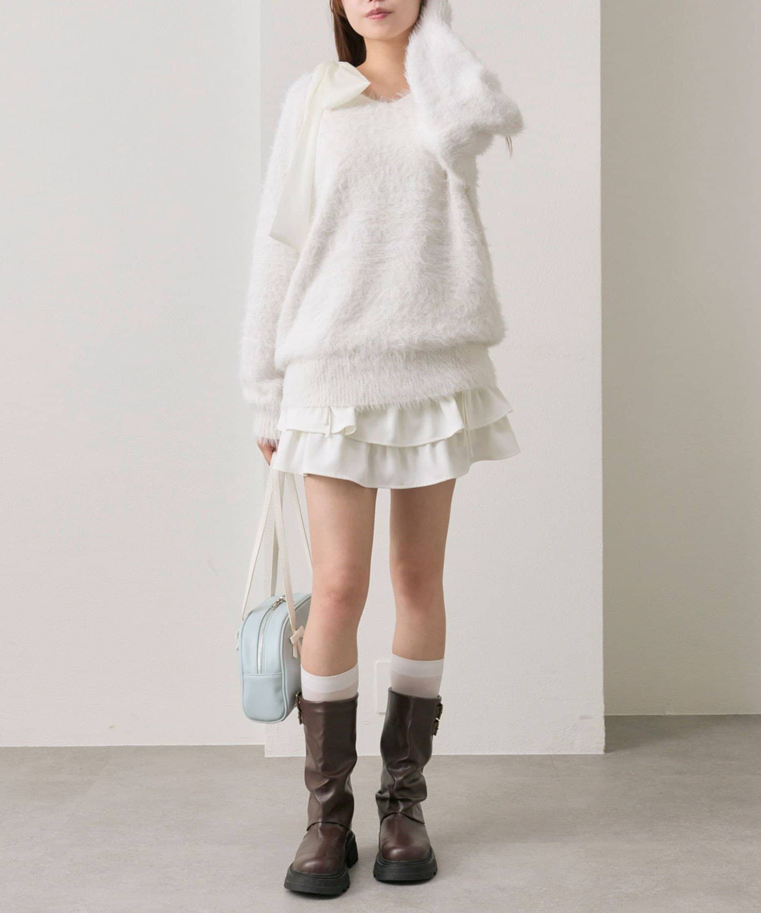 ・ふわふわシャギーニットに、大きなリボンをあしらったガーリーデザイン。