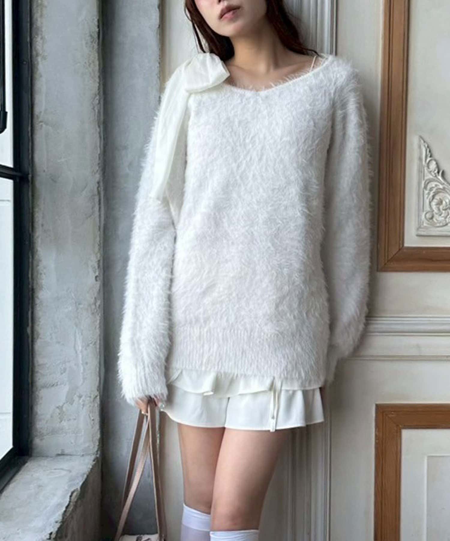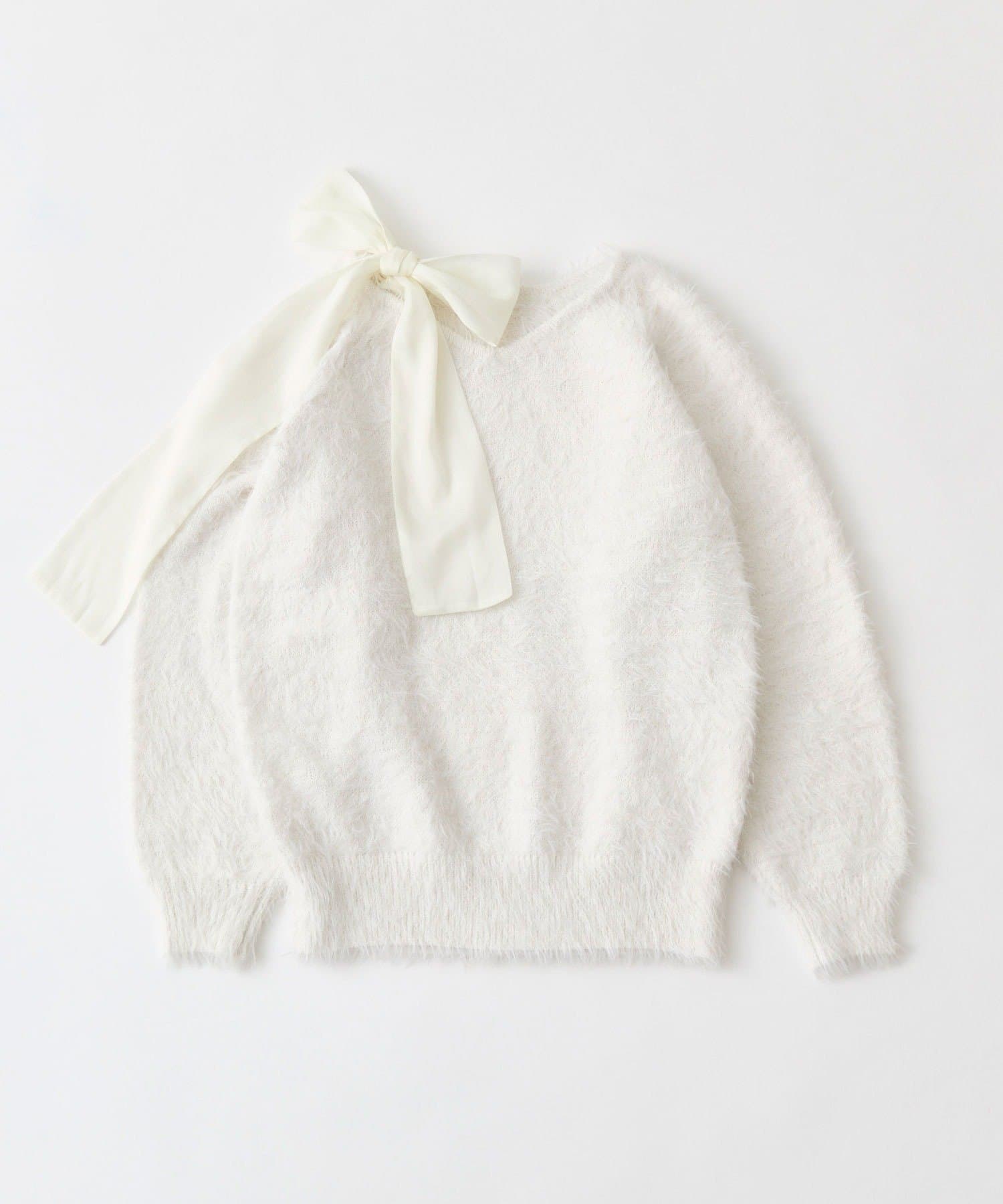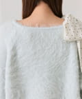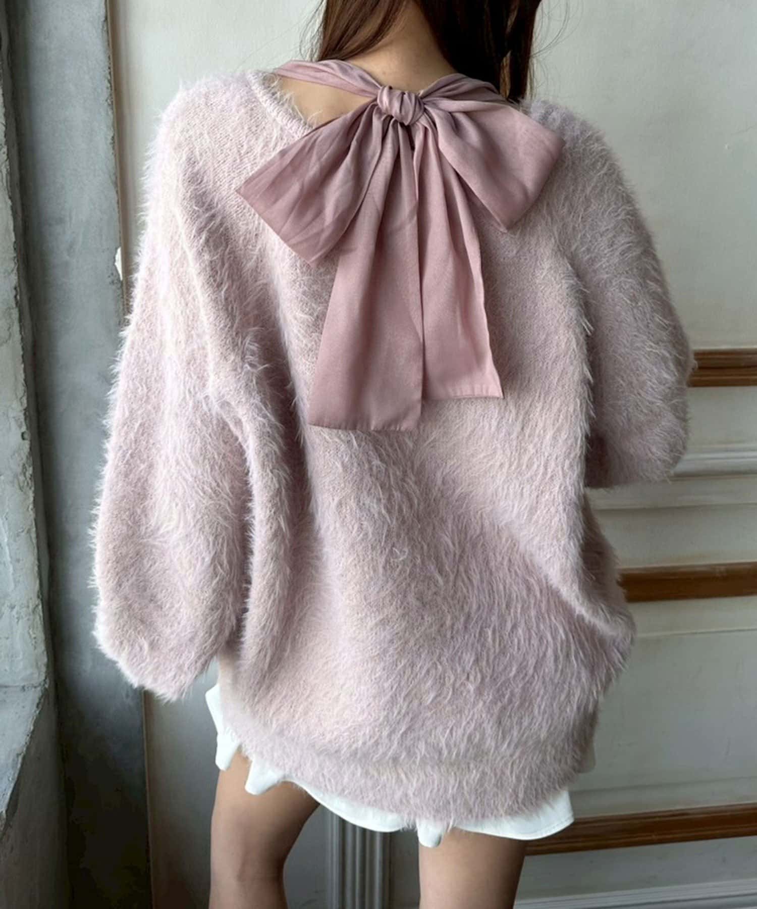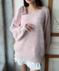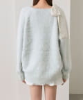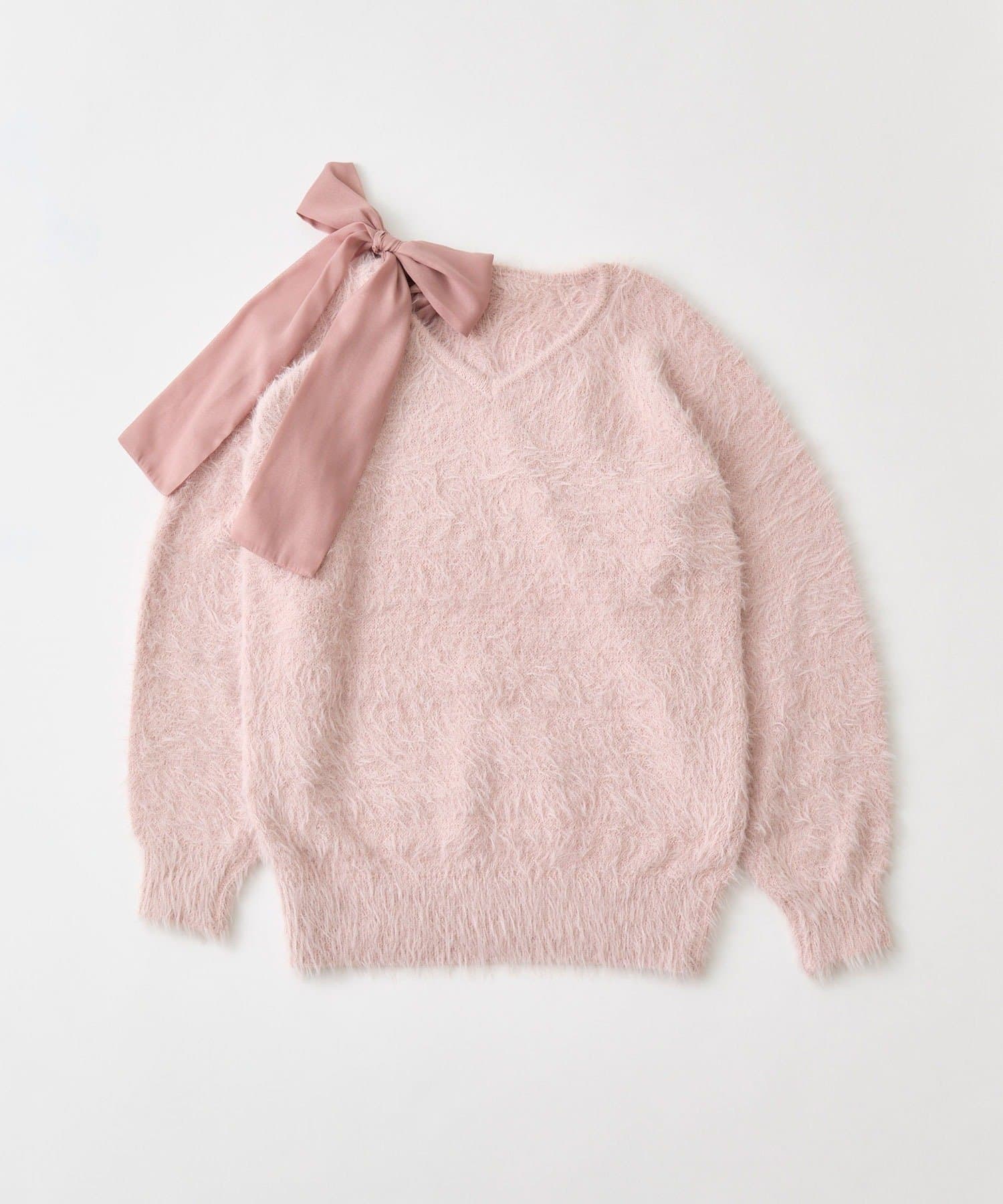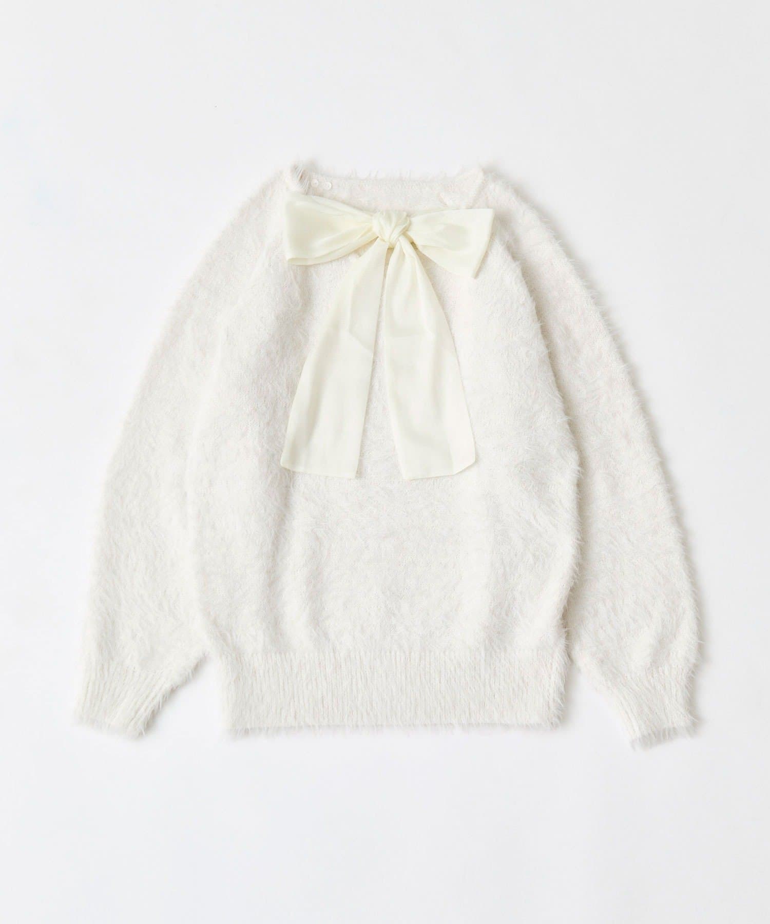 ・ふわふわシャギーニットに、大きなリボンをあしらったガーリーデザイン。