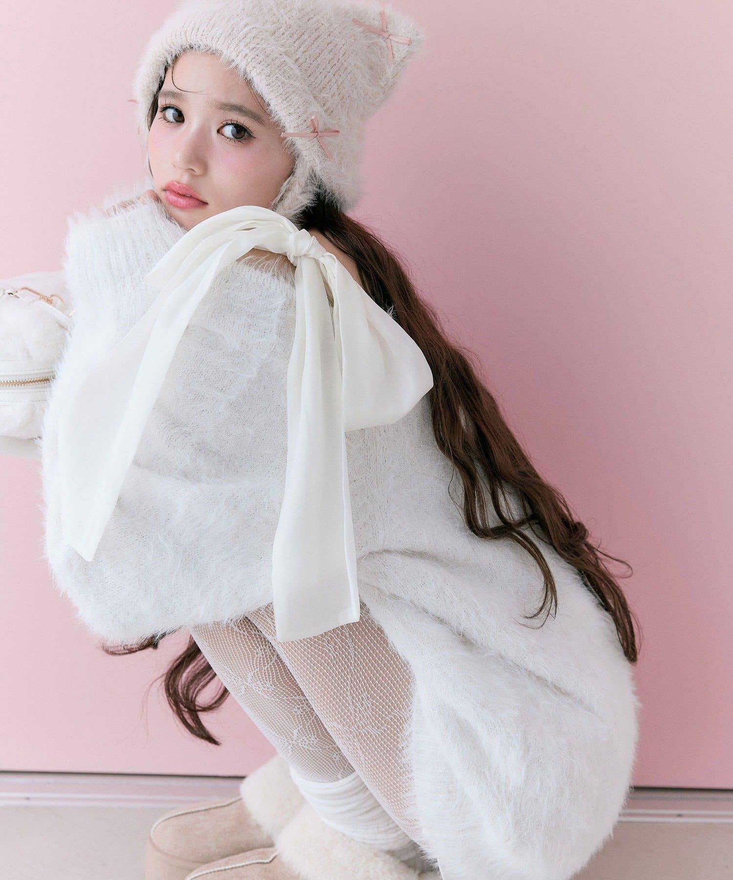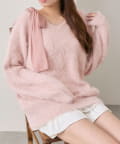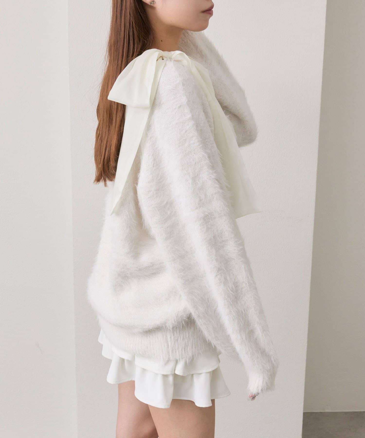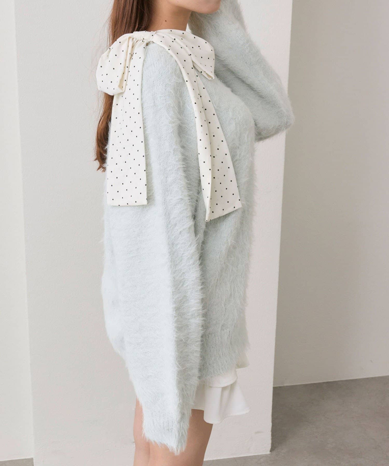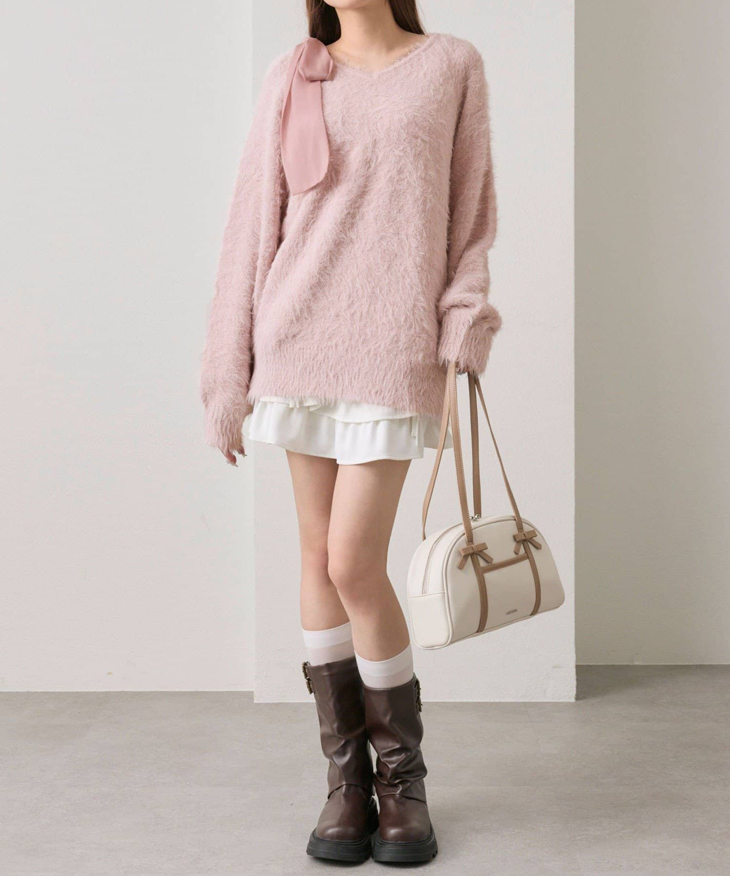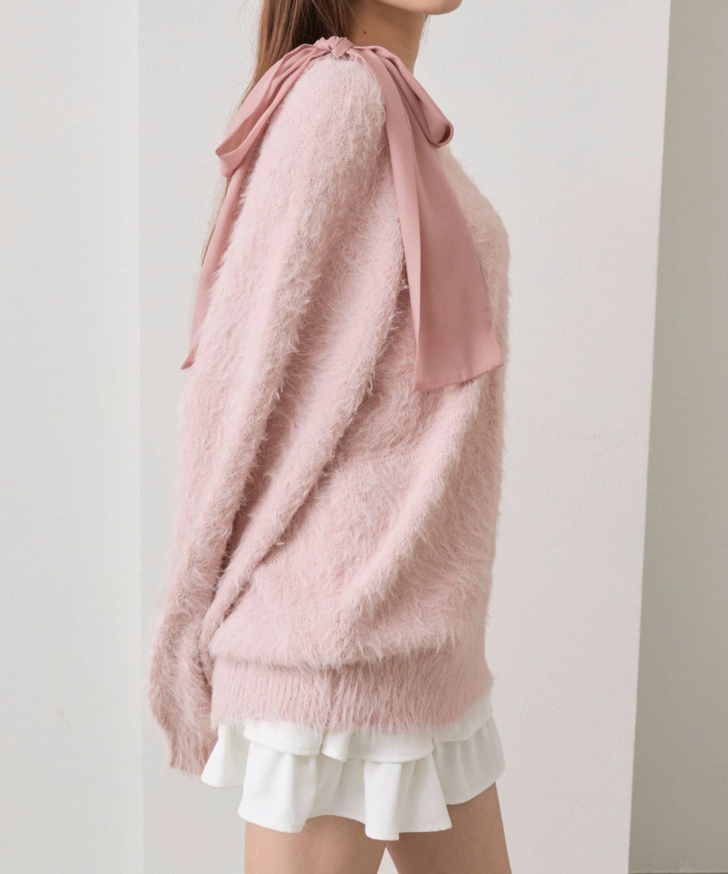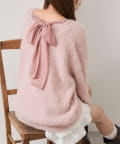 ・ふわふわシャギーニットに、大きなリボンをあしらったガーリーデザイン。